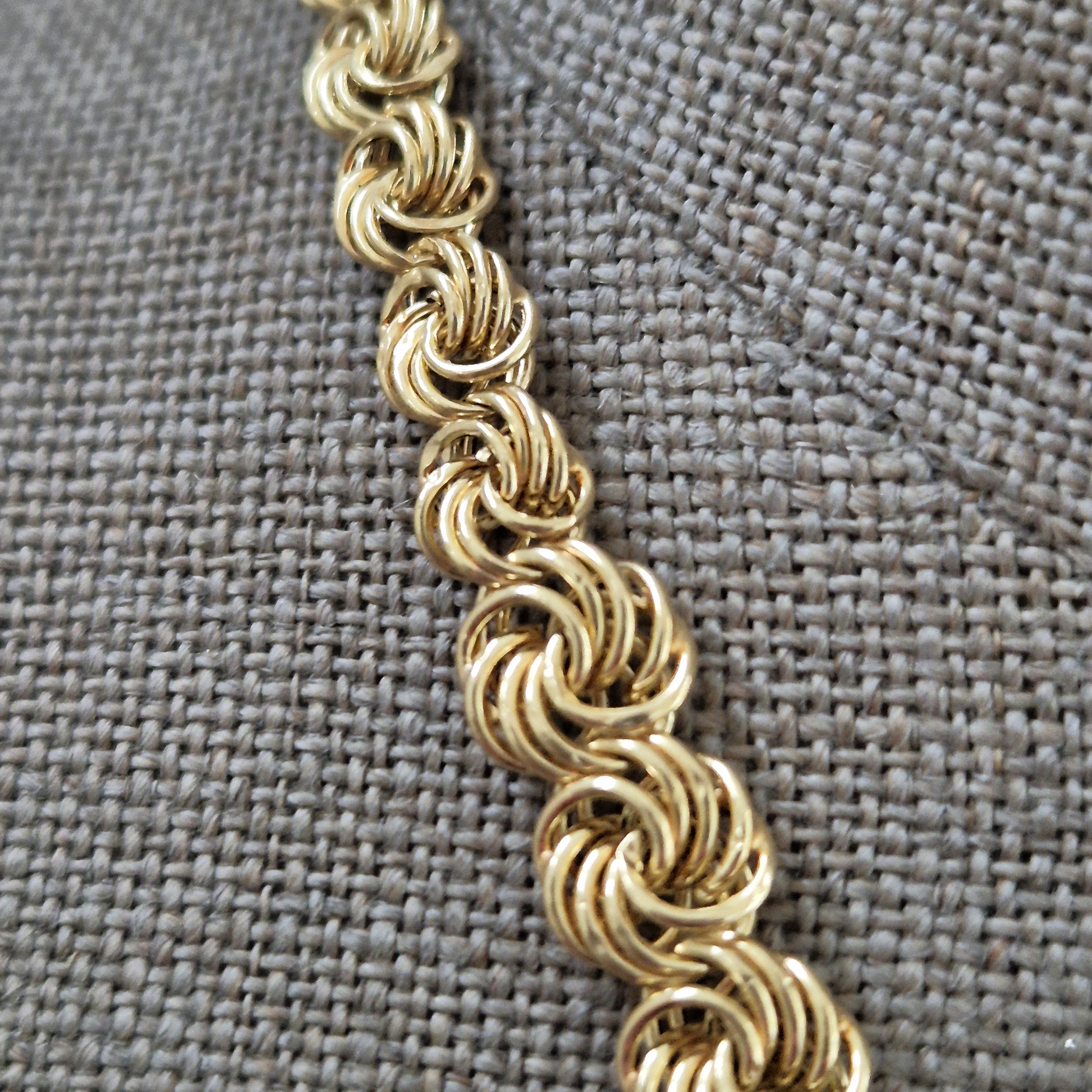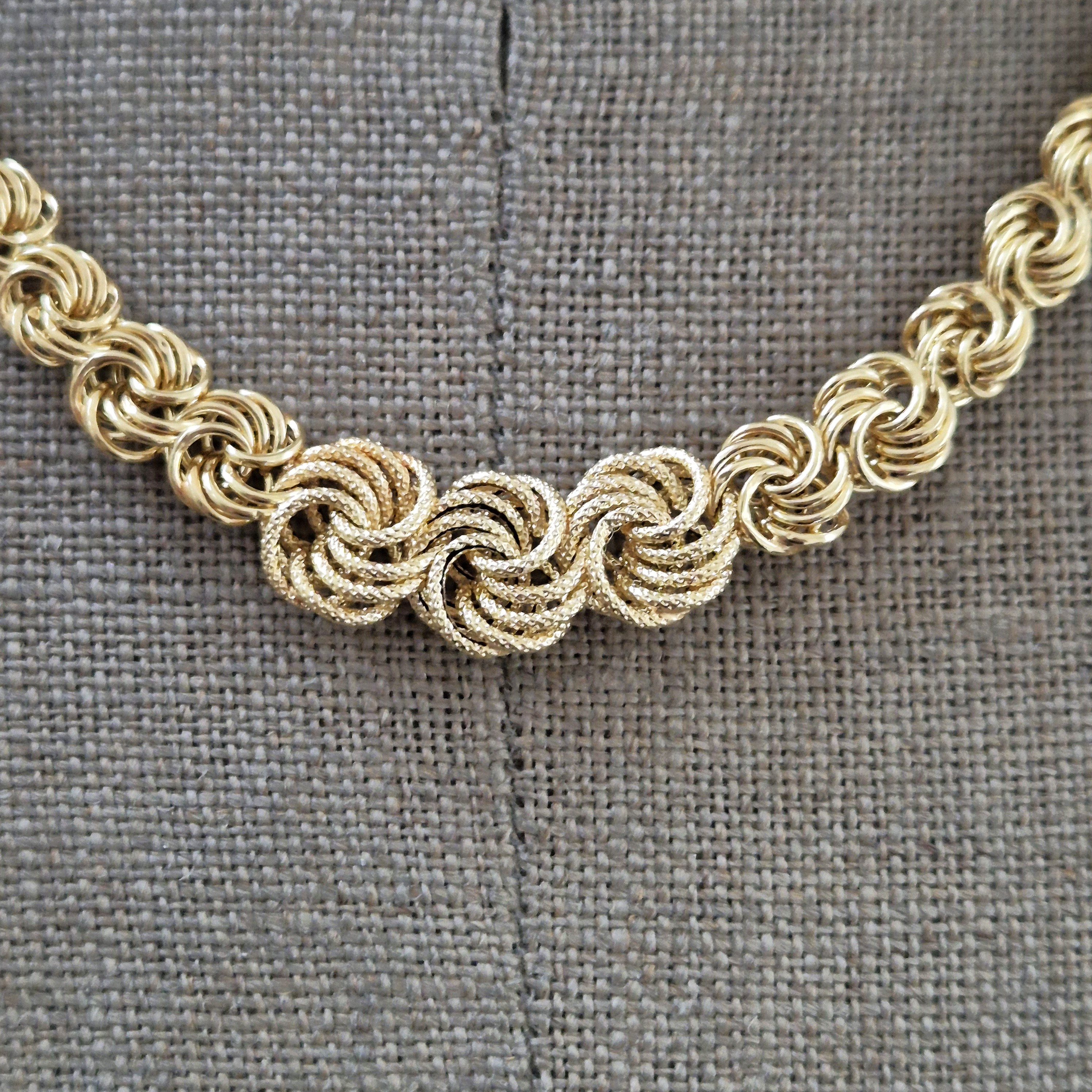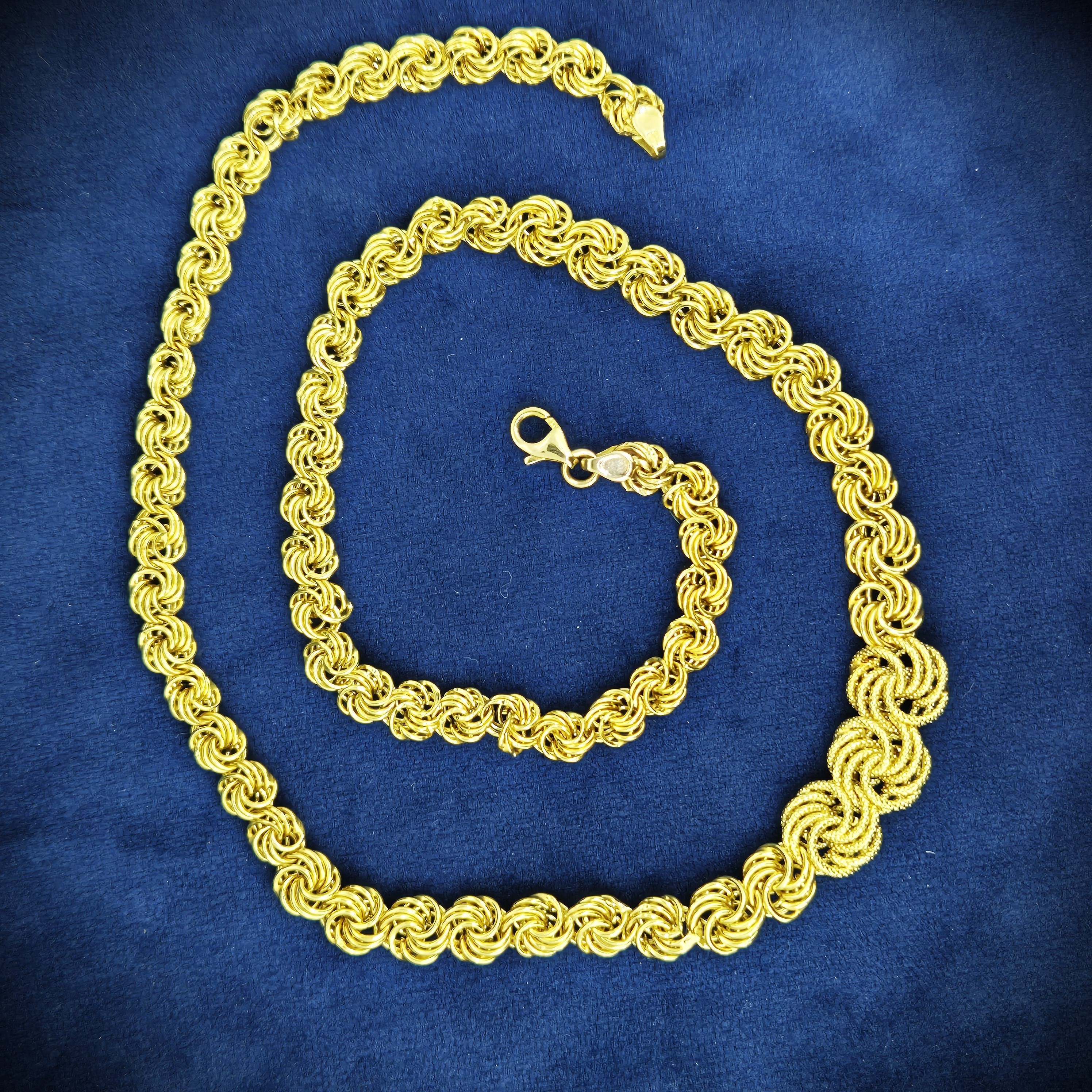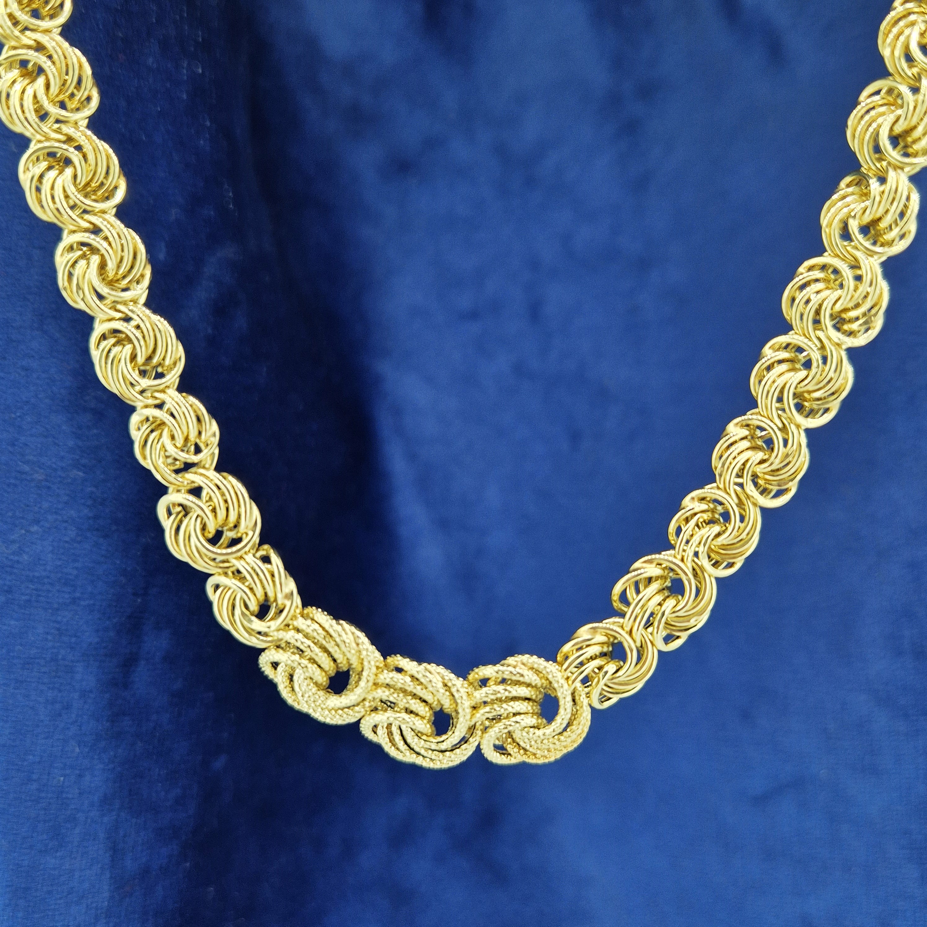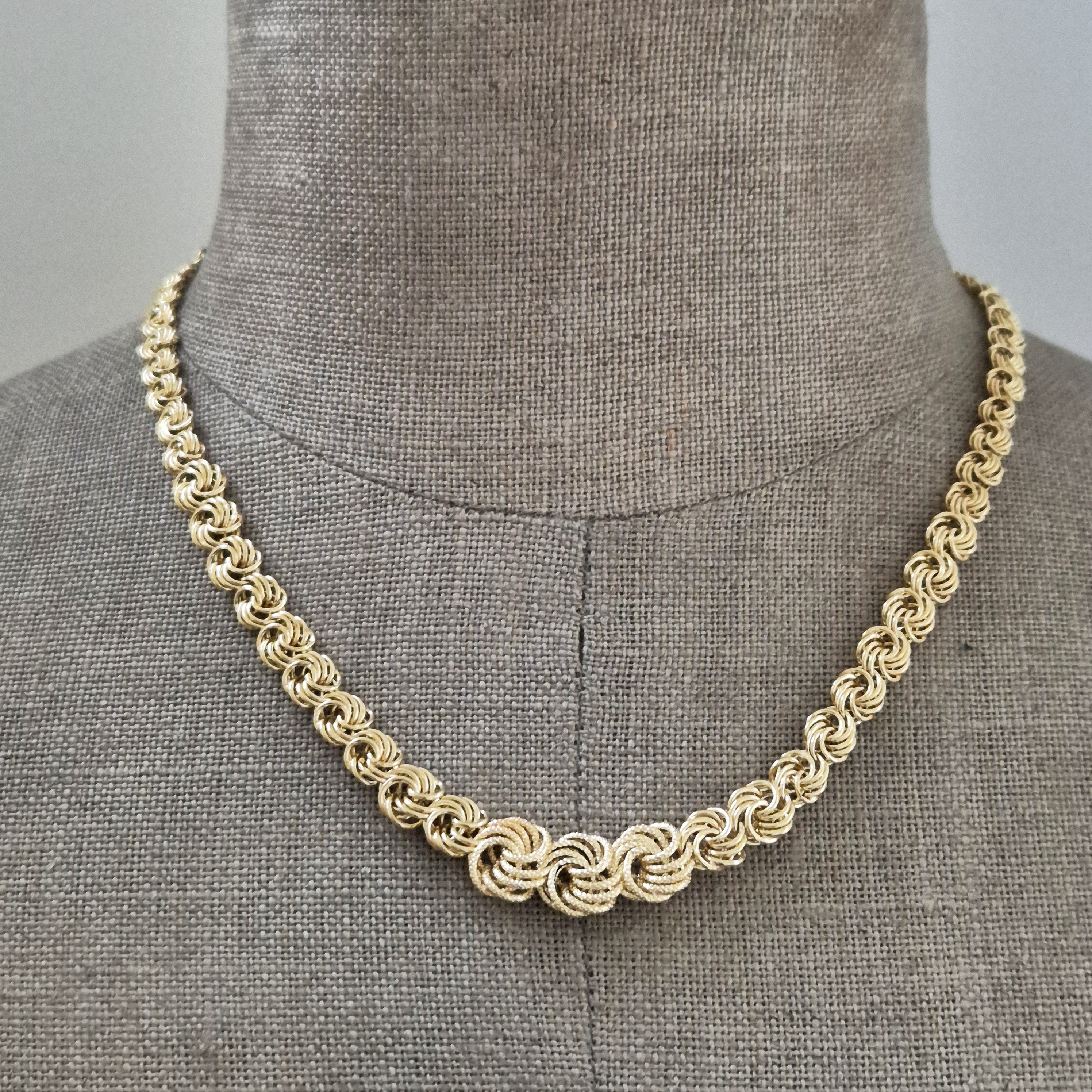 The Necklace features graduated links that interlock together in a swirl design. The three at the front of the Necklace have a beaded effect which give them a matte look and the rest of the links are polished and smooth.