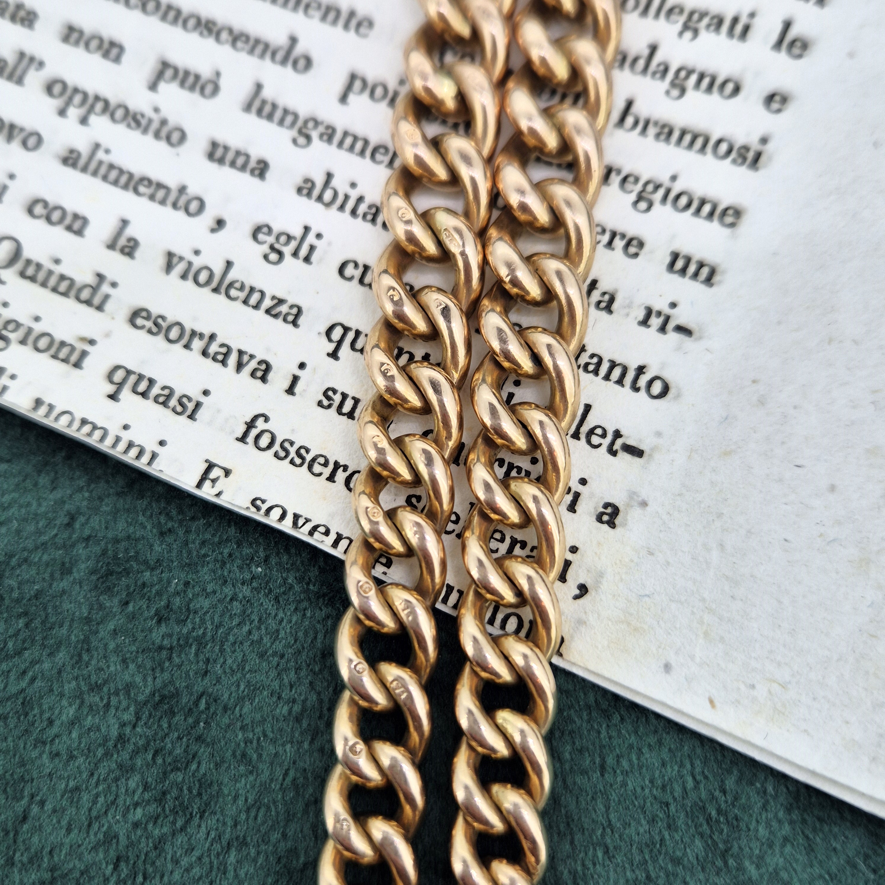 This Albert features Curb links that graduate from 6mm to 8mm. The links are all individually stamped and the Gold has a deep yellow/subtle red tone to it.