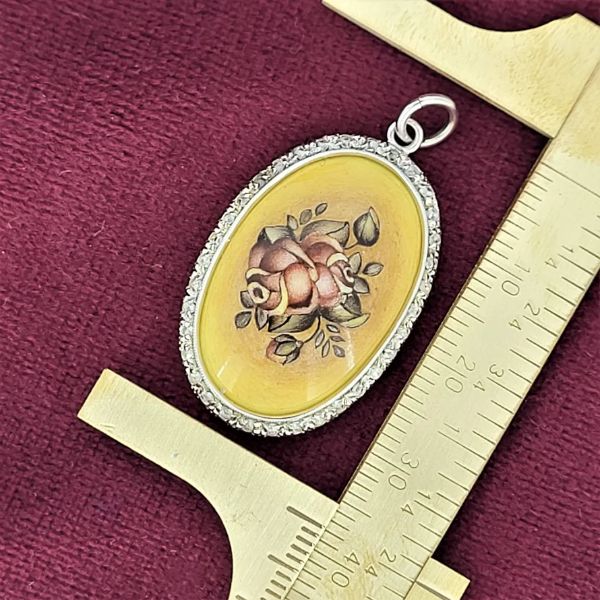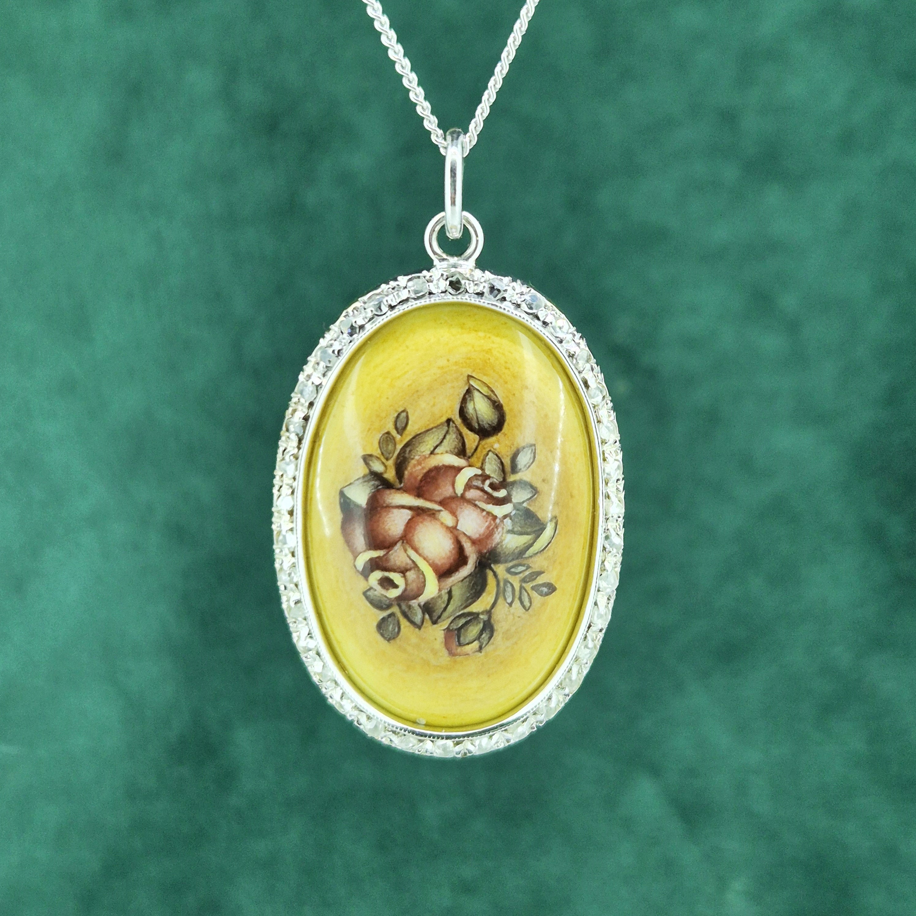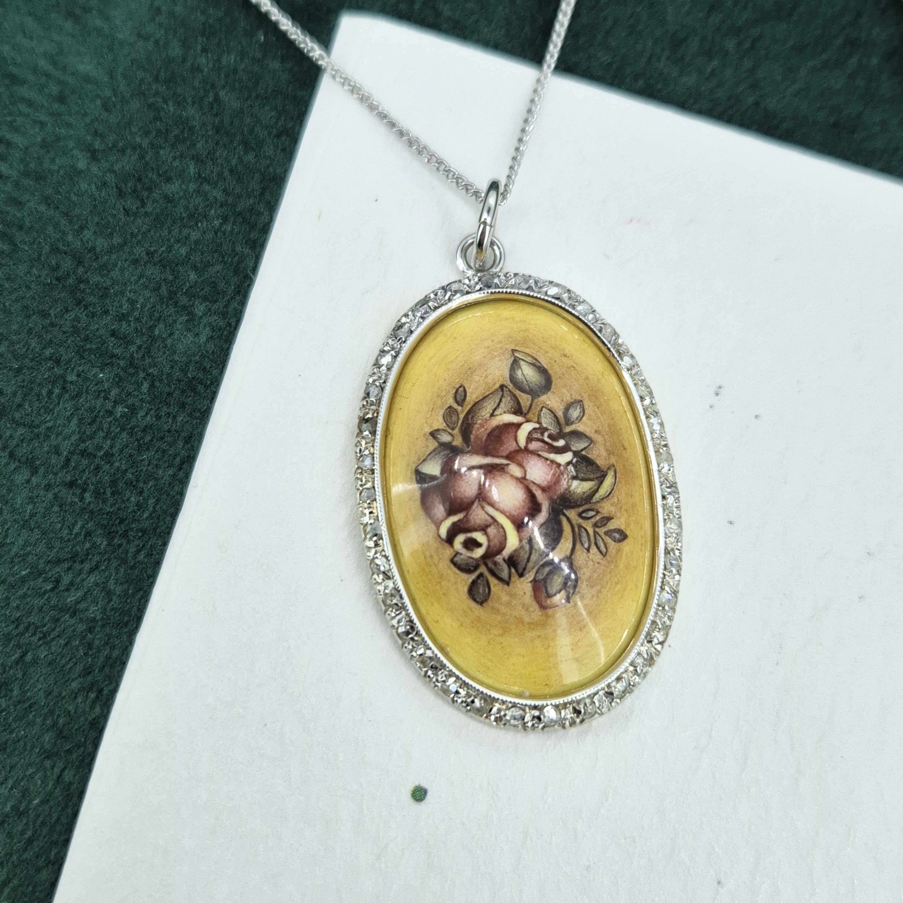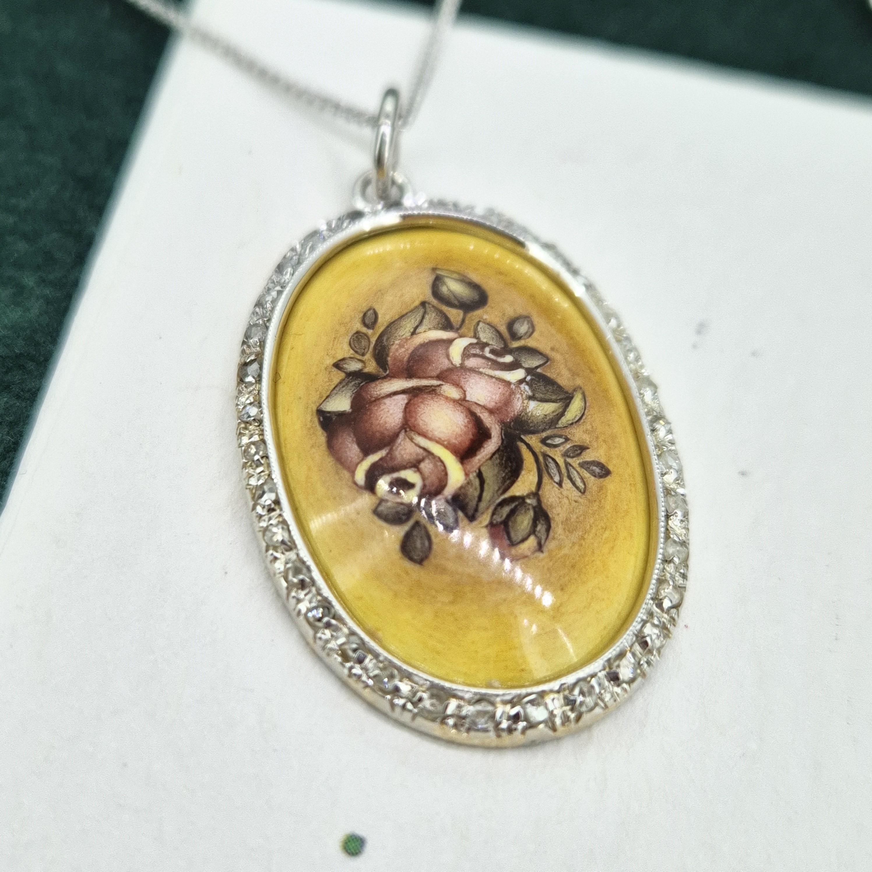 This is such a pretty pendant. A diamond border surrounds beautifully hand drawn flowers displayed on an oval 18ct Gold canvas.