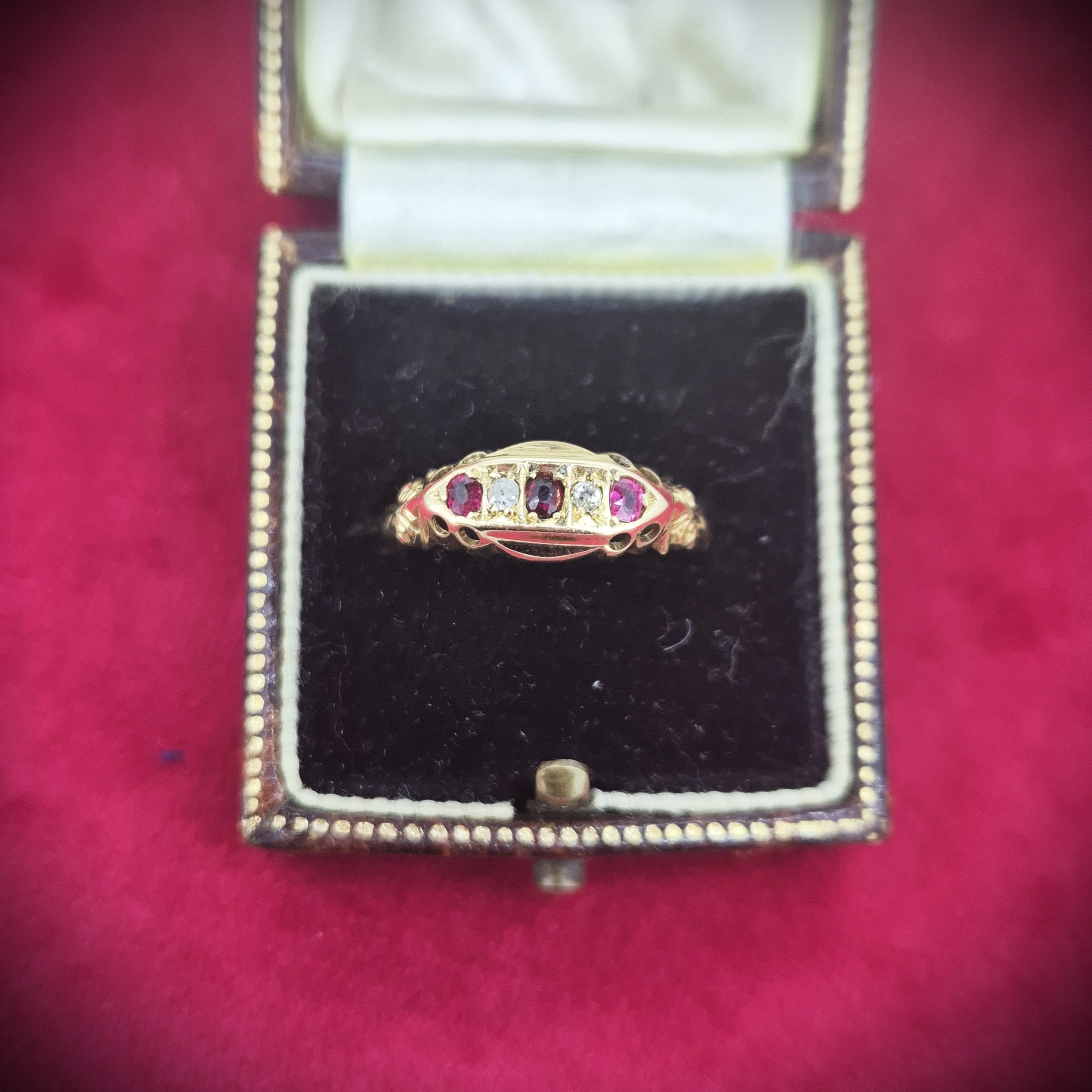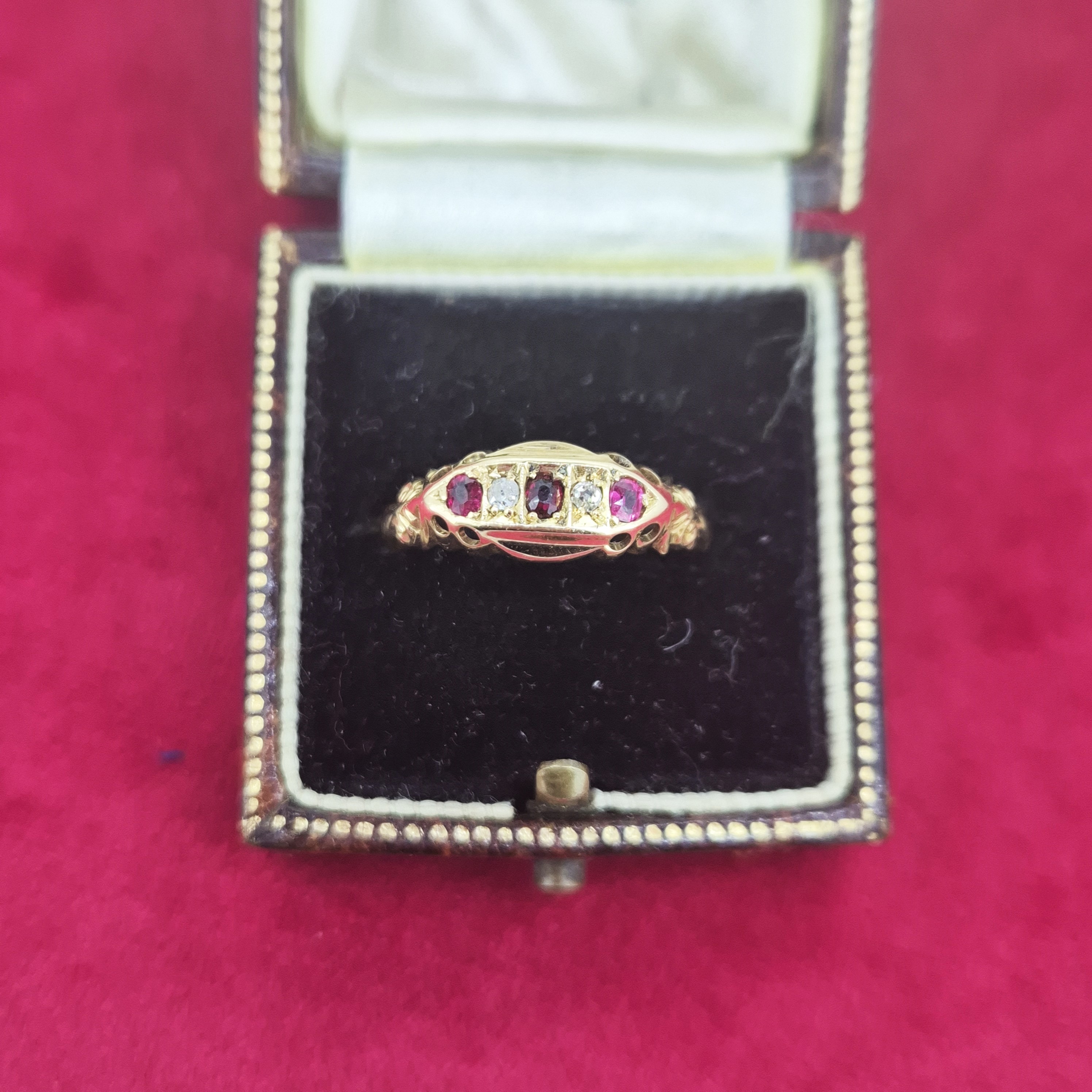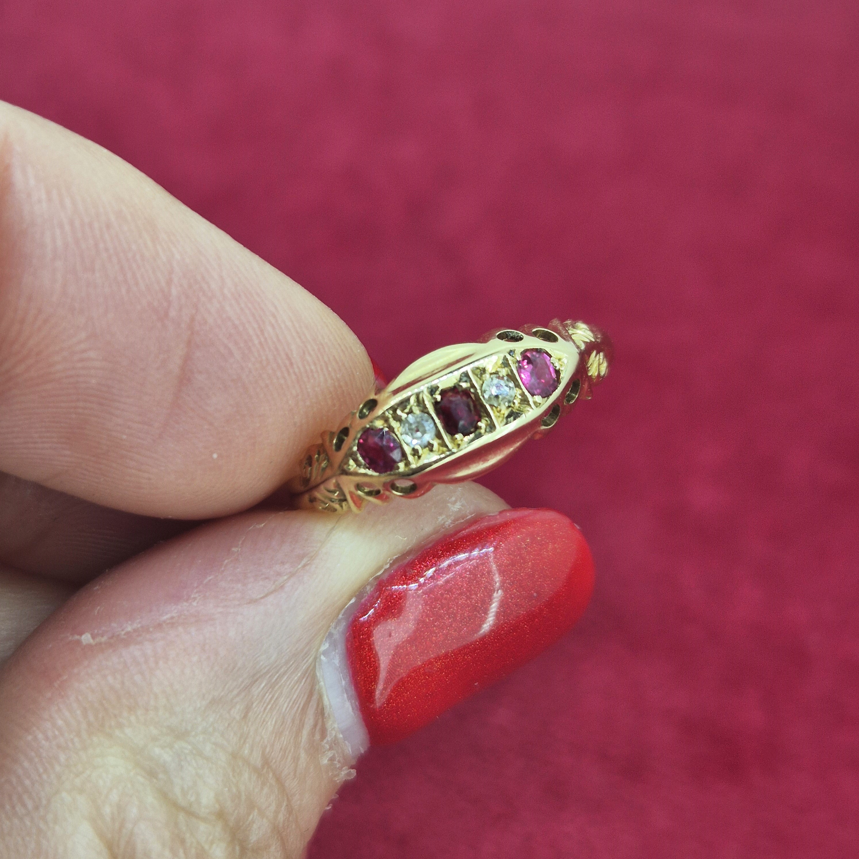 The ring is set with alternating Rubies and Diamonds set in a claw setting. The ring is further detailed by ornate shoulders that have gorgeous scroll work.