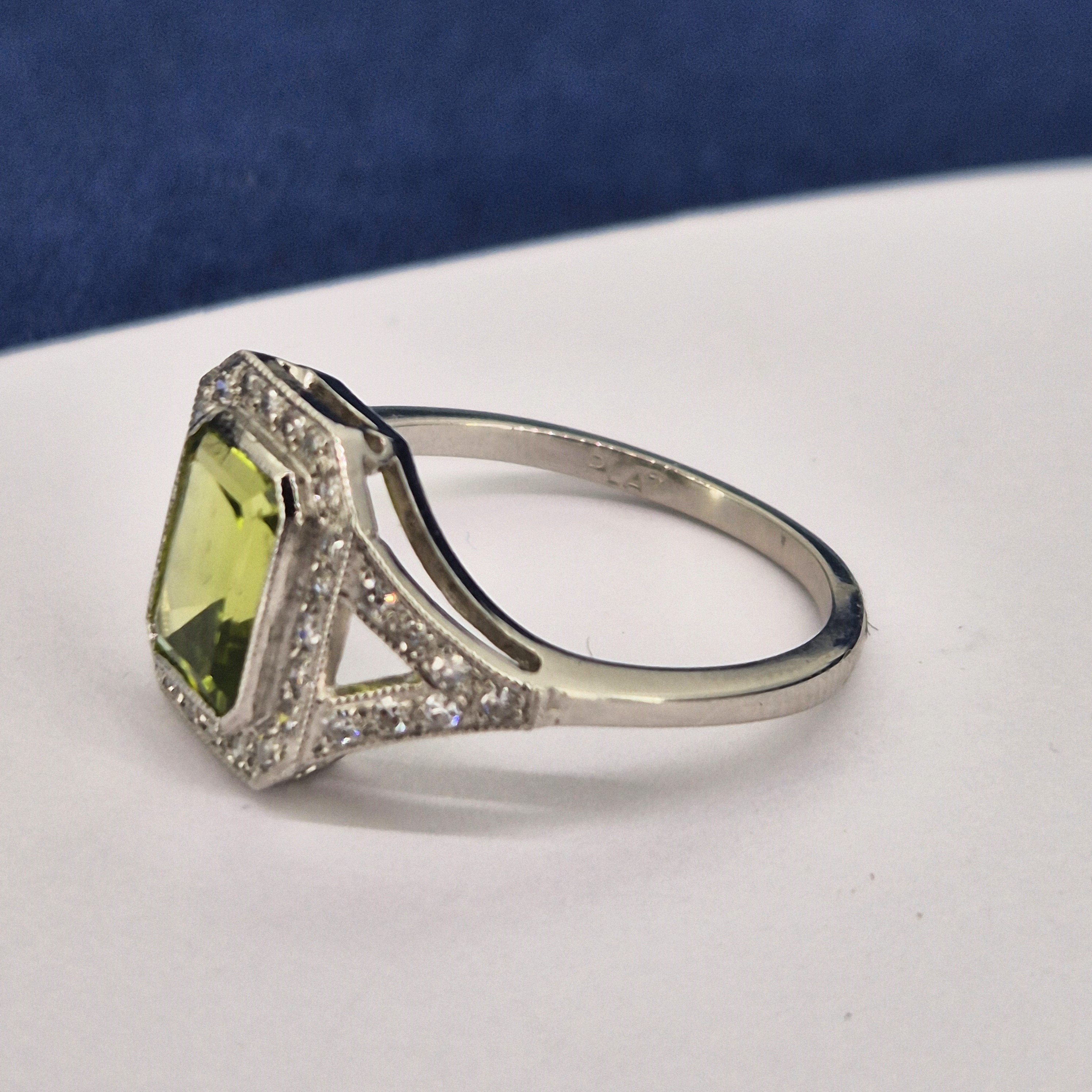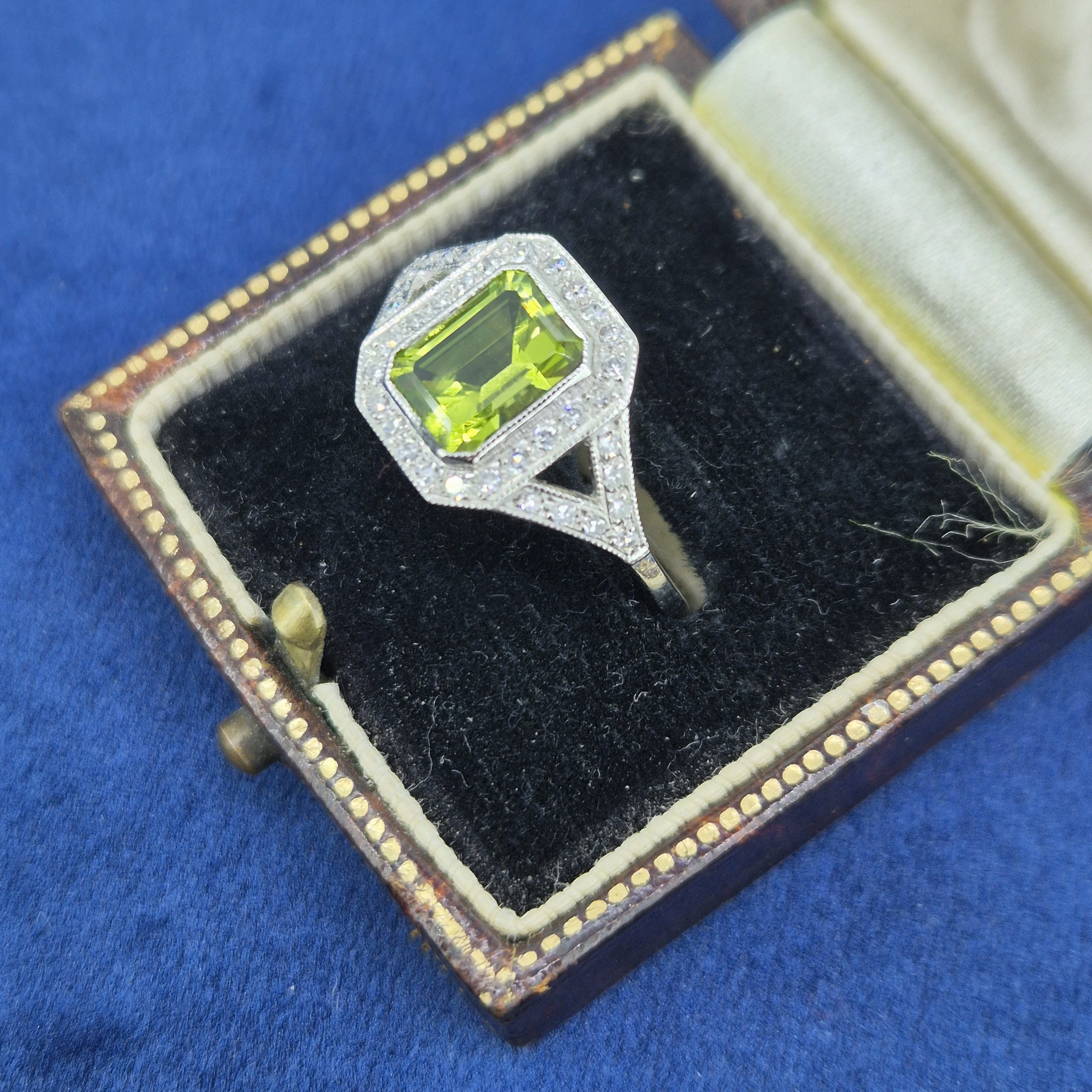 The ring features a central Emerald Cut Peridot that is a wonderful lime green. It measures 8.5mm by 7mm and weighs 1.60cts. It is surrounded by a halo of Round Brilliant Diamonds with split shoulders. The Diamonds weigh 0.30cts.It is stamped Platinum, is currently a Size M 1/2 and can be sized.