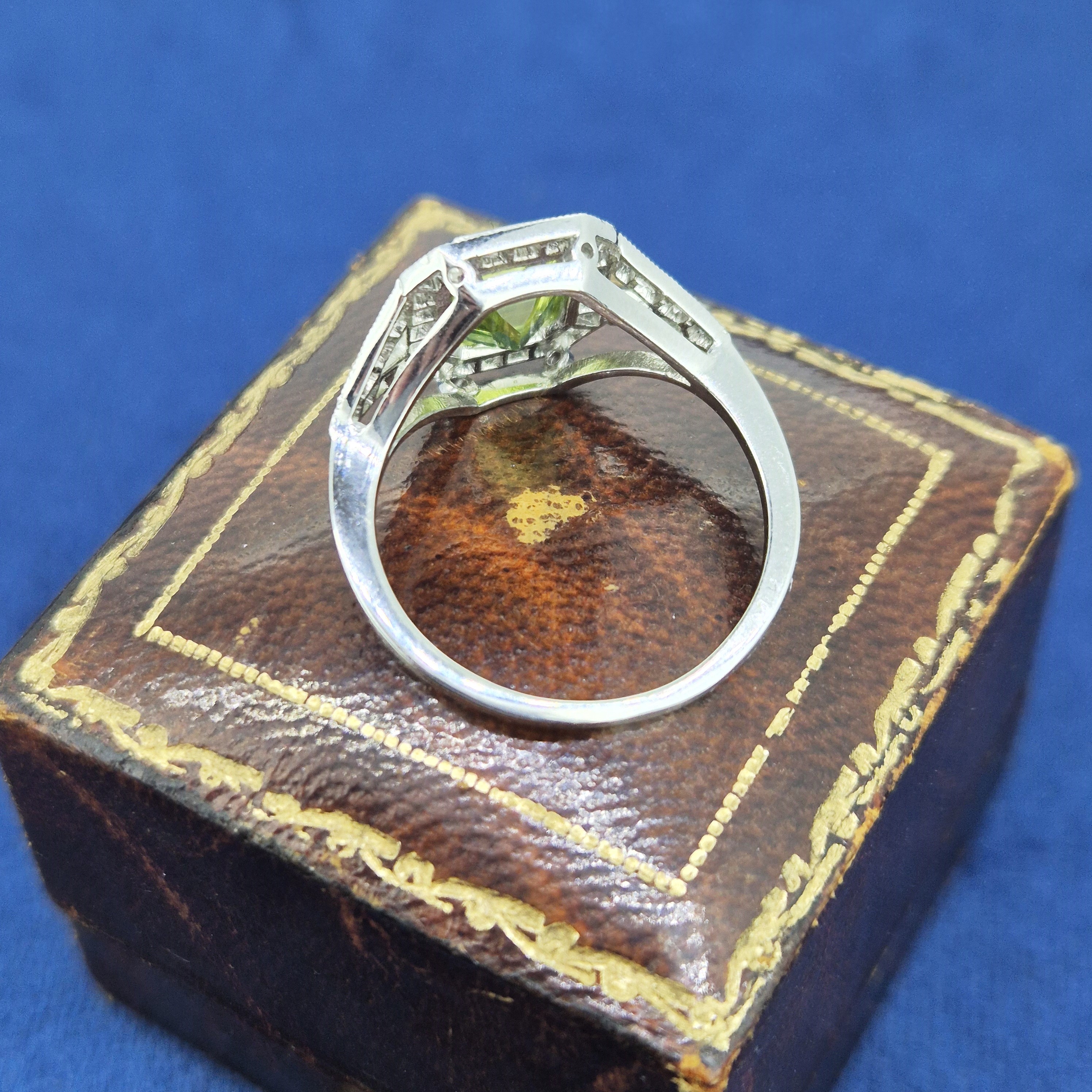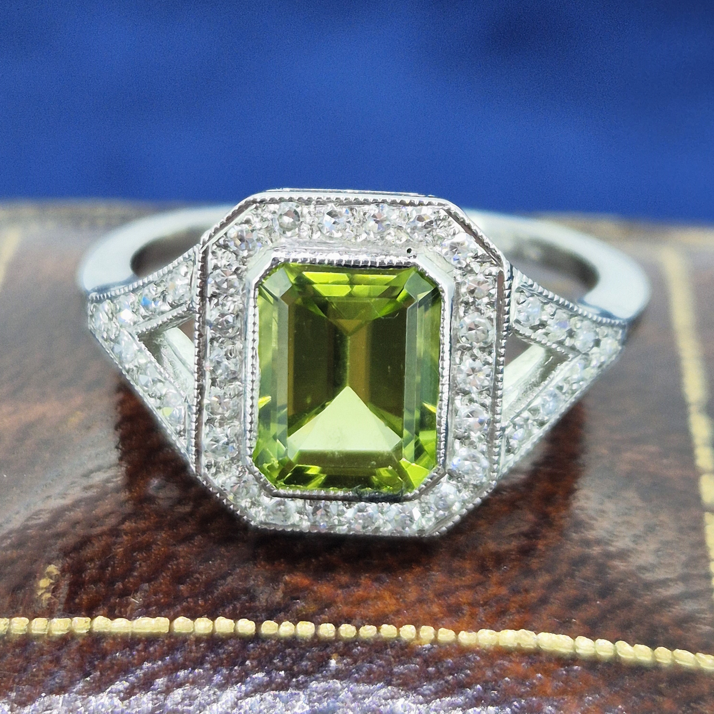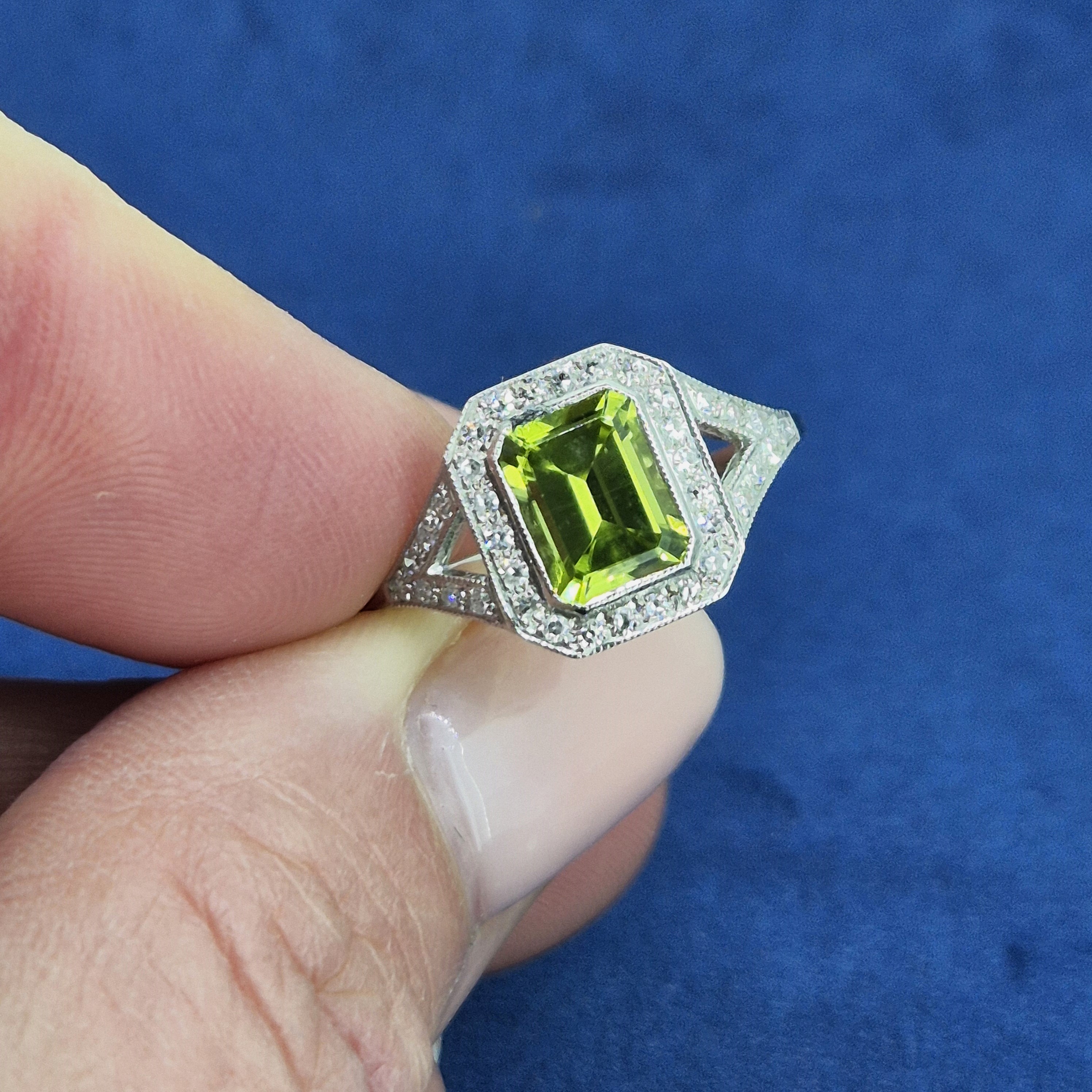 A really lovely Peridot and Diamond Art Deco Ring crafted from Platinum.