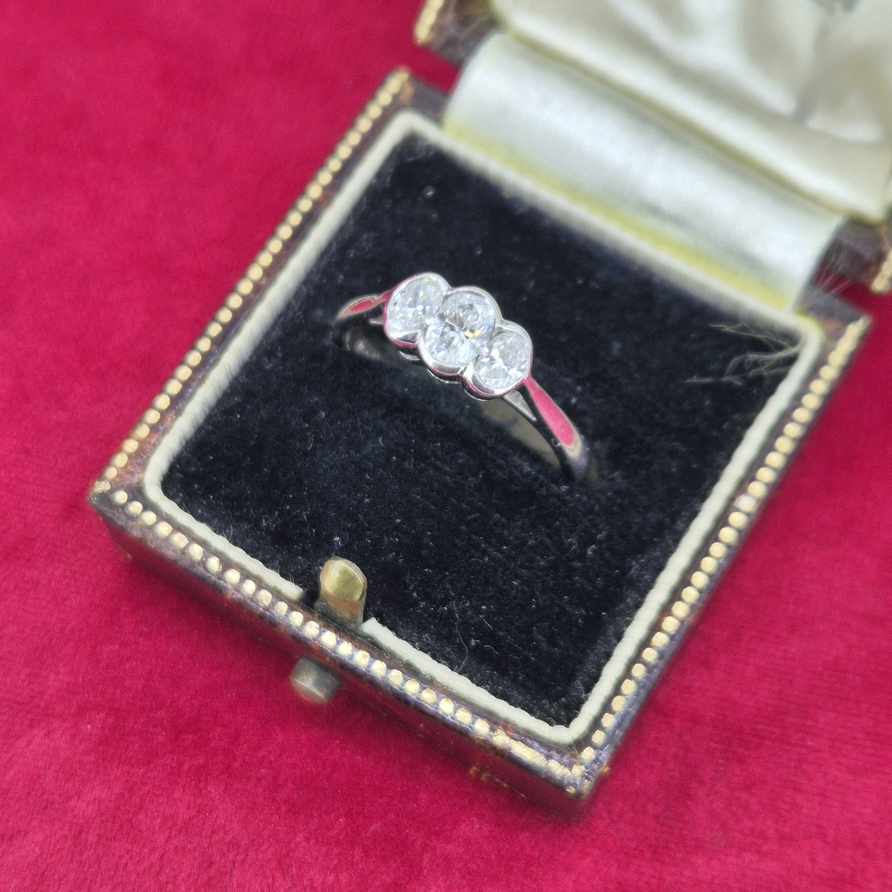 A Beautiful Preowned Three Stone Oval Diamond. Set in 18ct White Gold the ring comprises three Oval Diamonds set in a rub-over setting with a total diamond weight of 0.67cts.