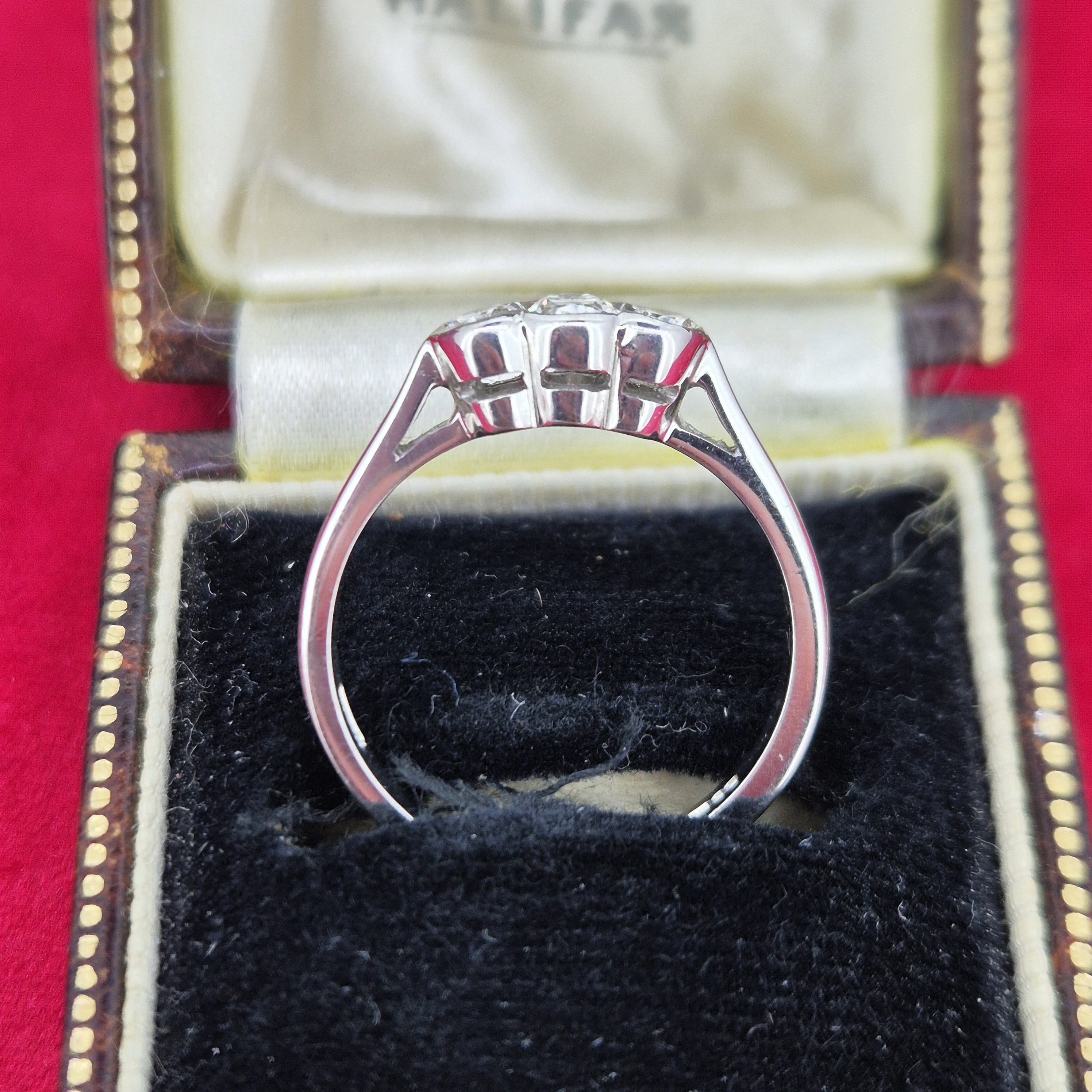 The central stone spreads to 6mm and the three stones together have a 10mm spread. This is a lovely subtle and striking diamond ring. The ring is Size M and can be sized.