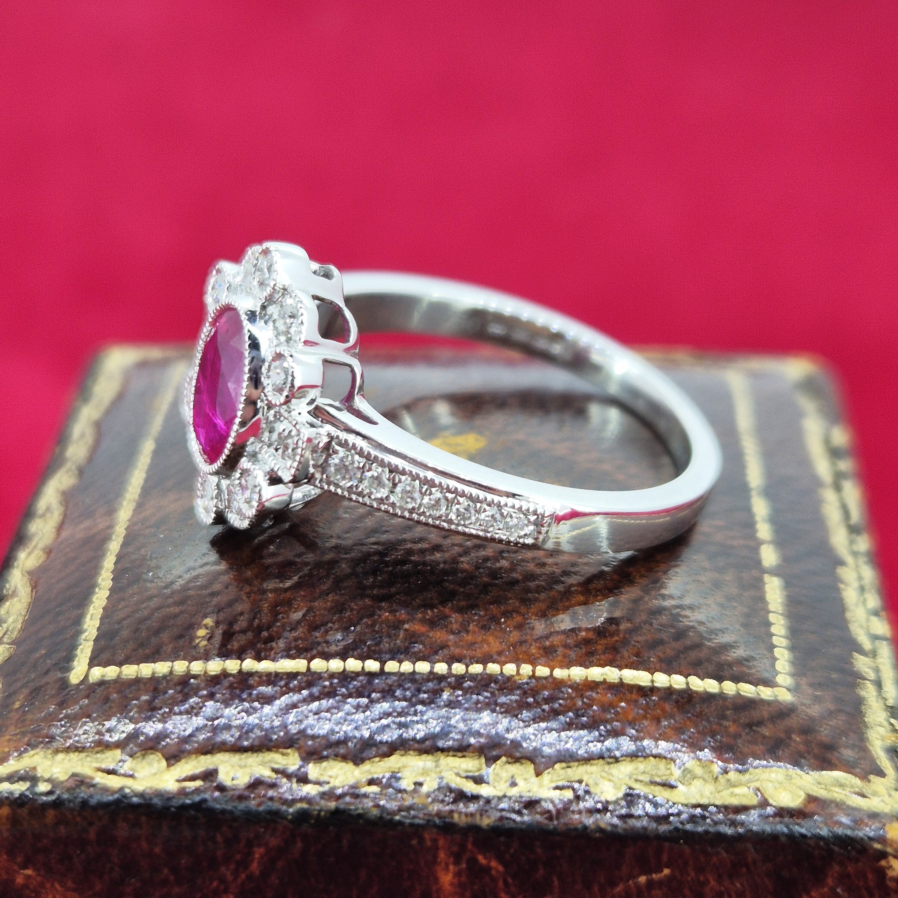 The ring features a vivid pink Ruby in the centre weighing 1.00cts. The Ruby is surrounded by Round Brilliant Diamonds that sparkle wonderfully and has a Baguette Diamond set either side. The Diamonds weigh 0.25cts in total.