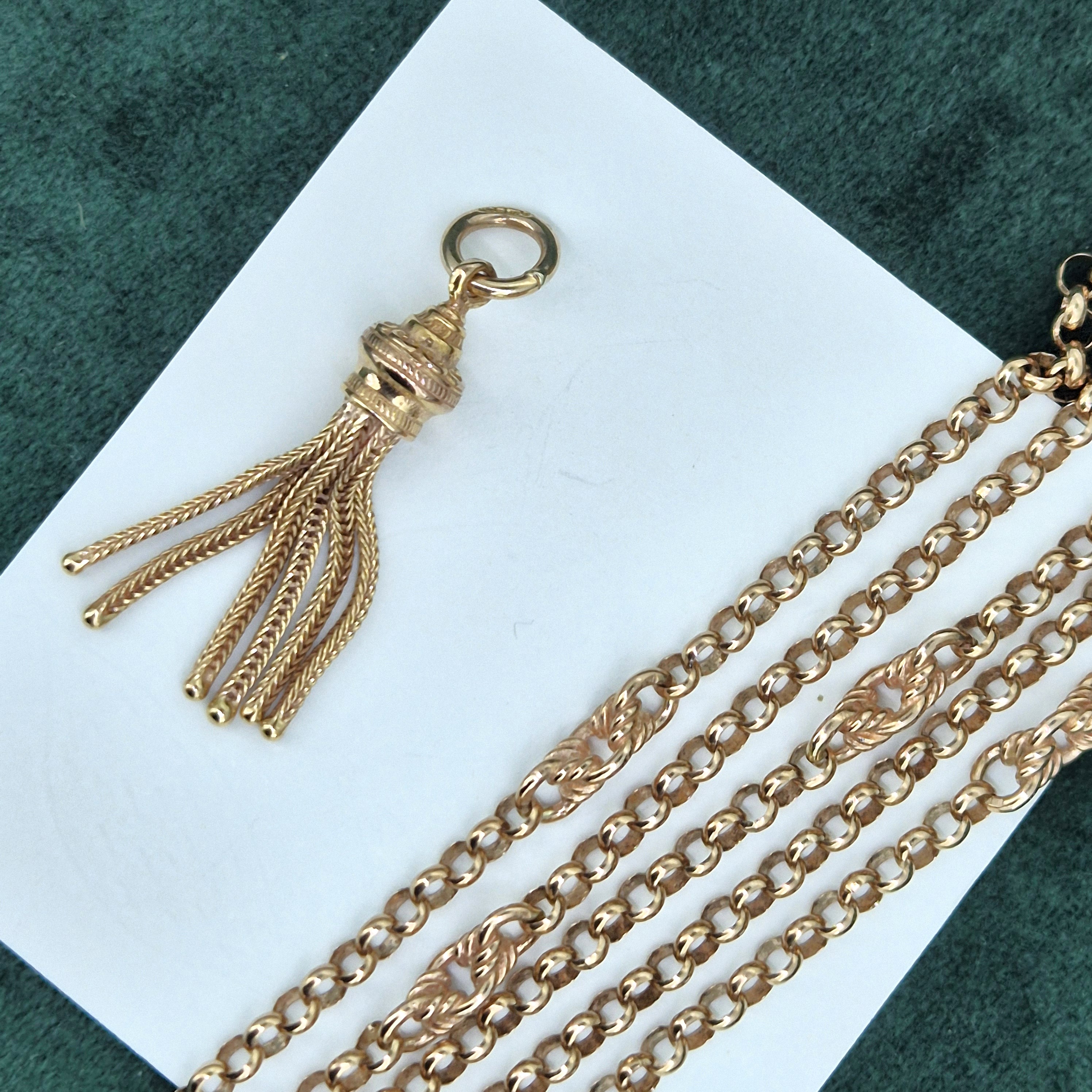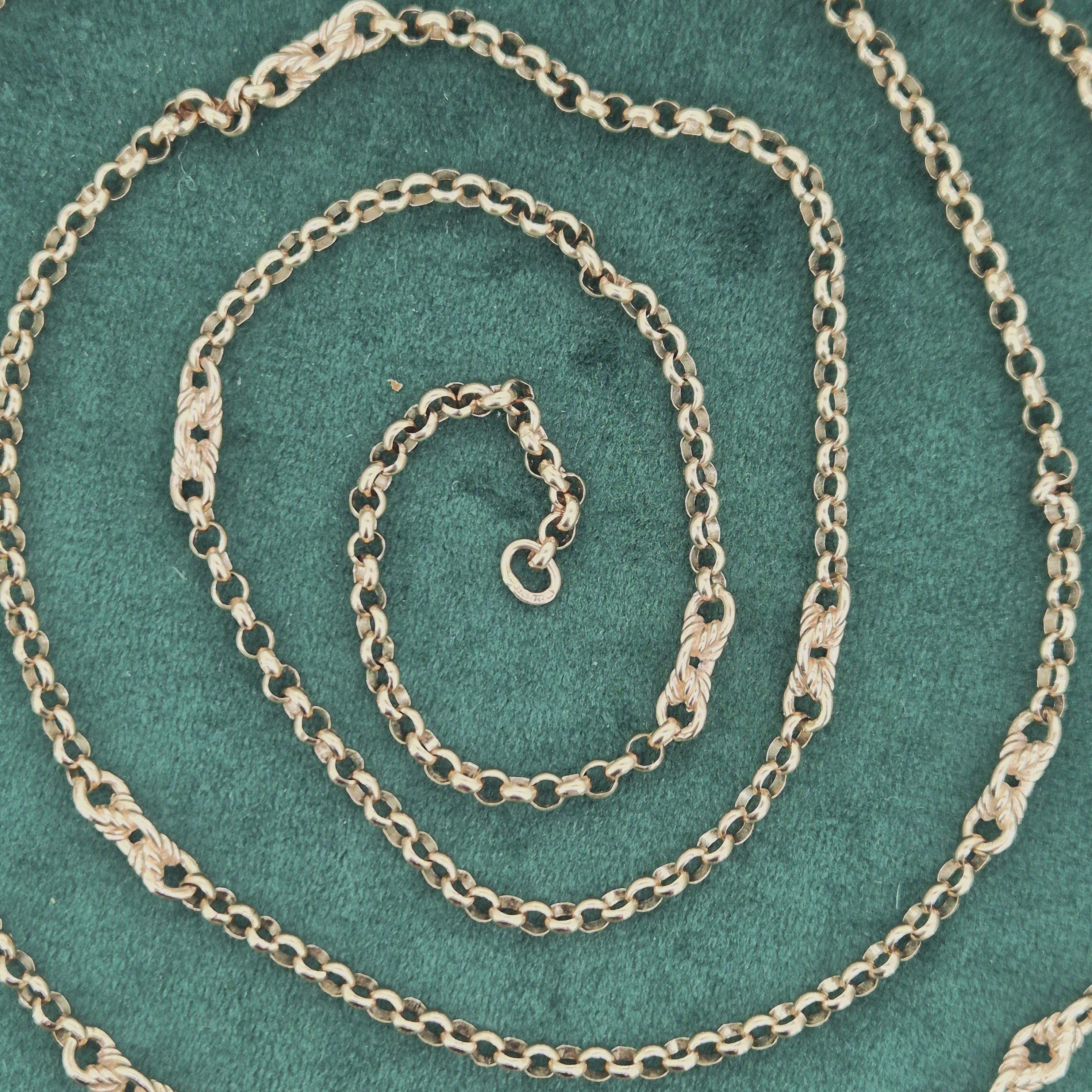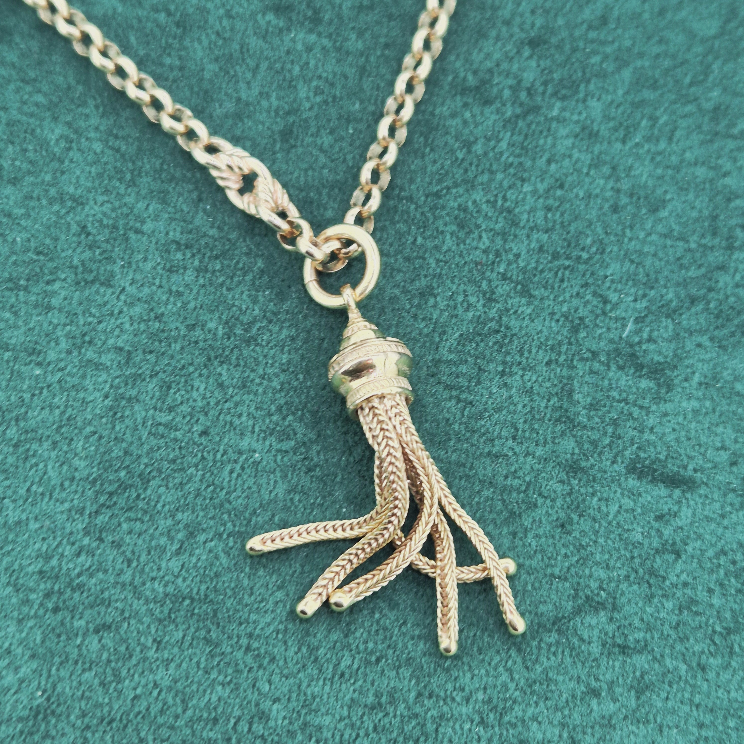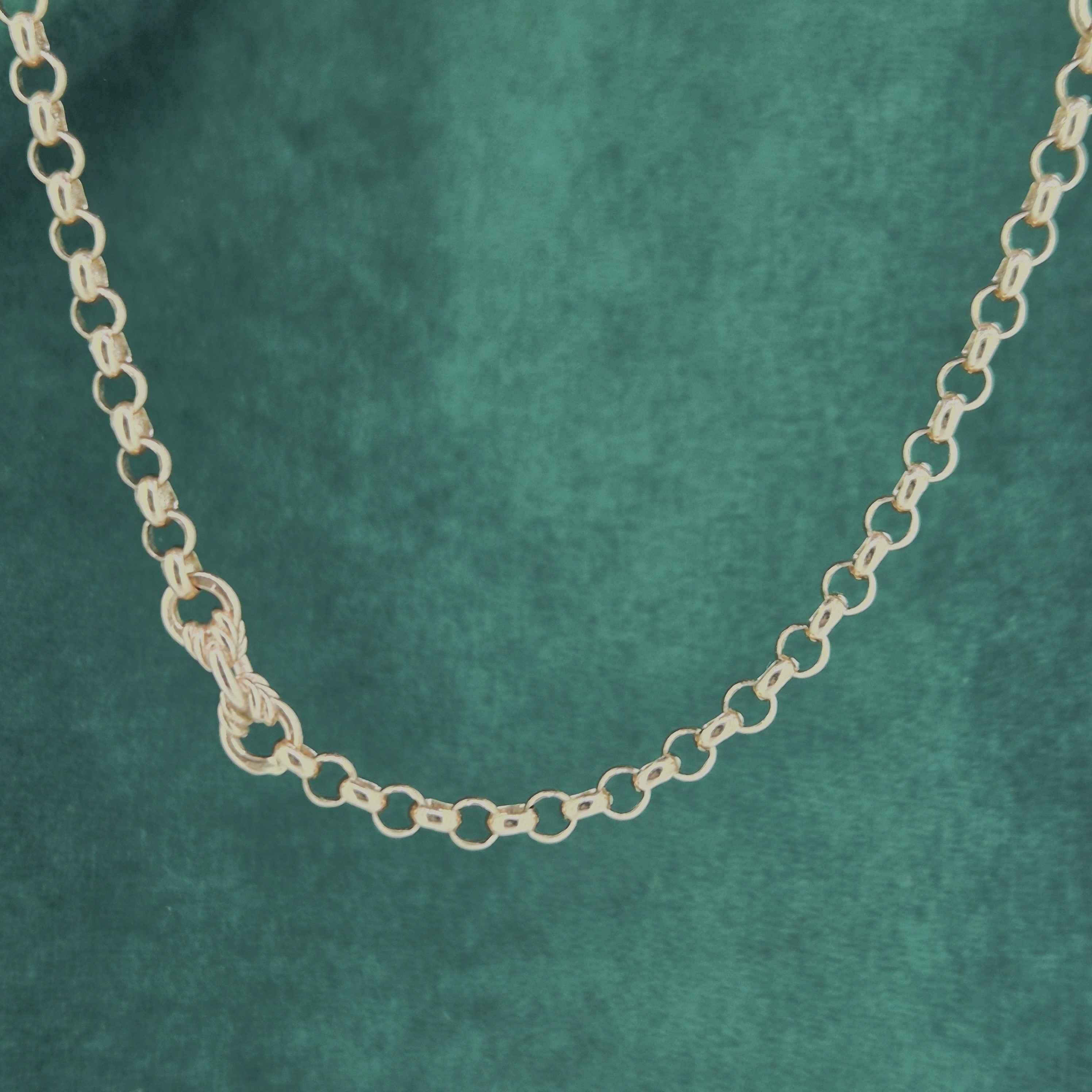 The chain features Belcher links that measure 3mm in width with twisted Fetter style links placed in-between. It is fitted with a Tassel pendant that rolls along the links, it weighs 3.4 grams that can be removed if necessary.
