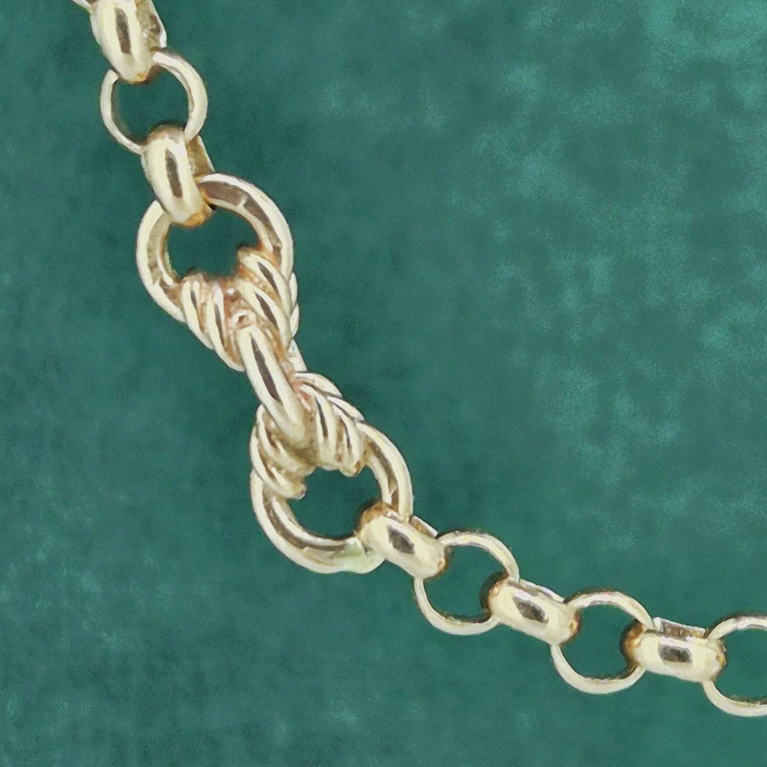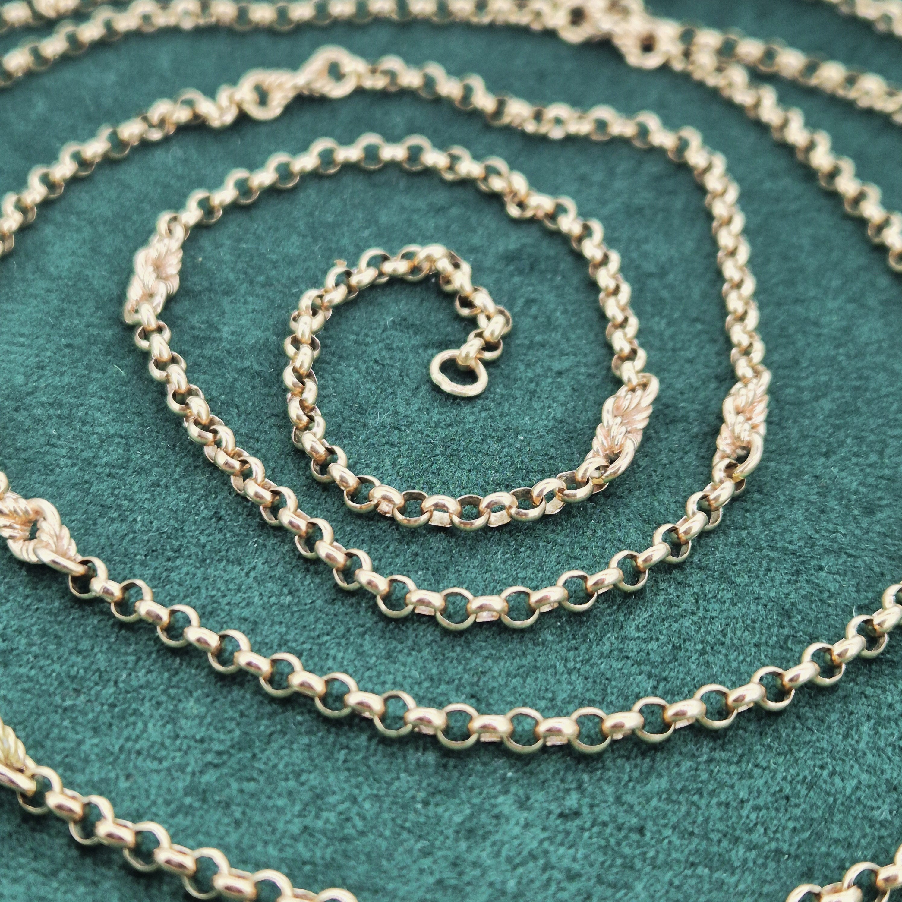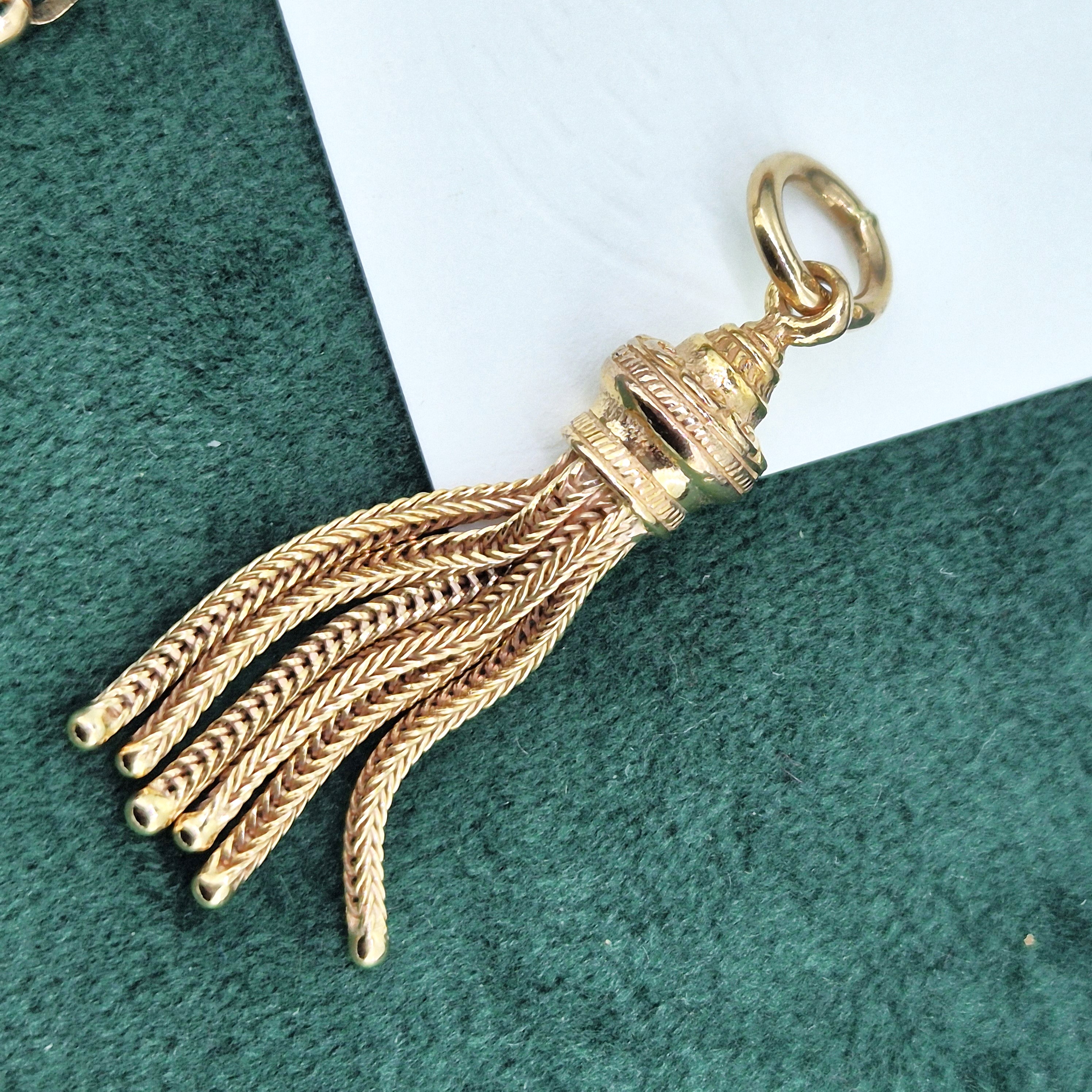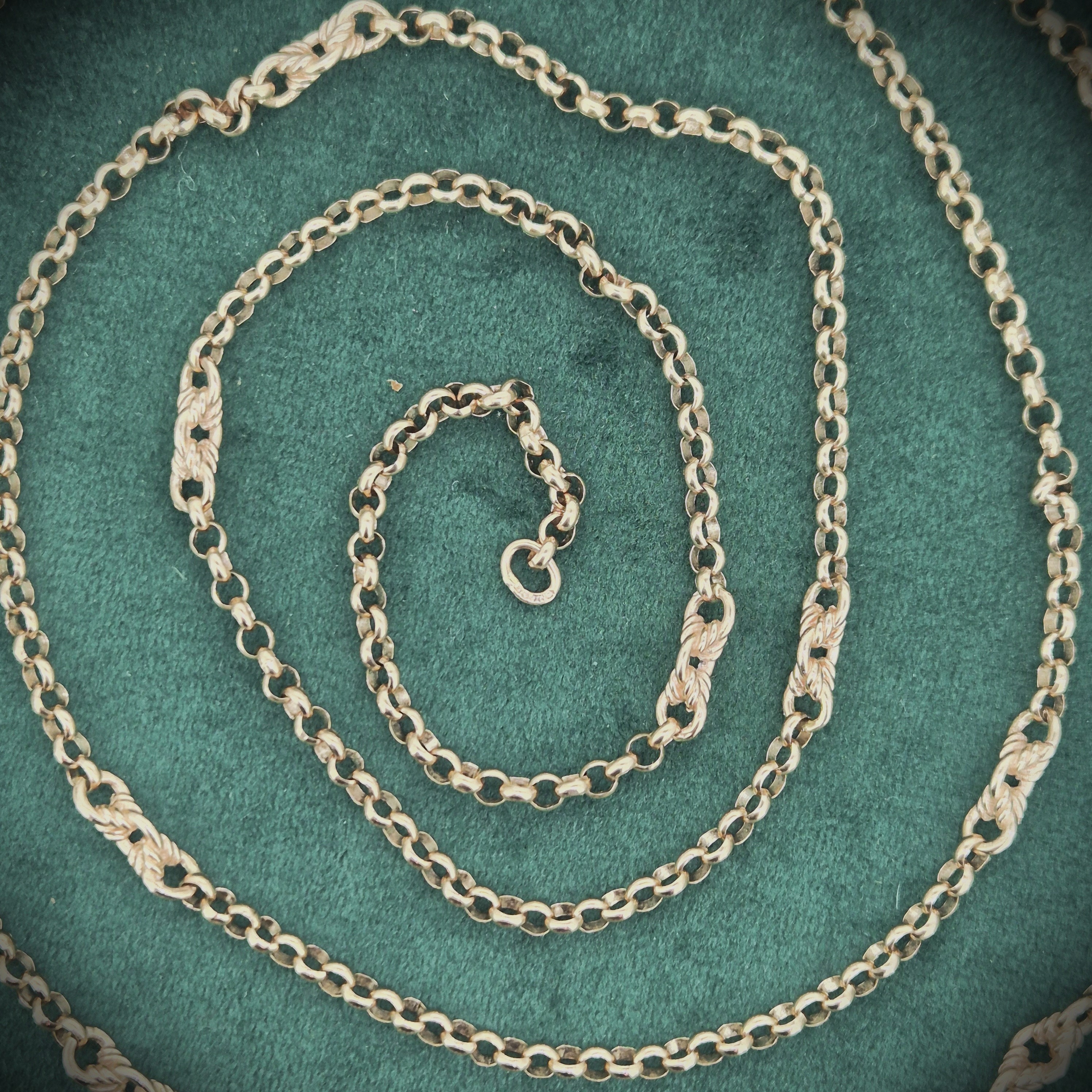 The chain features Belcher links that measure 3mm in width with twisted Fetter style links placed in-between. It is fitted with a Tassel pendant that rolls along the links, it weighs 3.4 grams that can be removed if necessary.