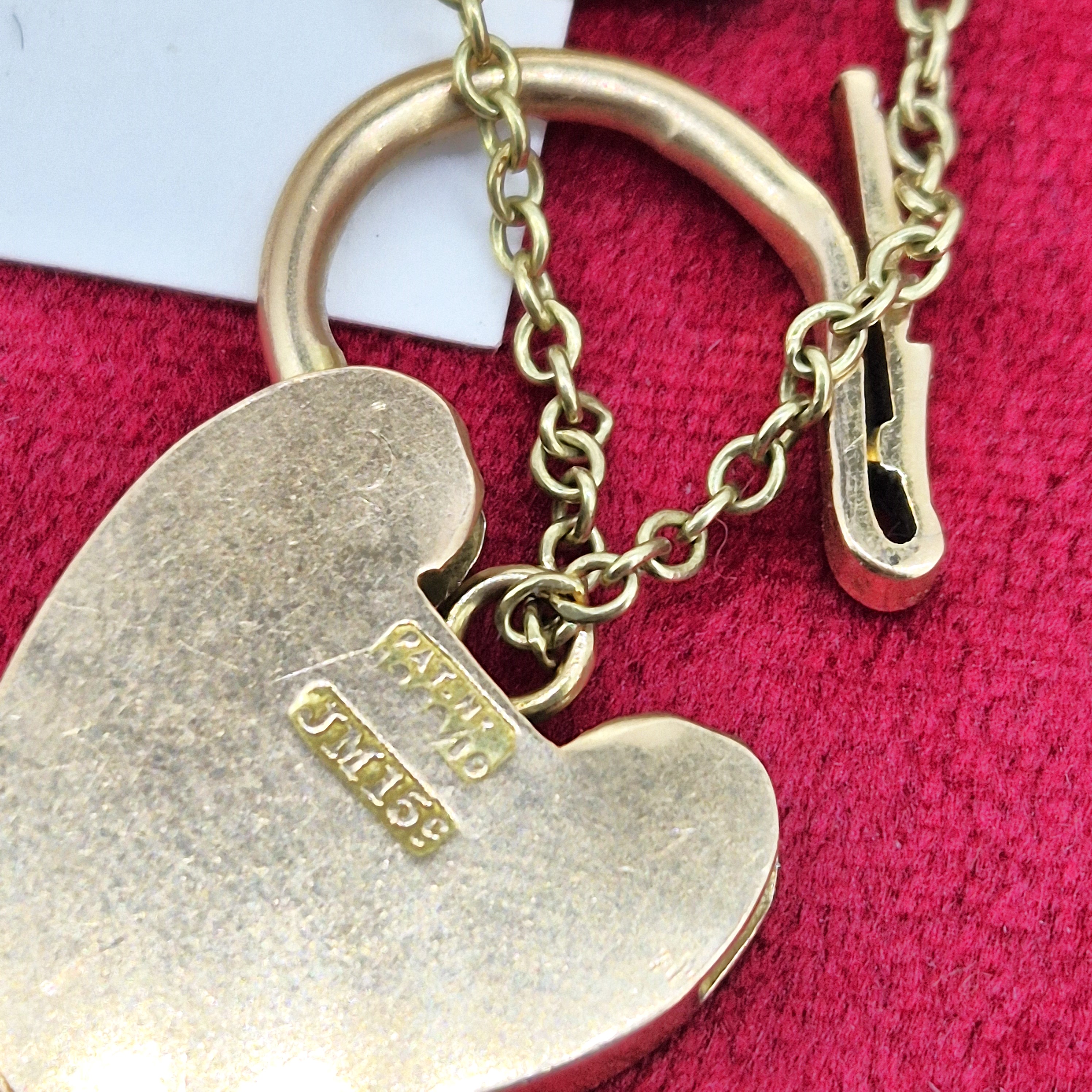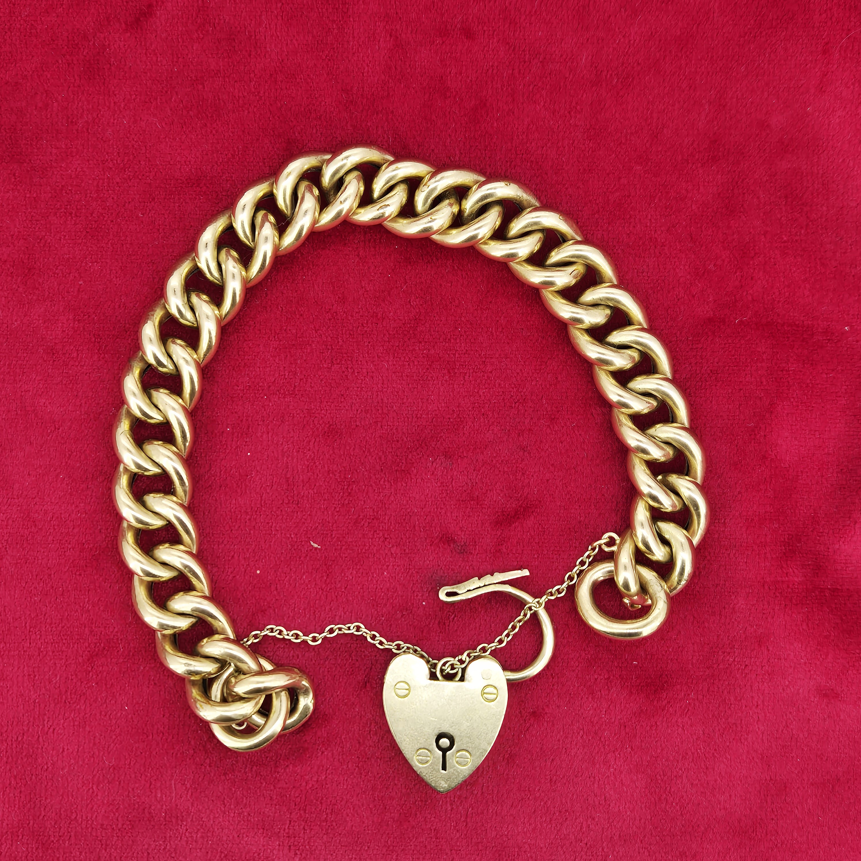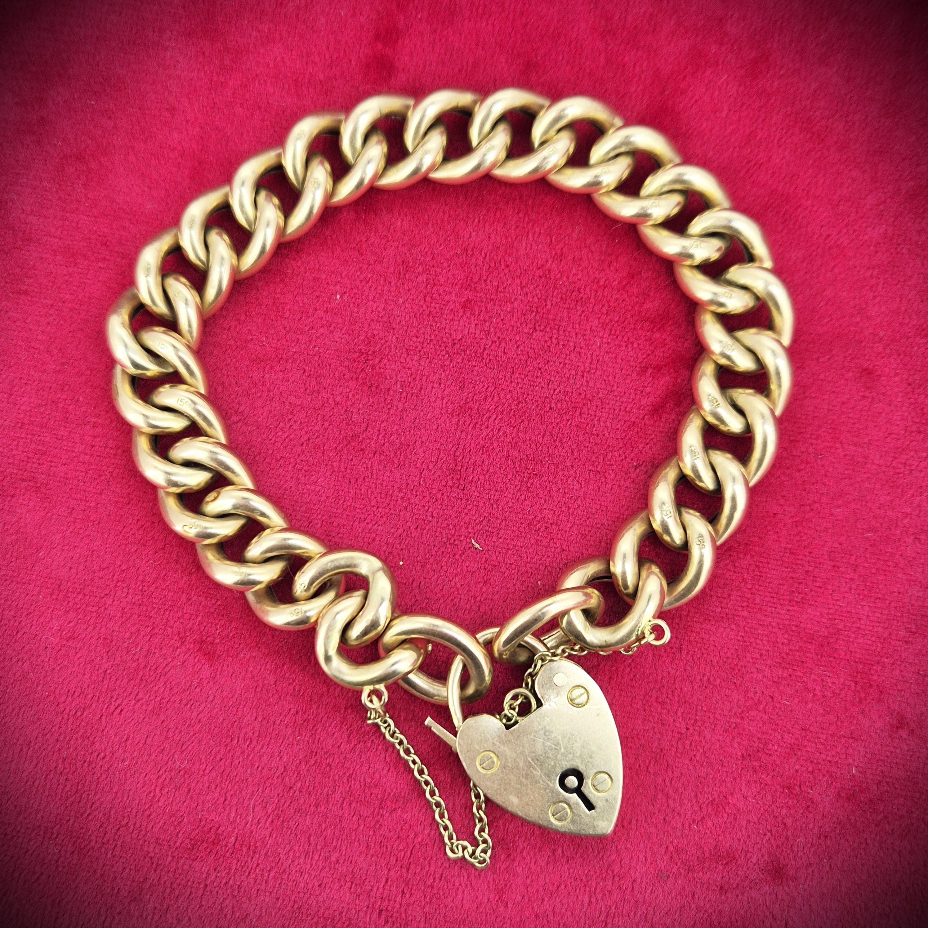 The Bracelet is secured by a heart padlock and safety chain. The padlock is hallmarked 15ct and is stamped with the Makers Mark JM for John Mantle of Warstone Lane, Birmingham.