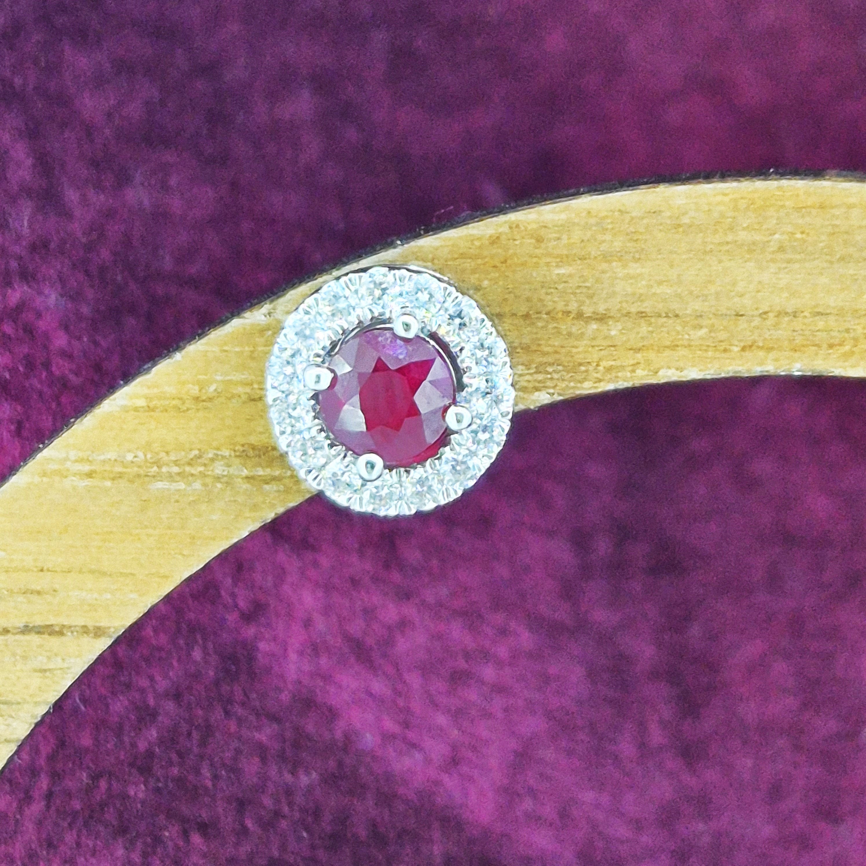 The earrings are set with gorgeous, deep red rubies in the centre that weighing 0.35cts each and are surrounded by a halo of Round Brilliant Diamonds that weigh 0.10cts in each earring. The total Ruby weight is 0.70cts and the total Diamond weight is 0.20cts.