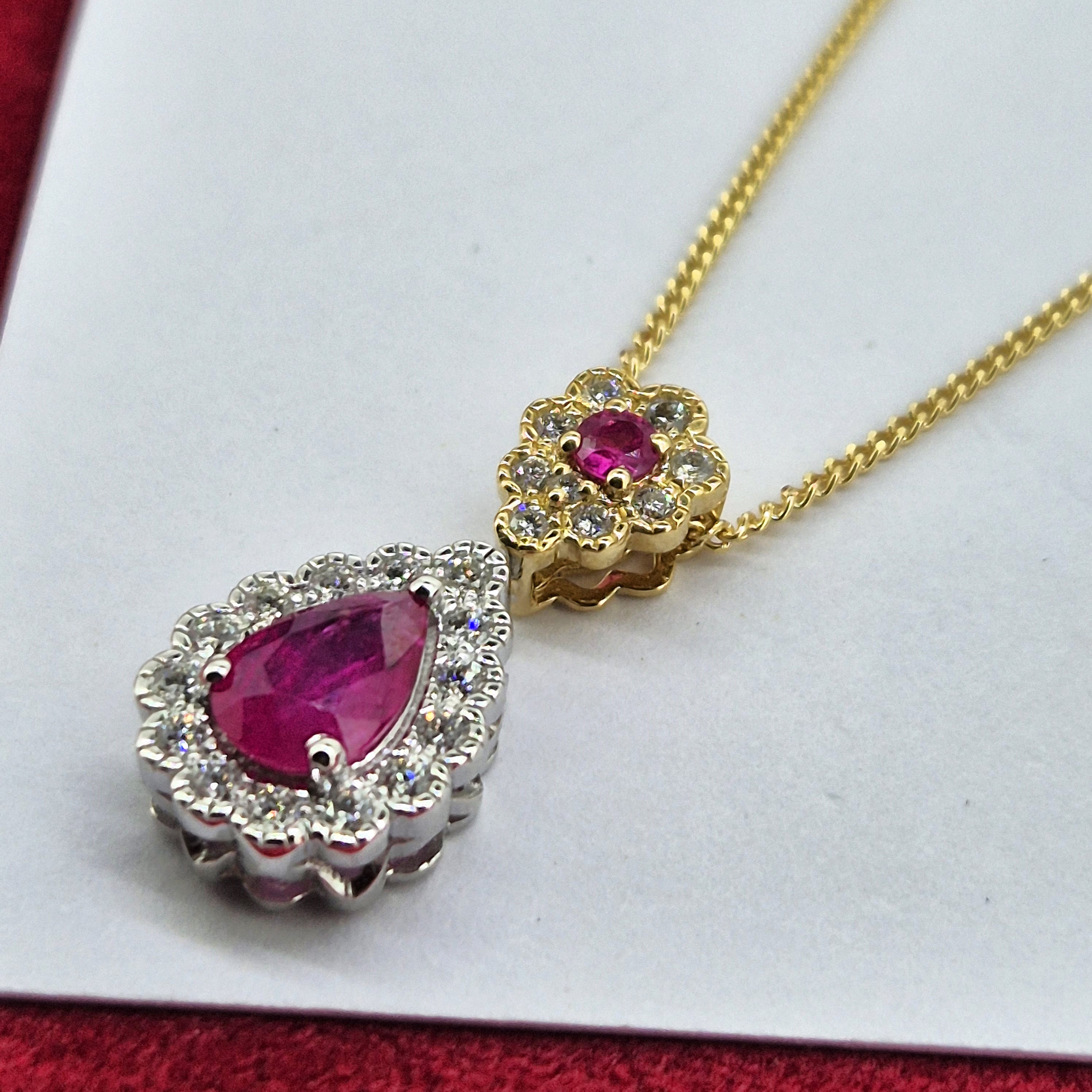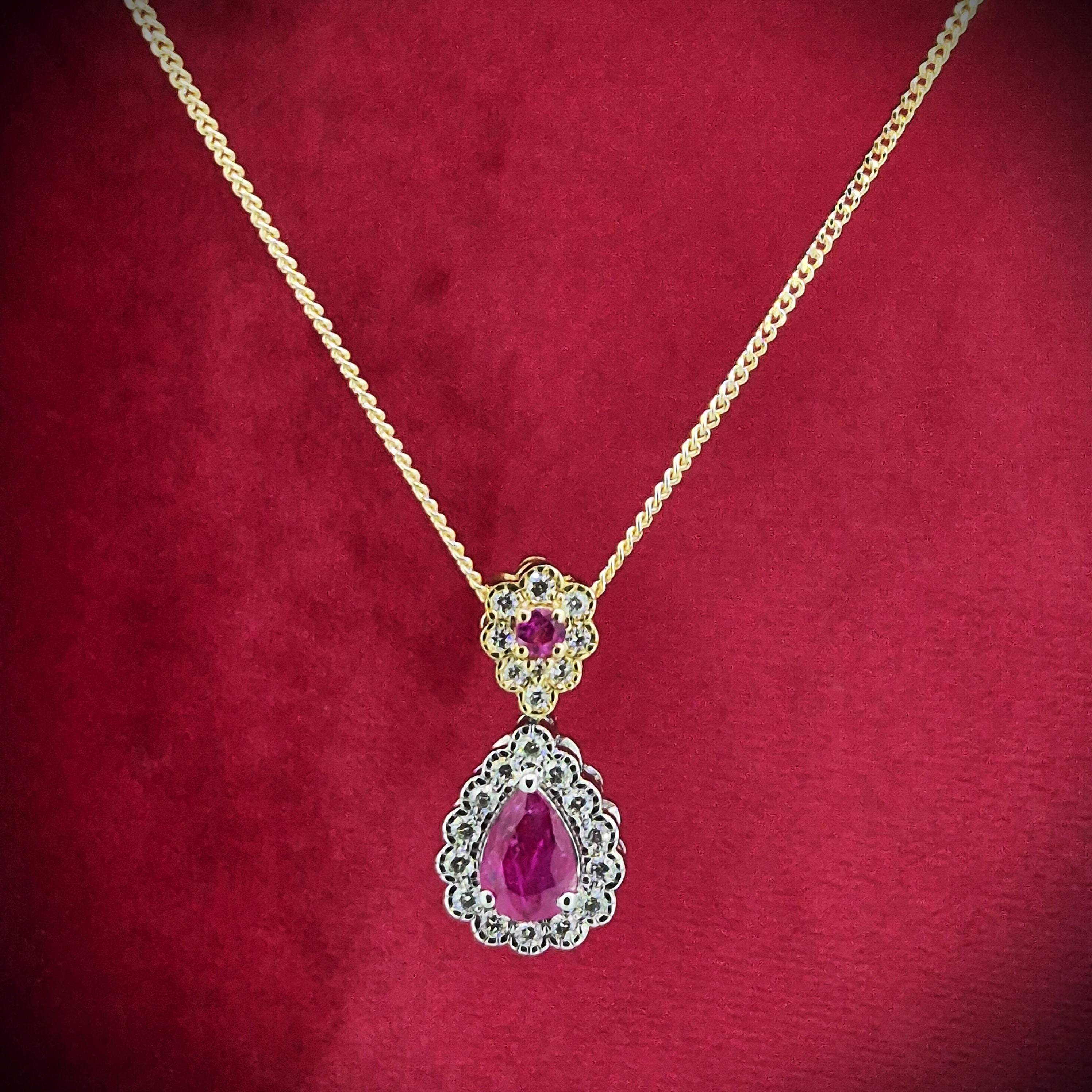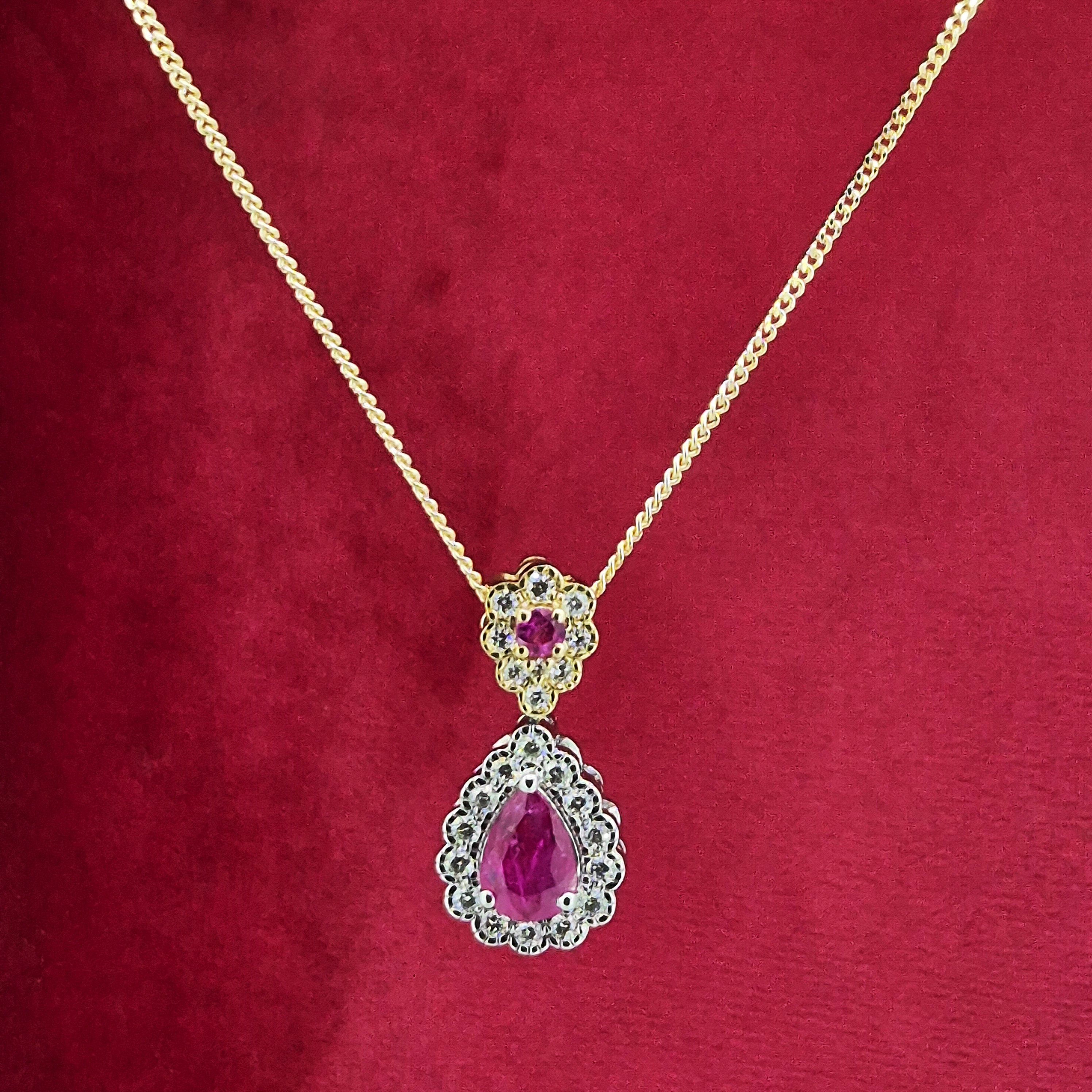 The pendant features a Pear Shape Ruby and a Round Ruby above that weigh 0.65cts and are both vibrant. These Rubies are surrounded by a halo of Round Brilliant Diamonds that weigh 0.25cts.