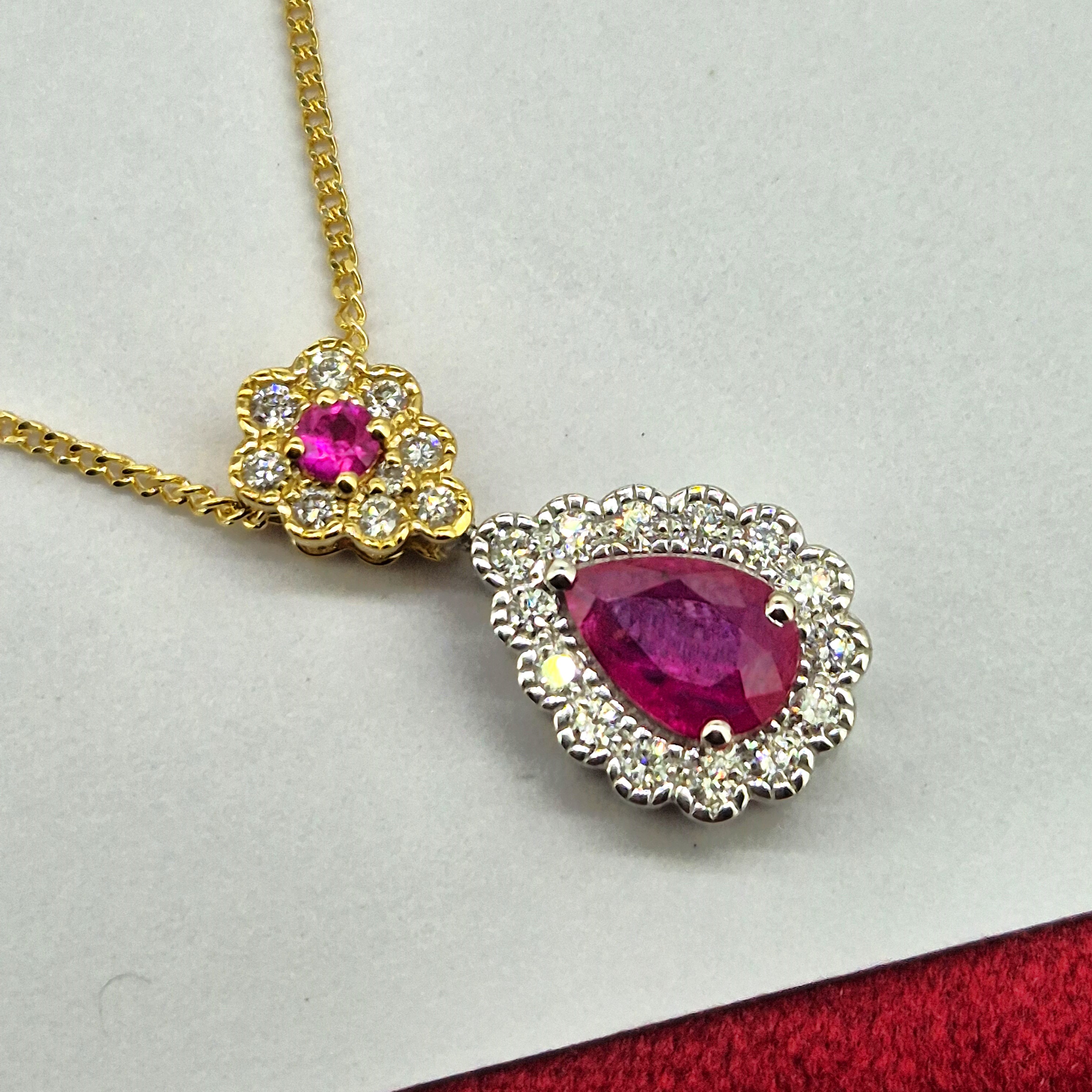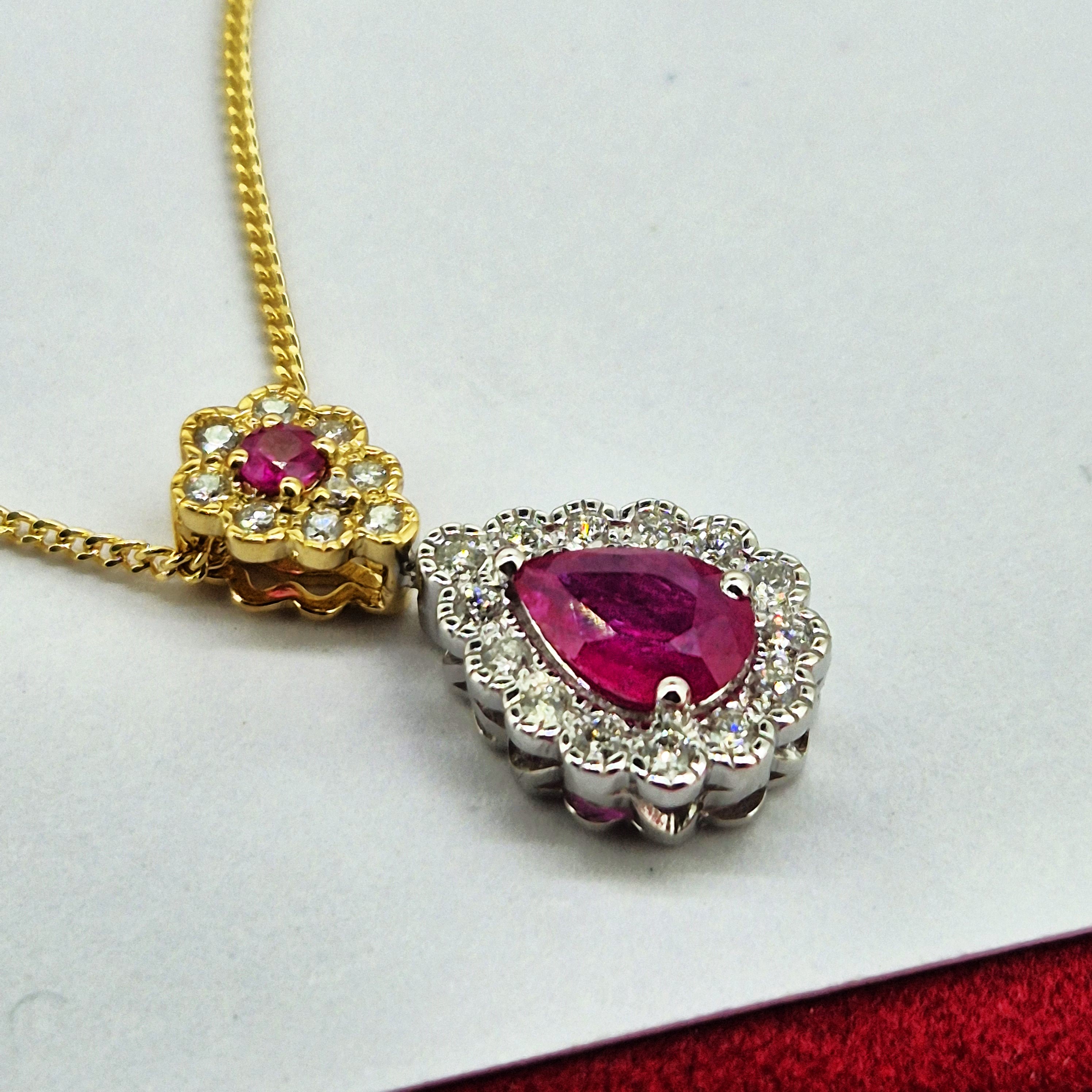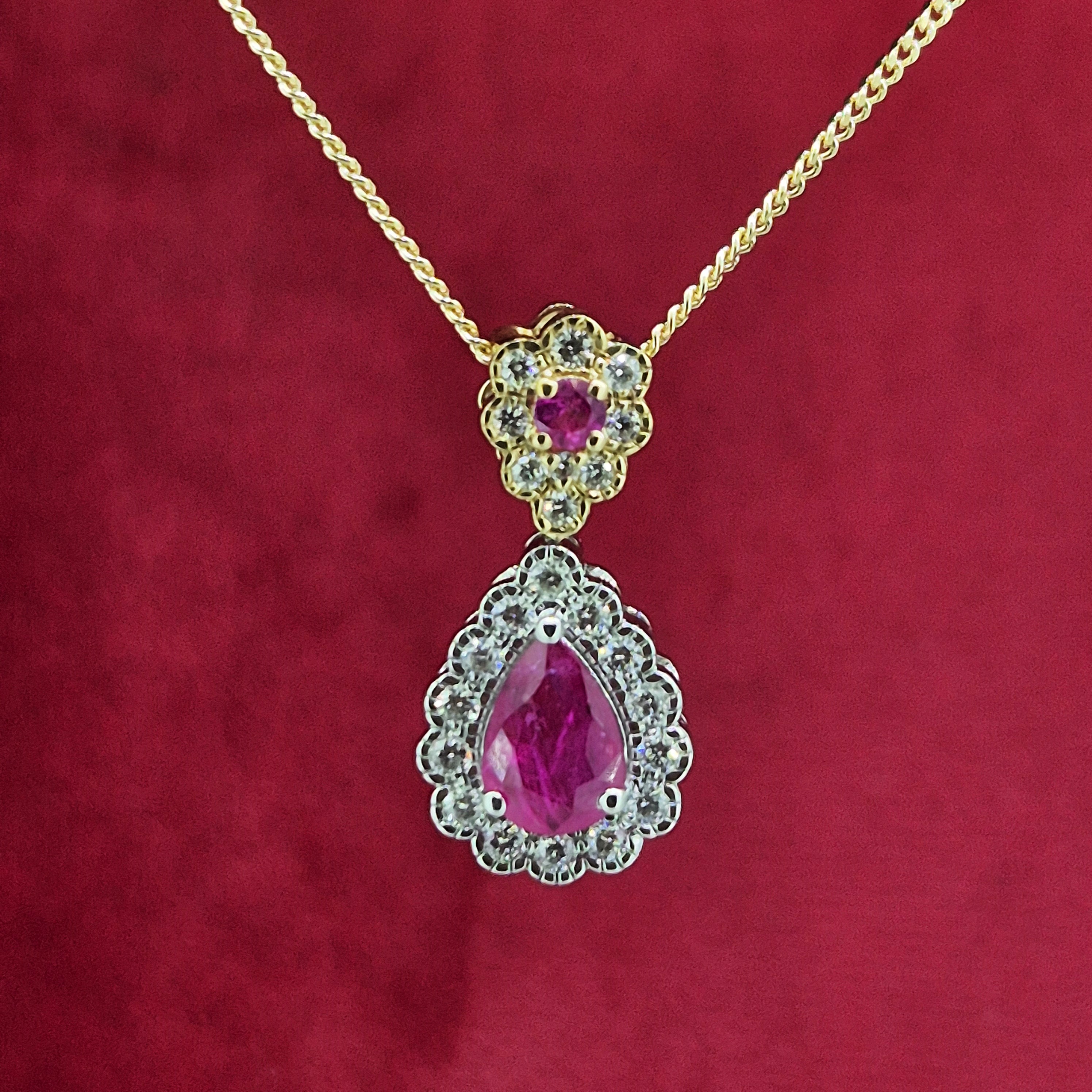 The pendant features a Pear Shape Ruby and a Round Ruby above that weigh 0.65cts and are both vibrant. These Rubies are surrounded by a halo of Round Brilliant Diamonds that weigh 0.25cts.