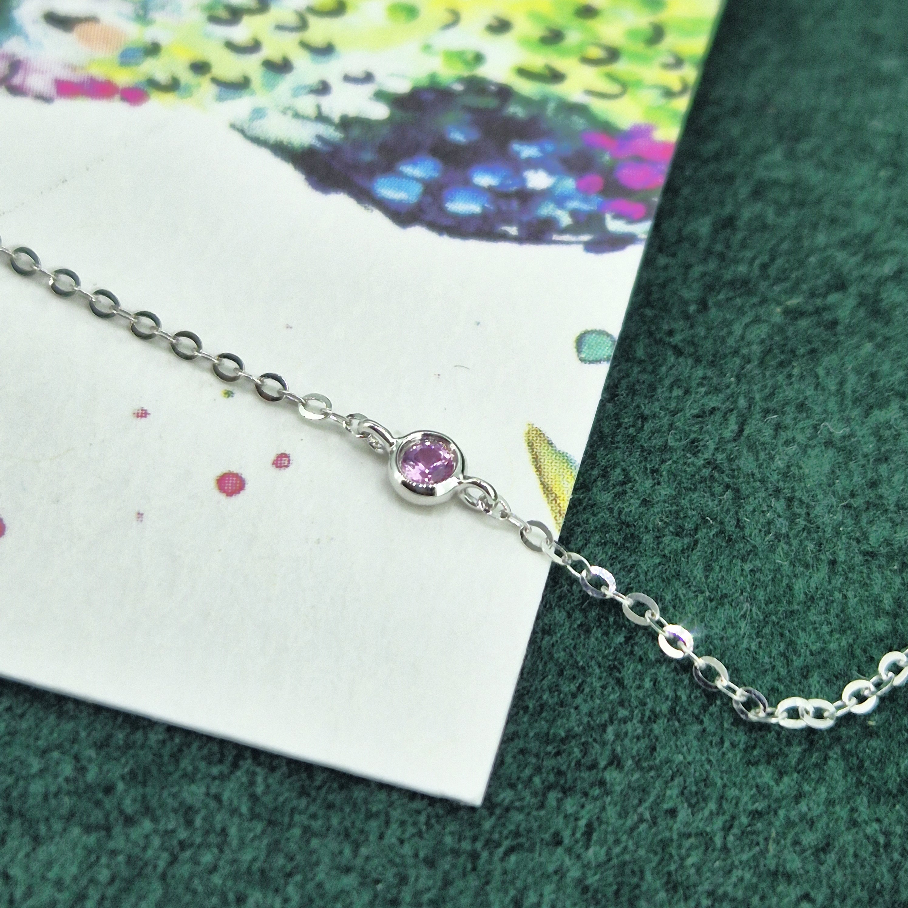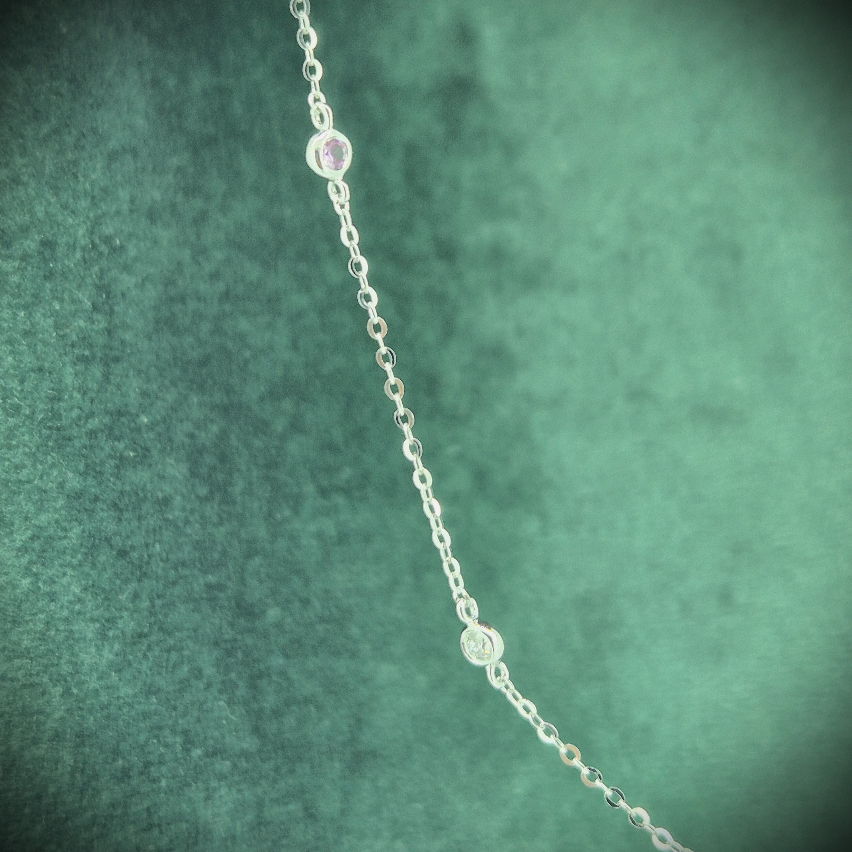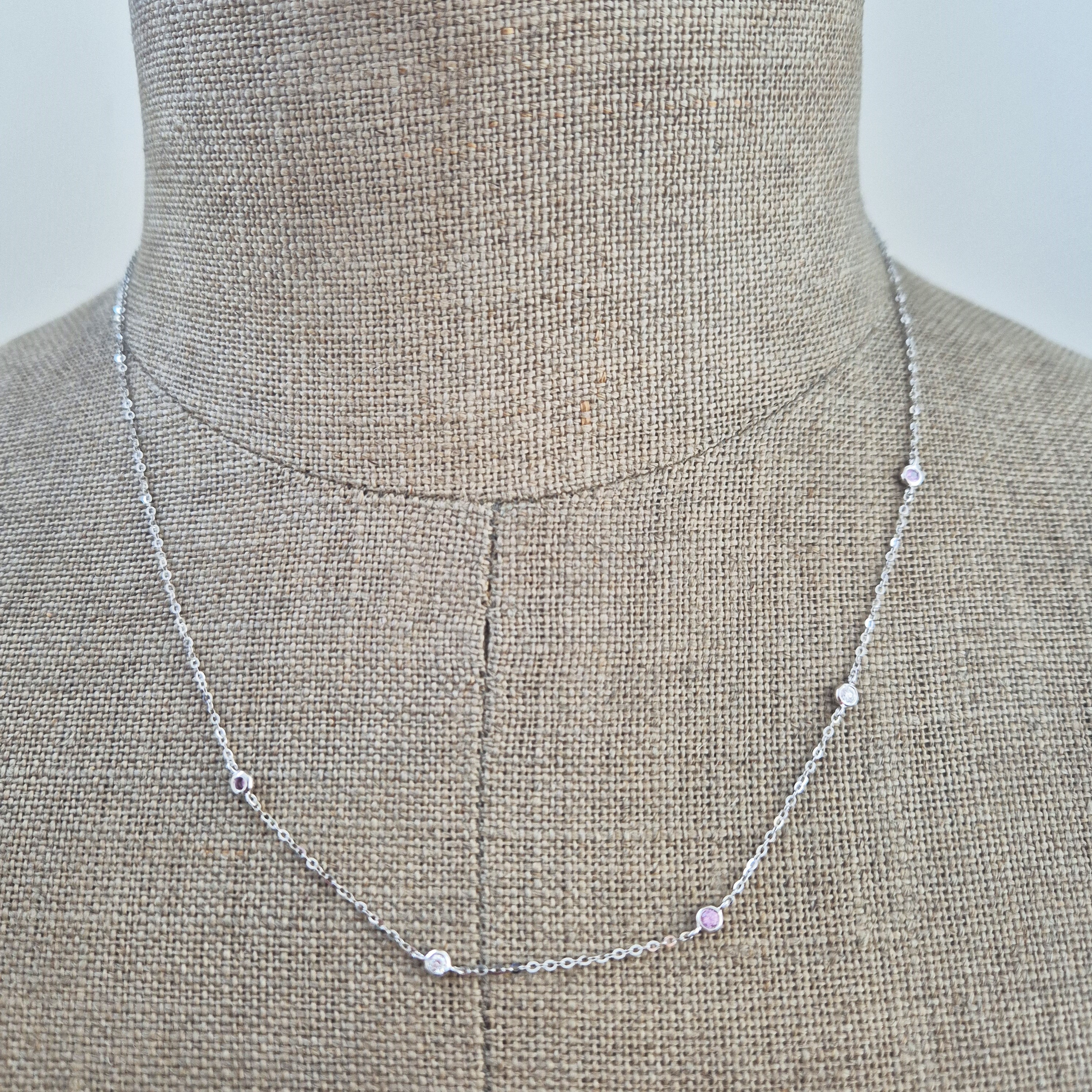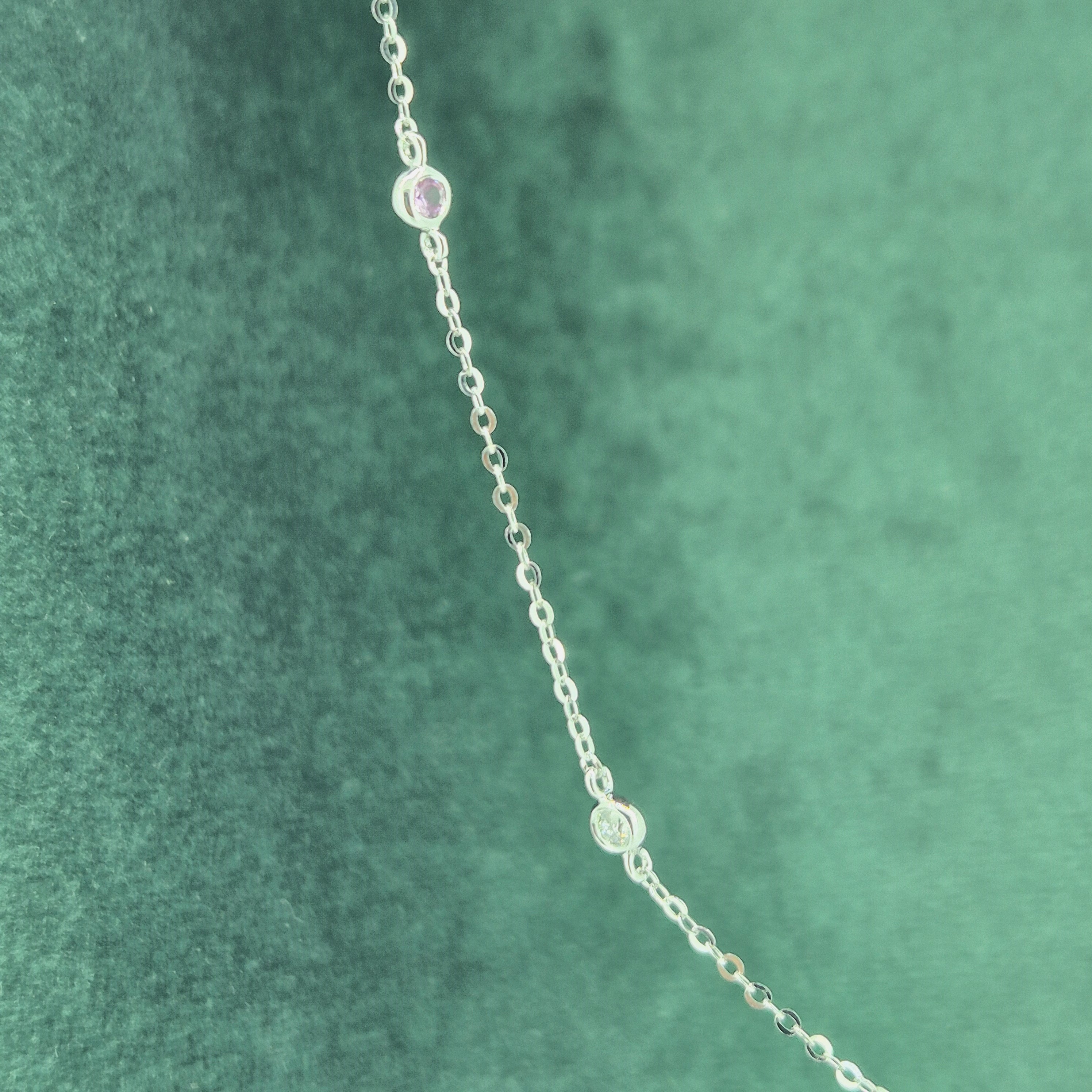 The necklace features alternating Pink Sapphires and Round Brilliant Diamonds set in smooth rub-over settings. The Pink Sapphires weigh 0.12cts and the Diamonds weighing 0.08cts.