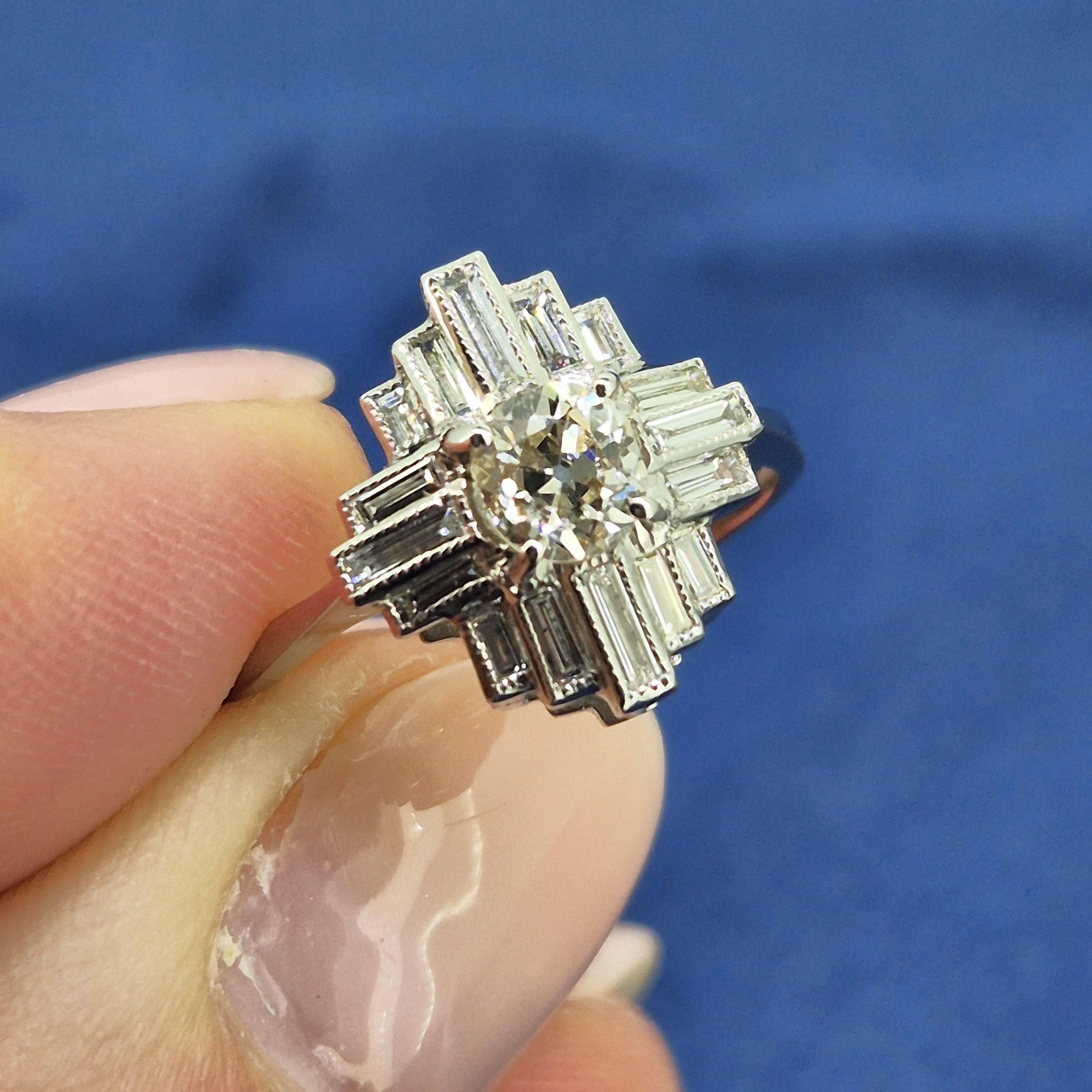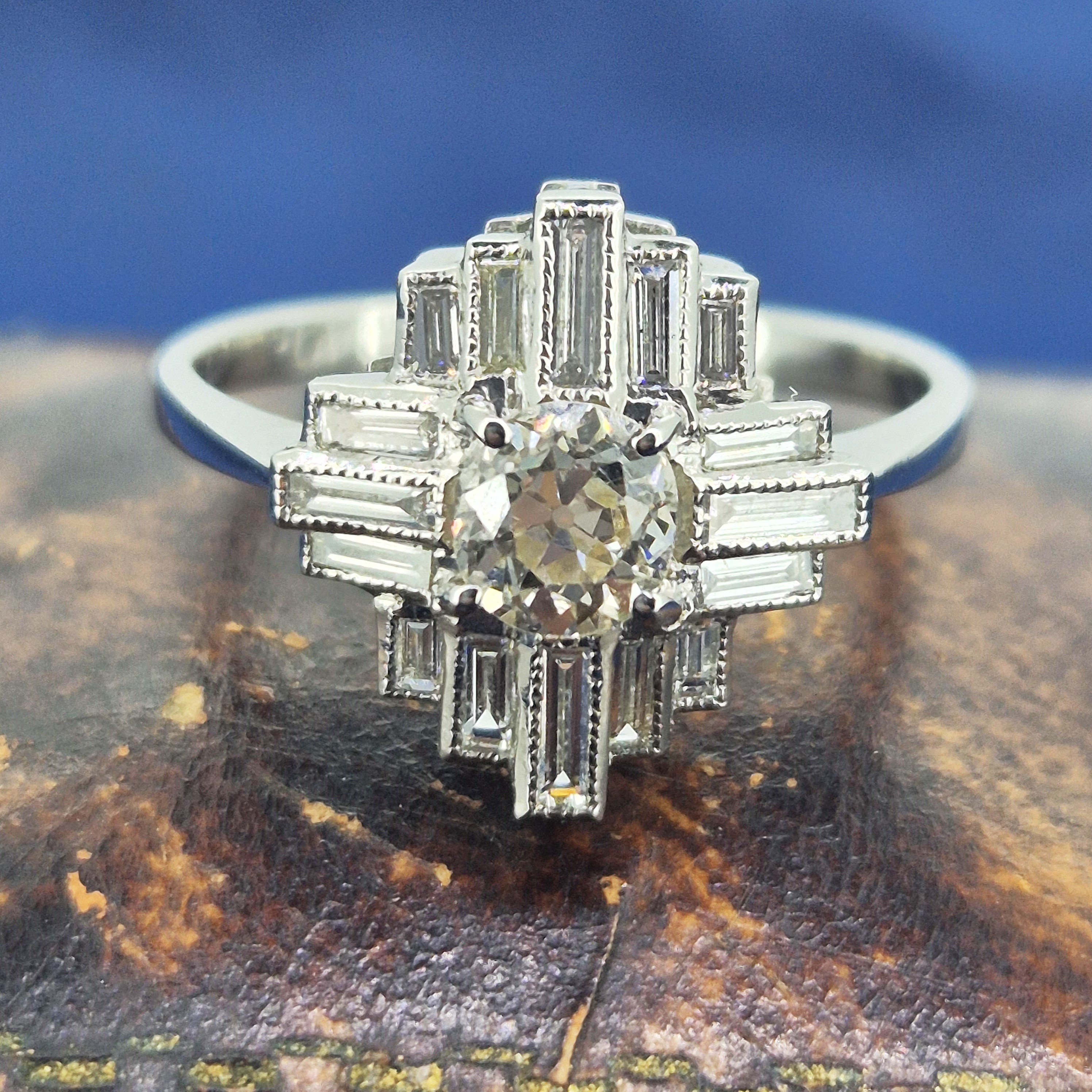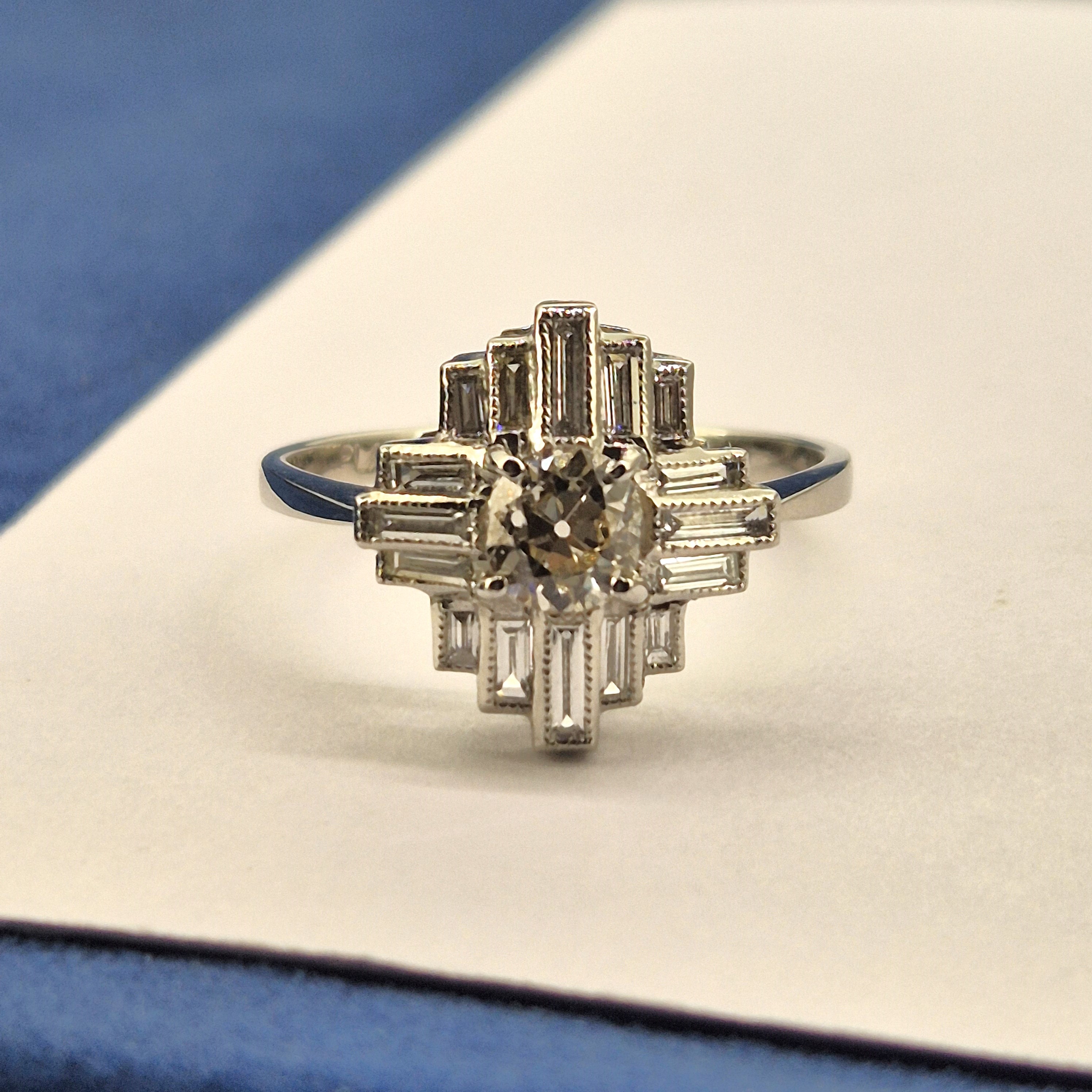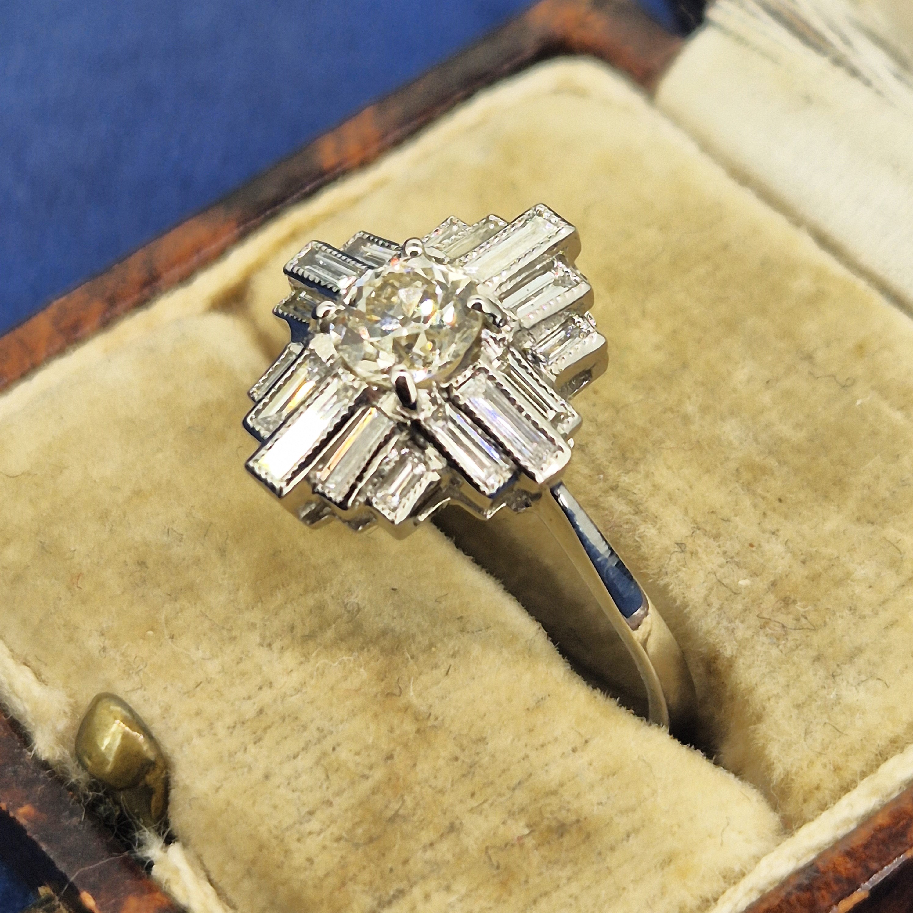 The ring features a central Round Brilliant Diamond that weighs 0.50cts and is set in a four claw setting. This Diamond is surrounded by a cluster of Baguette Cut Diamonds that are set in tiered step design which was popular during the Art Deco Period. These Diamonds weigh 0.40cts making the total Diamond weight of the ring 0.90cts. The Diamond is G Colour with SI Clarity.