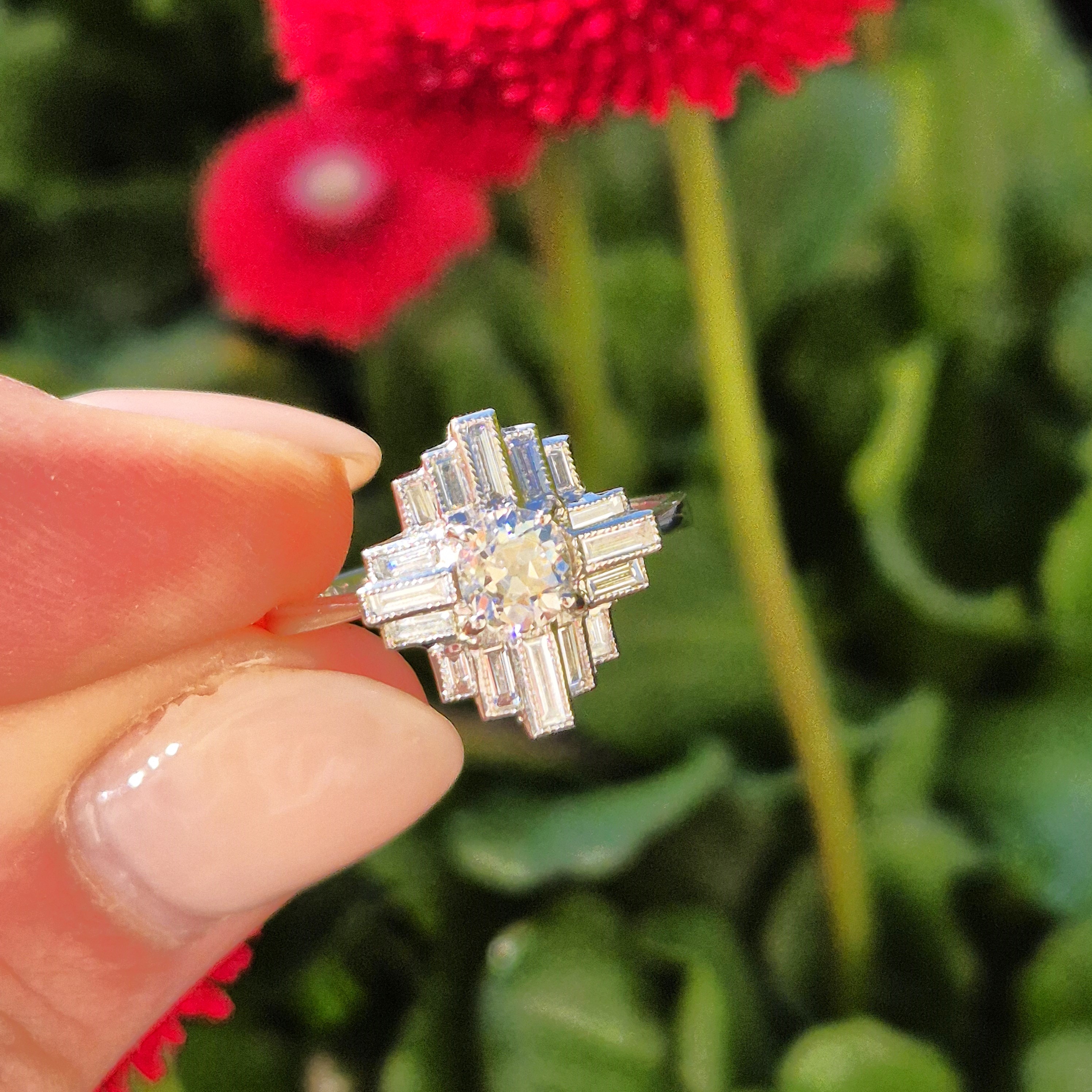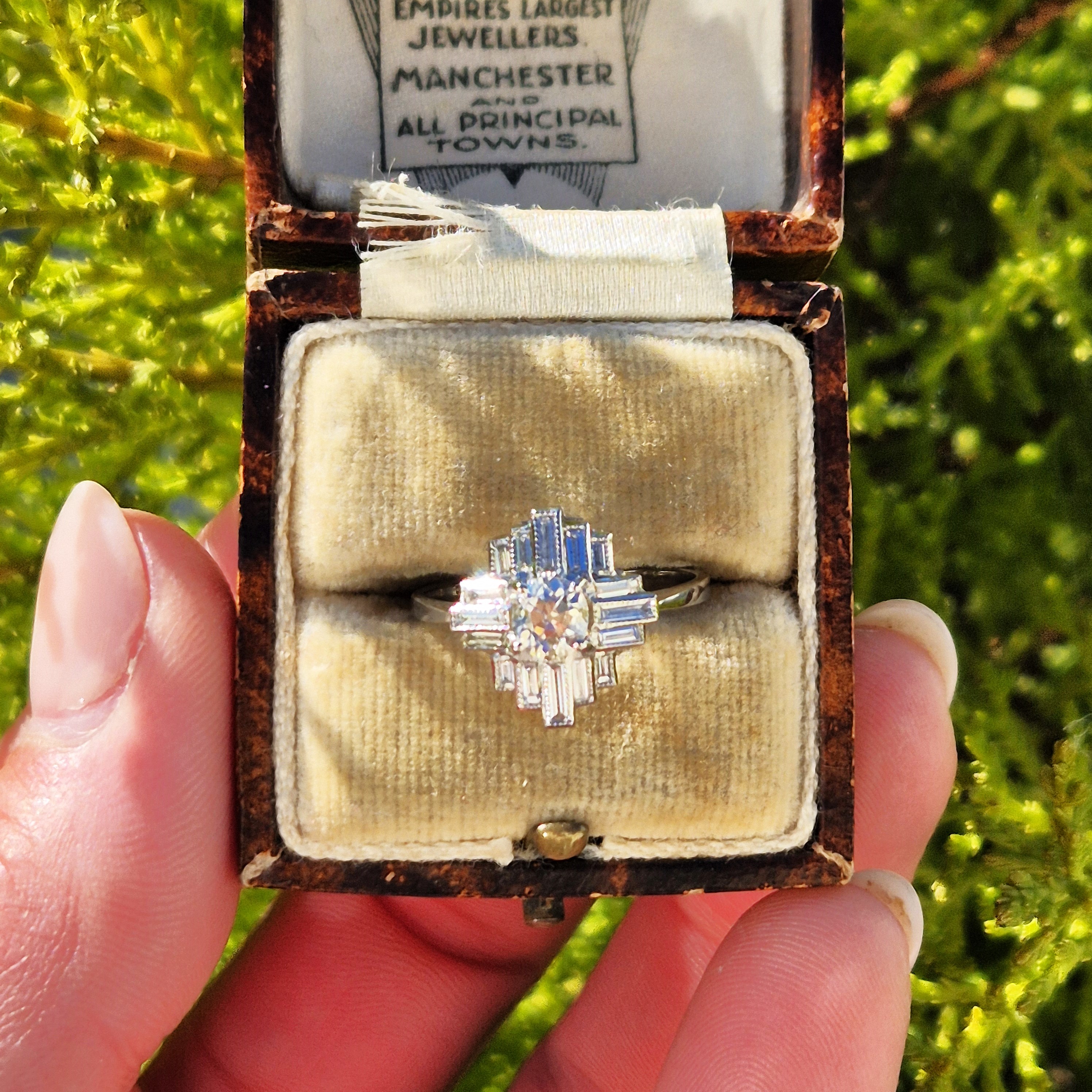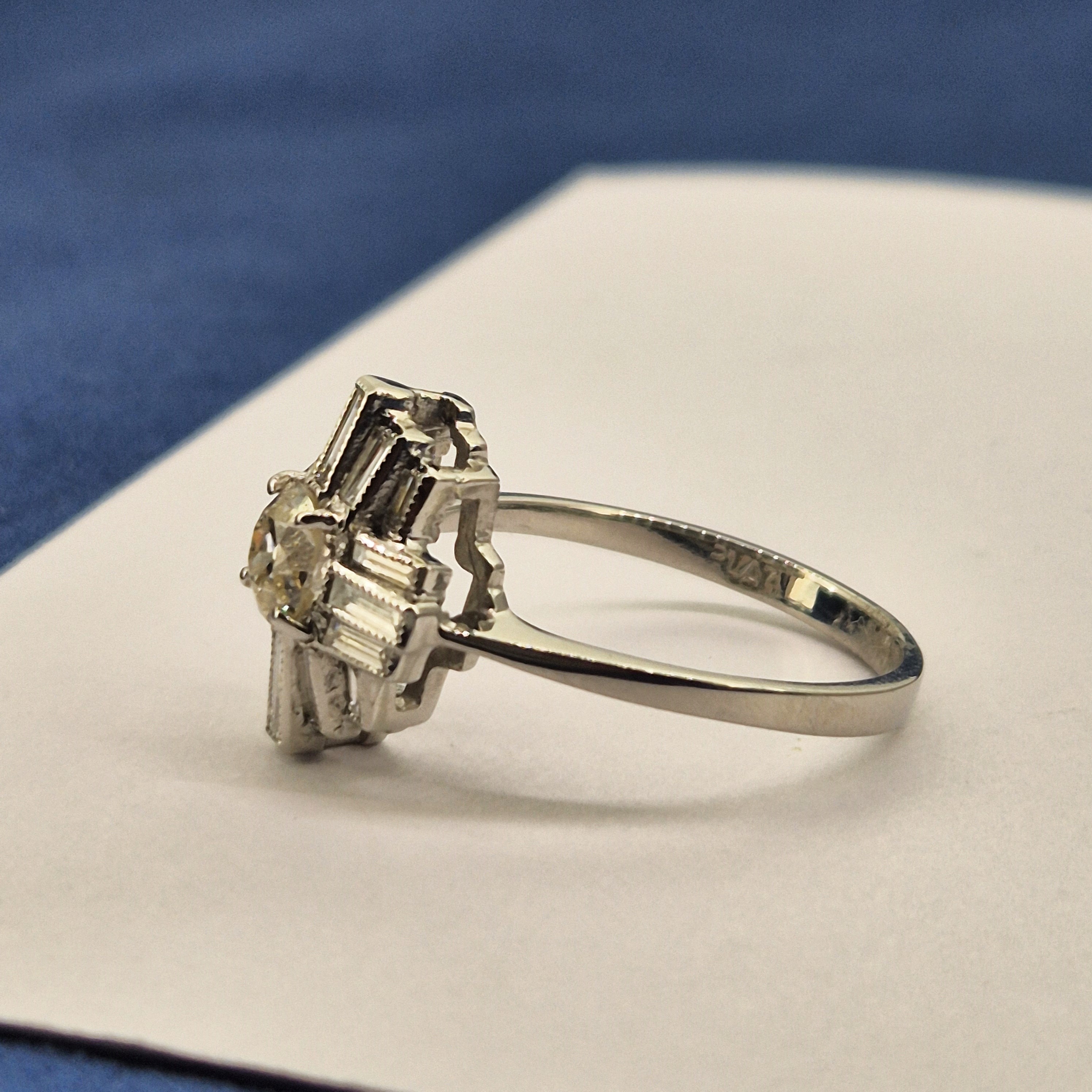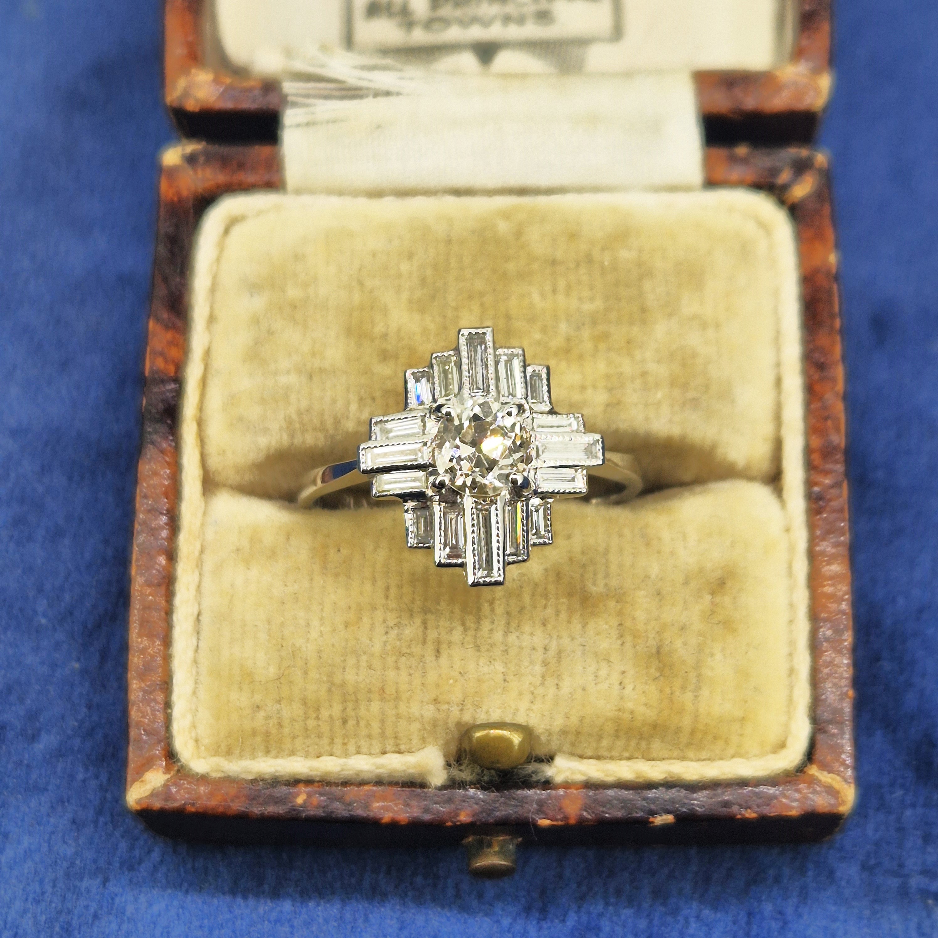 The ring features a central Round Brilliant Diamond that weighs 0.50cts and is set in a four claw setting. This Diamond is surrounded by a cluster of Baguette Cut Diamonds that are set in tiered step design which was popular during the Art Deco Period. These Diamonds weigh 0.40cts making the total Diamond weight of the ring 0.90cts. The Diamond is G Colour with SI Clarity.