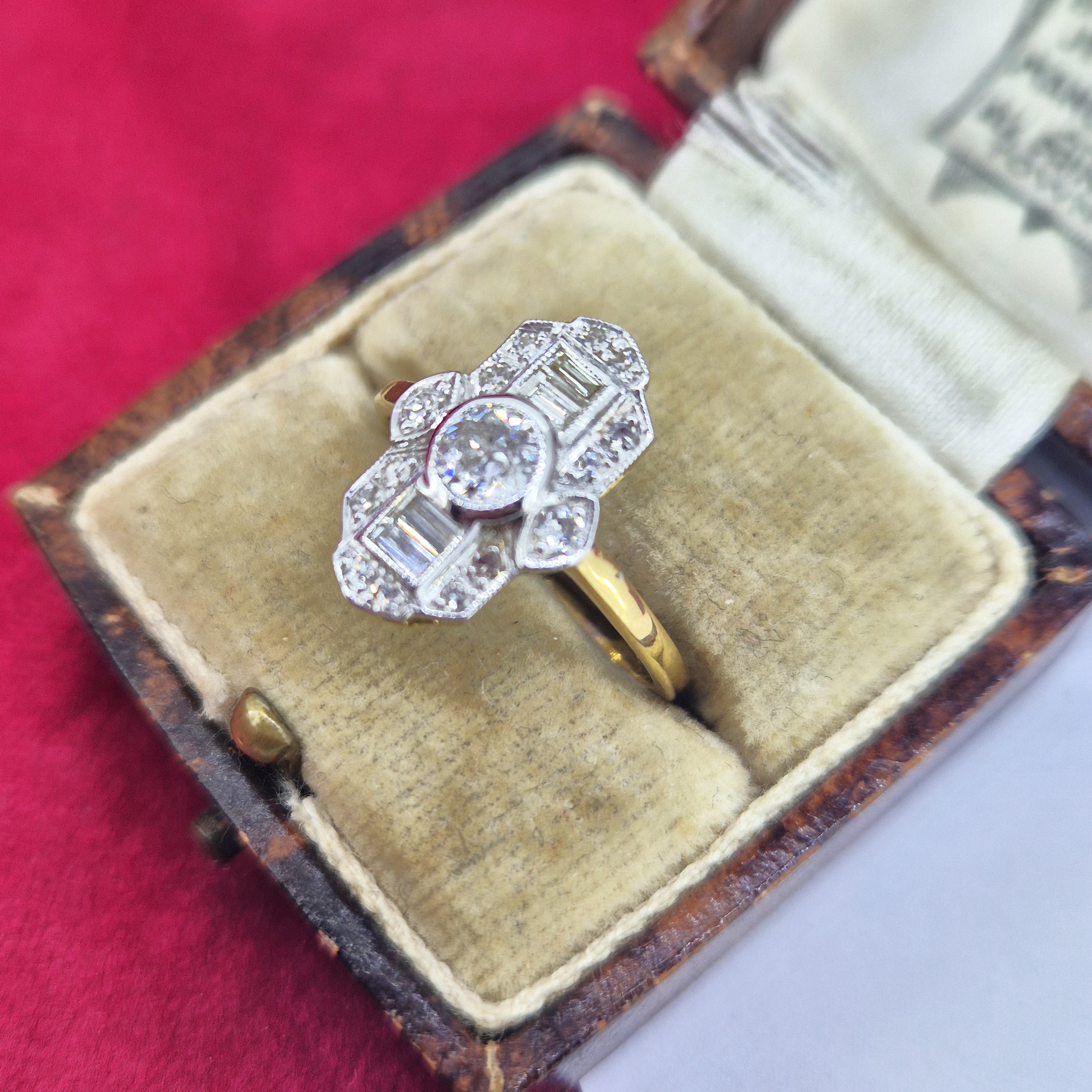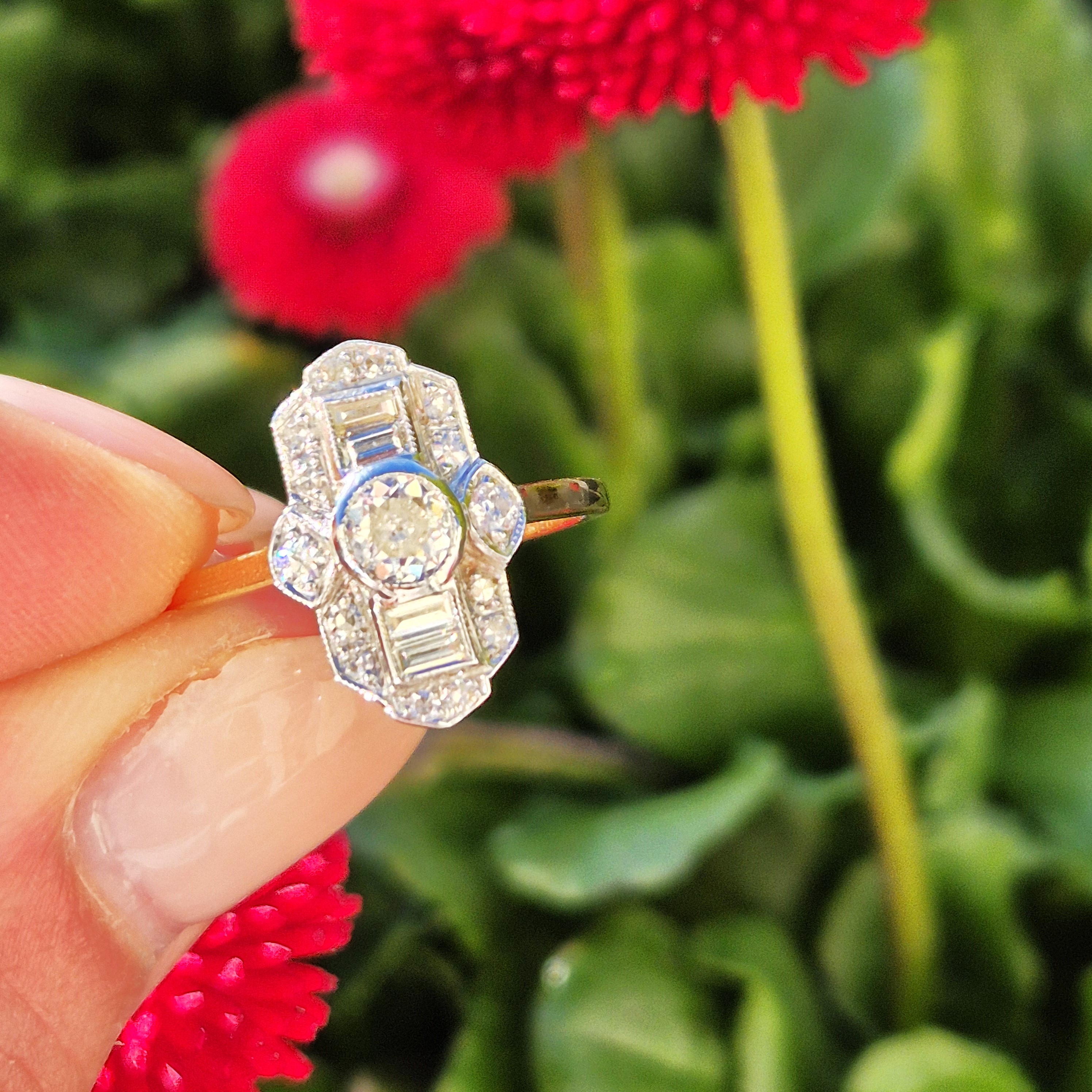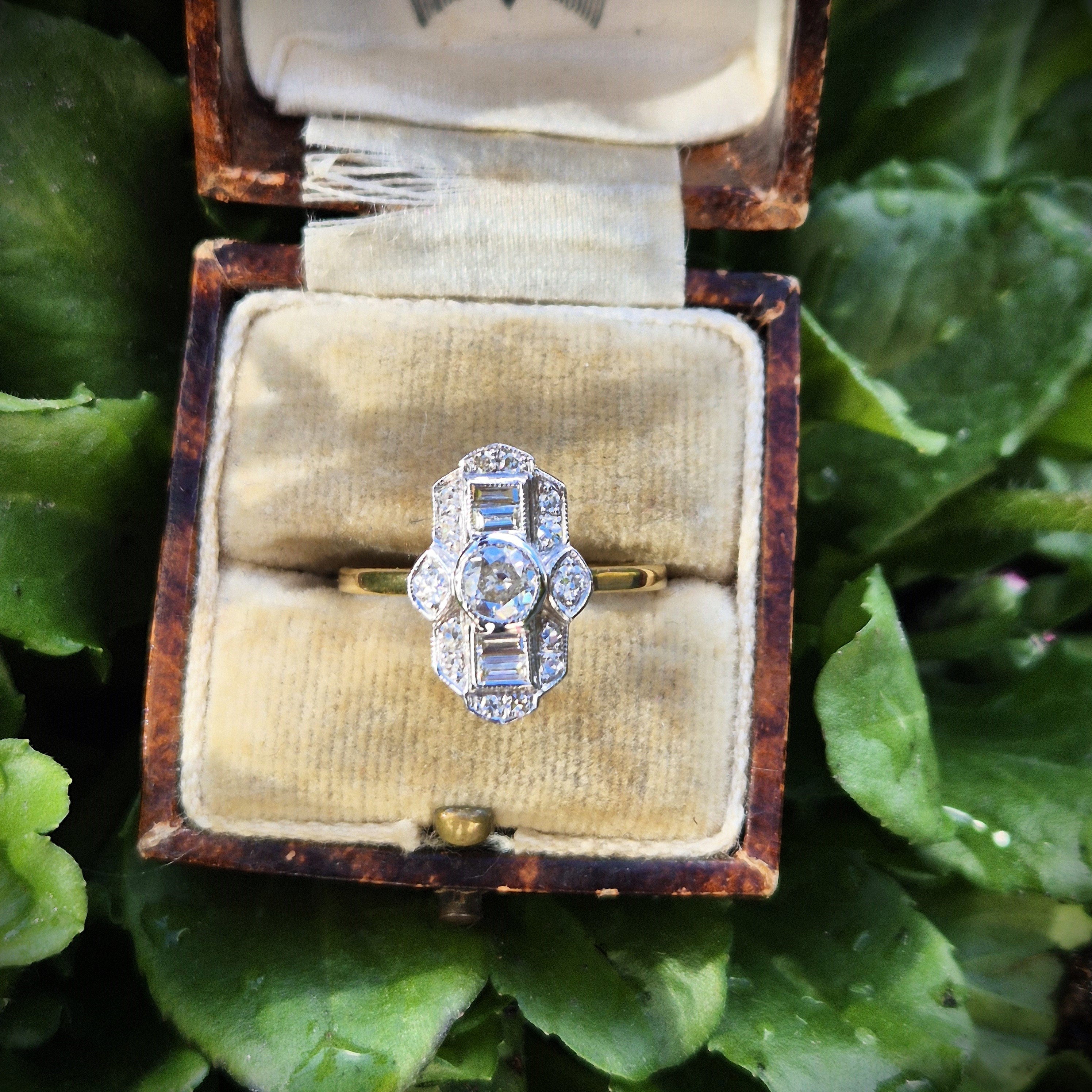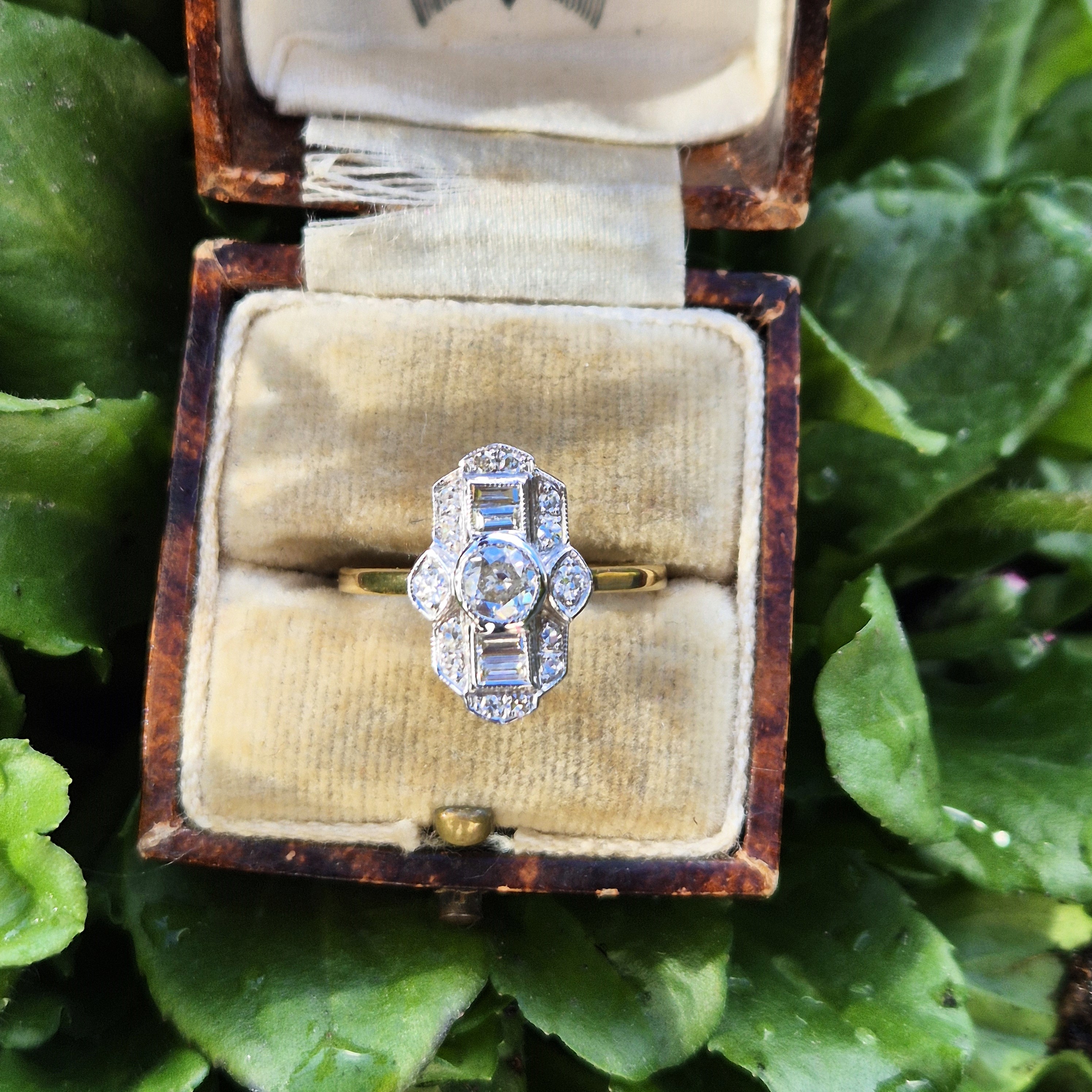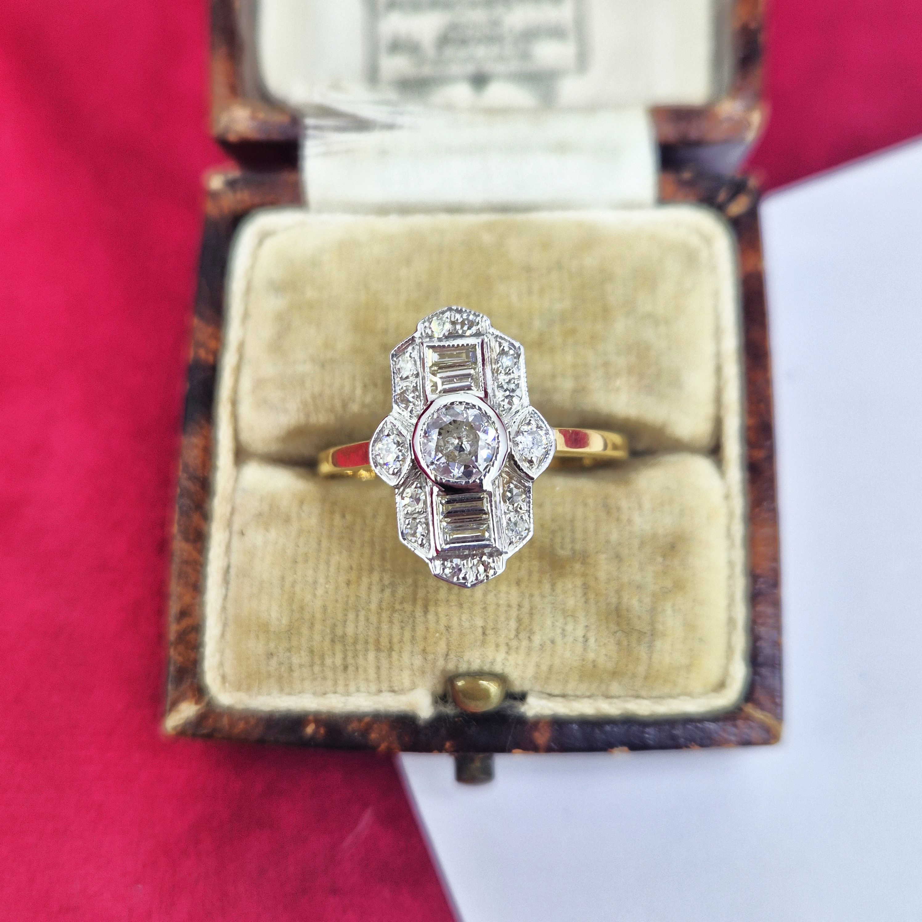 The ring is set with a central Diamond that weighs 0.50cts. It is surrounded by a mixture of Round Brilliant Cut Diamonds and Baguette Cut Diamonds that are adorned by a fine milgrain edge. The total Diamond weight is 0.70cts.