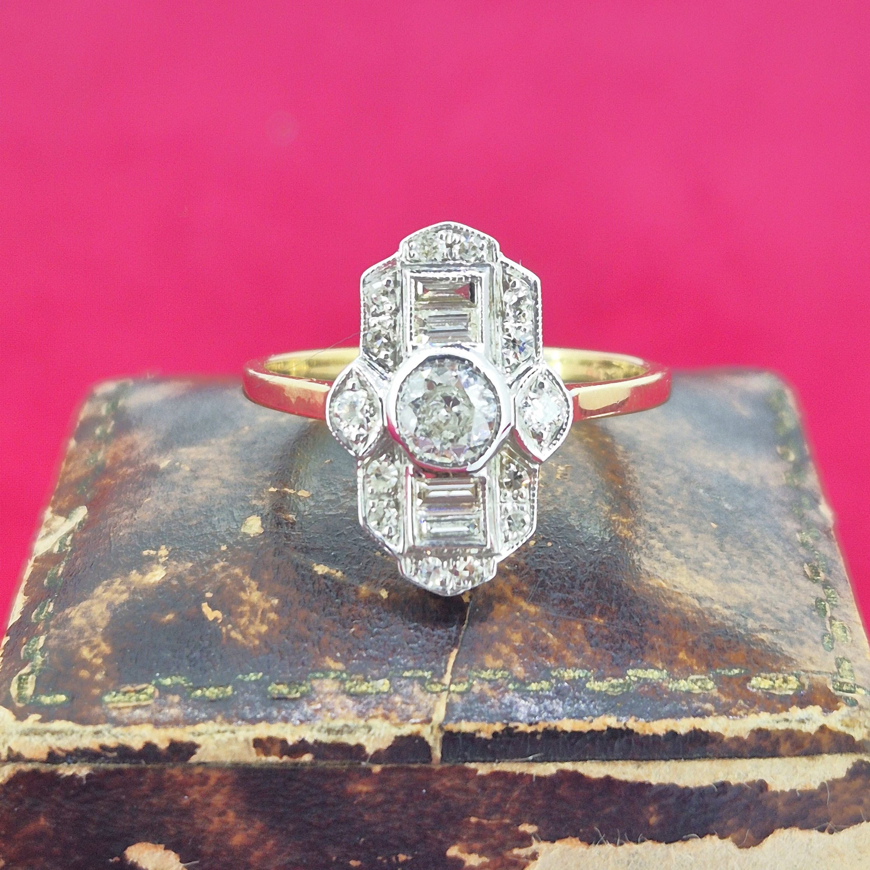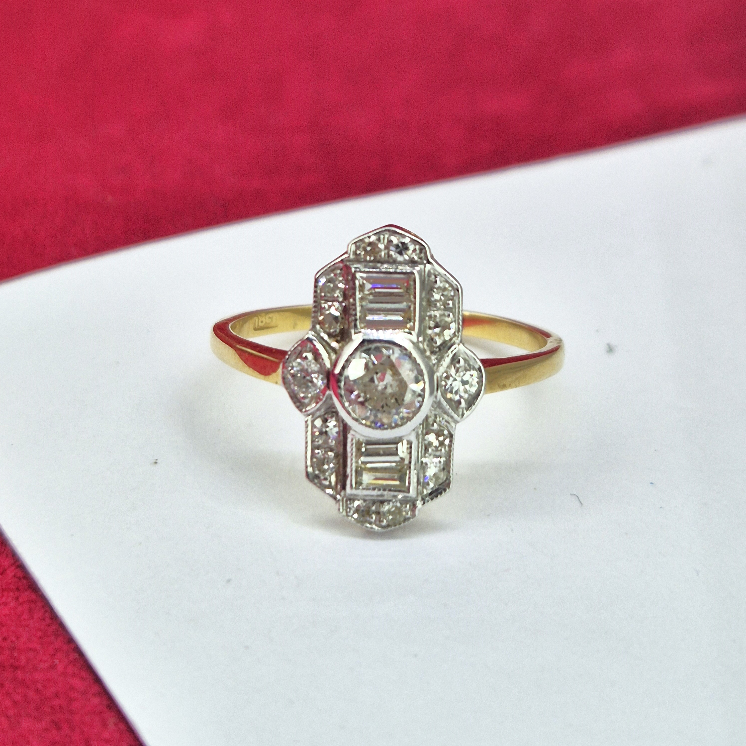 A striking Art Deco Style Diamond Plaque Ring crafted from 18ct Yellow Gold and Platinum.
