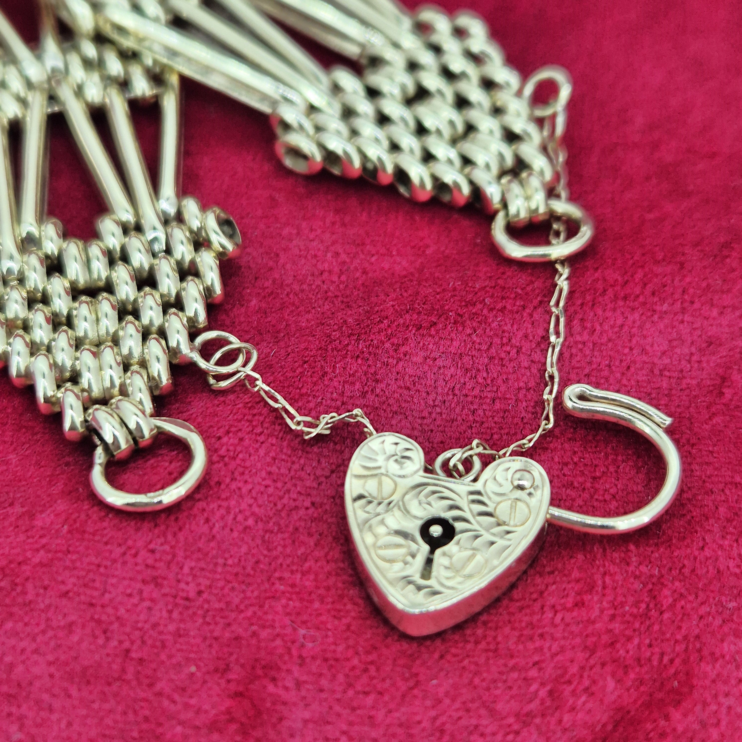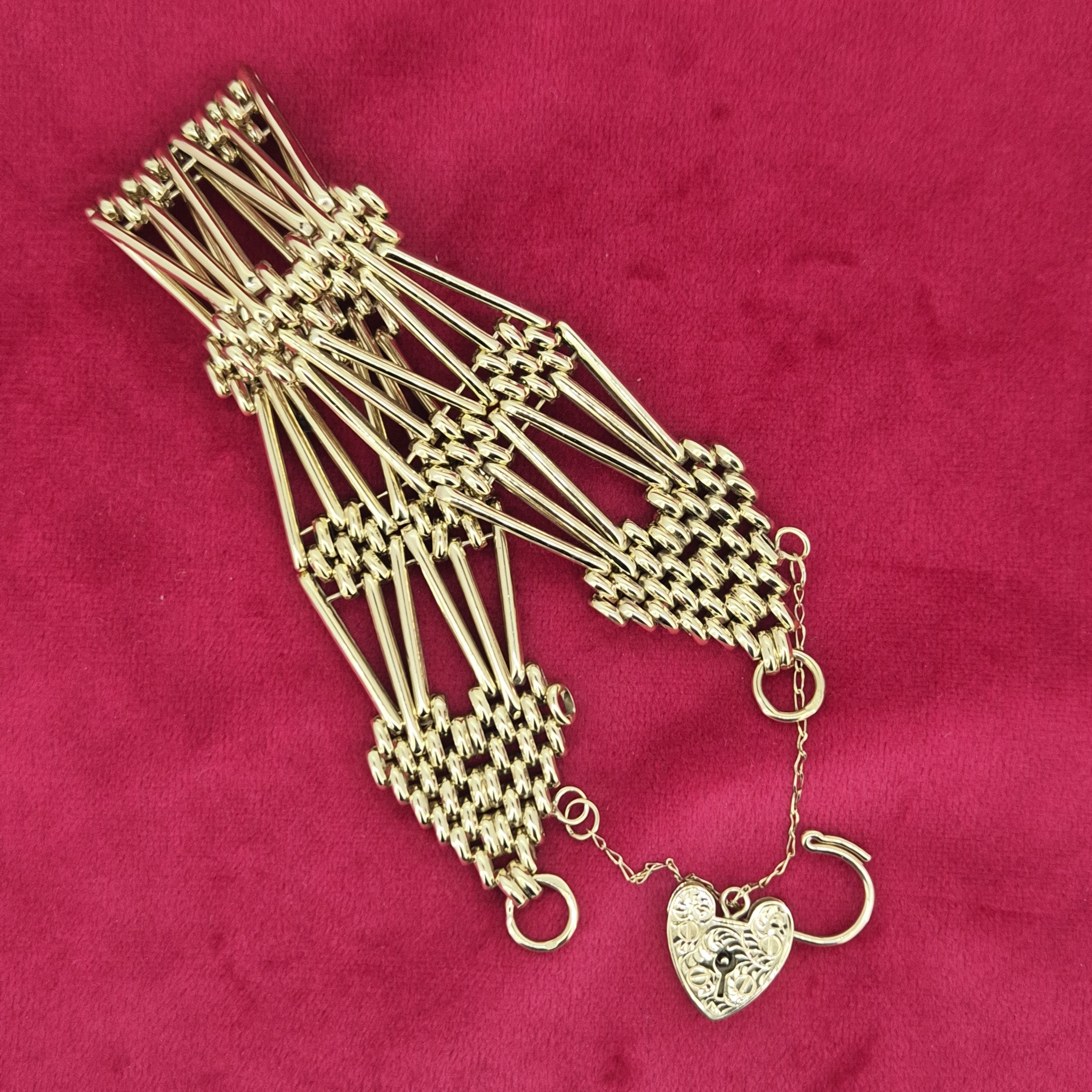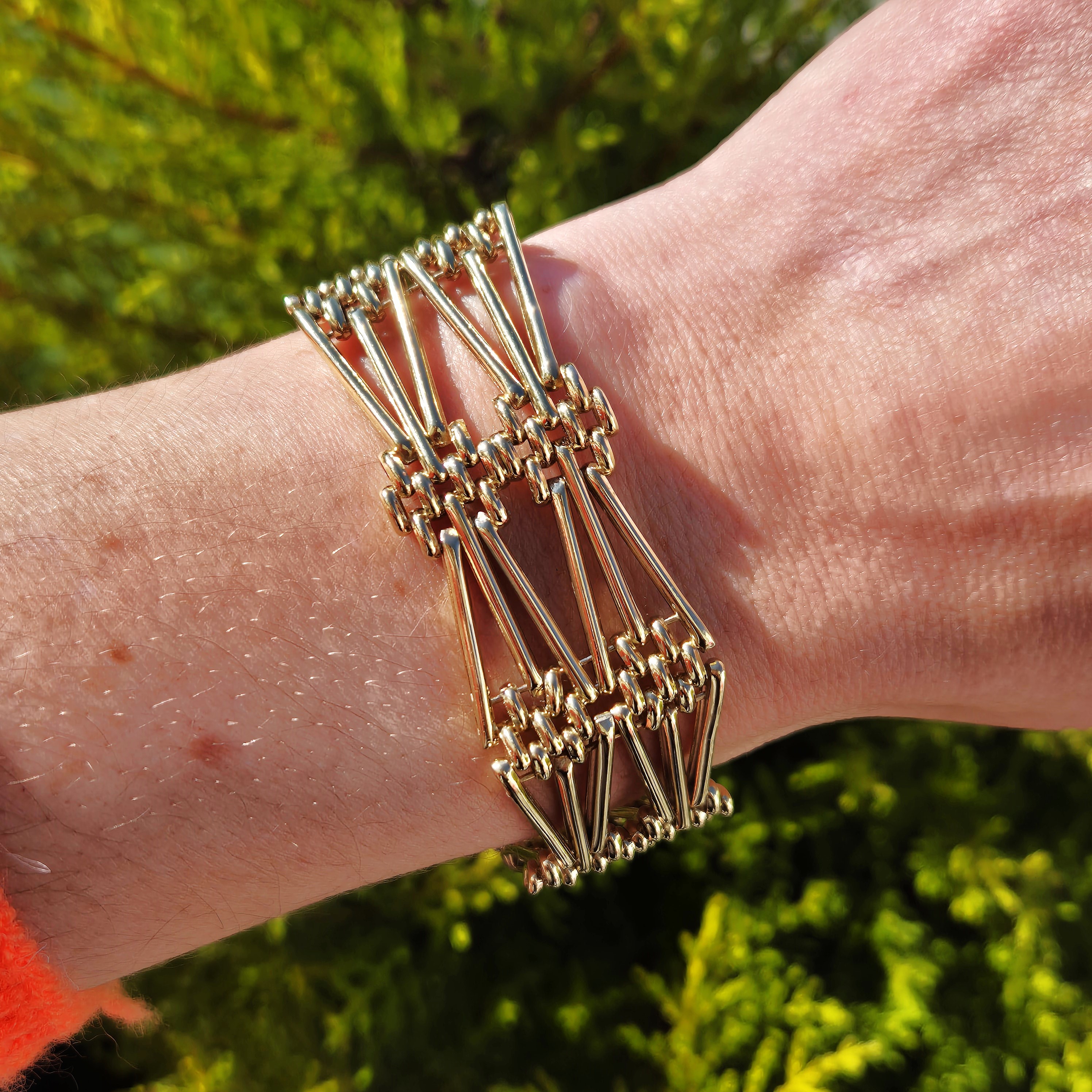 The Bracelet features open links that interlock with each other that measure 27mm in width. Gate Bracelets were popular during the Victorian Era and are recognised by their interlocking panels that resemble the gates and fences of English country estates, and are often associated with love and fidelity.