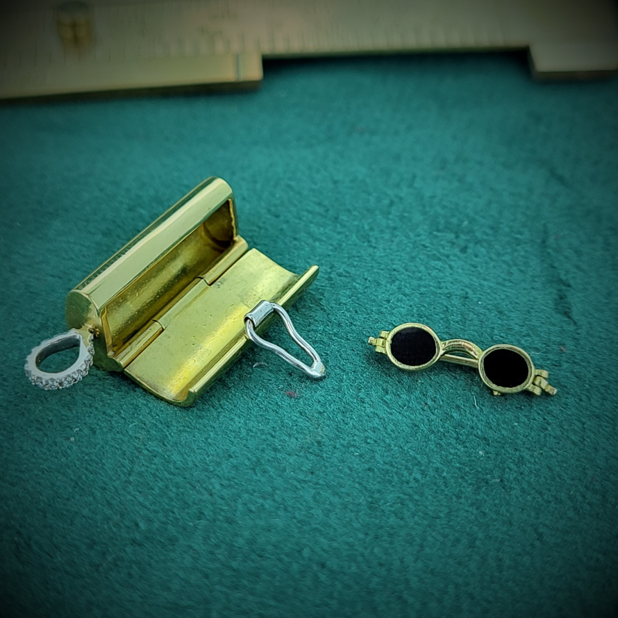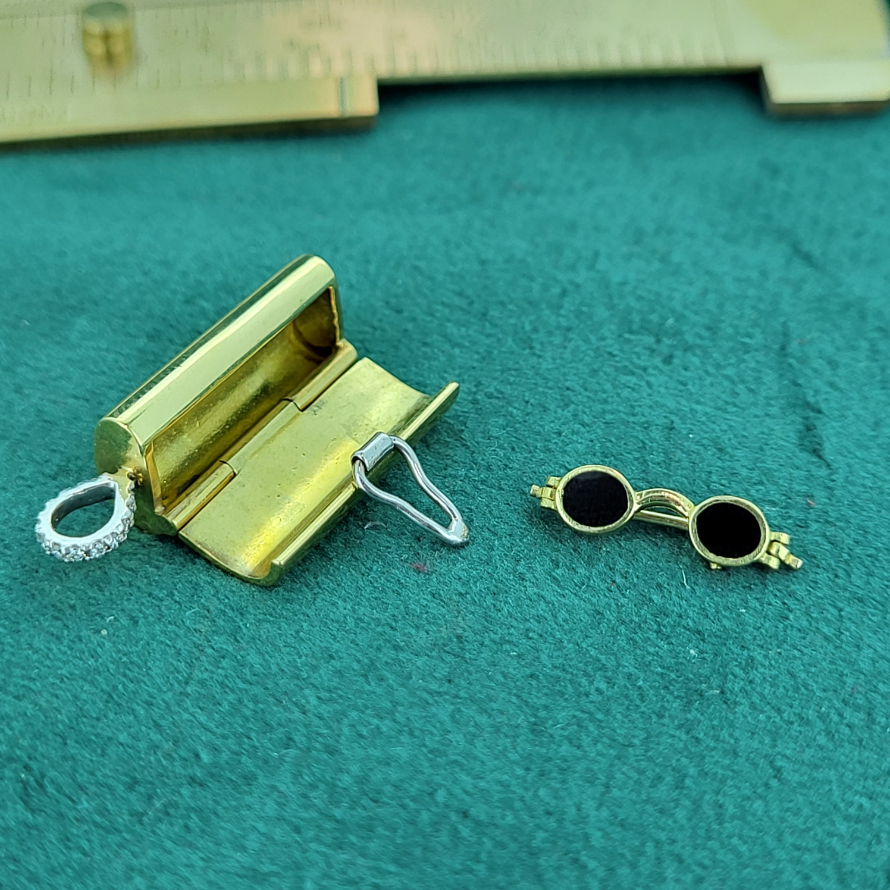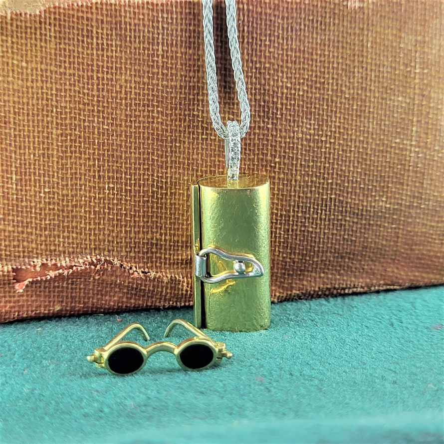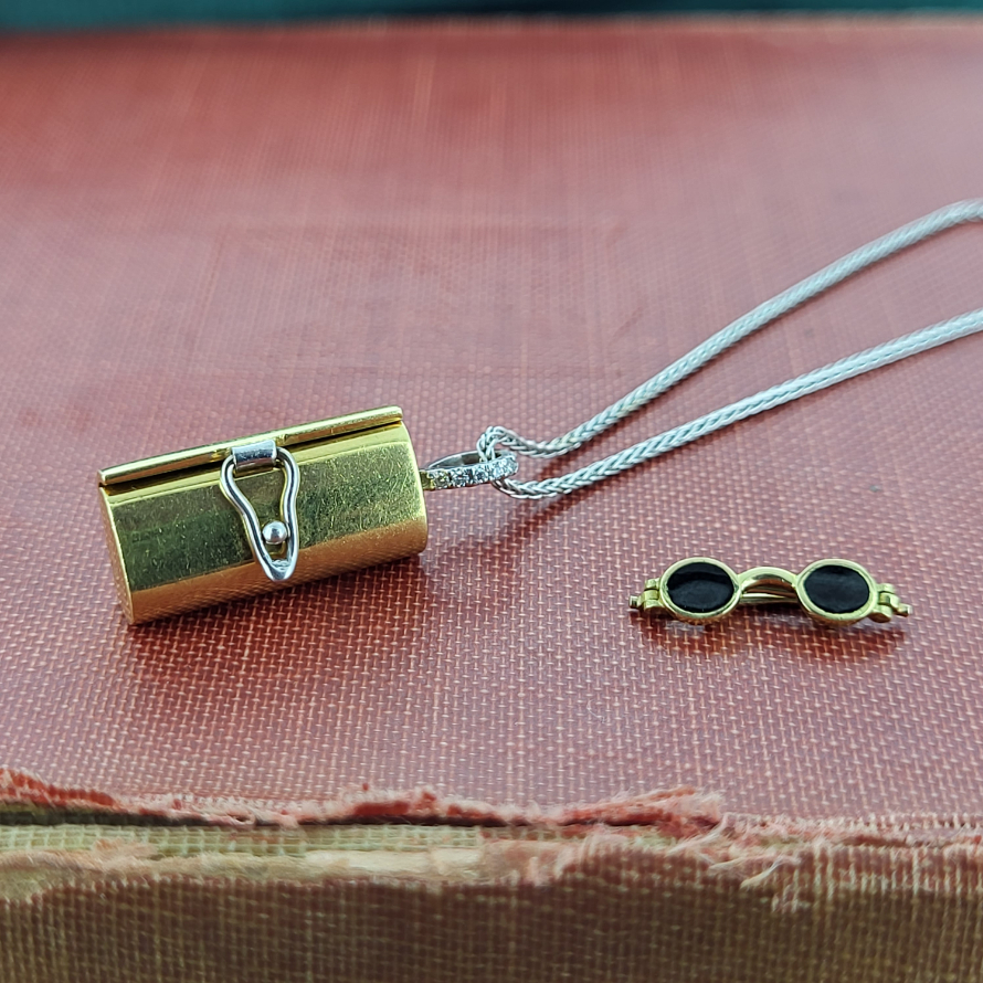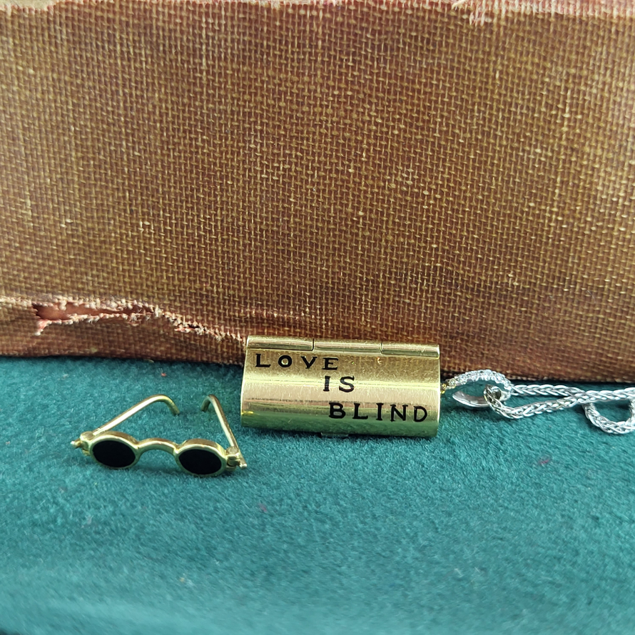 This is a more (much more!) refined version of the more widely produced 9ct glasses and case charm. And although we do love those little vintage charms this is rather special. Crafted from 18ct gold with a beautiful diamond bail the outside of the charm includes the words, 'Love is Blind' and on the reverse is a white gold clip securing the case. Inside is a pair of 18ct gold glasses with black enamel opposed to the usual glass. Becuase love really is blind! This is a lovely charm dating back we believe to the early 2000s (the date letter is worn) although it has the feel of artisanship from generations gone by. Ideally this would be worn as a pendant or given as a beautiful keepsake.