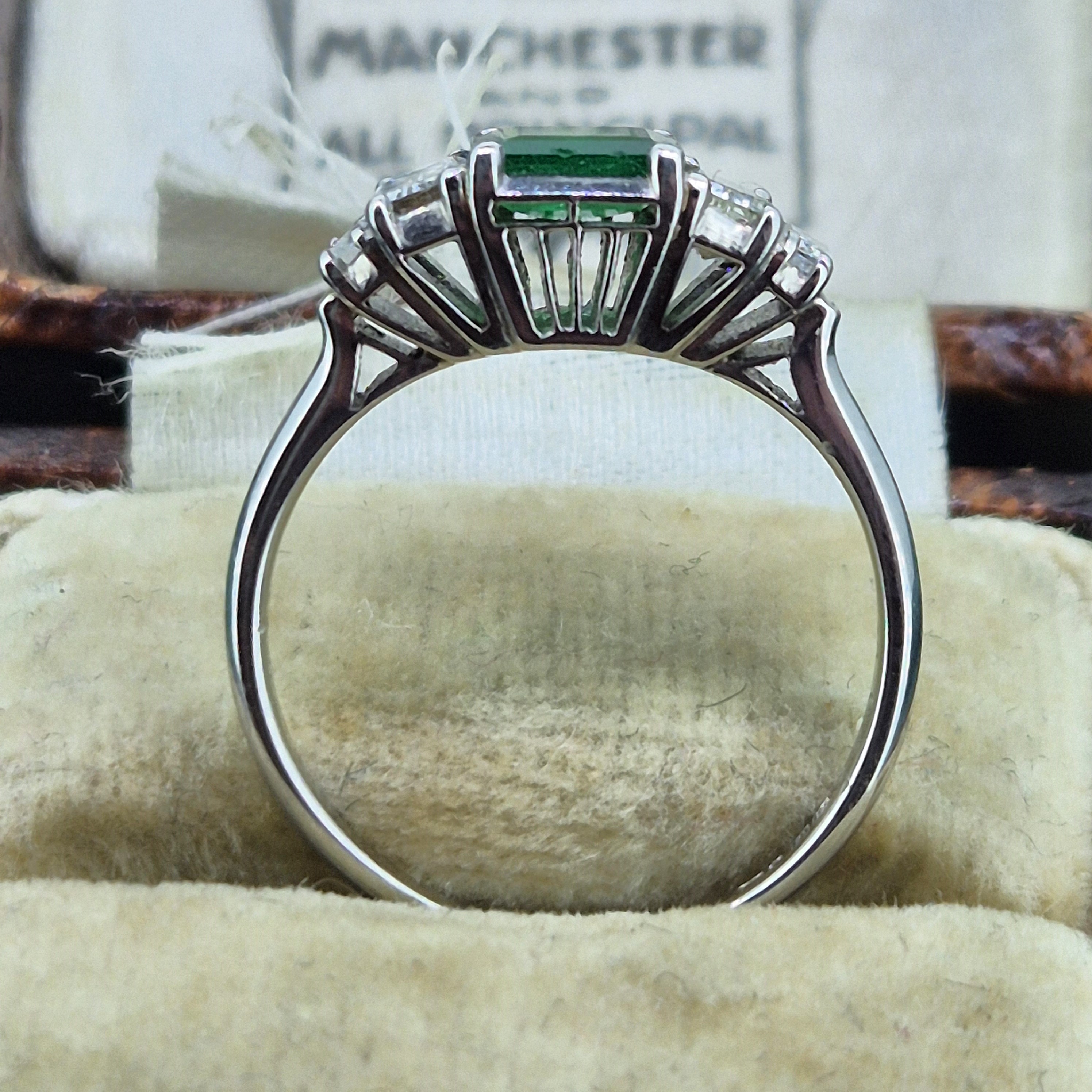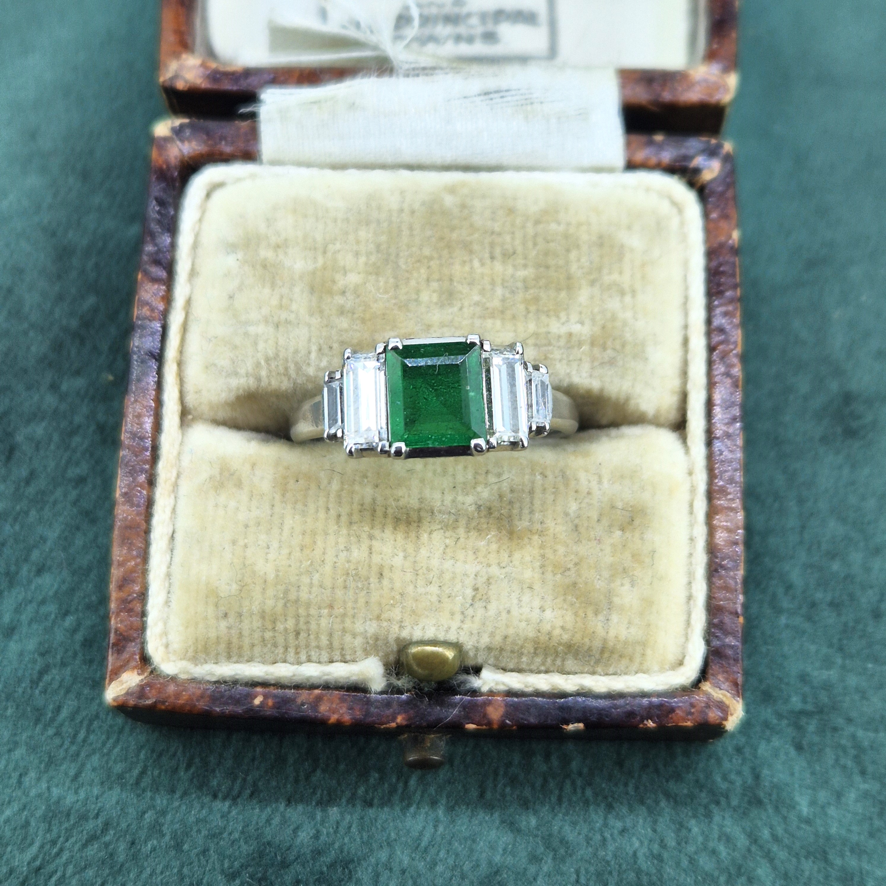 An Emerald and Diamond Art Deco Ring crafted from Platinum.