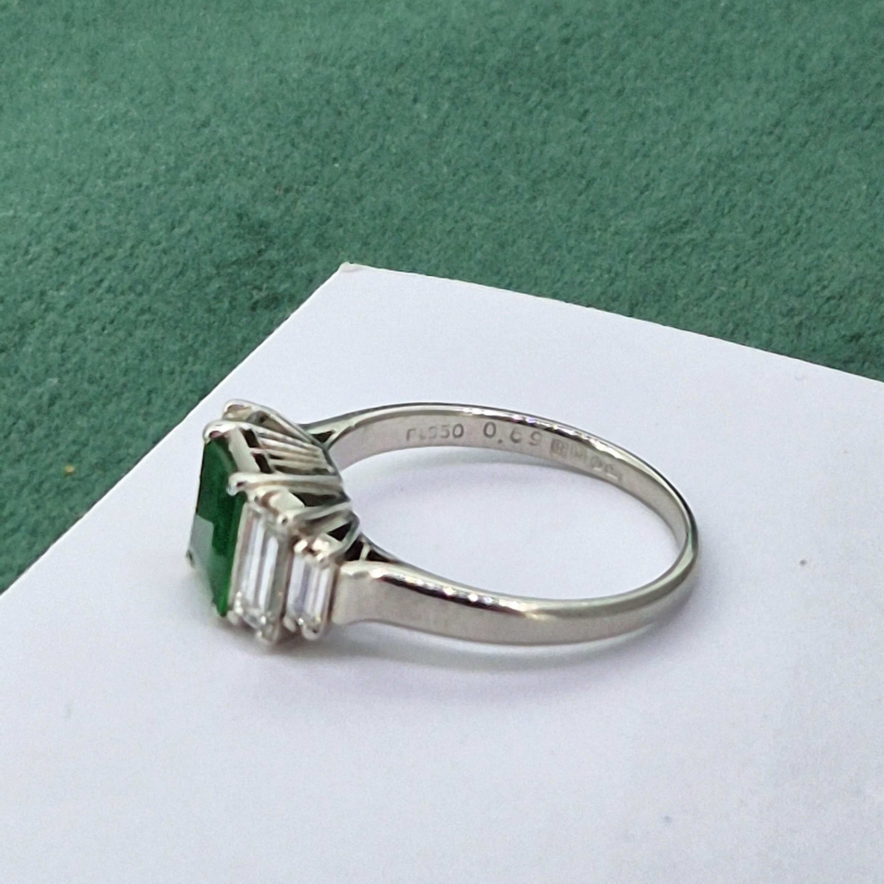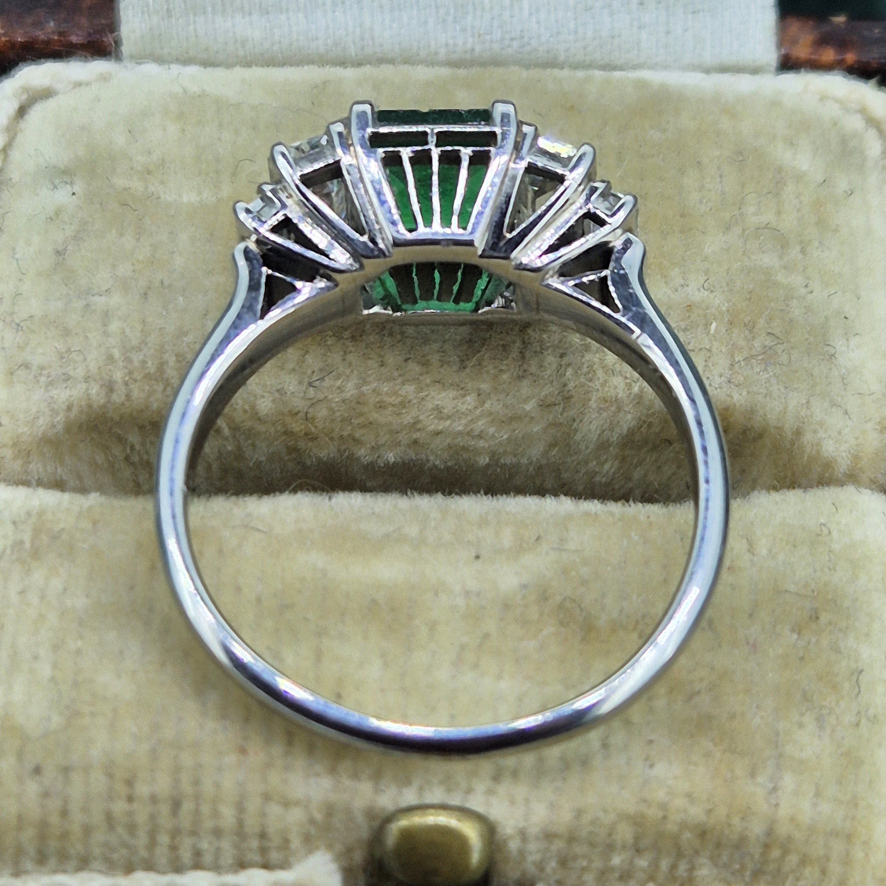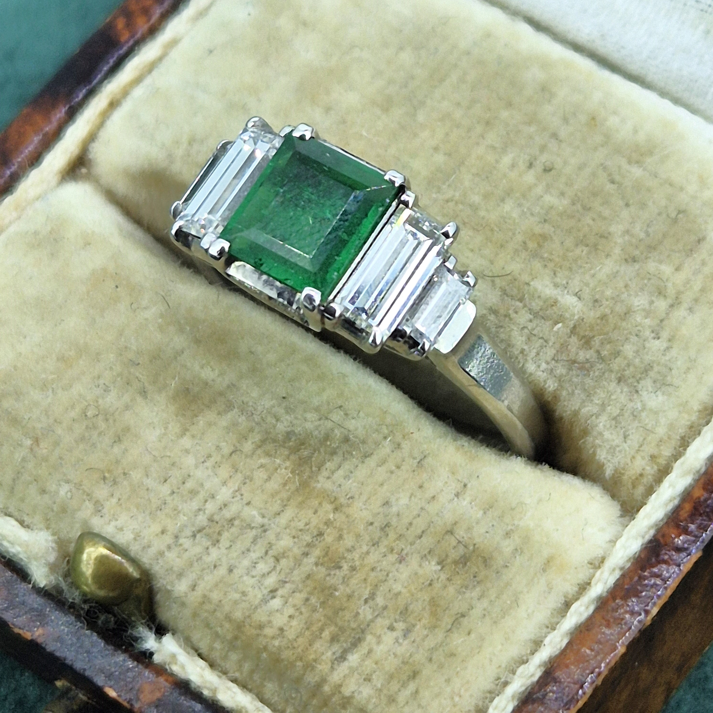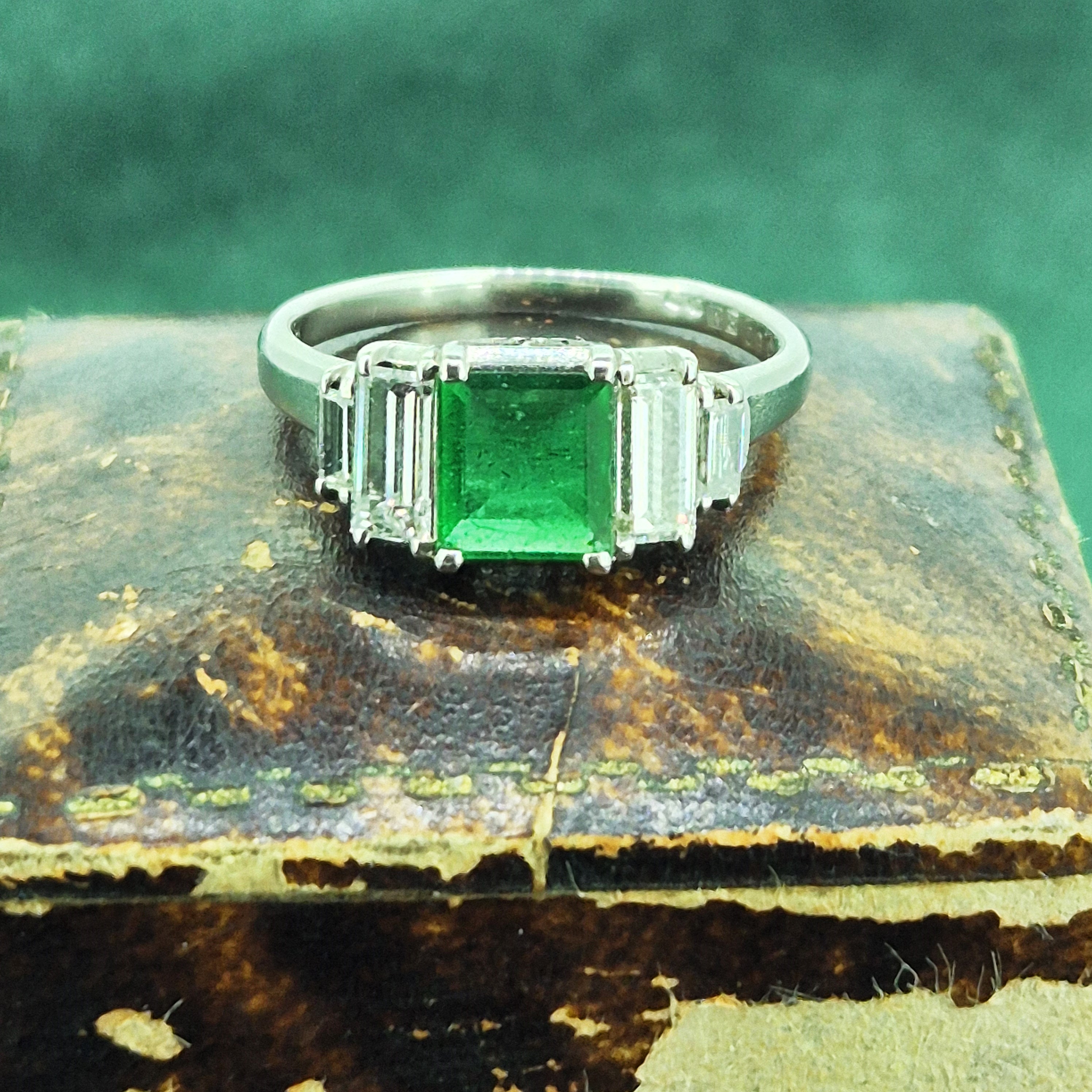 The ring features a Central Princess Cut Emerald that weighing 0.69cts and is a gorgeous green. It is further detailed by two Baguette Cut Diamonds either side that are set in e tiered step down design. The diamonds weigh 0.74cts and contrast beautifully against the Emerald.