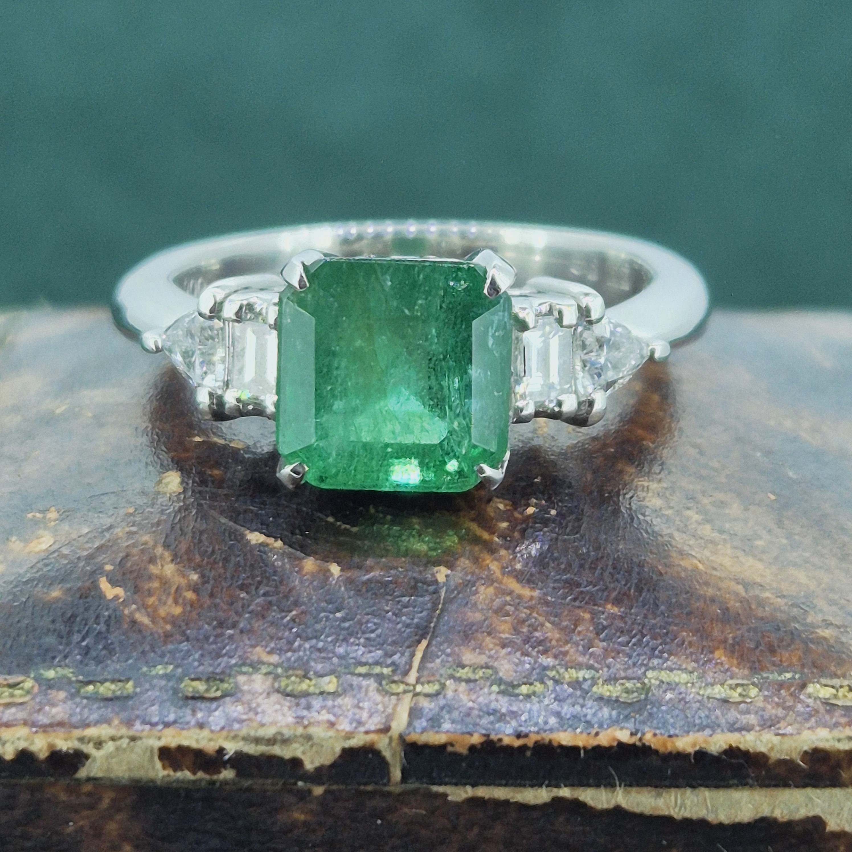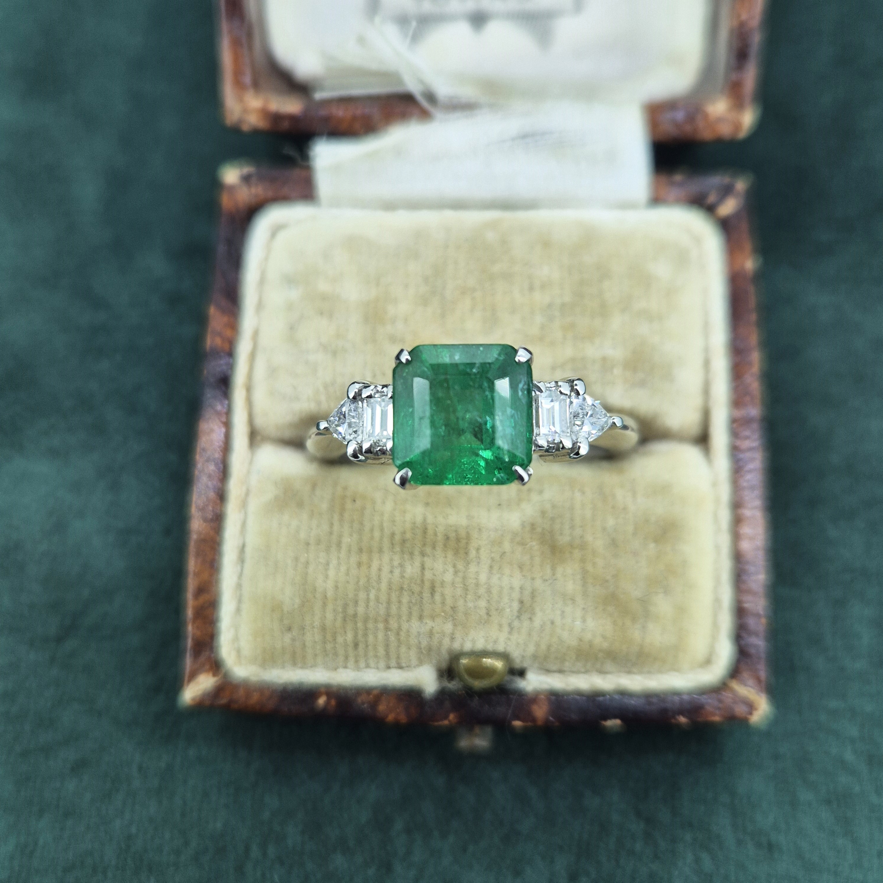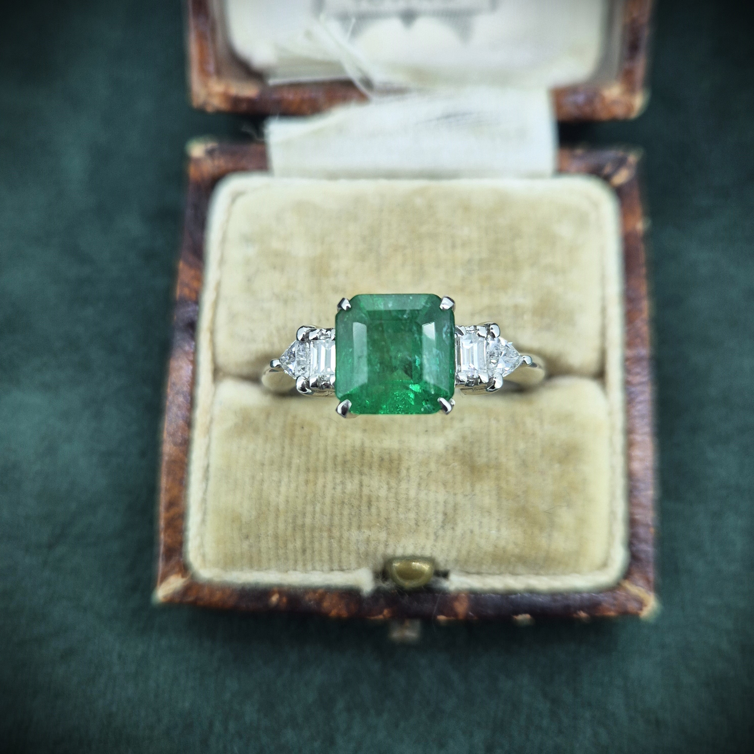 The ring features a central vibrant green Emerald weighing 2.44cts. This Emerald is further detailed by a Baguette Cut and Trilliant Cut Diamond either side. These diamonds weigh 0.45cts.