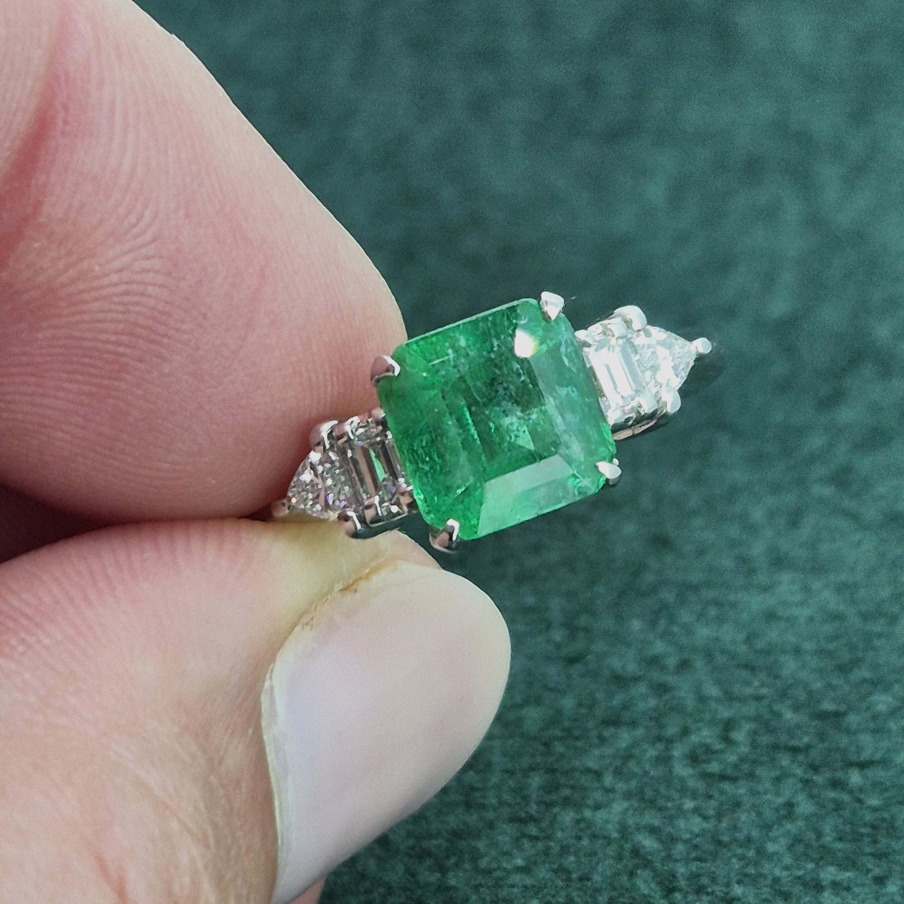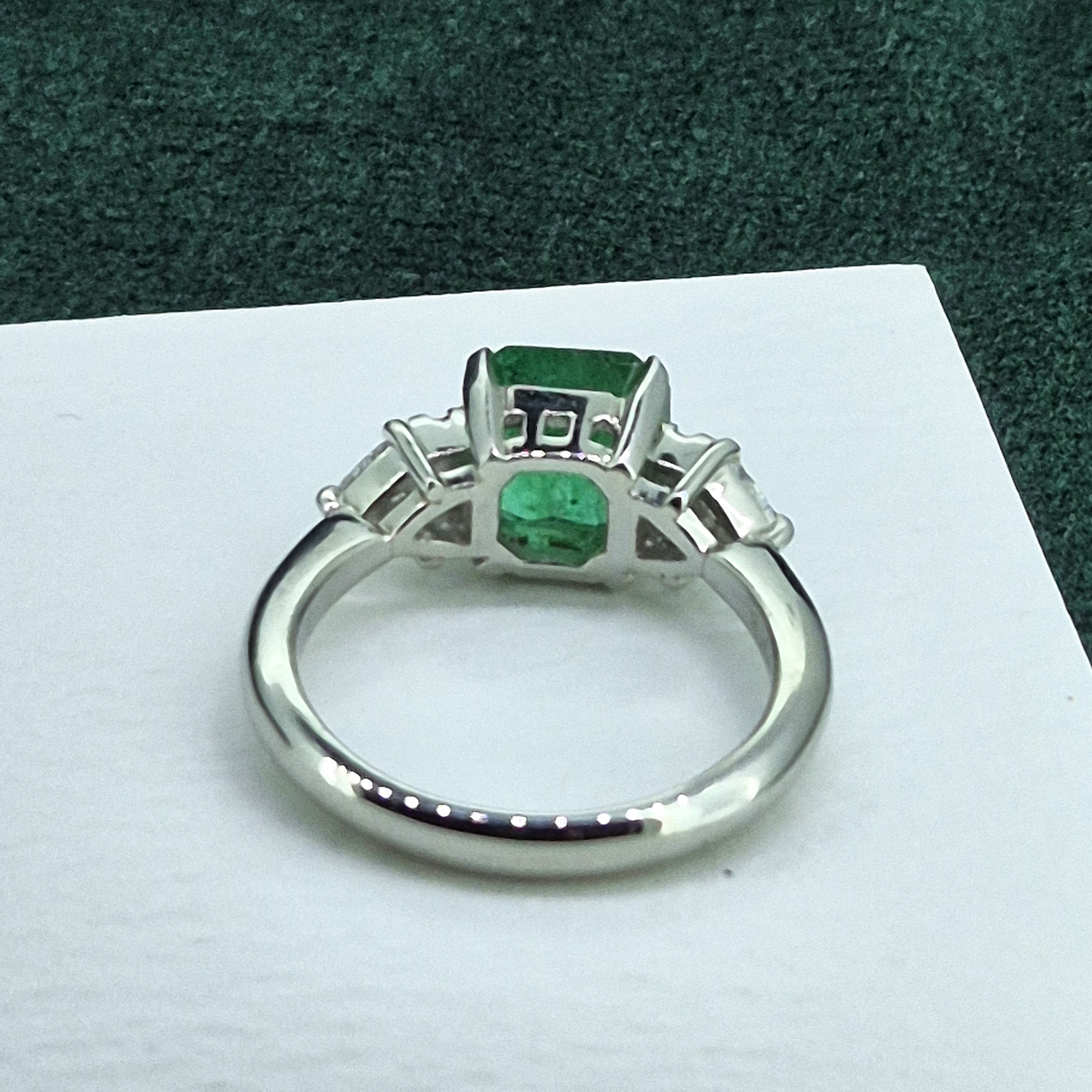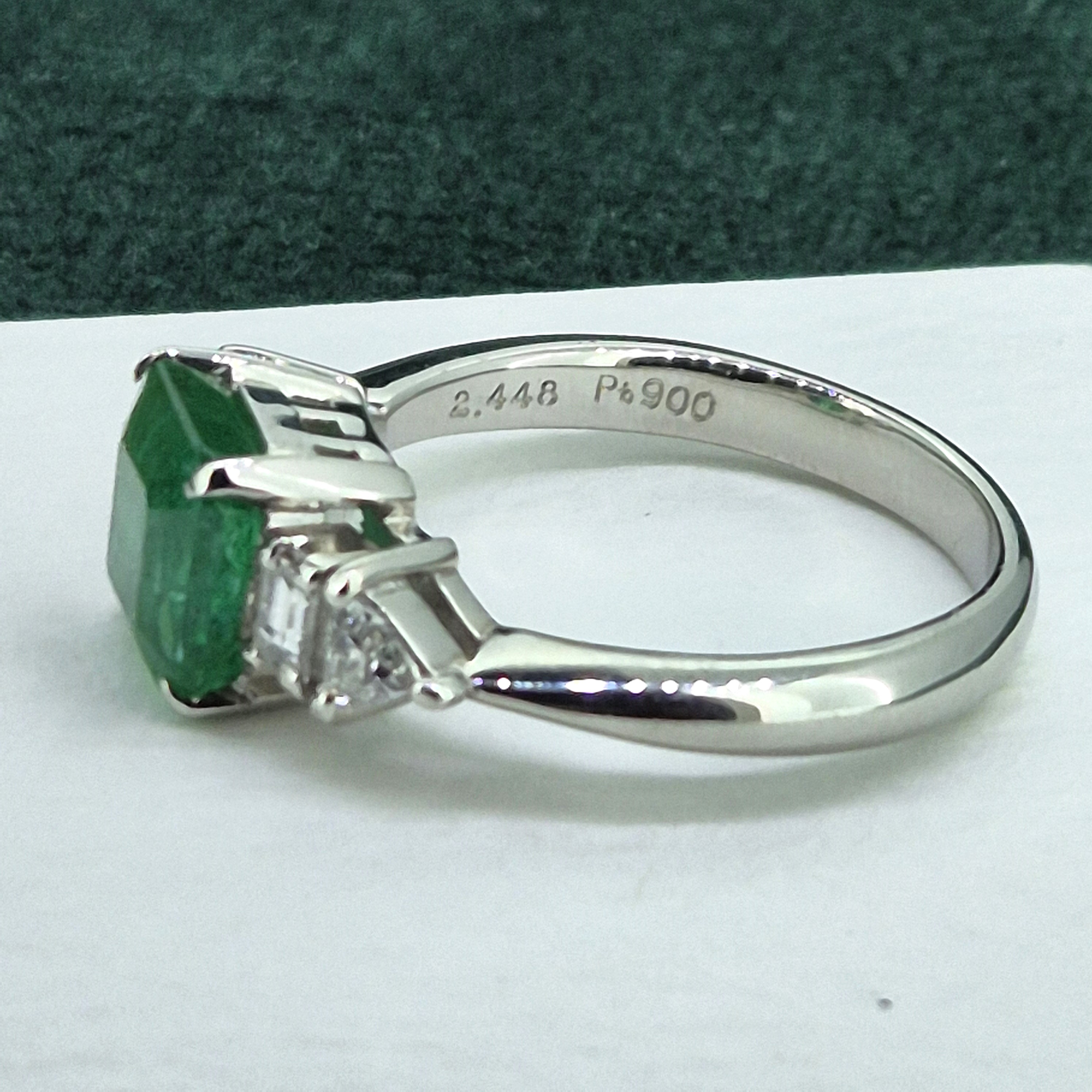 The ring features a central vibrant green Emerald weighing 2.44cts. This Emerald is further detailed by a Baguette Cut and Trilliant Cut Diamond either side. These diamonds weigh 0.45cts.