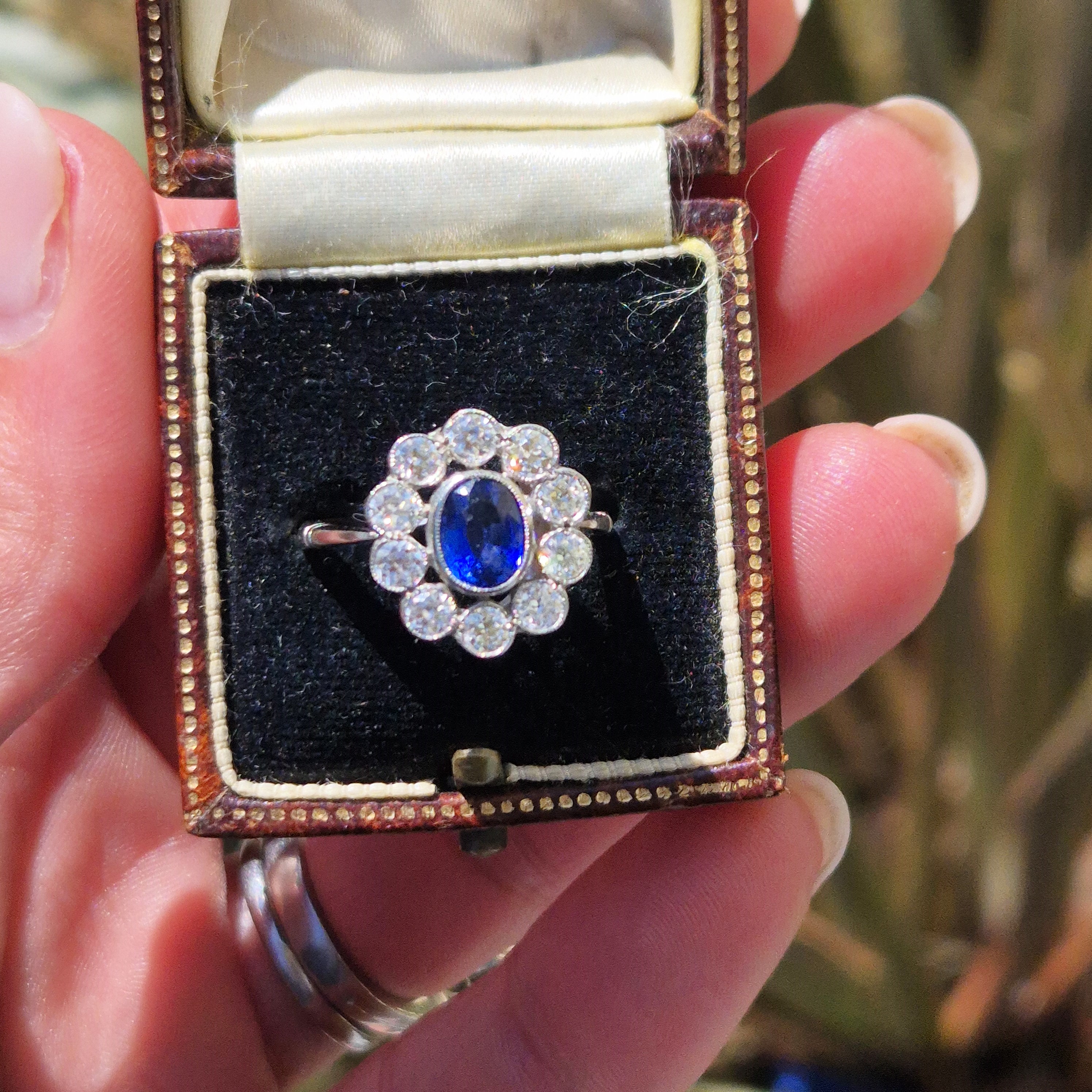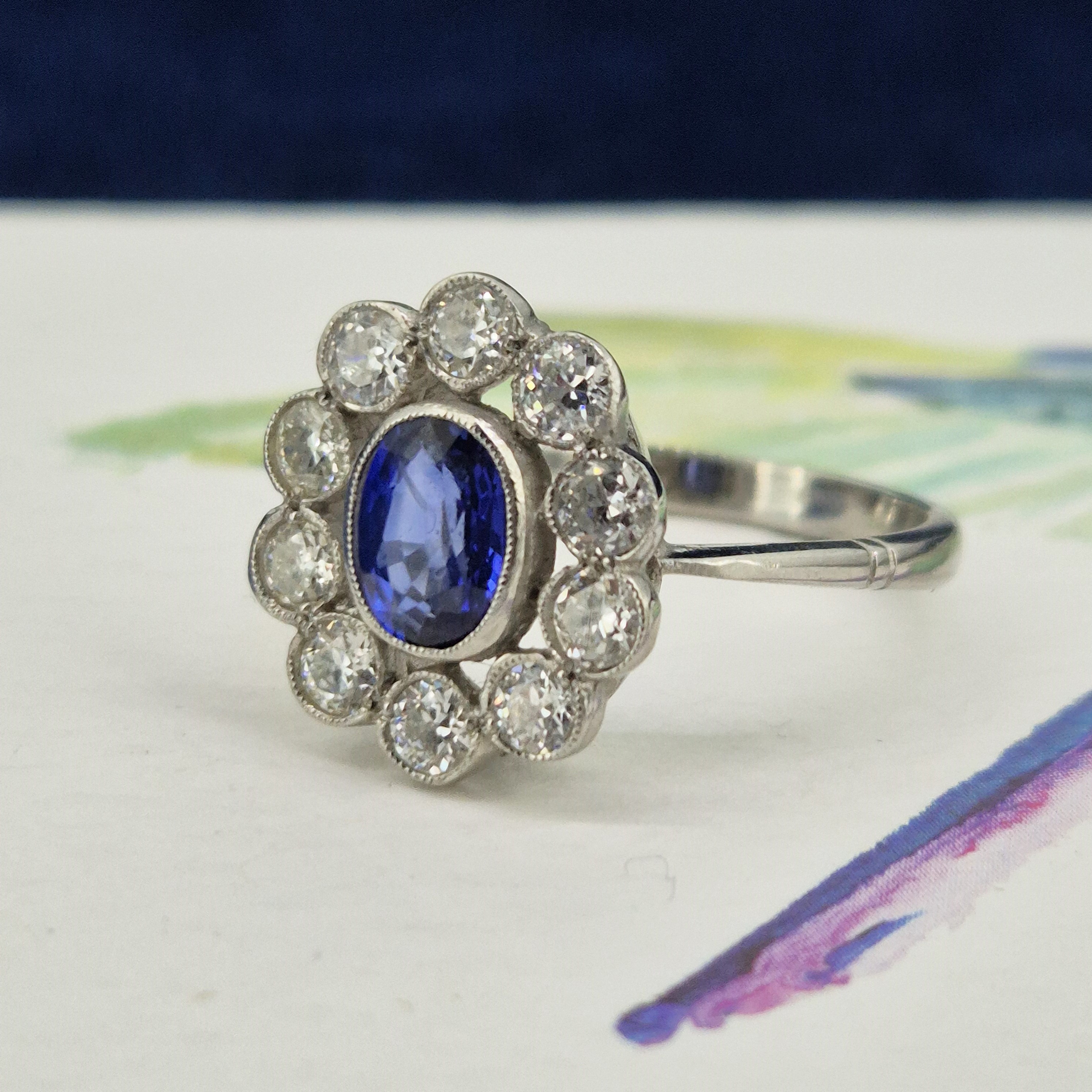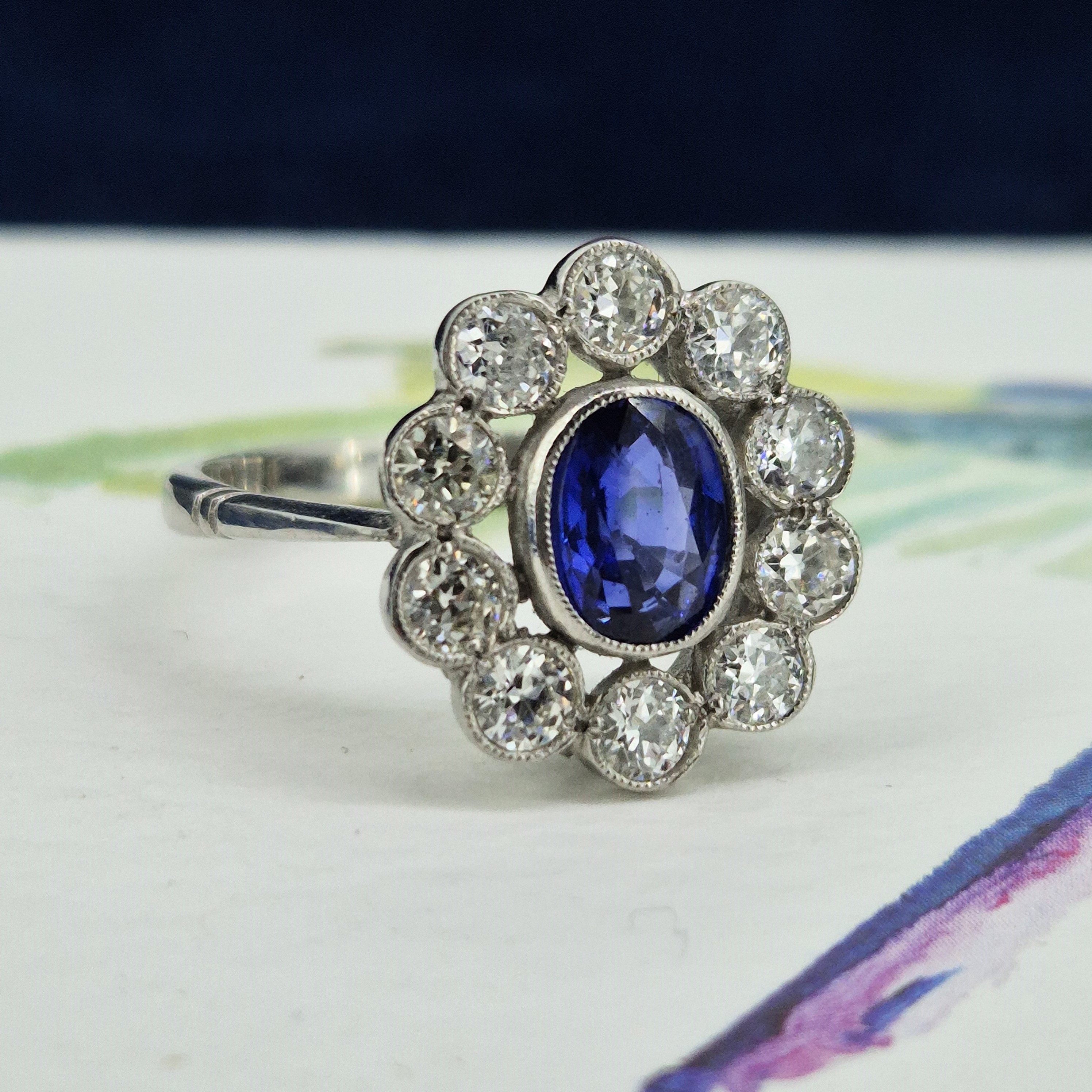 Indulge in the refined beauty of this Victorian-Style Sapphire and Diamond Cluster Ring, an heirloom-worthy piece expertly crafted for lovers of exceptional Sapphire rings. It is crafted in a combination of Platinum and 18ct Yellow Gold, showcasing traditional craftsmanship inspired by the romantic jewellery of the Victorian Era.
