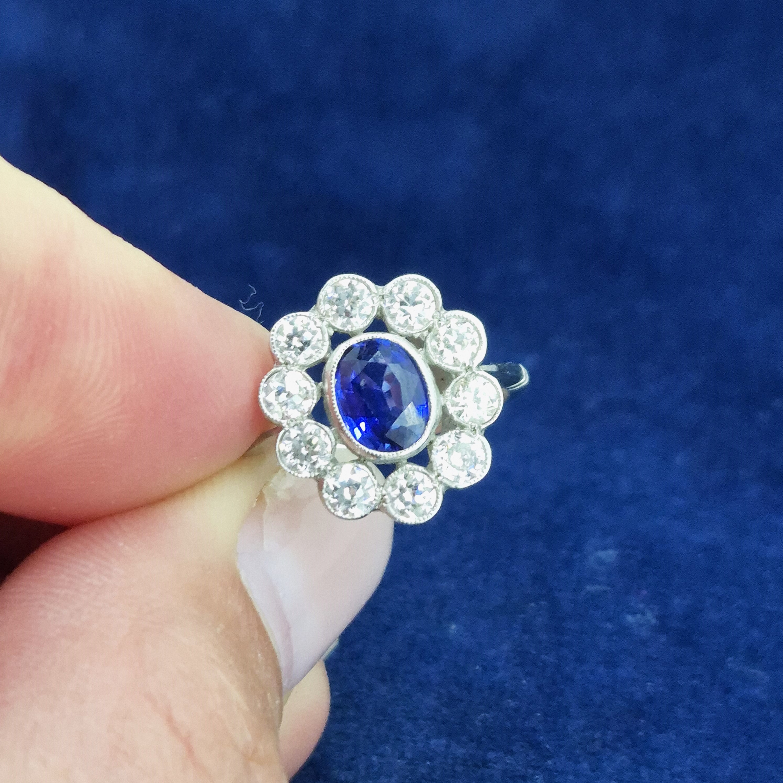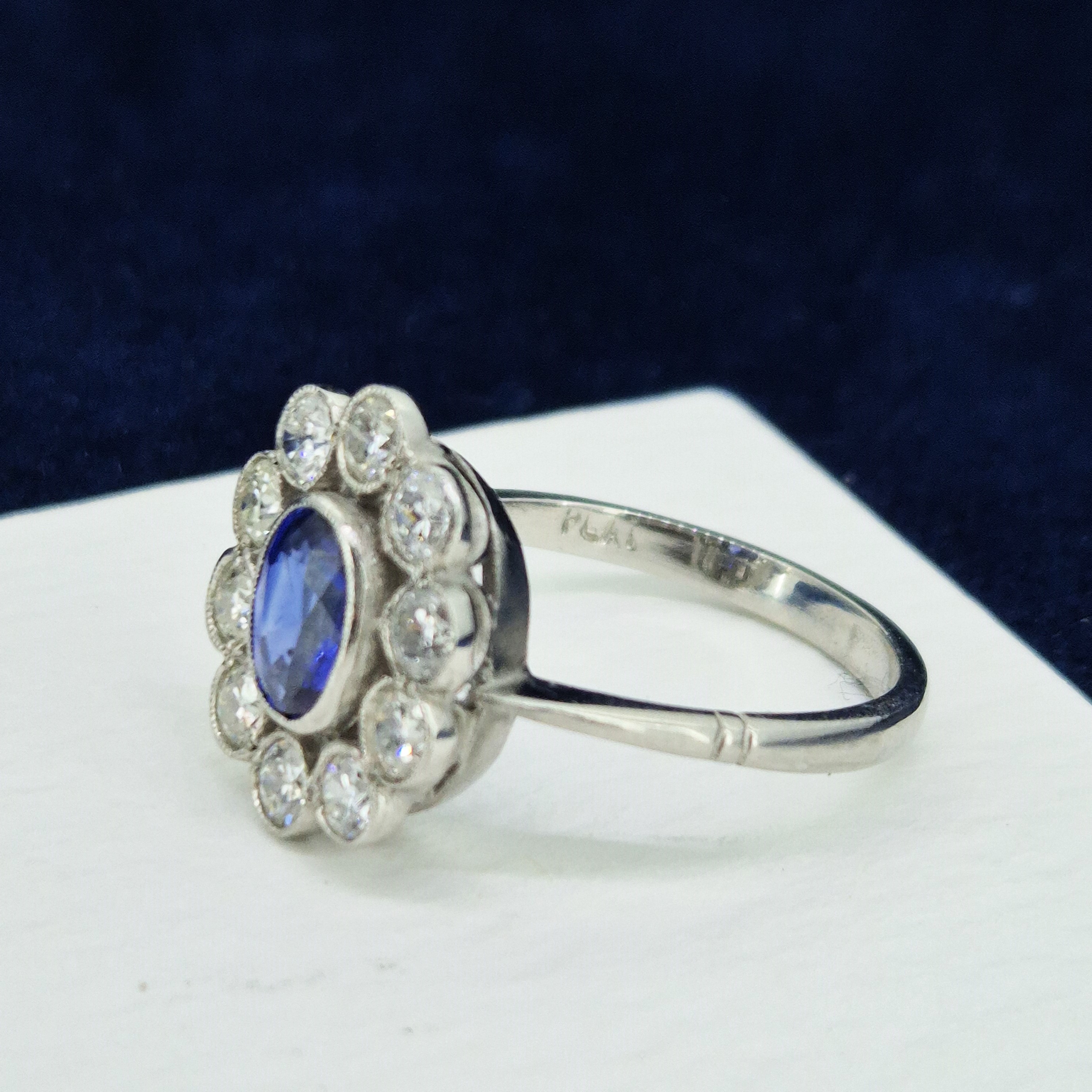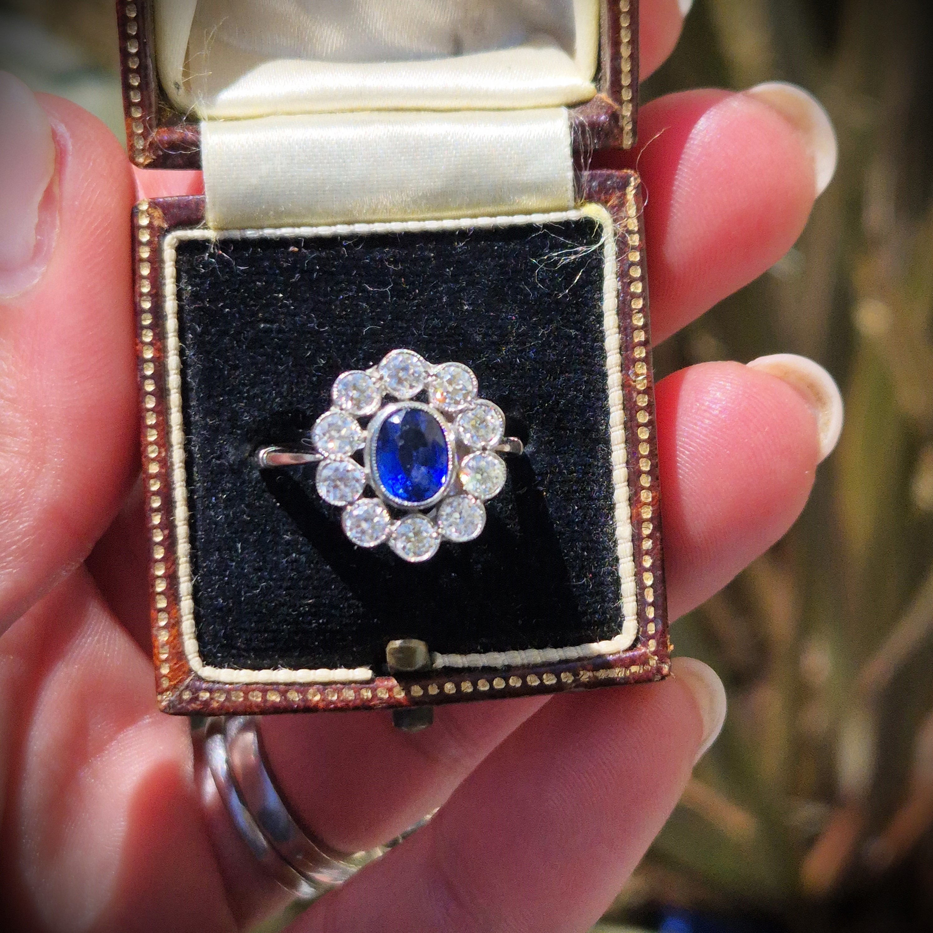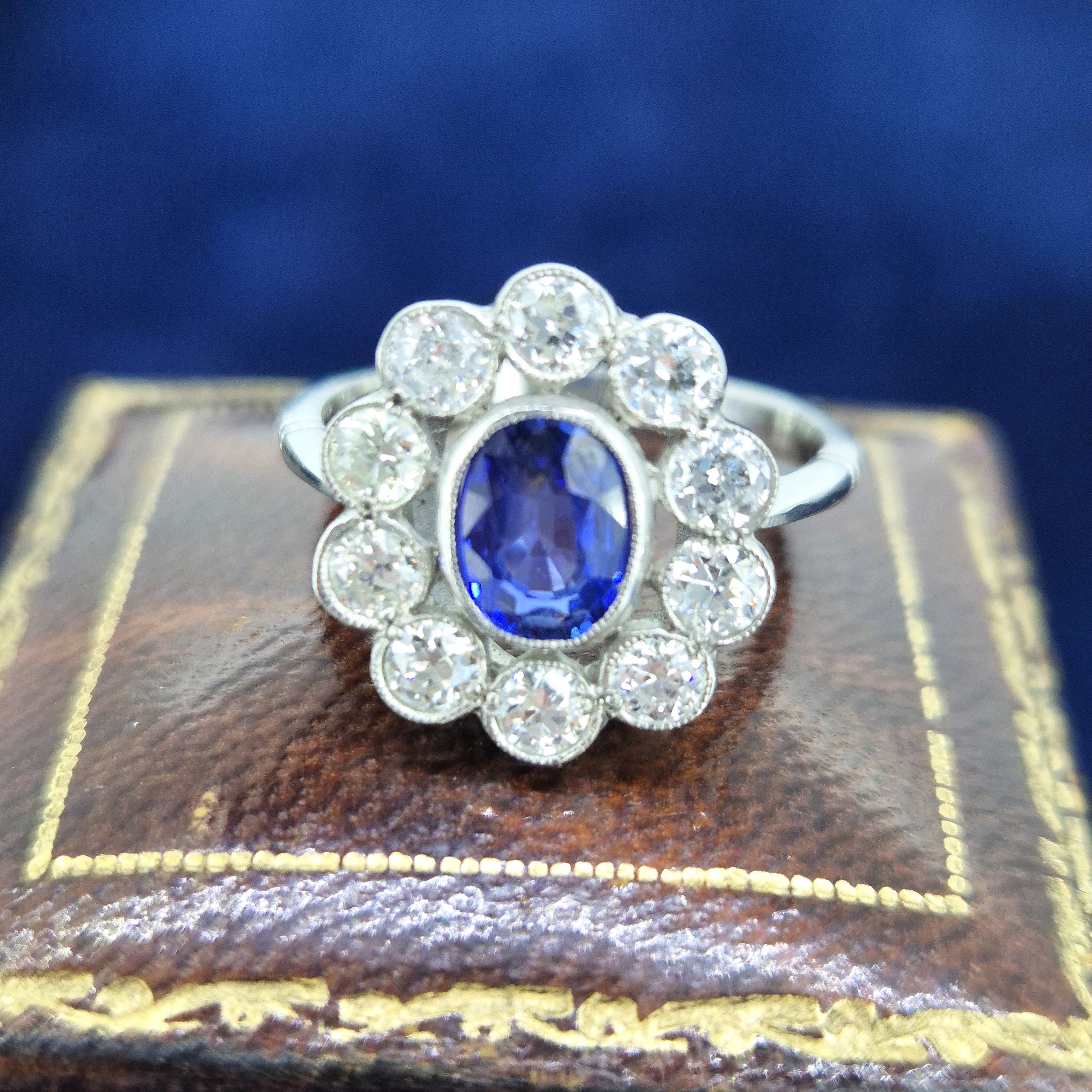 Indulge in the refined beauty of this Victorian-Style Sapphire and Diamond Cluster Ring, an heirloom-worthy piece expertly crafted for lovers of exceptional Sapphire rings. It is crafted in a combination of Platinum and 18ct Yellow Gold, showcasing traditional craftsmanship inspired by the romantic jewellery of the Victorian Era.