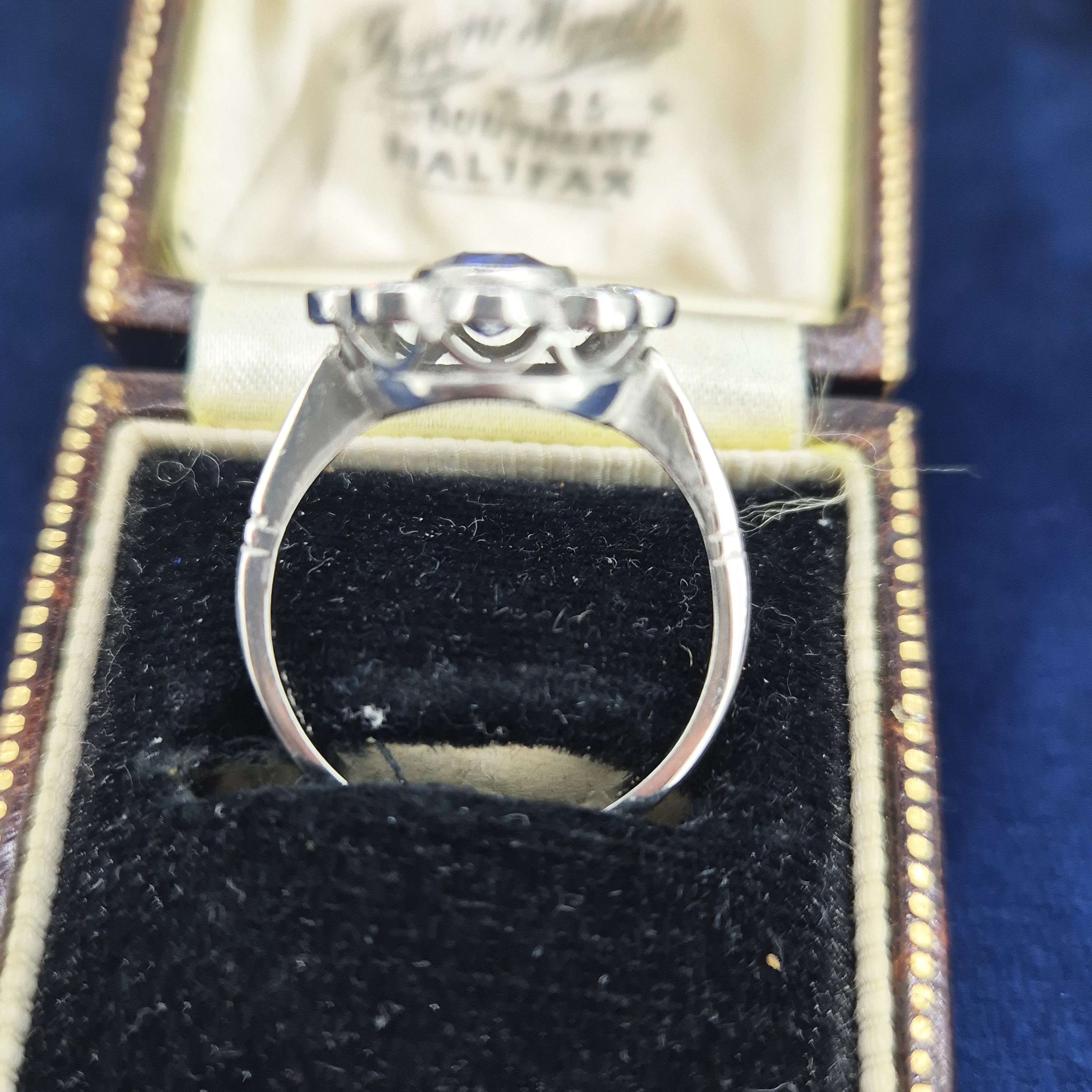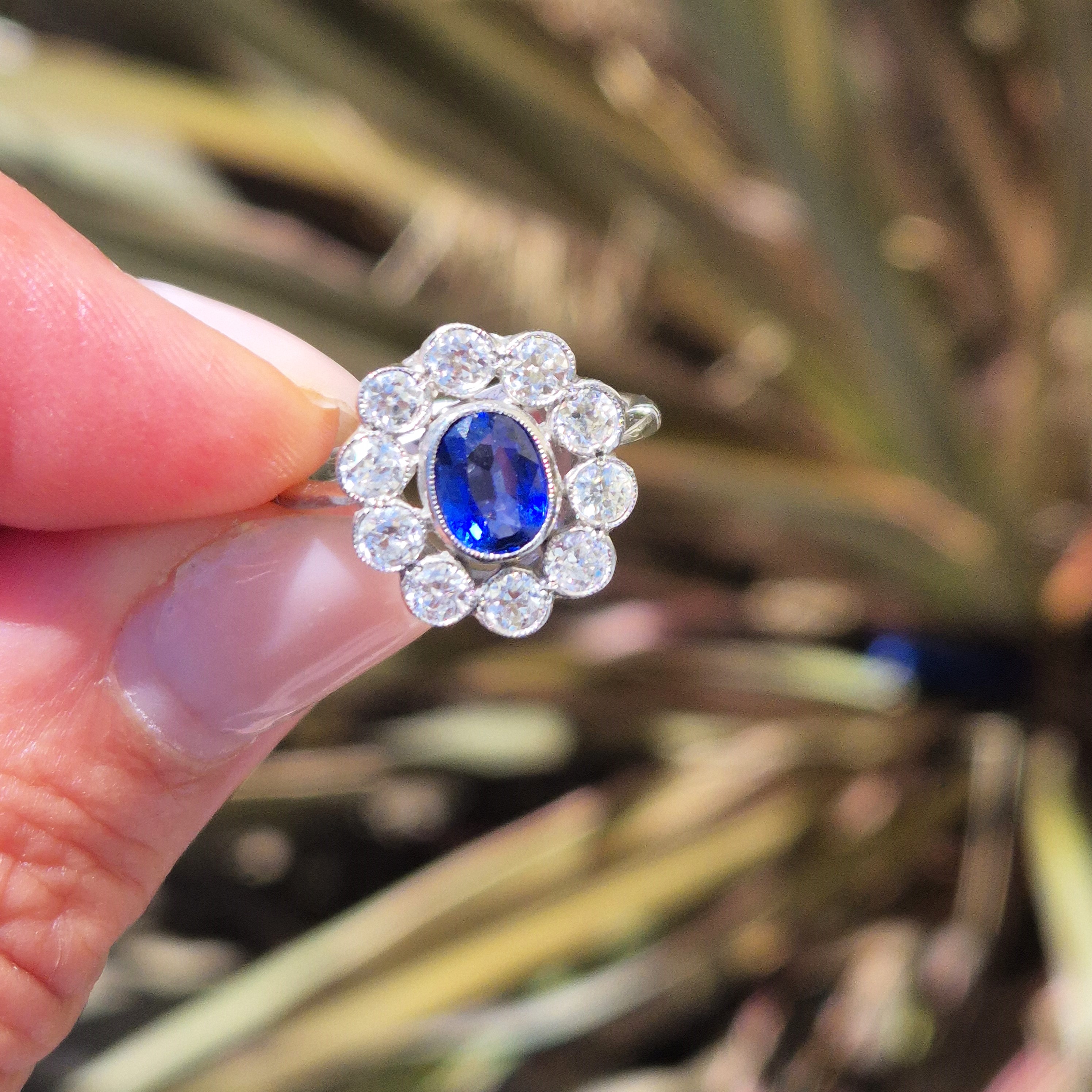 It is currently a Finger Size O and the ring can be adjusted to ensure the perfect fit. Its timeless cluster silhouette makes it suitable for engagements, anniversaries, or those seeking a distinctive right-hand ring. This Sapphire ring transitions beautifully from everyday wear to formal occasions, offering versatility and enduring style.