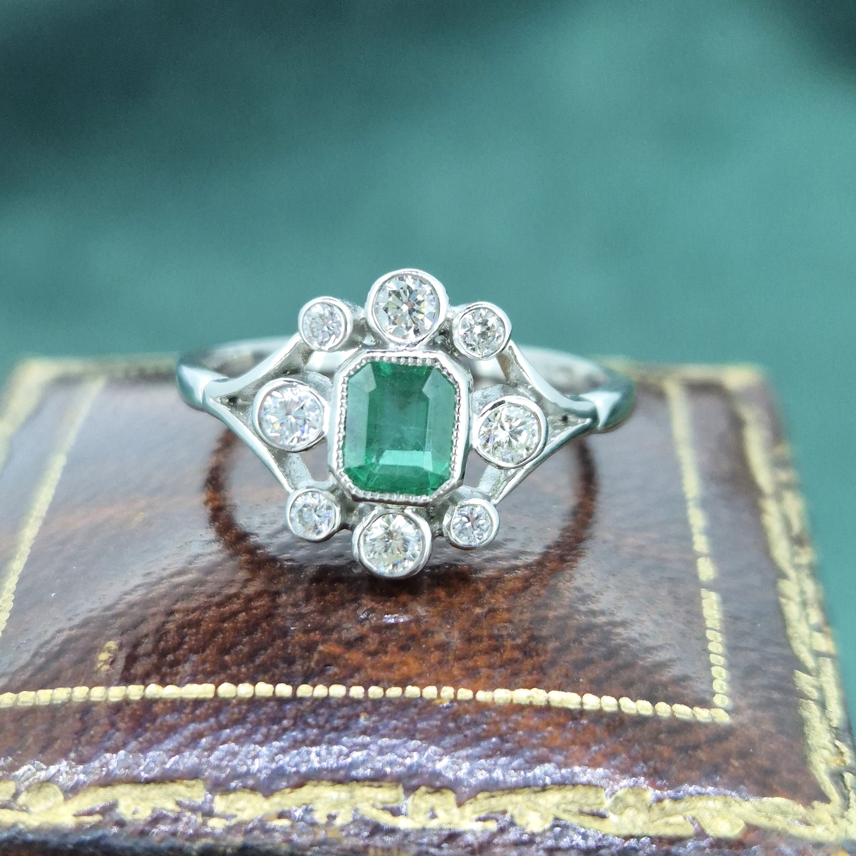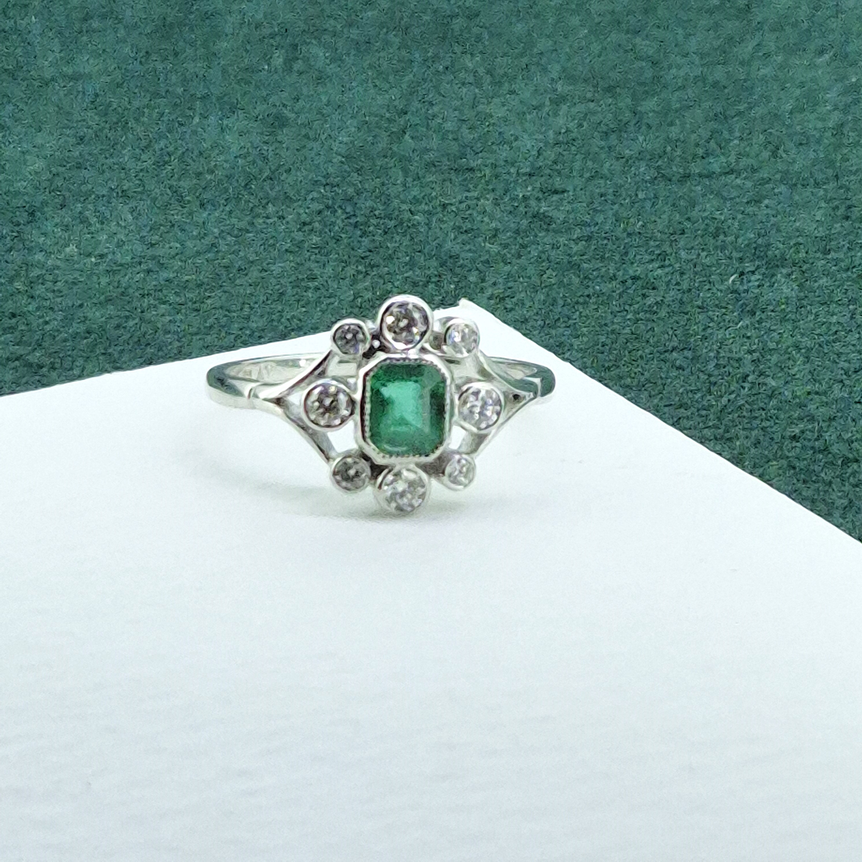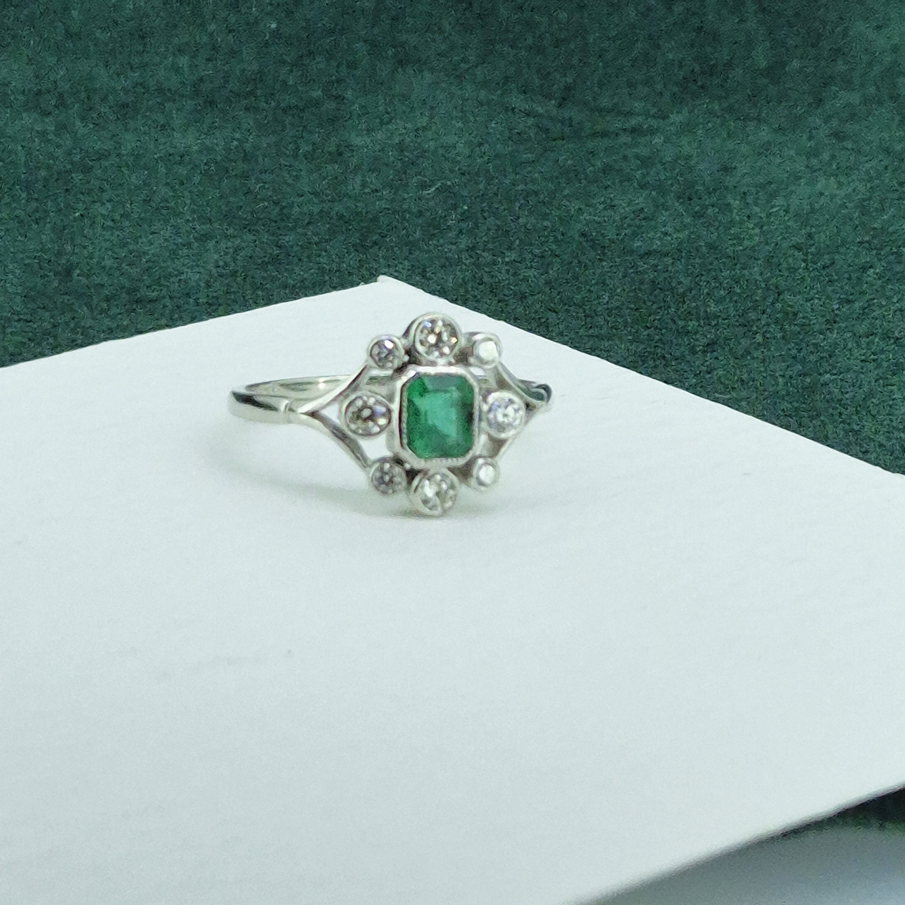 A beautiful Antique Emerald and Diamond Ring crafted from Platinum.