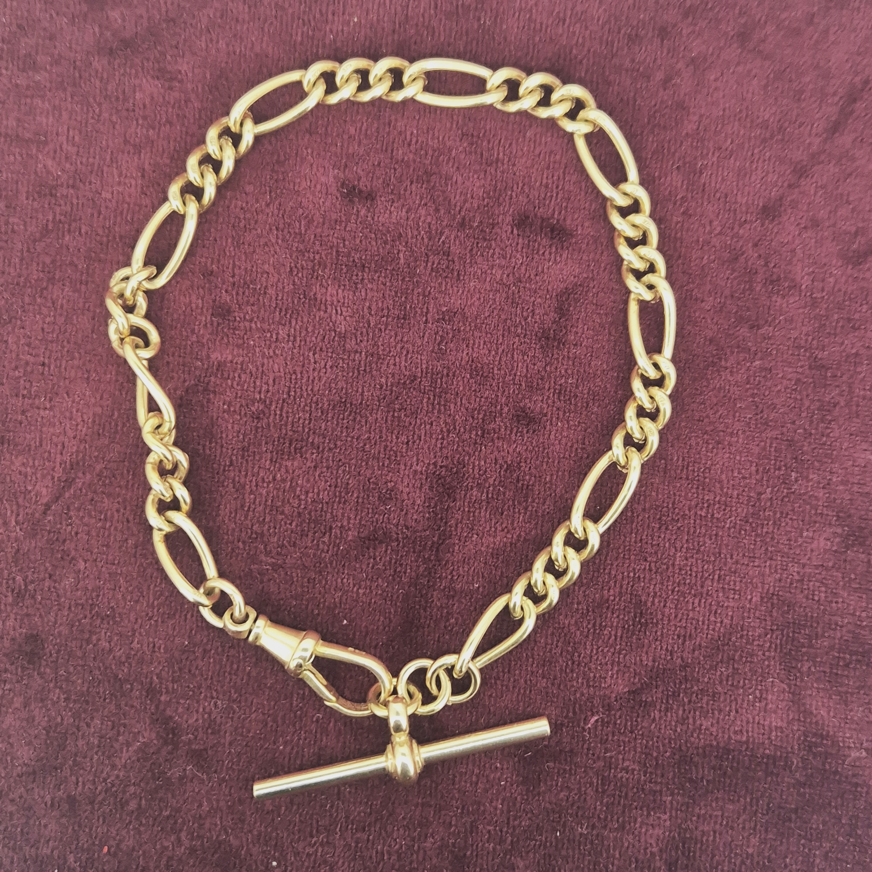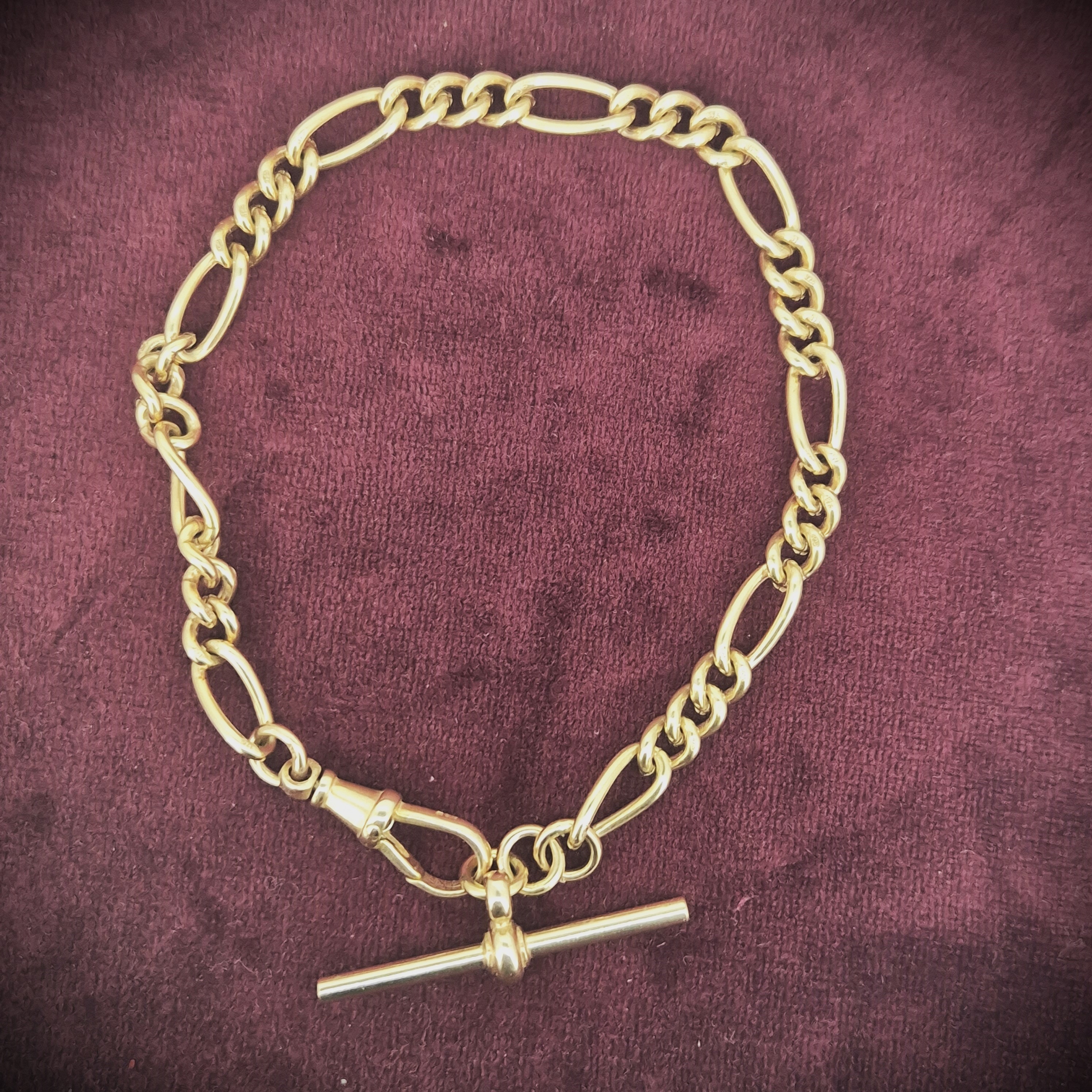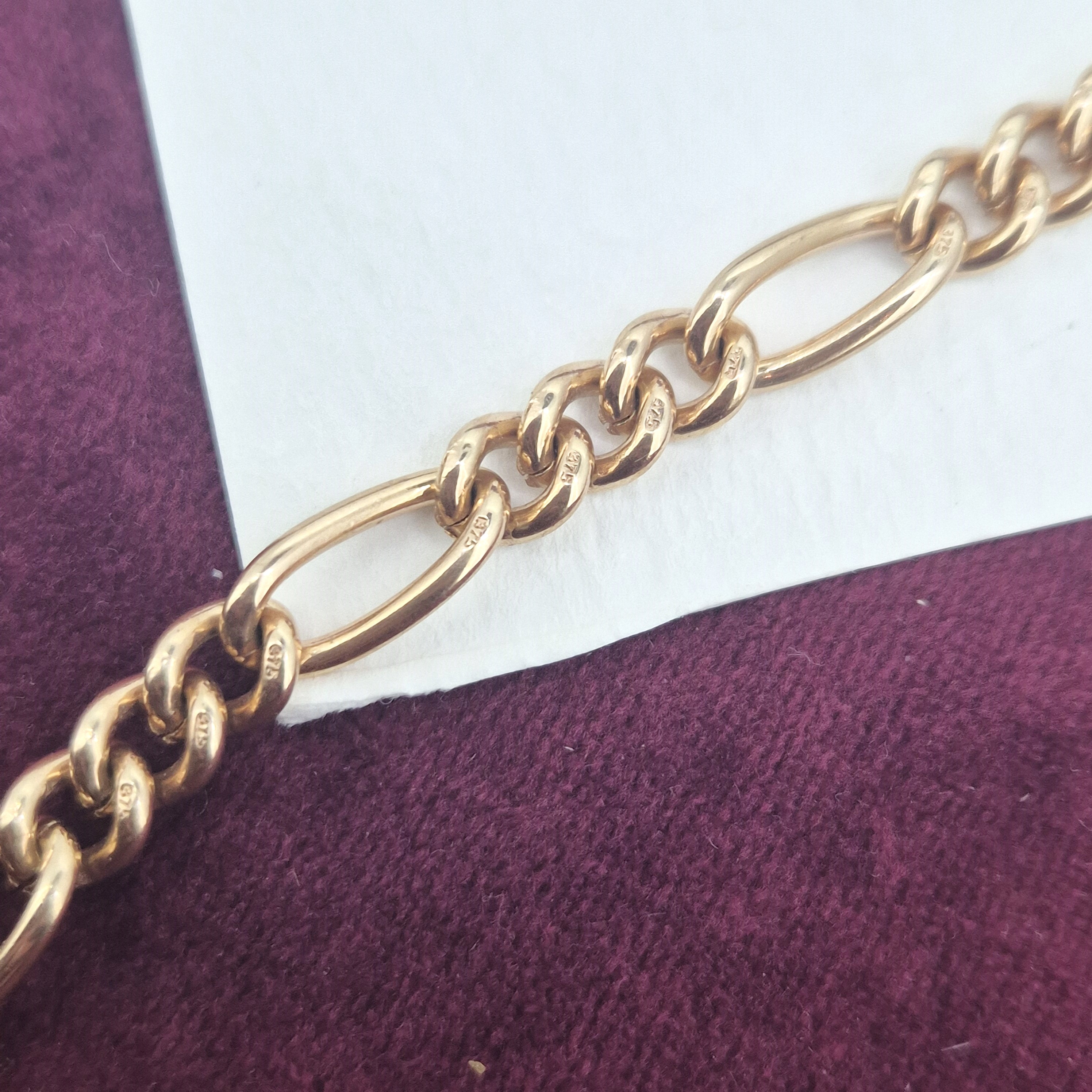 The bracelet features uniformed Figaro links that measure 5.5mm in width that are all individually stamped. It is fitted with a T-Bar at the end that measures 35mm in length. This T-Bar hangs from three jump rings, where the Swivel fitting can be secured to the closest one.