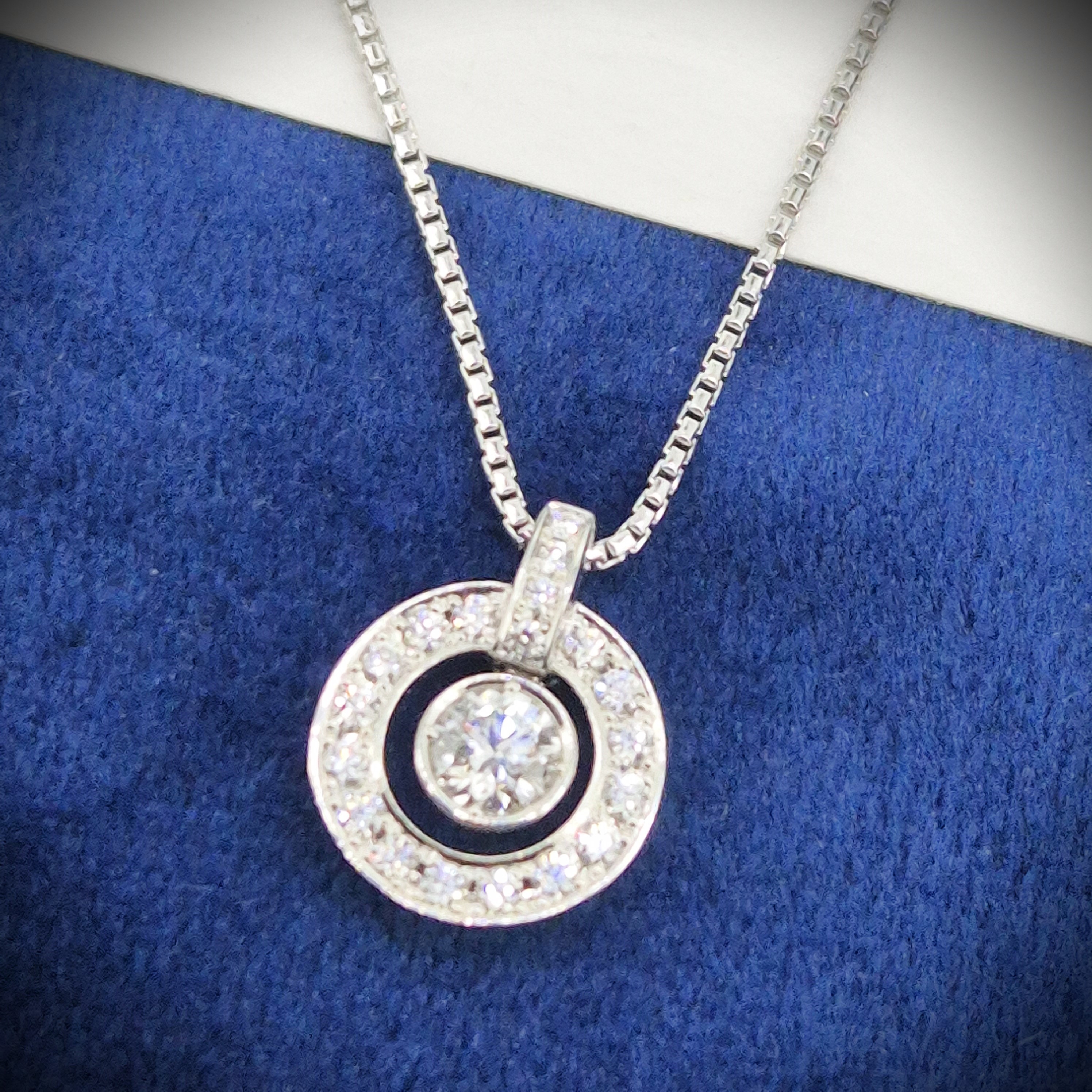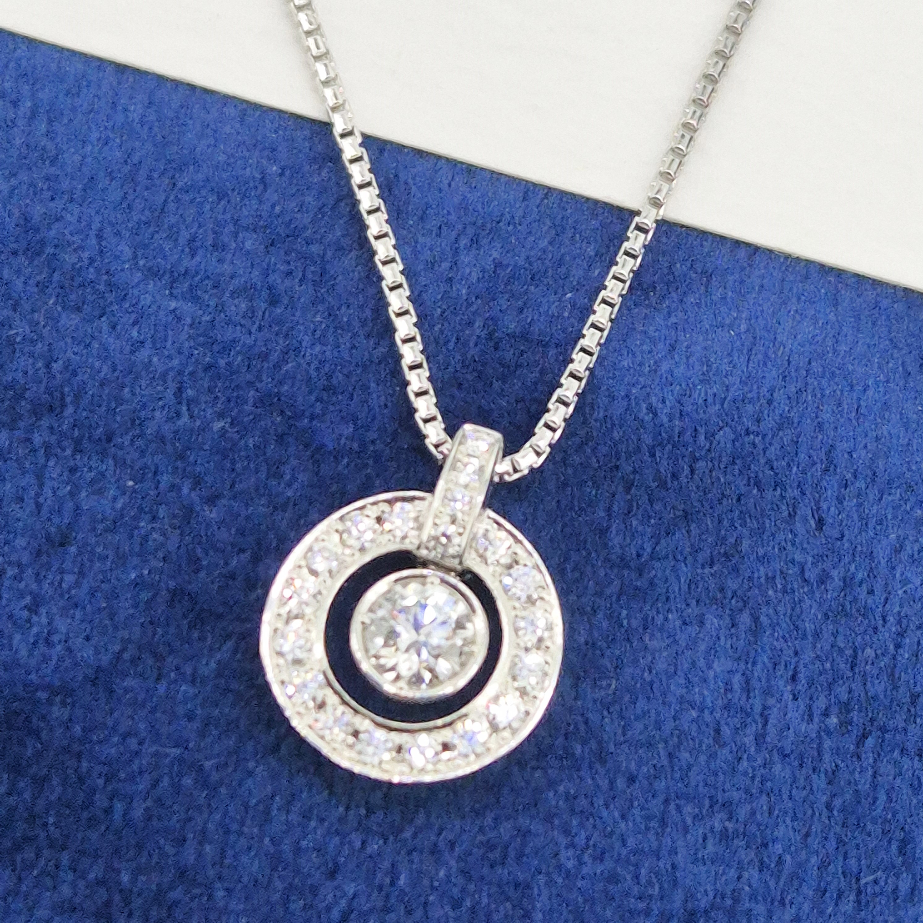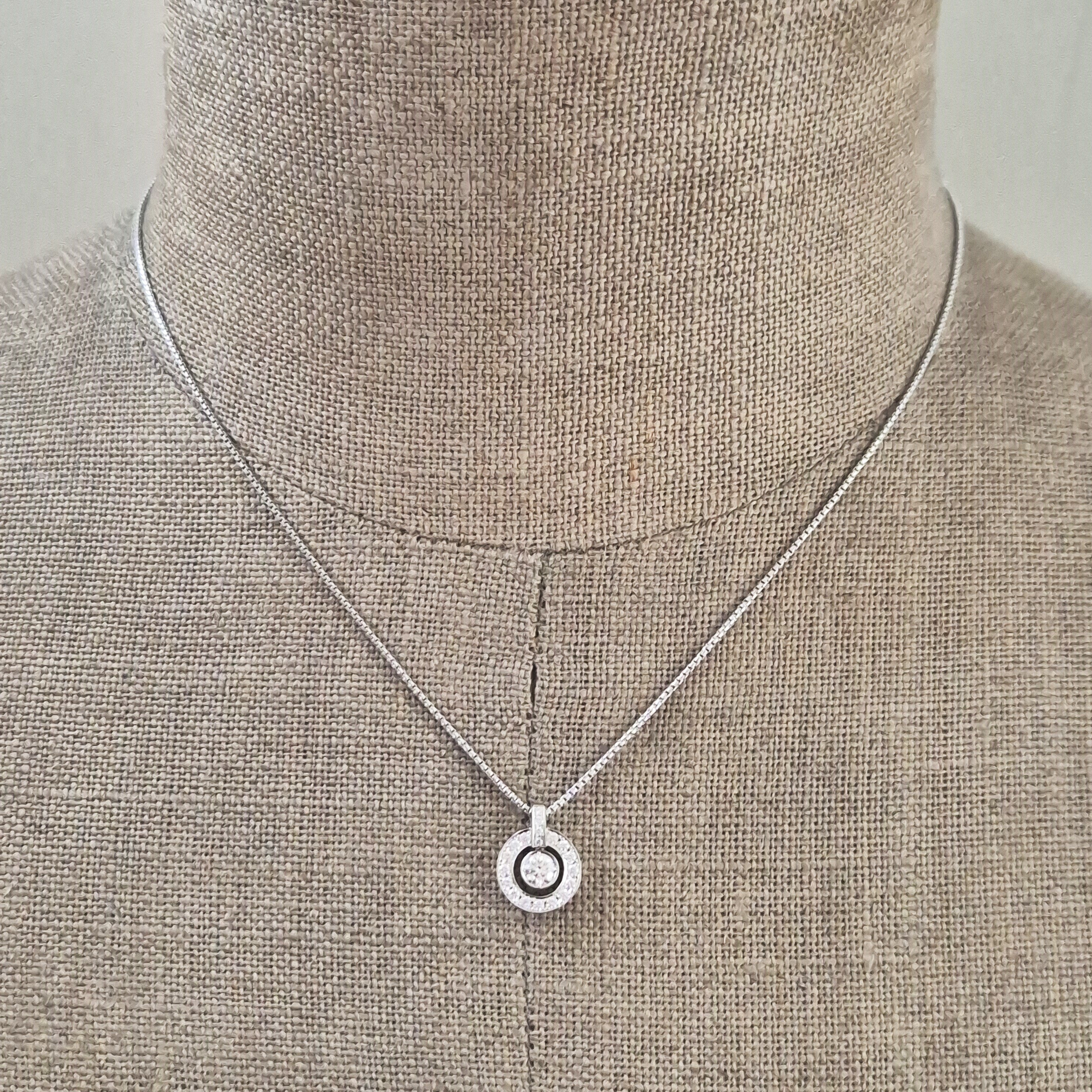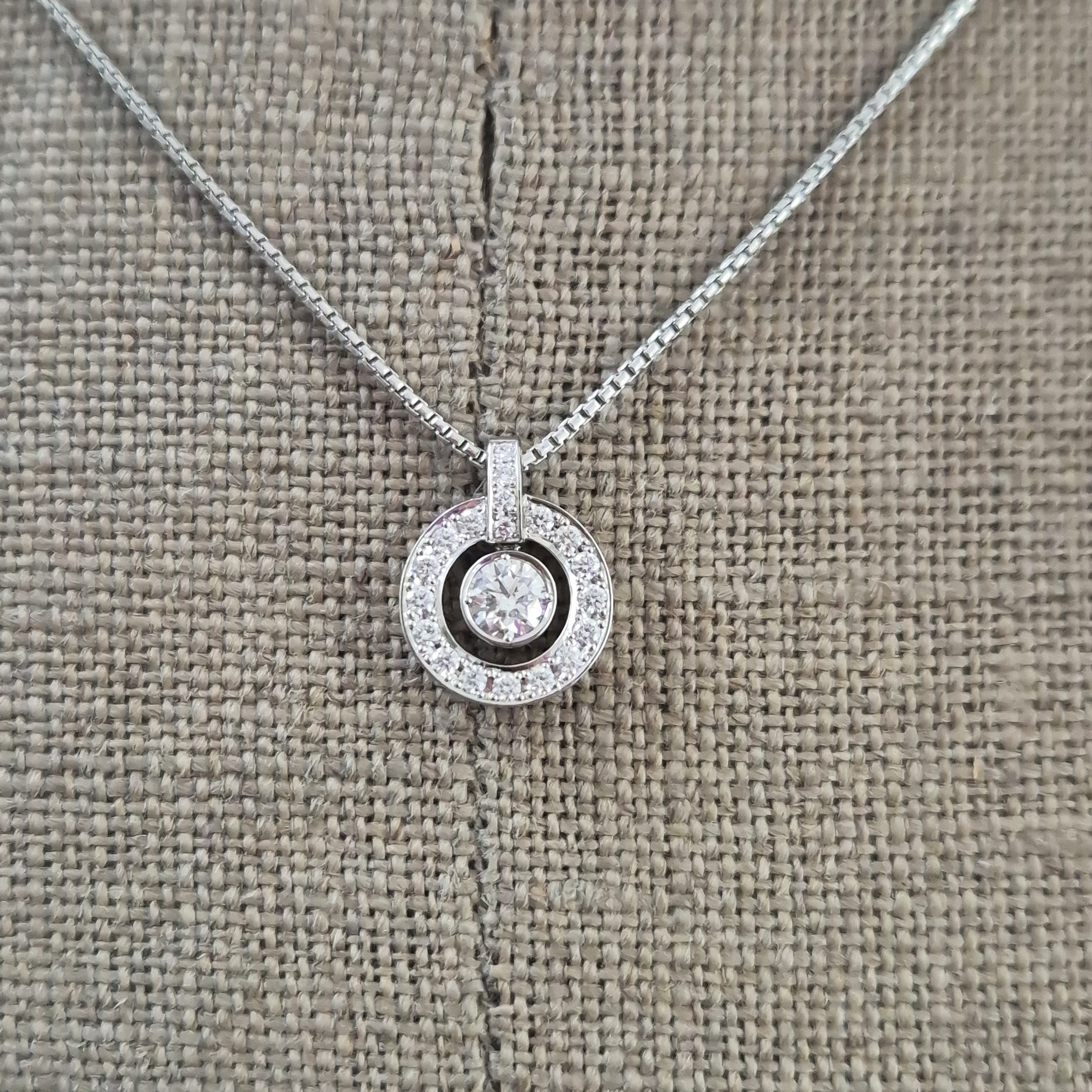 This pendant features a Round Brilliant Diamond in the centre that measures 0.30cts that is set in a smooth, rub-over setting. This diamond looks like its floating in the centre and is surrounded by a halo of Round Brilliant Diamonds that are set in a grain setting which makes this pendant look vintage. The total diamond weight is 0.50cts.