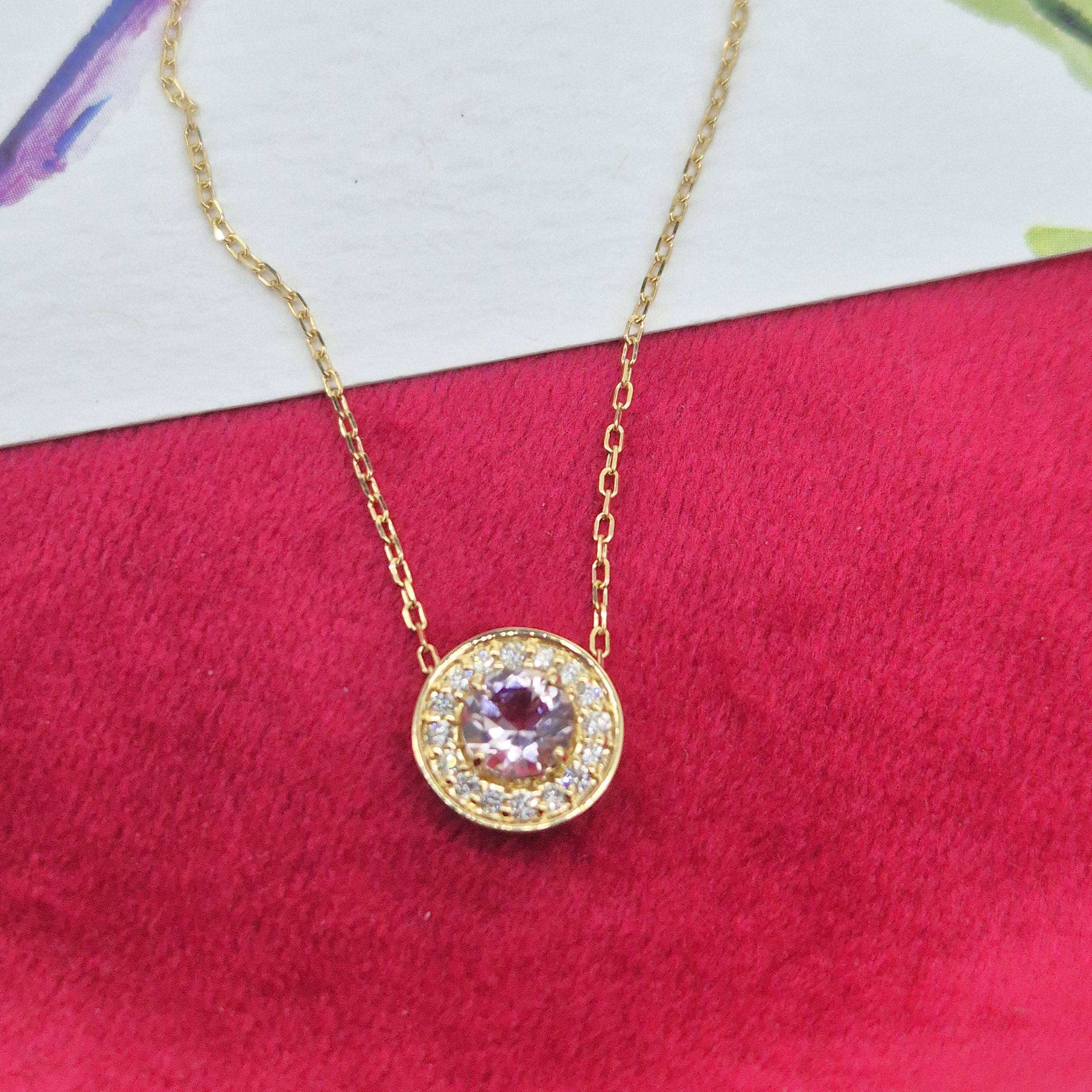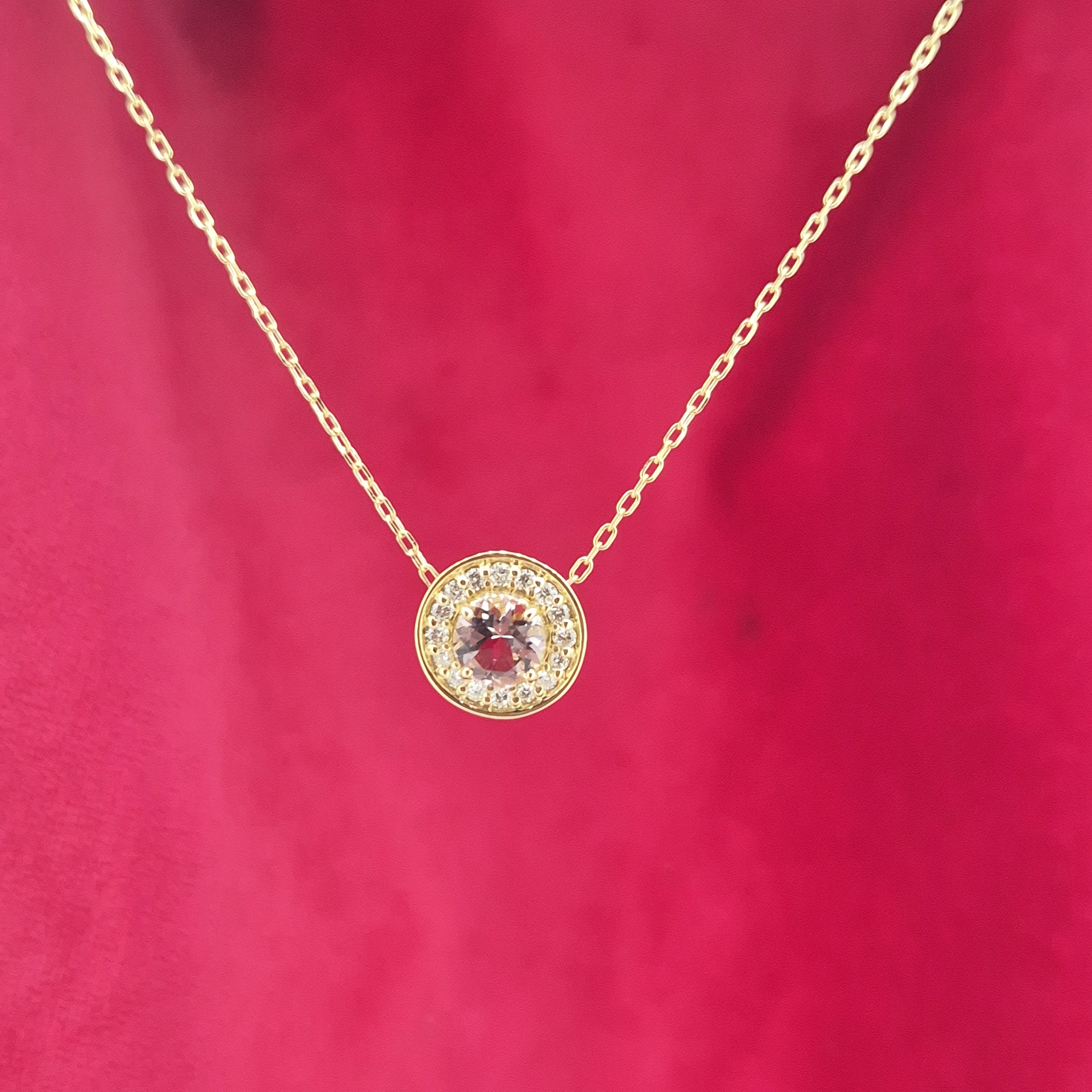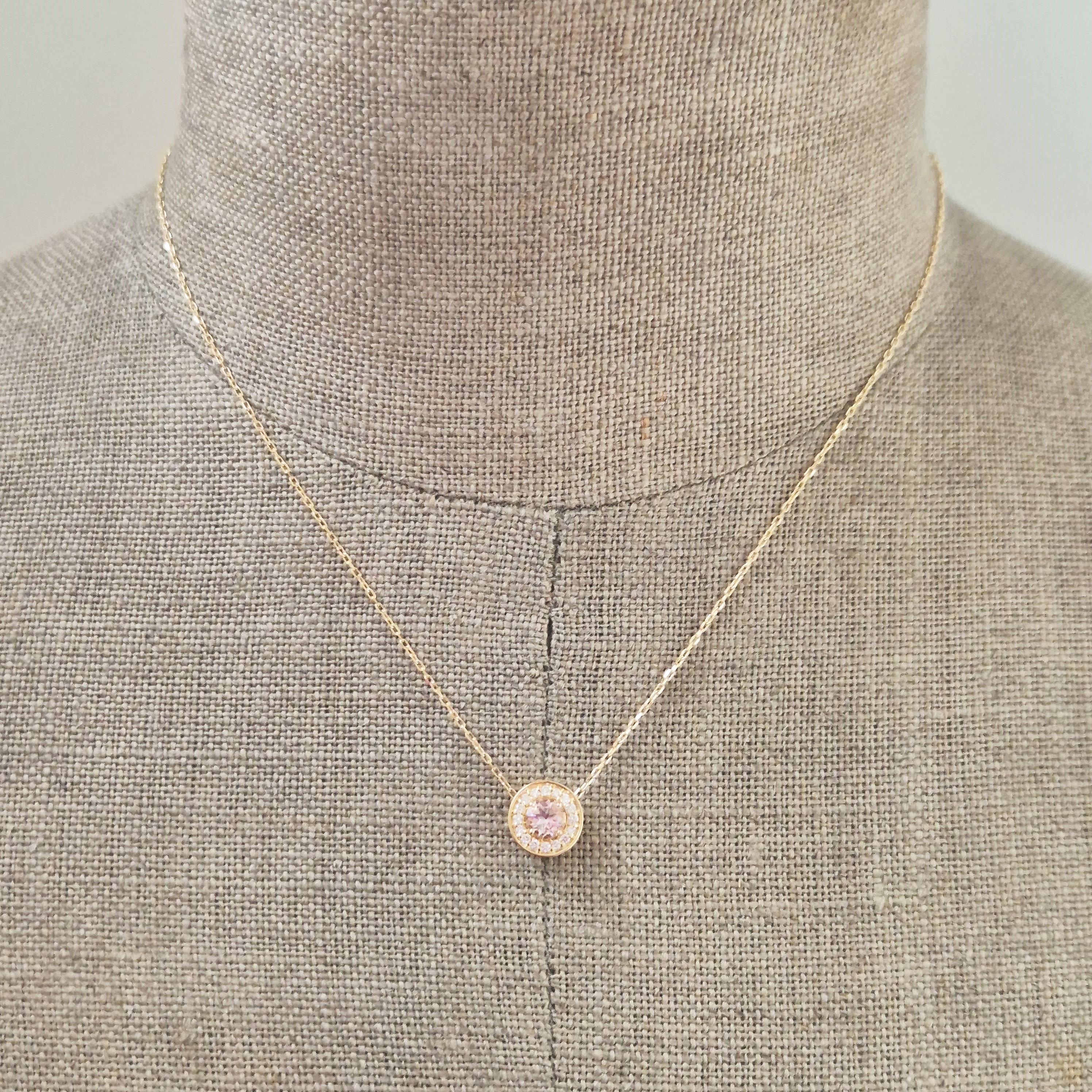 The pendant is set with a Rose Quartz in the centre that weighs 0.40cts. It is surrounded by a halo of Round Brilliant Grain Set Diamonds that weigh 0.11cts.