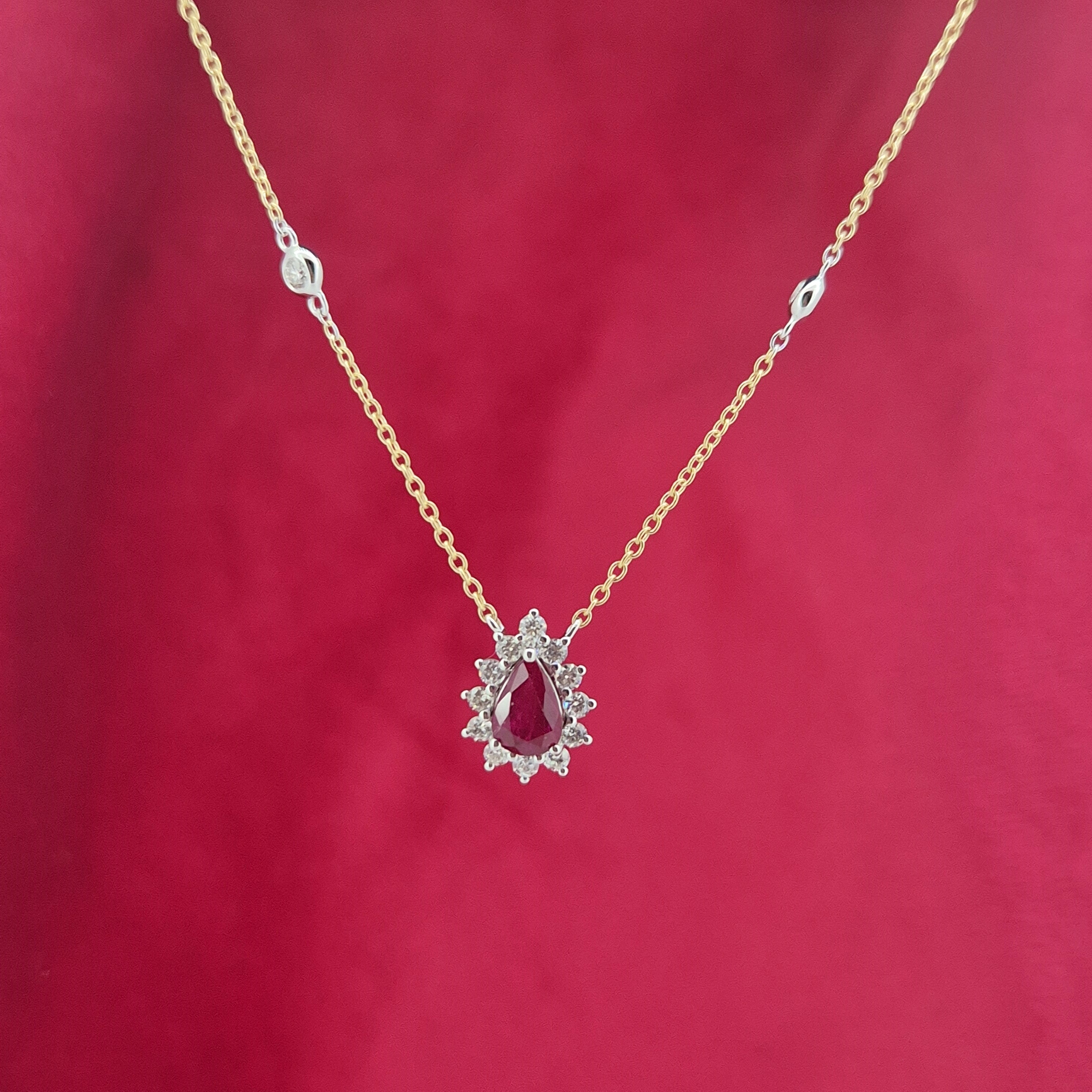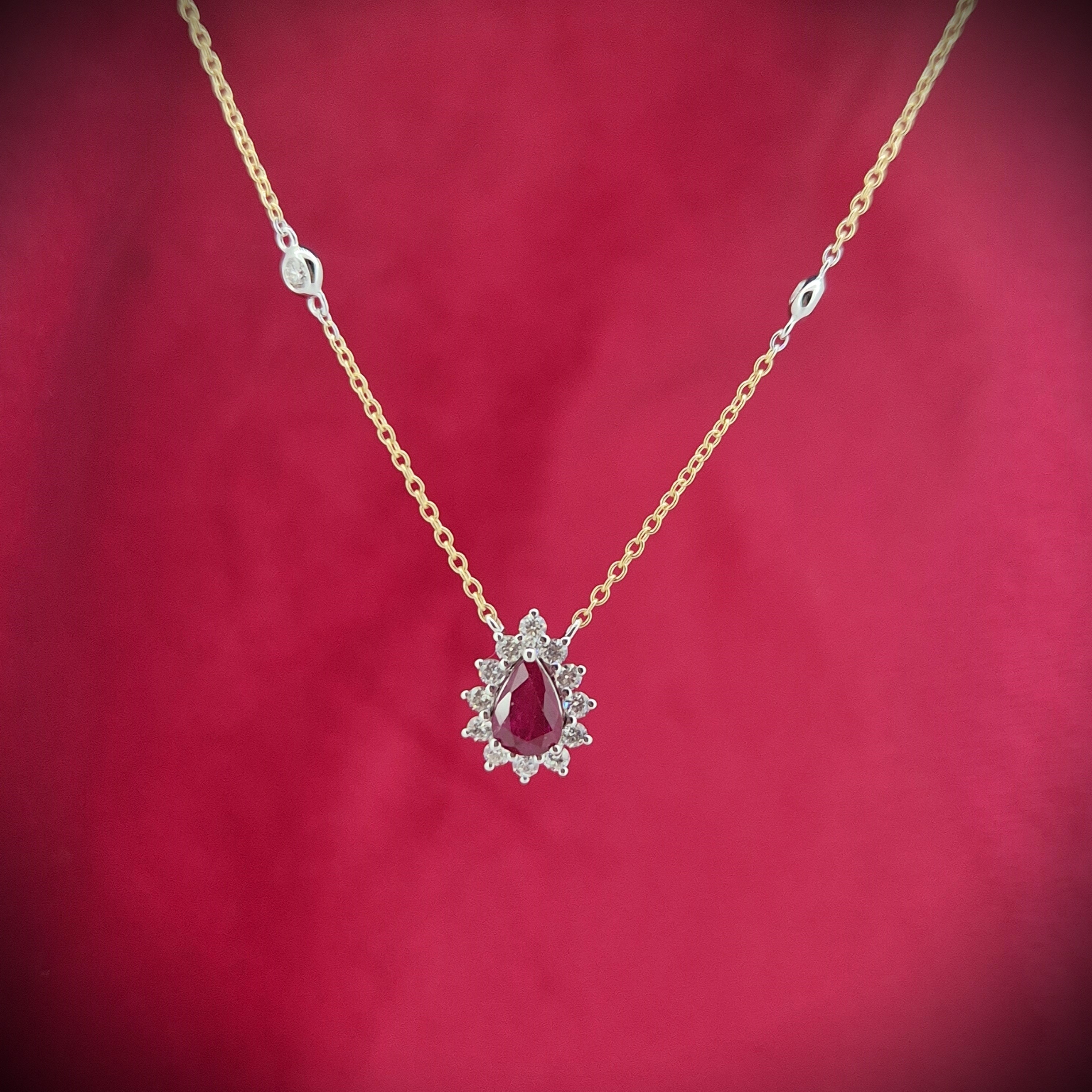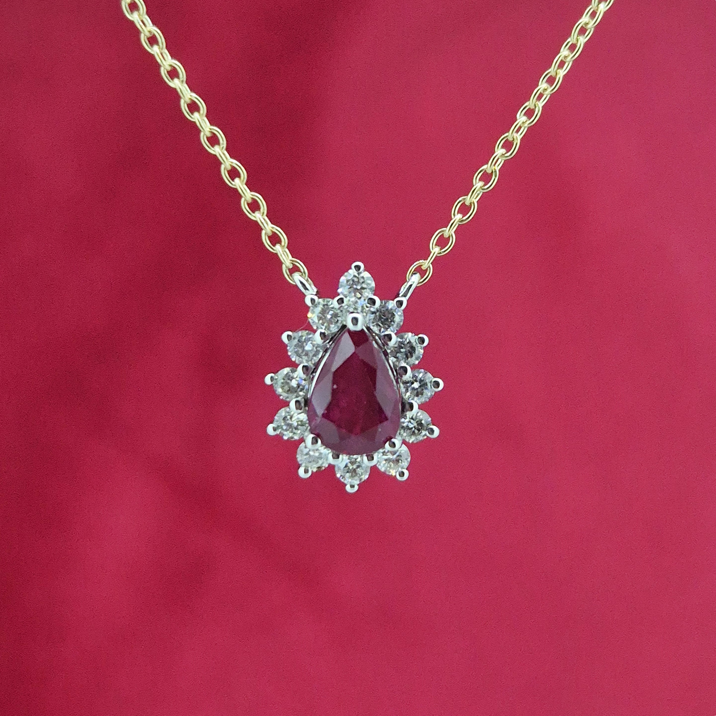 A stunning Ruby and Diamond Tear Drop Pendant crafted from 18ct Yellow and White Gold.