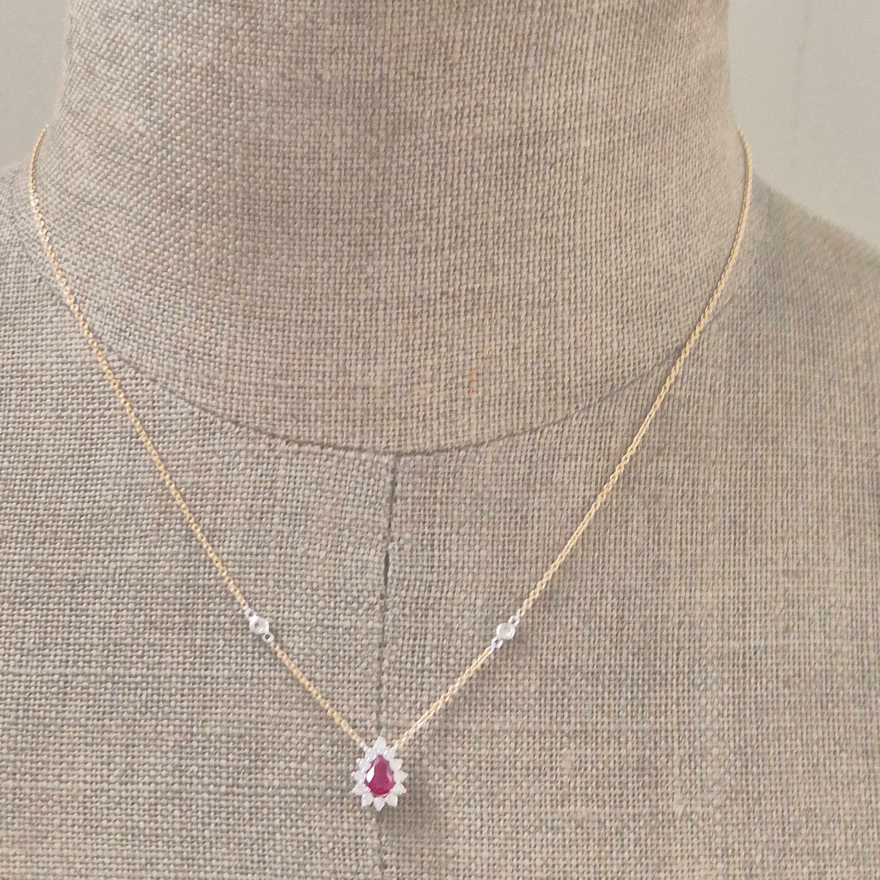 The pendant is set with a Pear Shape Ruby in the centre which is a lovely, deep red colour. The Ruby weighs 0.65cts and is surrounded by Round Brilliant Diamonds that are set in a claw setting. These Diamonds are Colour G/H, Clarity SI1.