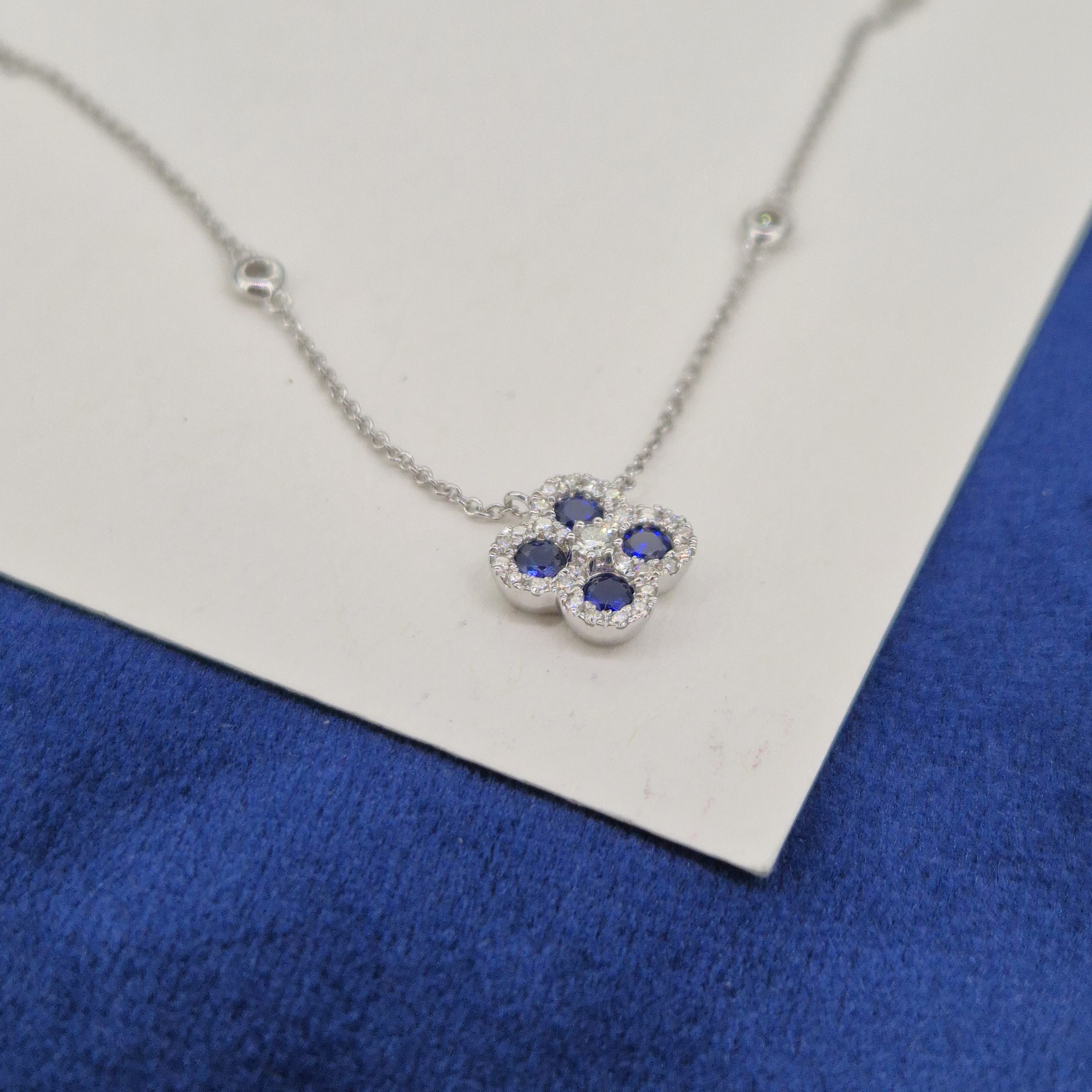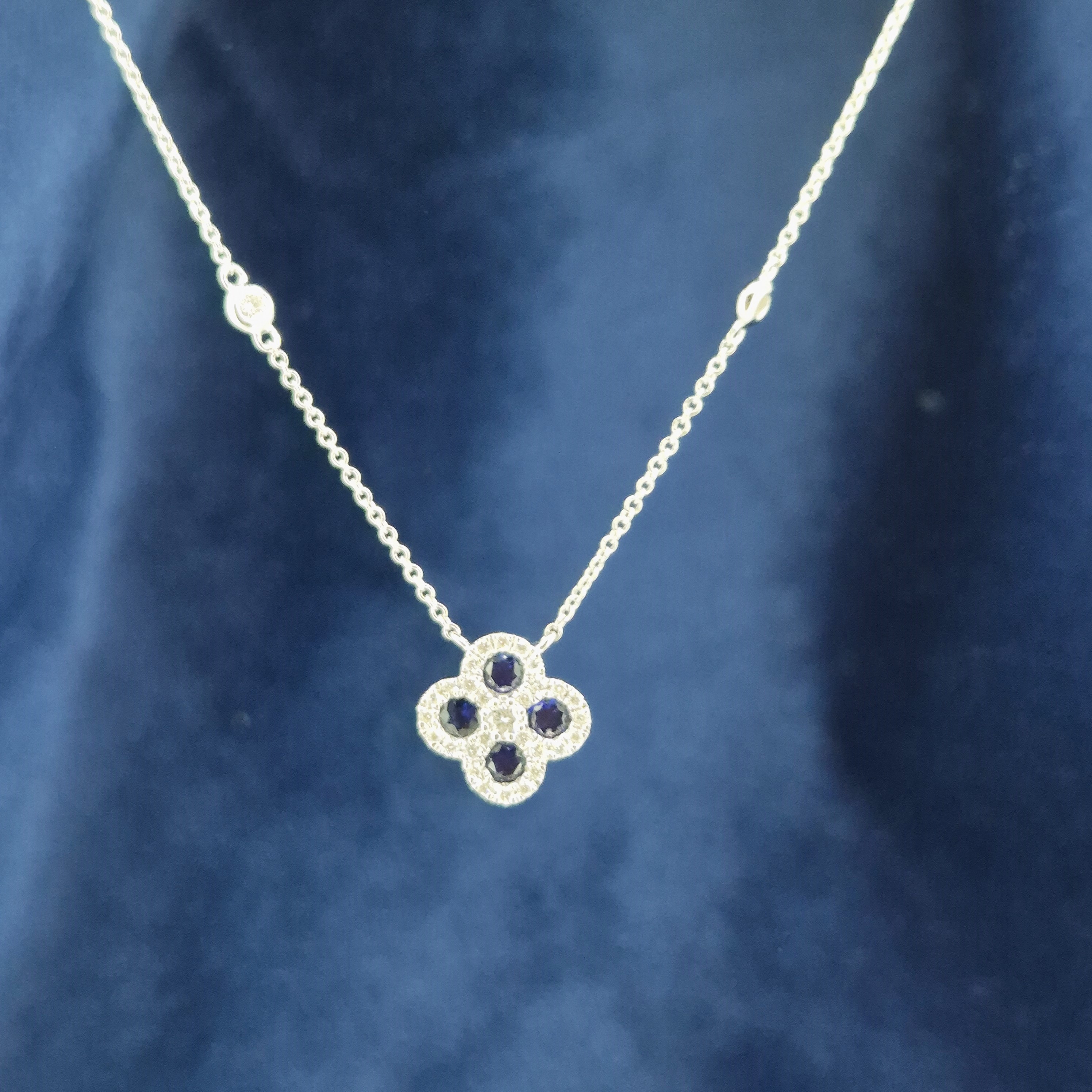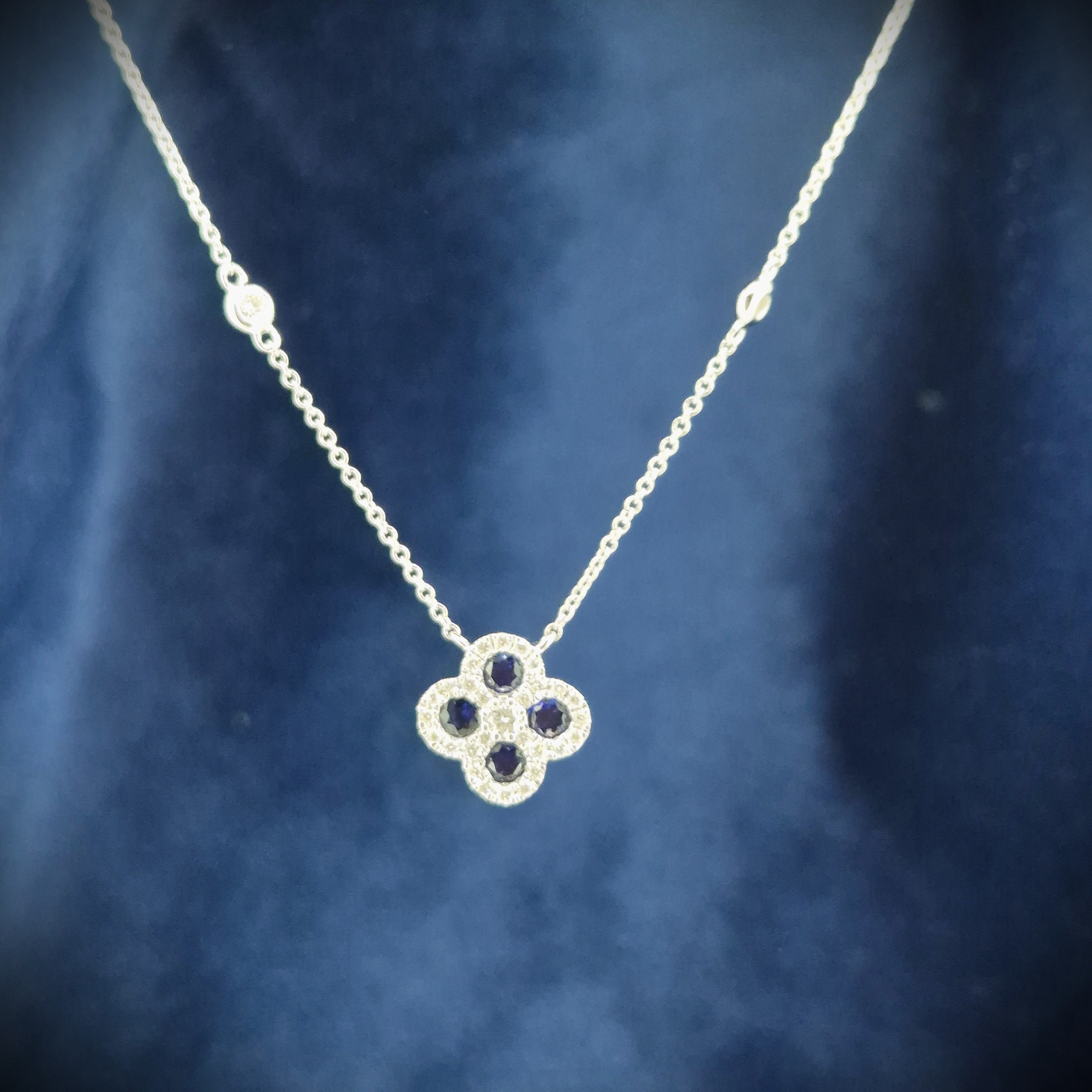 A beautiful Sapphire and Diamond Clover Necklace crafted from 18ct White Gold.