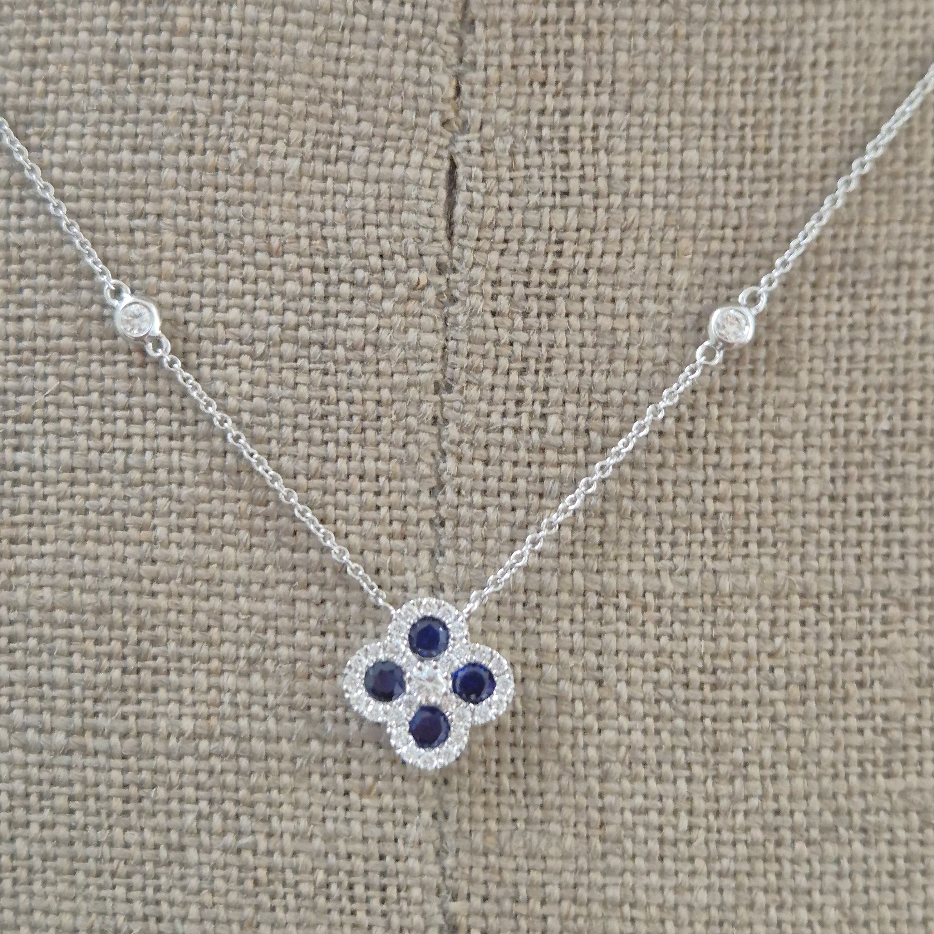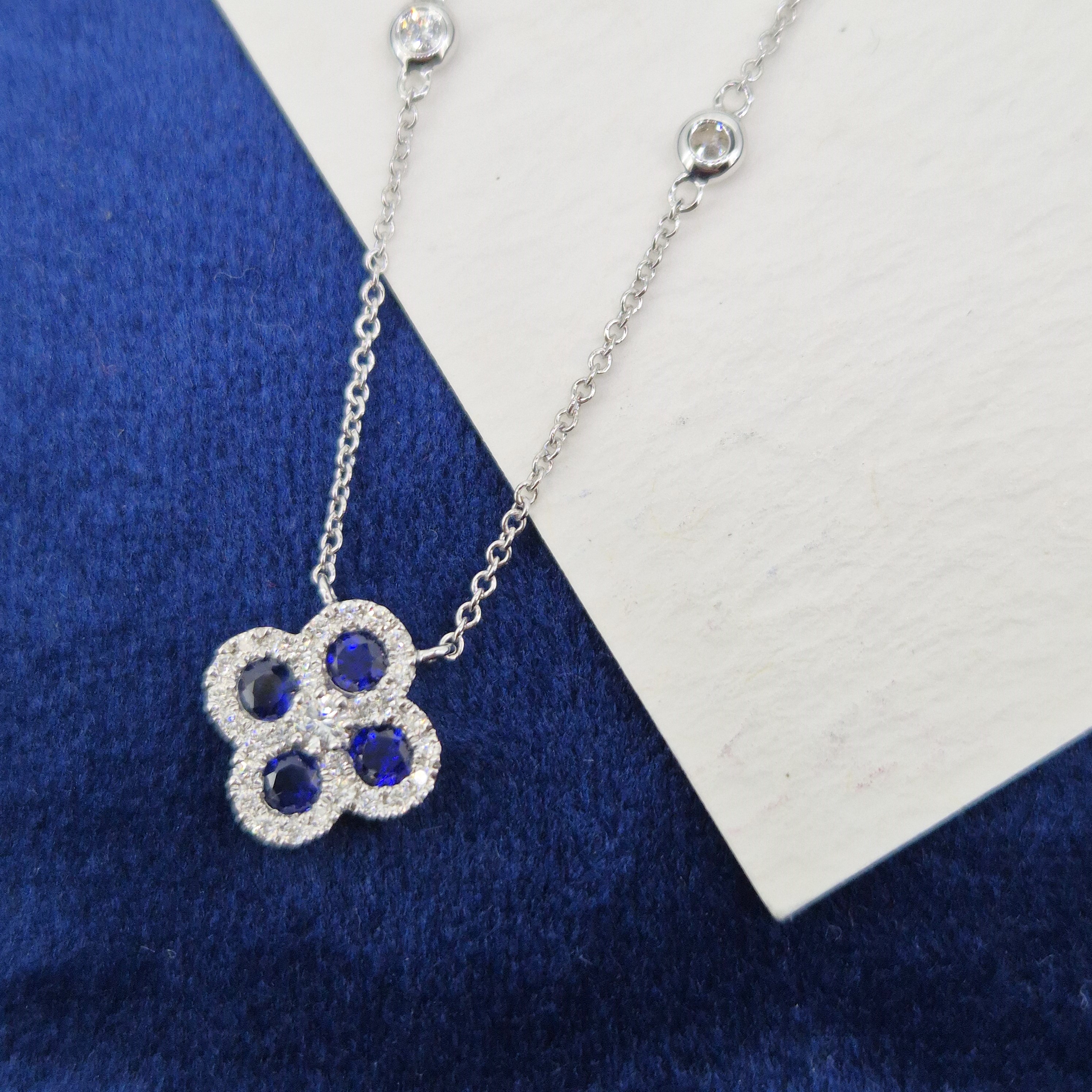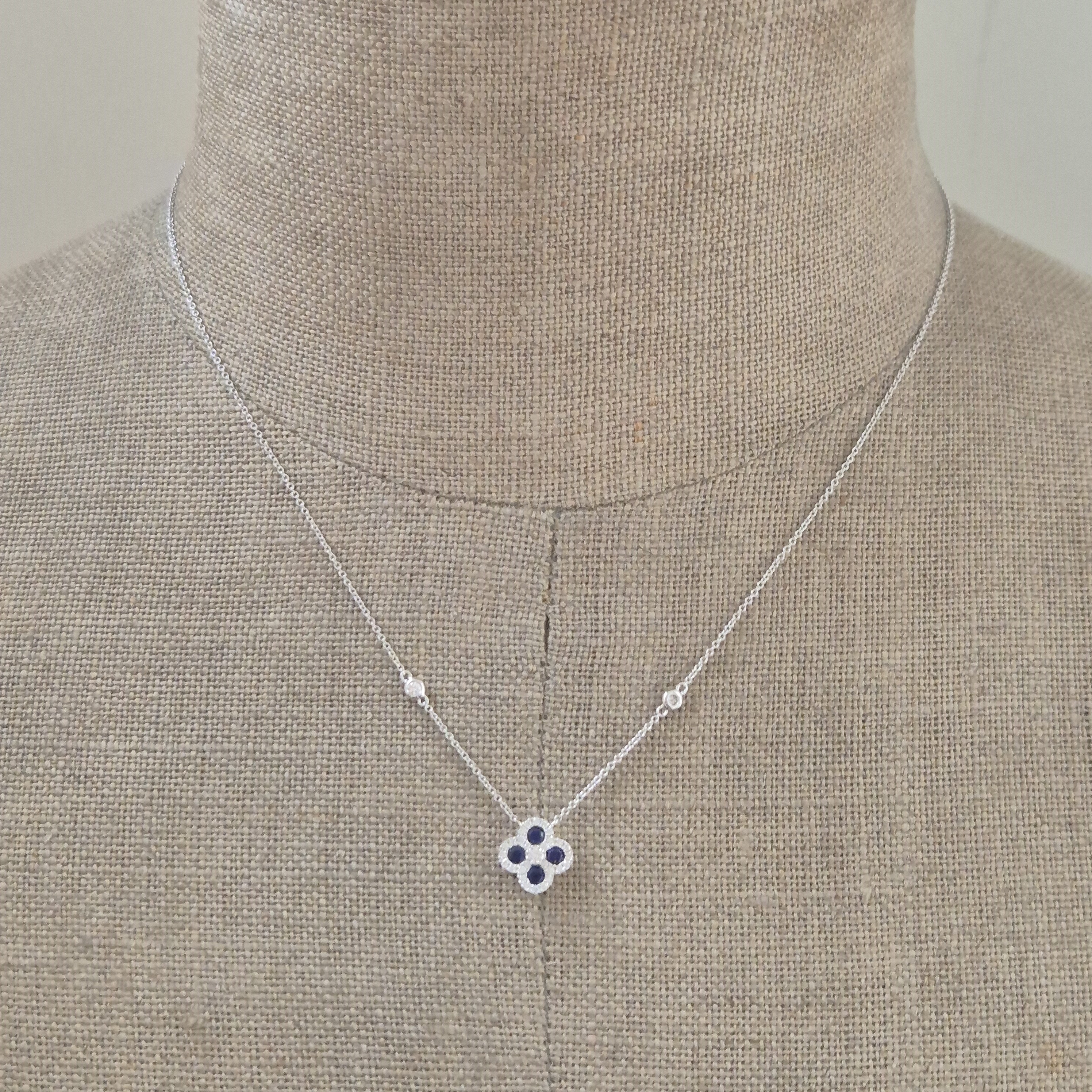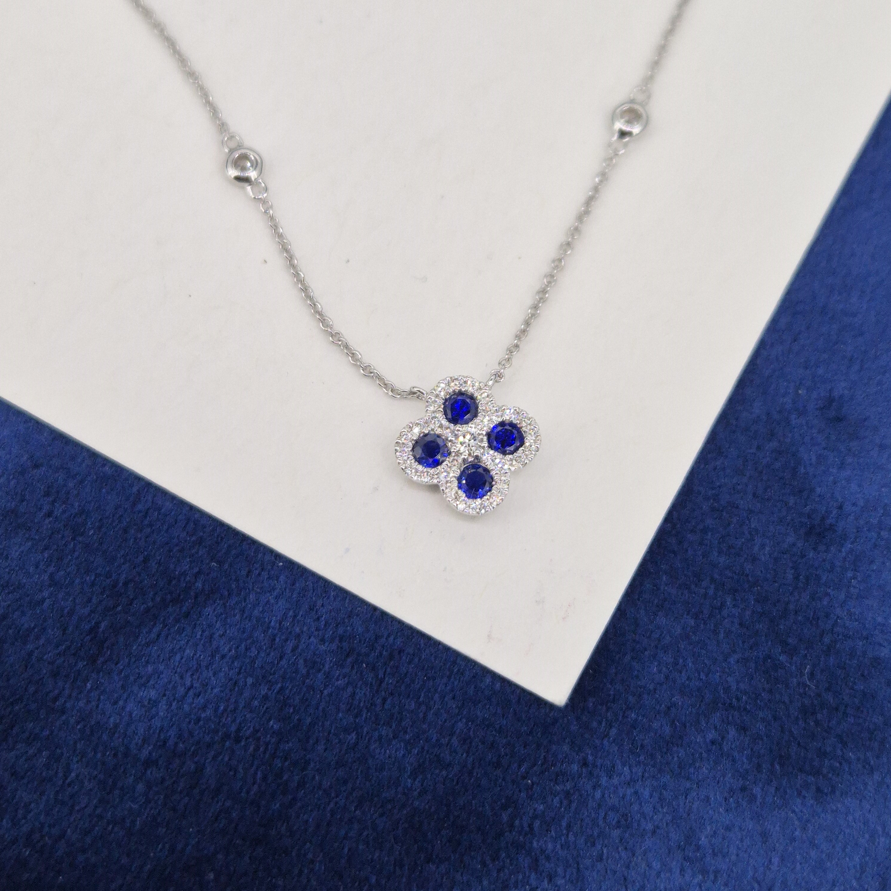 A beautiful Sapphire and Diamond Clover Necklace crafted from 18ct White Gold.