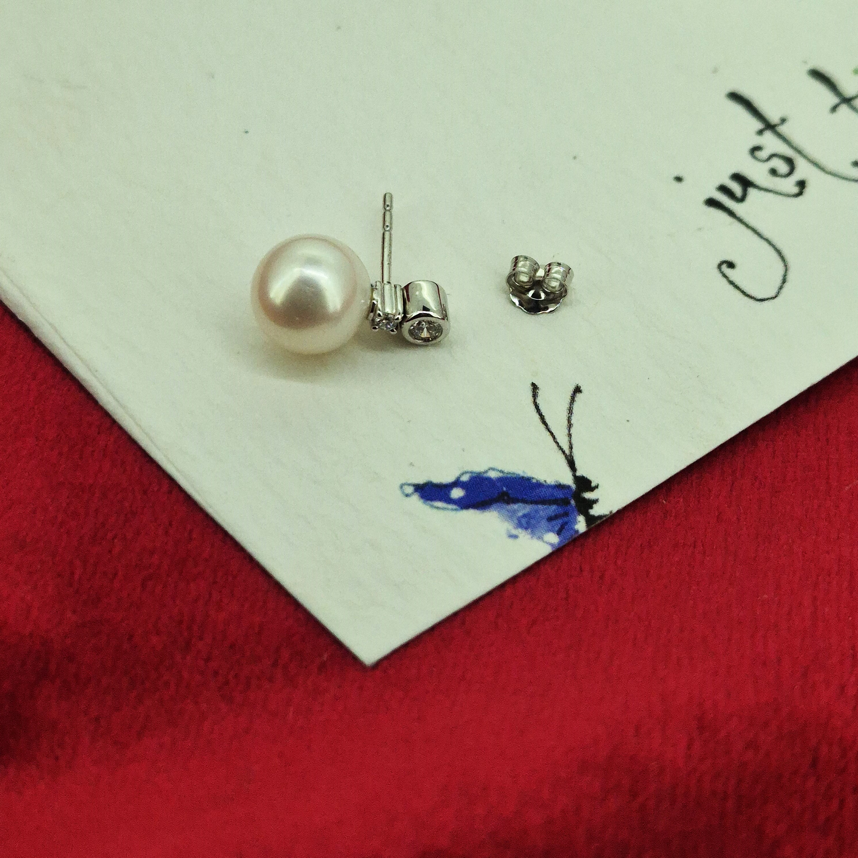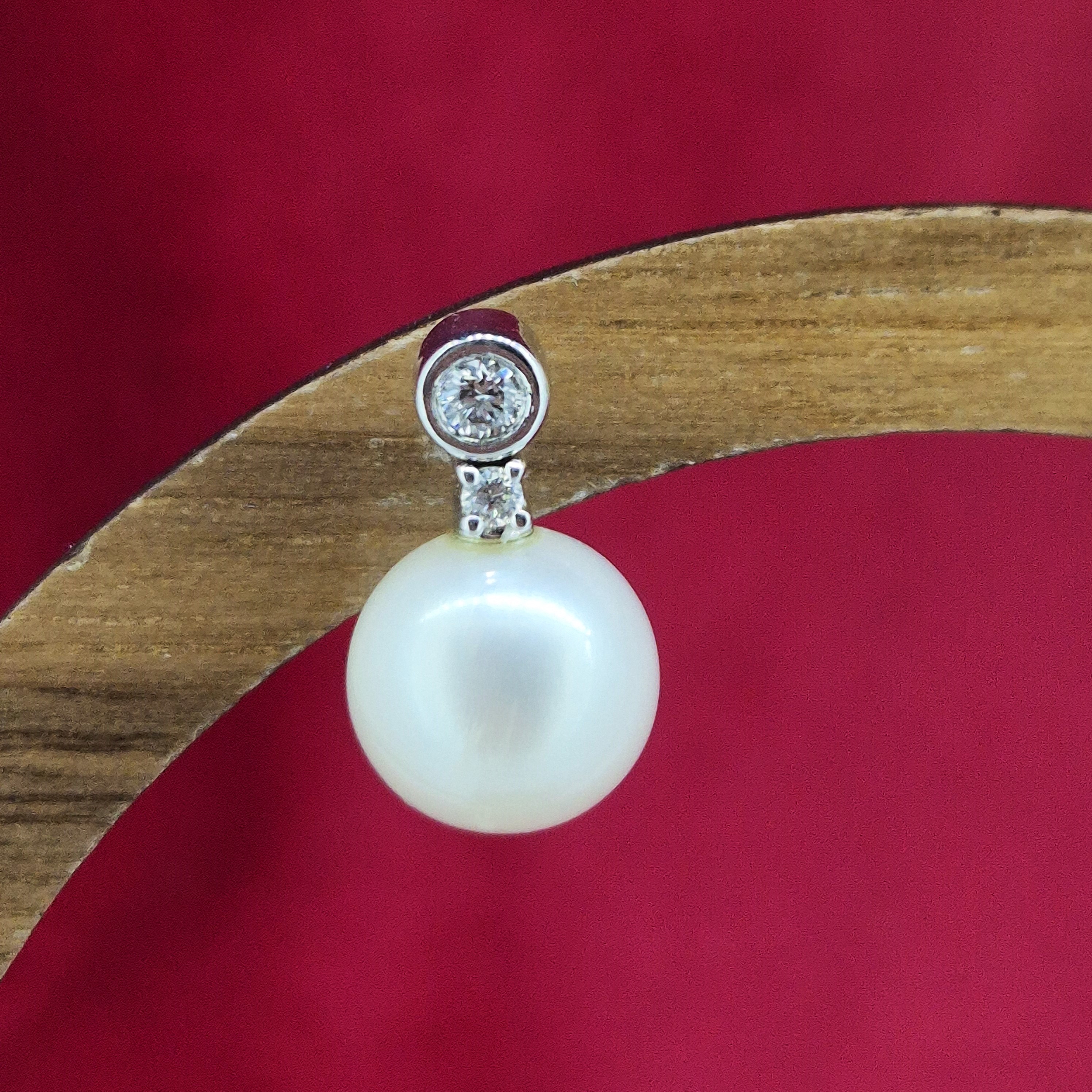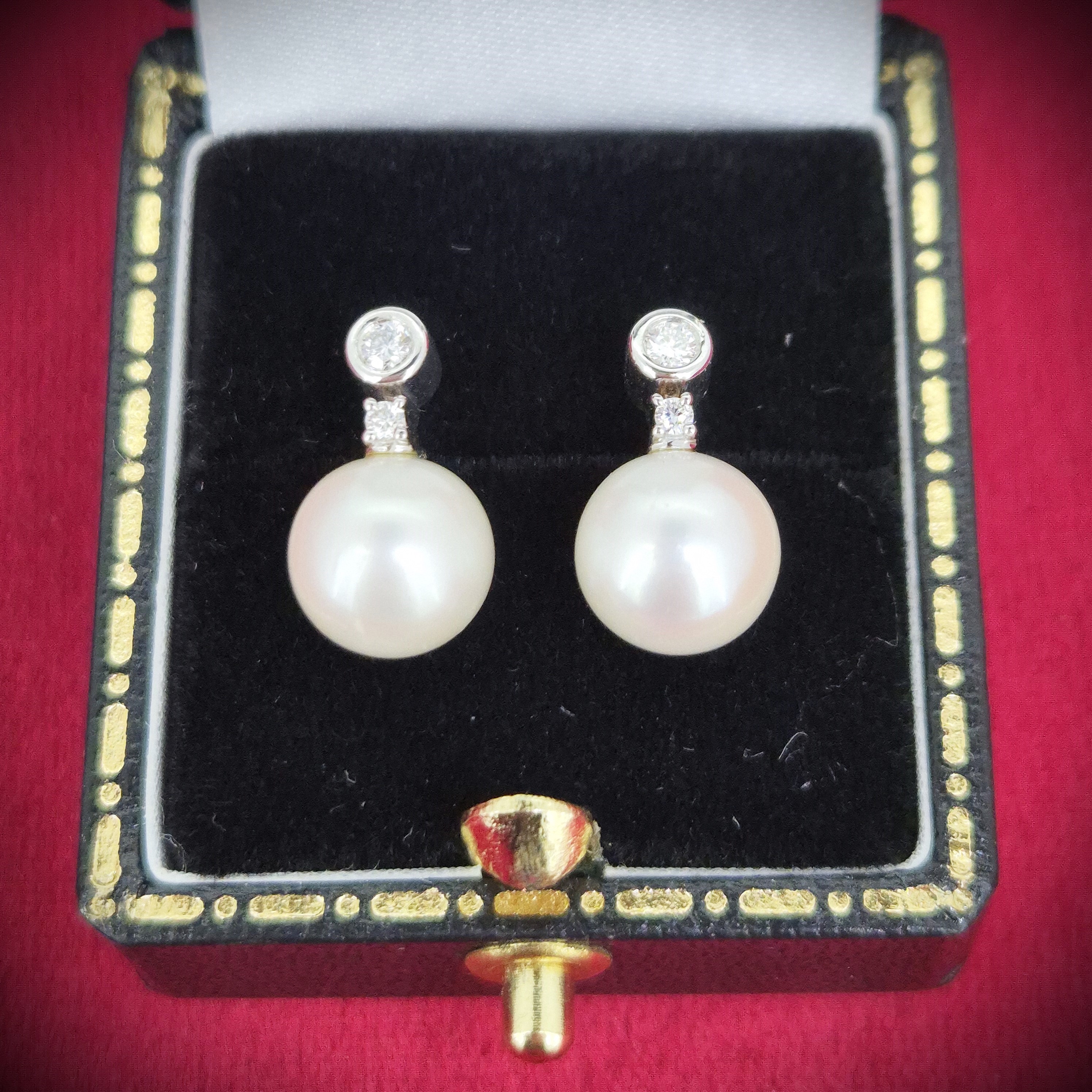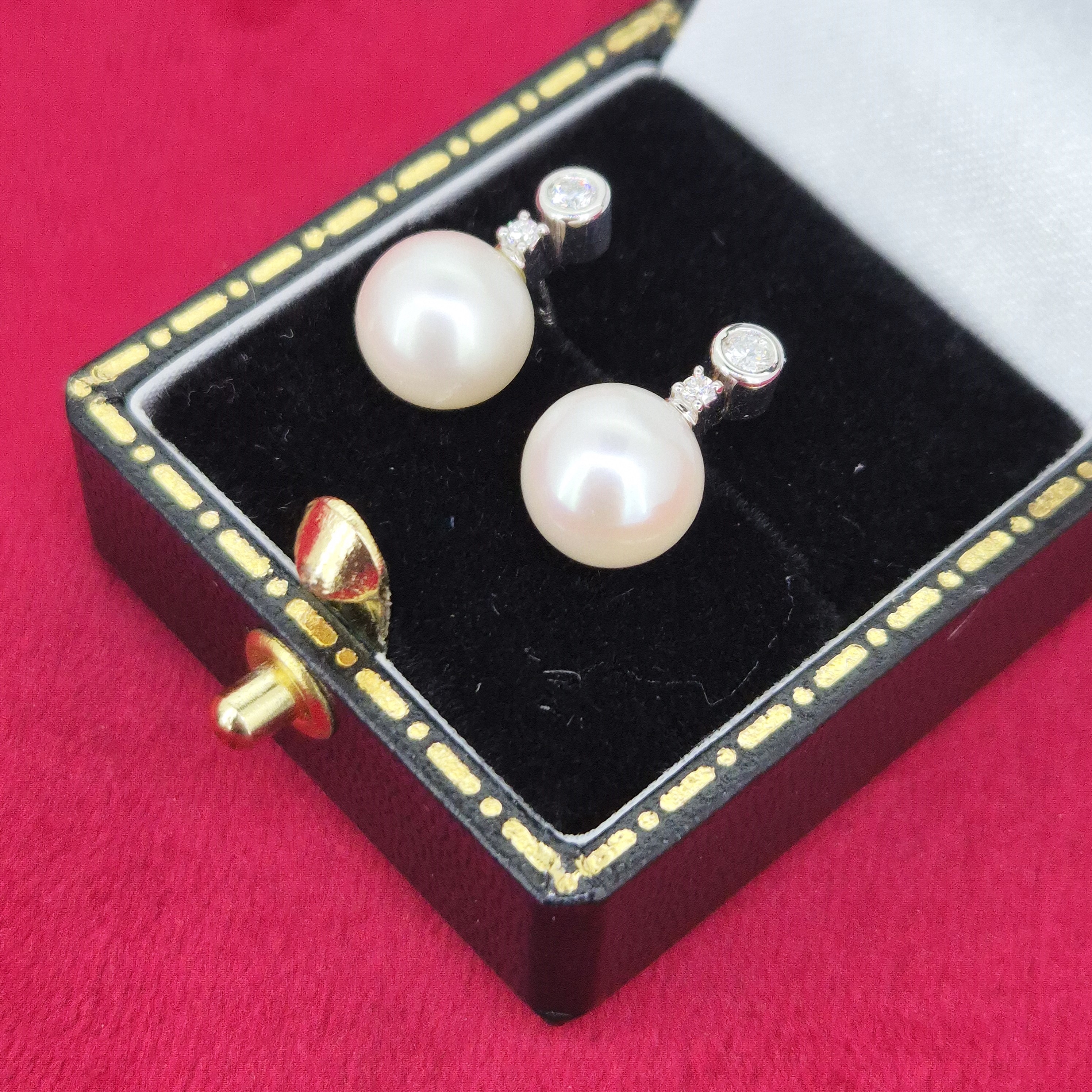 The Pearls measure 8mm in width and are adorned by 2 Round Brilliant Diamonds, one in a claw setting and the one above in a collet setting. The Diamonds weigh 0.10cts in total.
