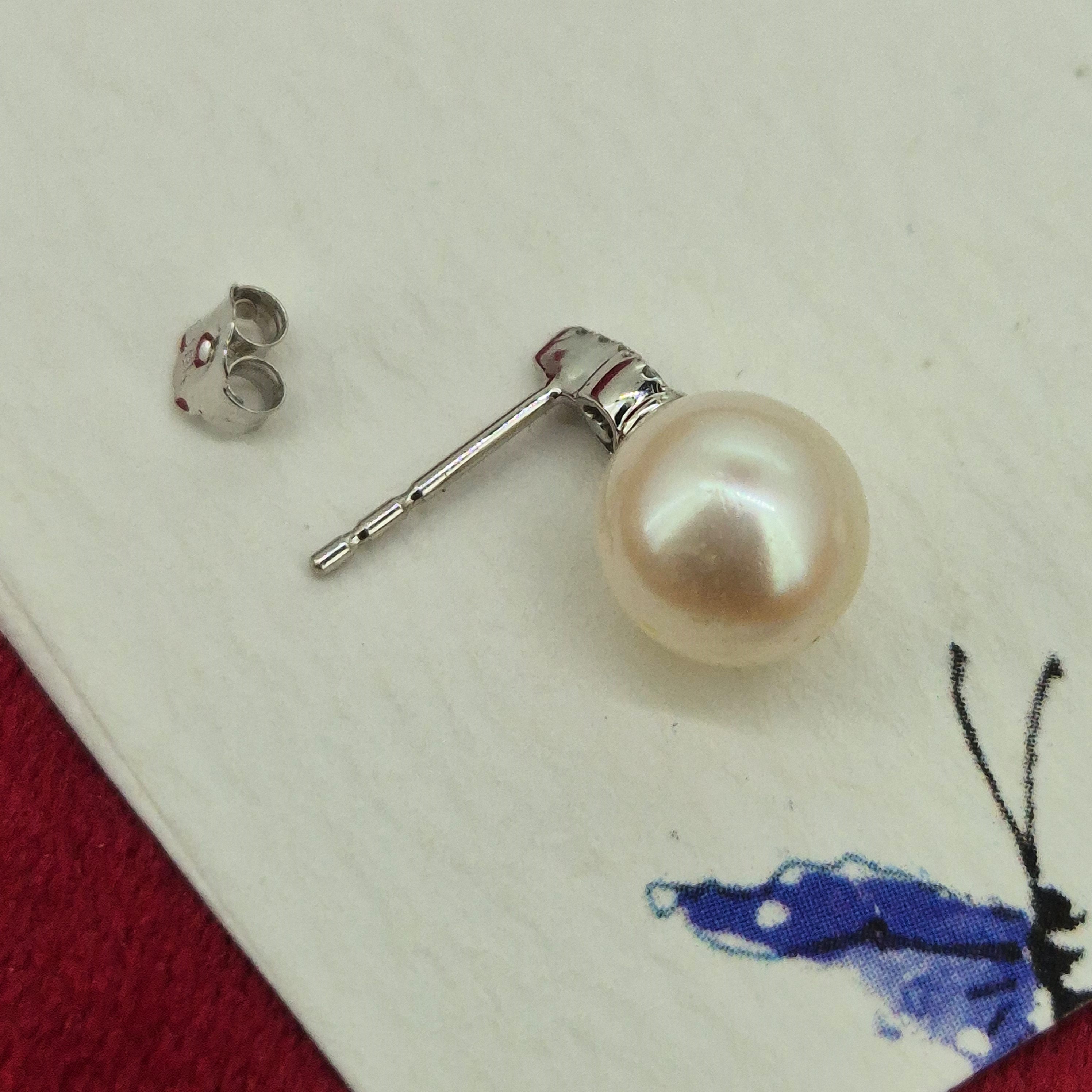 The Pearls measure 8mm in width and have a beautiful pink lustre. They are further detailed by Round Brilliant Diamonds set above that sit flush against the ear. The Diamonds weigh 0.08cts in total.