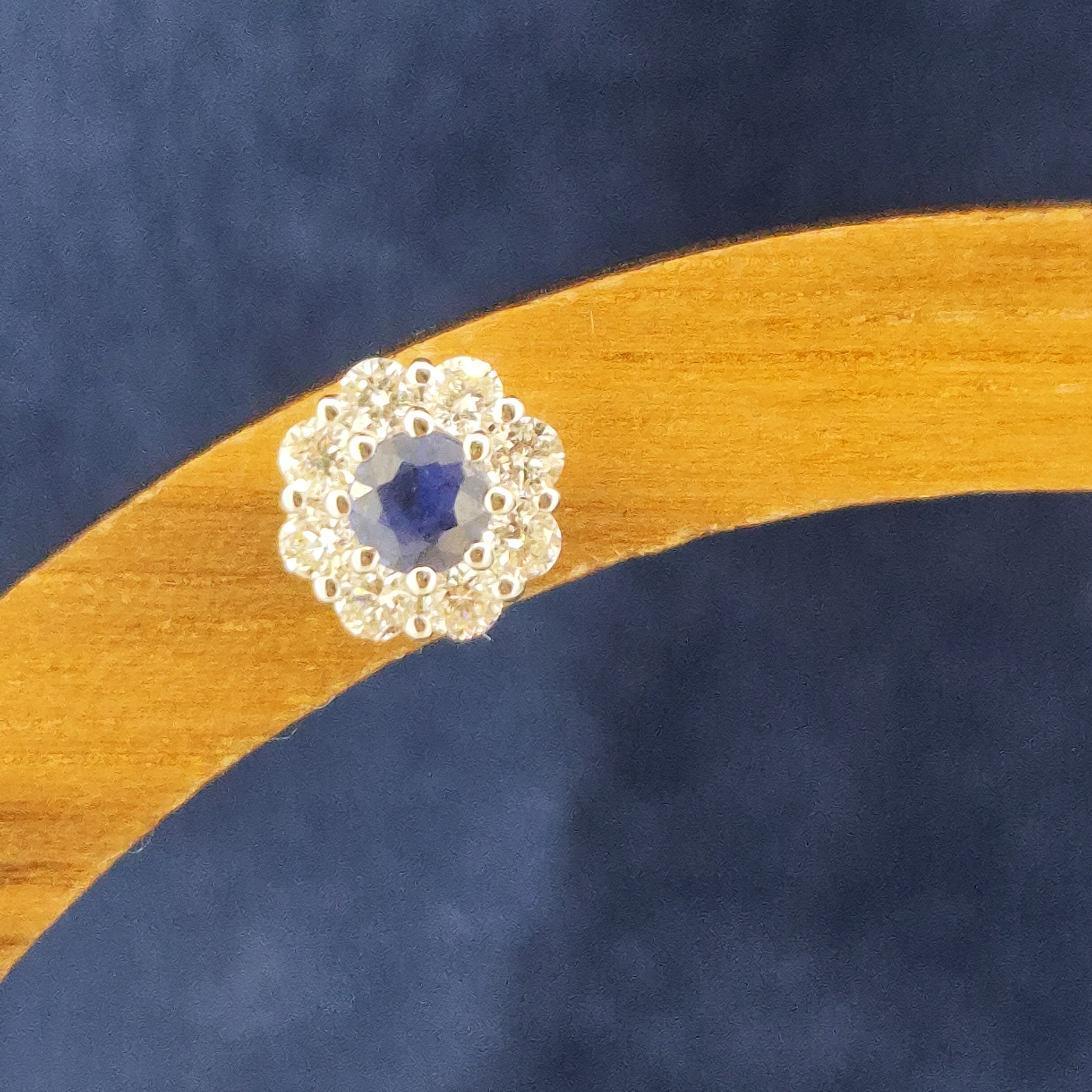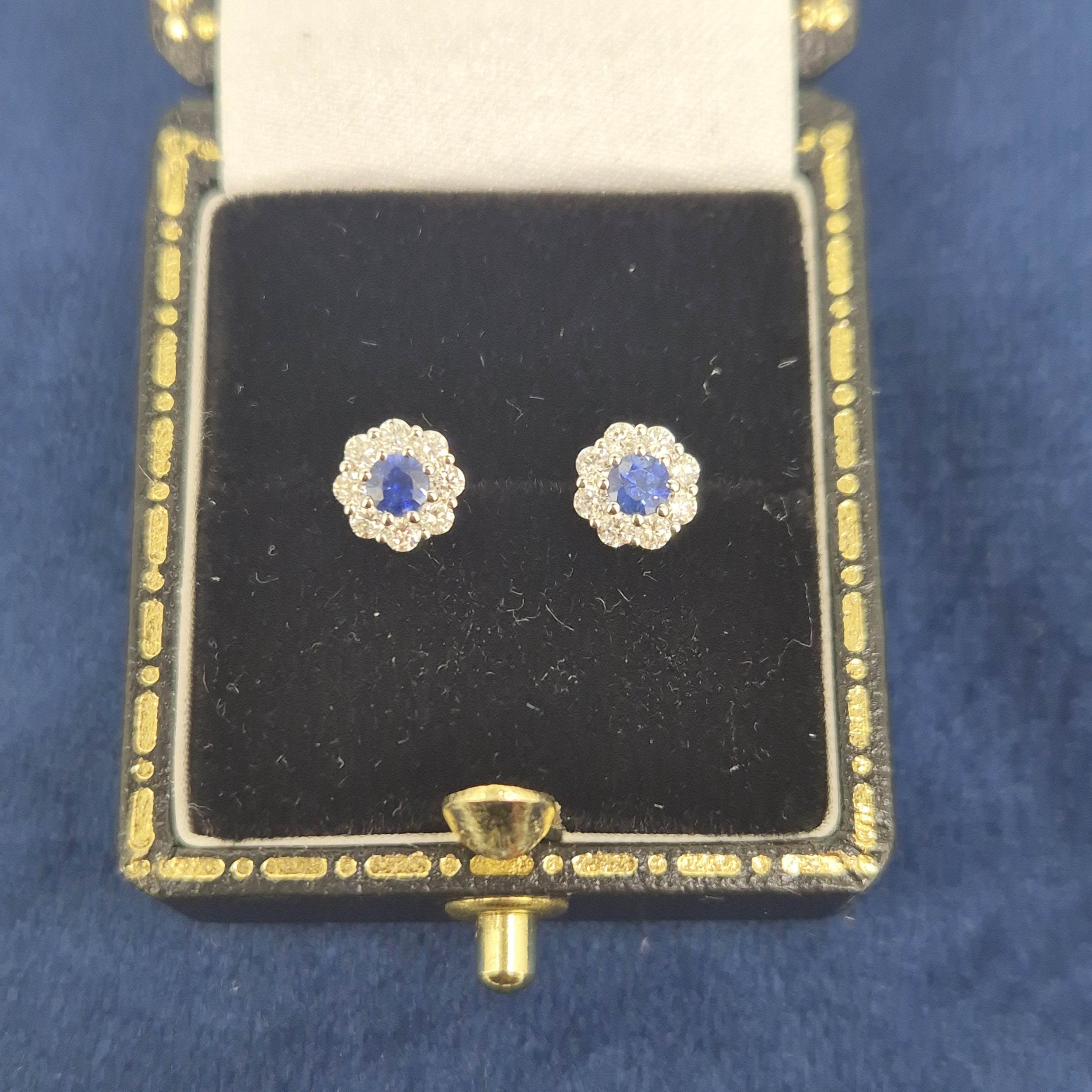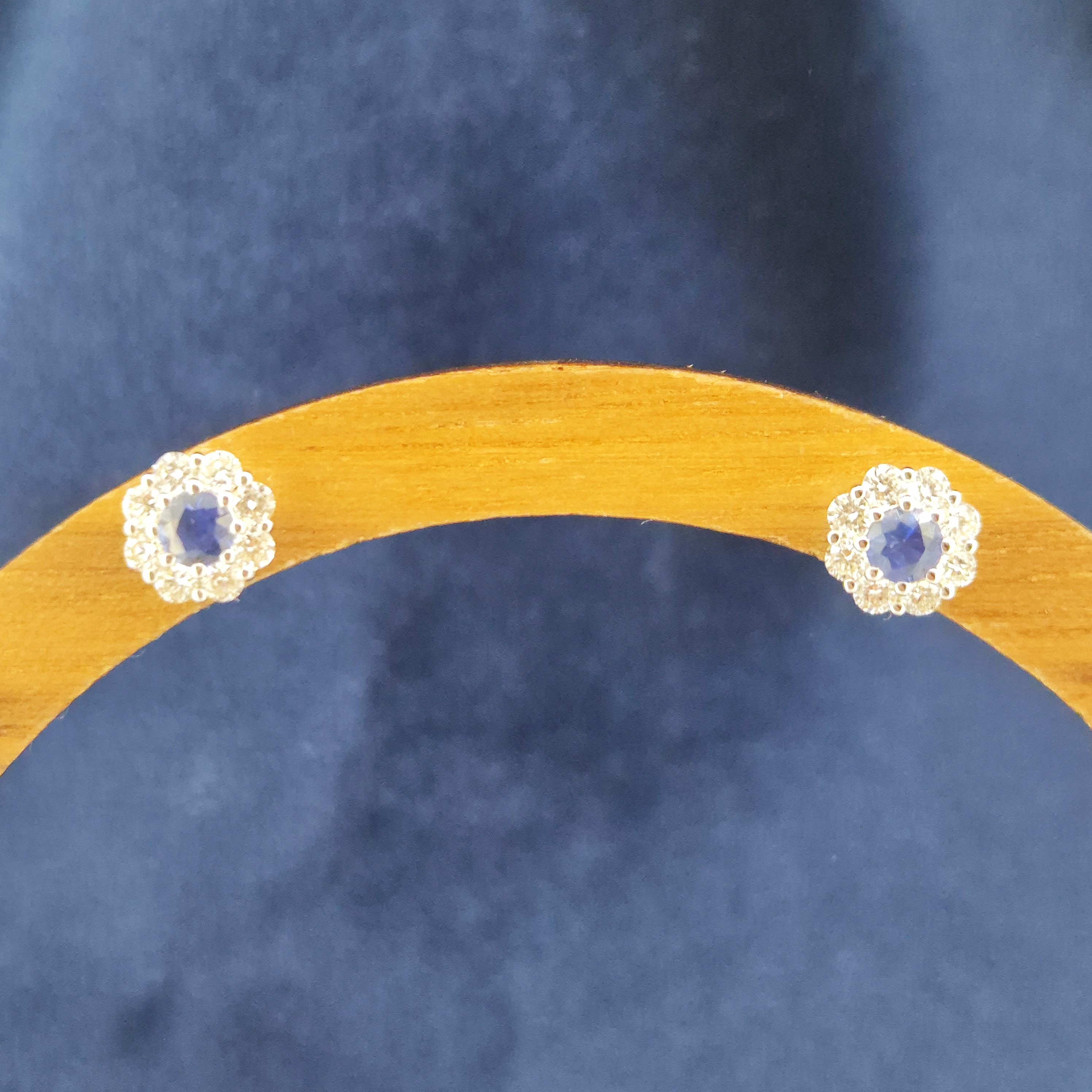 The earrings are set with Round Sapphires in the centre that weigh 0.25cts in total and are surrounded by Round Brilliant Diamonds in a floral setting weighing 0.30cts.