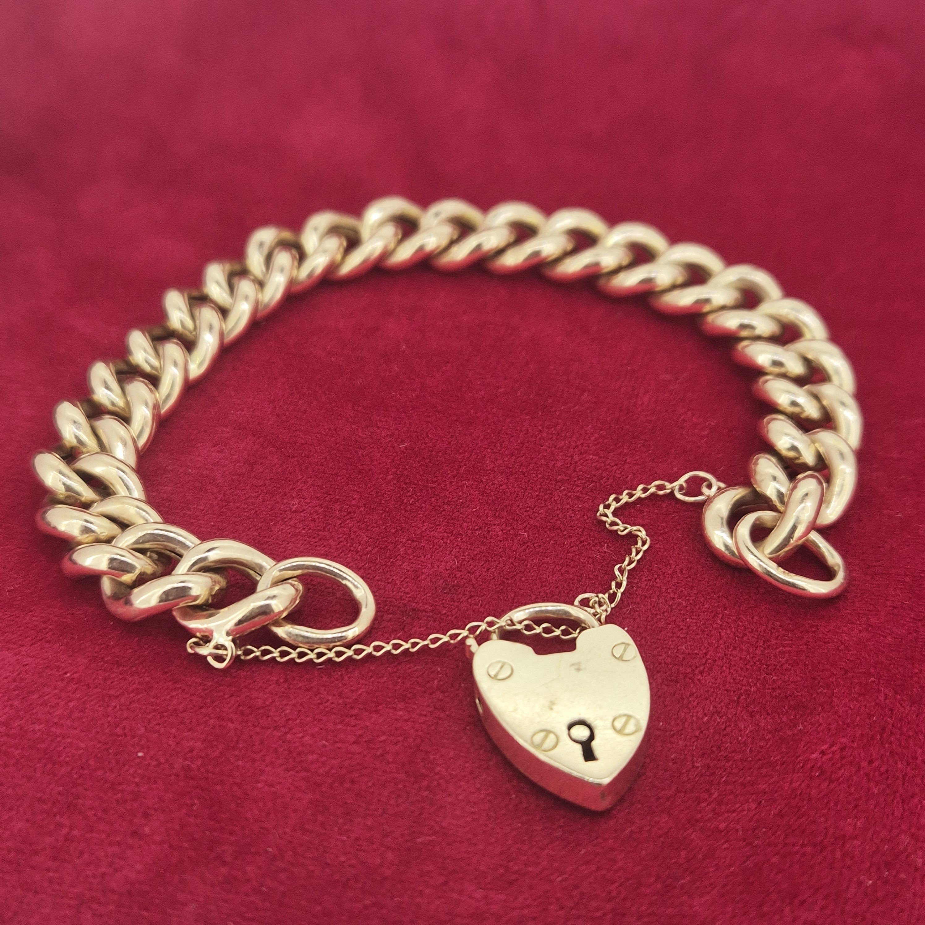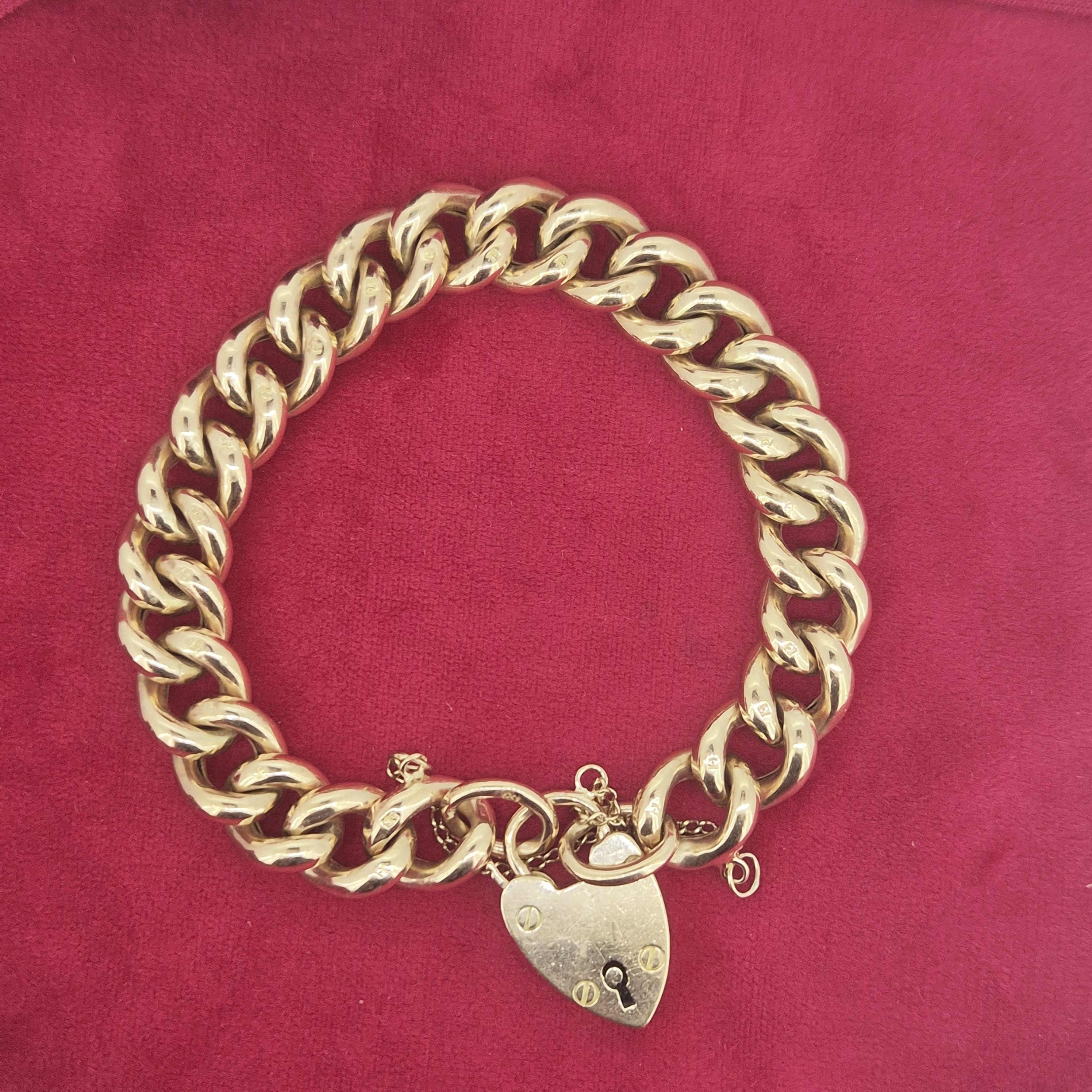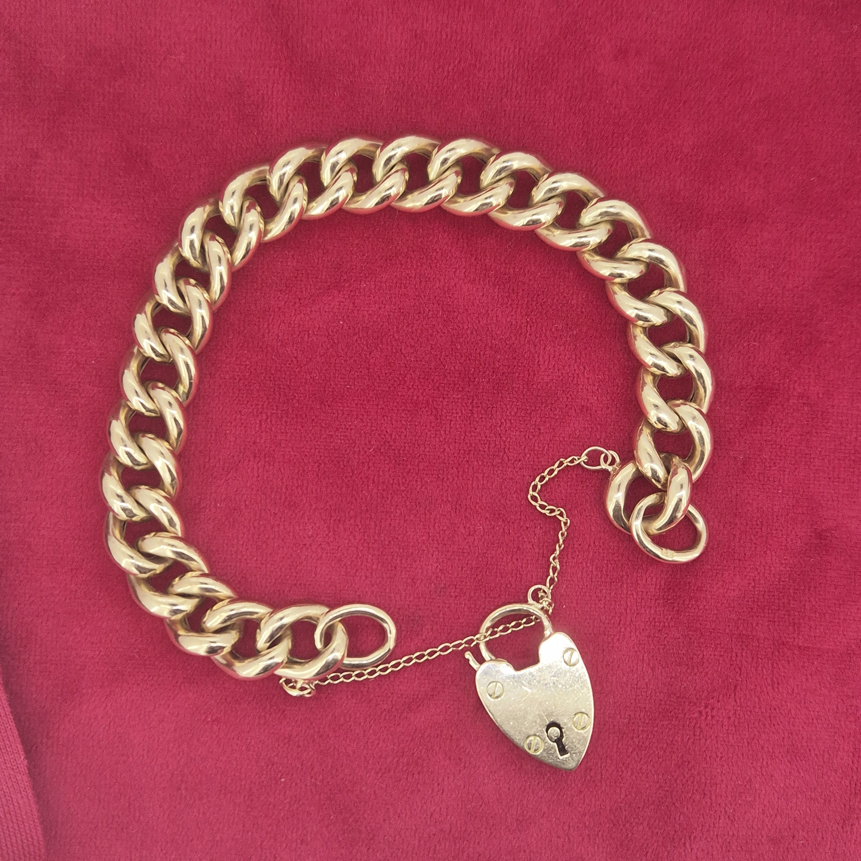 The bracelet features polished, traditional curb links that measure 11mm in width. These links are all individually stamped and are secured using a plain heart padlock and safety chain.