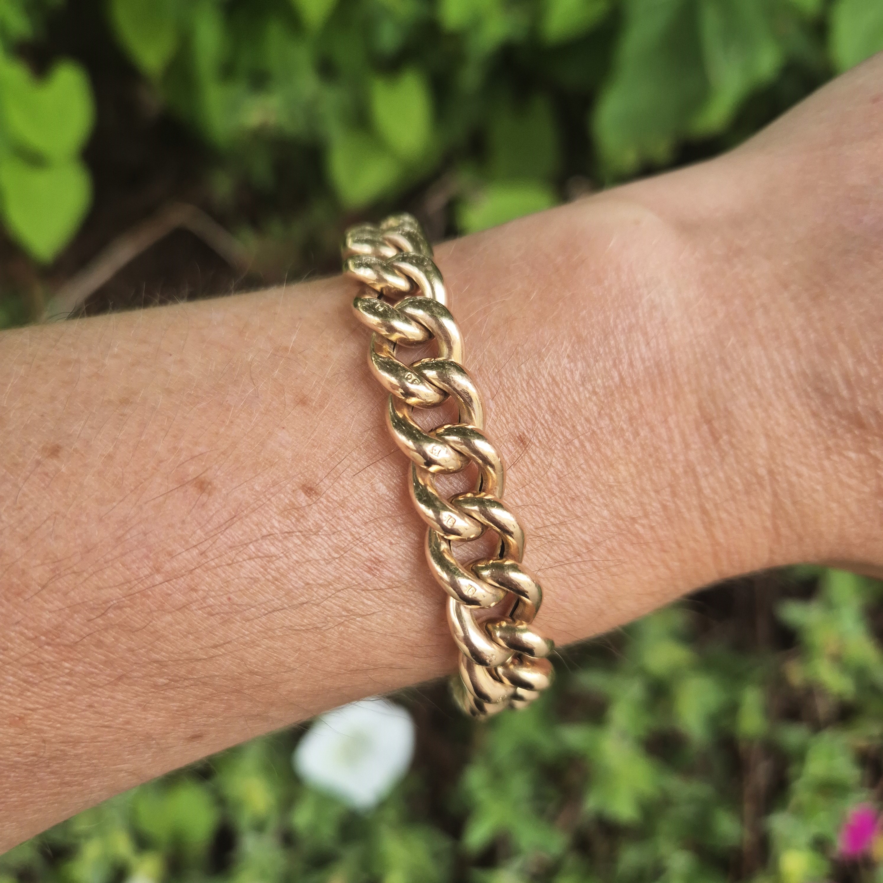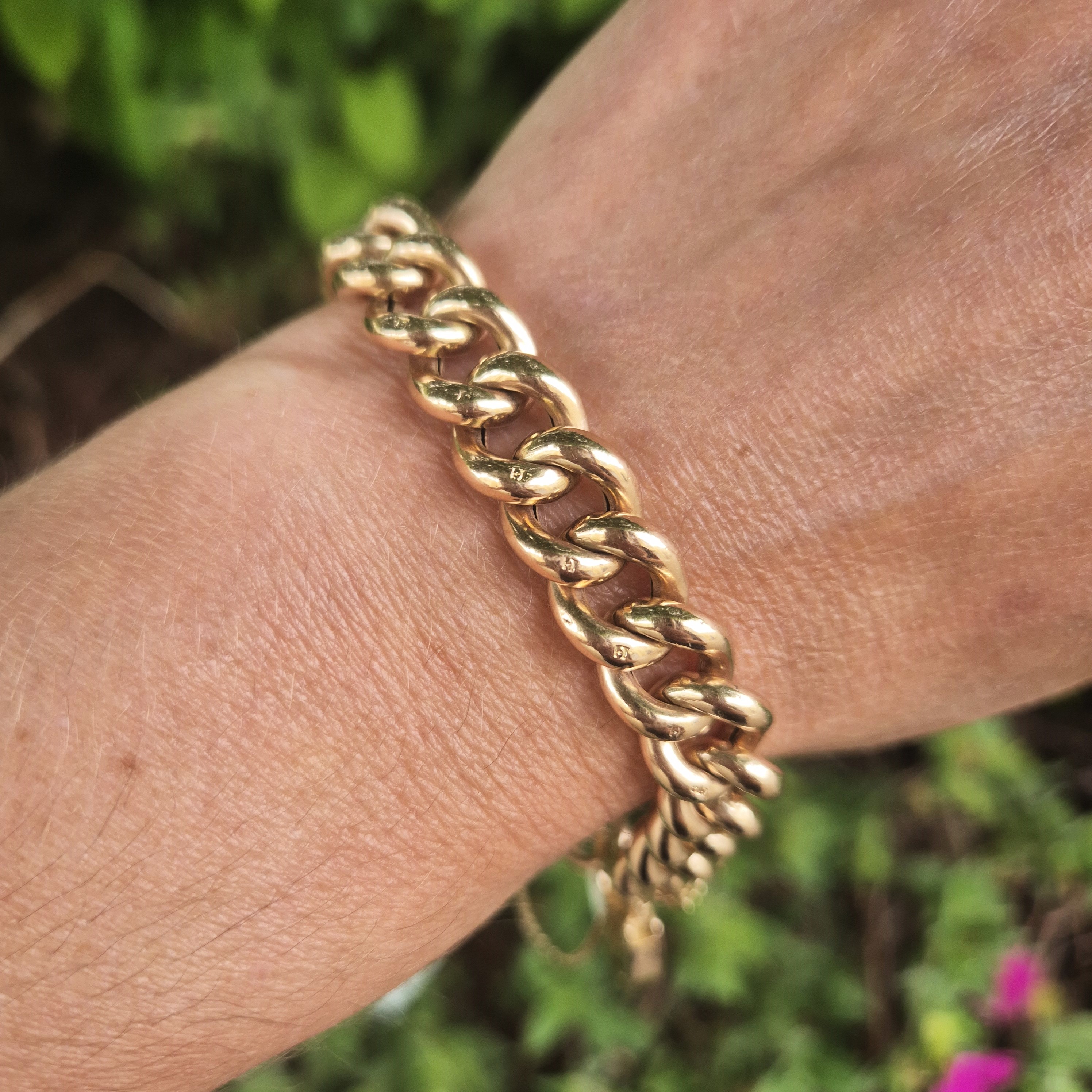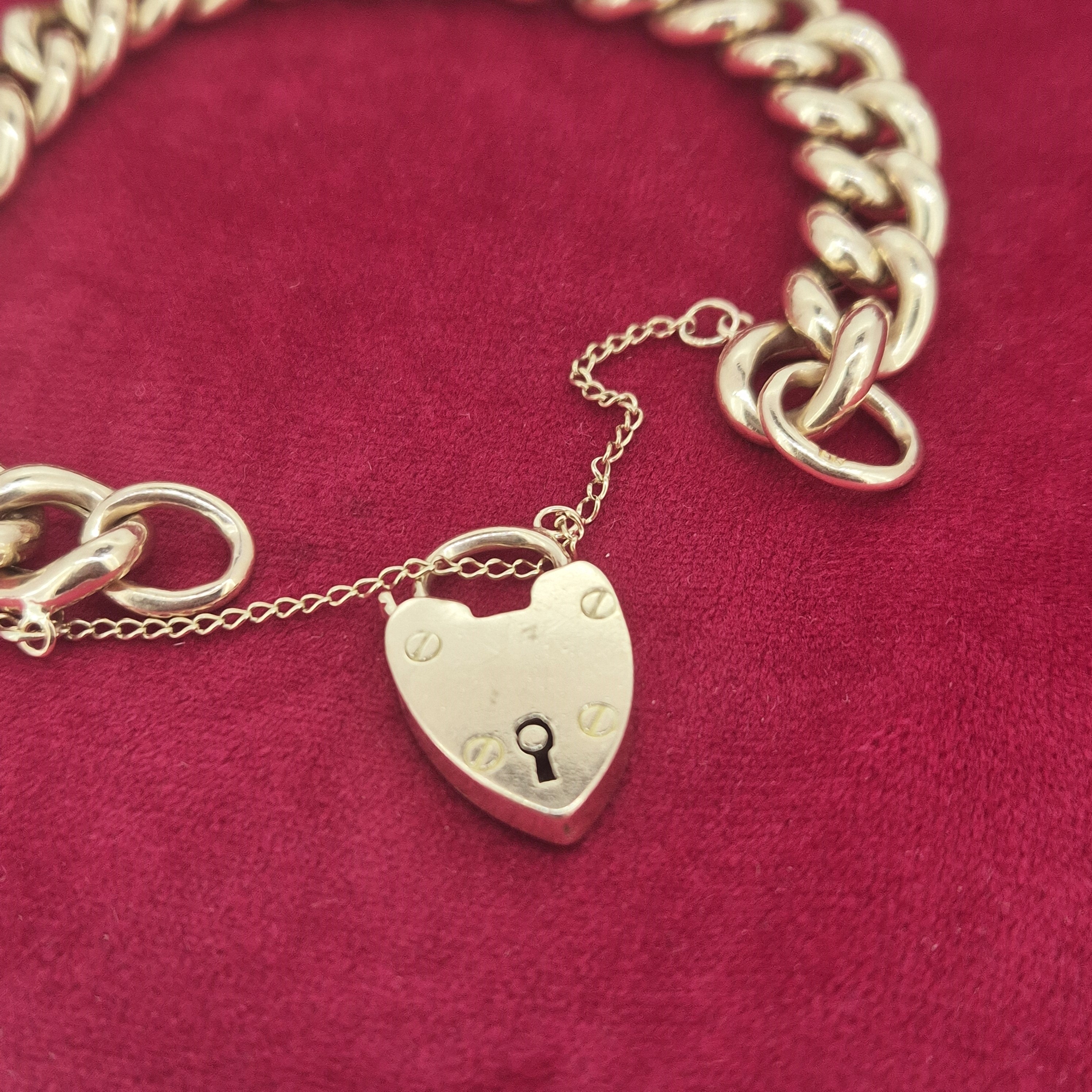 The bracelet features polished, traditional curb links that measure 11mm in width. These links are all individually stamped and are secured using a plain heart padlock and safety chain.