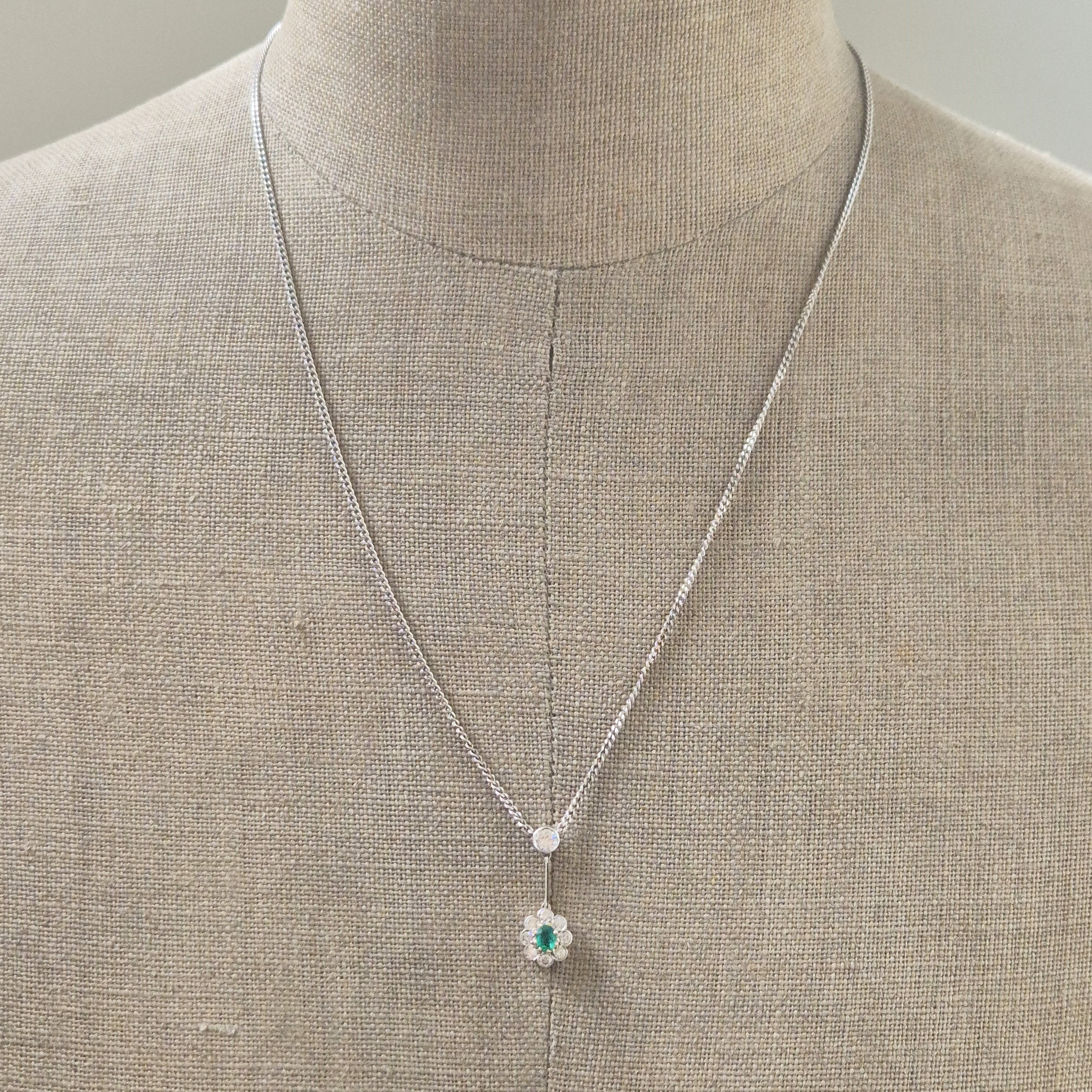 The pedant features a vibrant Oval Emerald in the centre that measures 5mm by 3mm. This Emerald is surrounded by Round Brilliant Diamonds set in a daisy cluster design that weigh 0.25cts. This part of the pendant drops from the top of the pendant which has a Round Brilliant Diamond set in a rub-over setting. This Diamond weighs 0.20cts making the total carat weight 0.45ct.