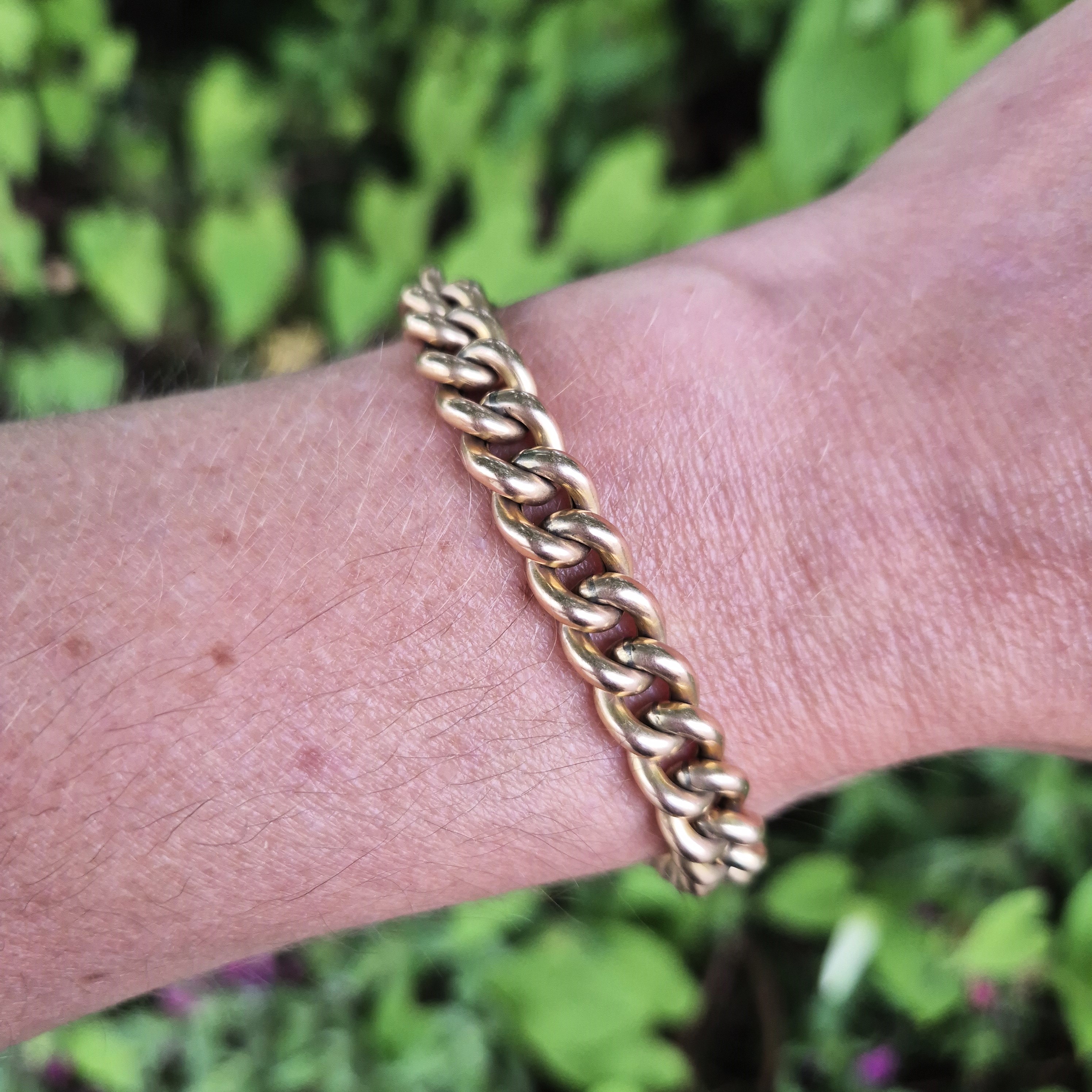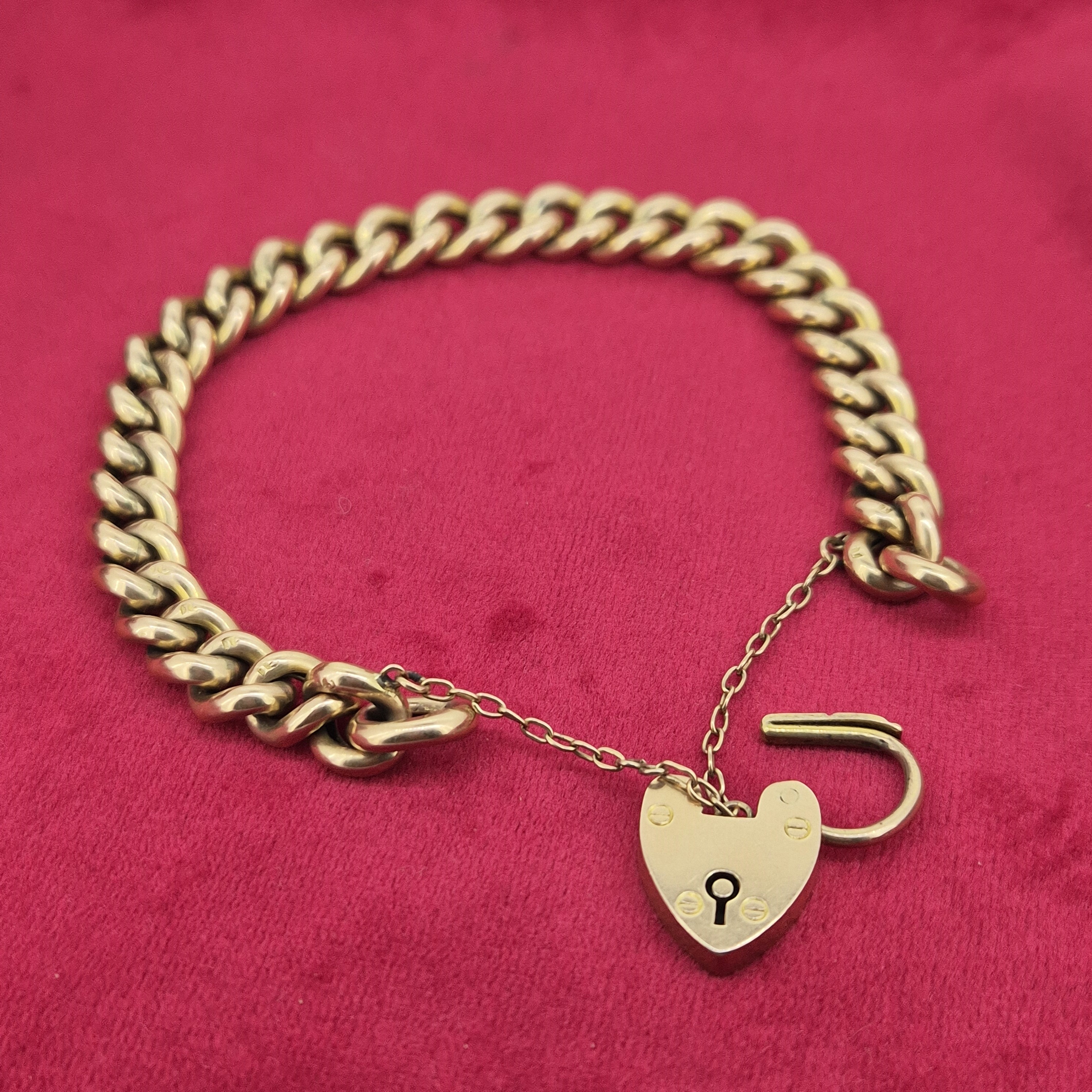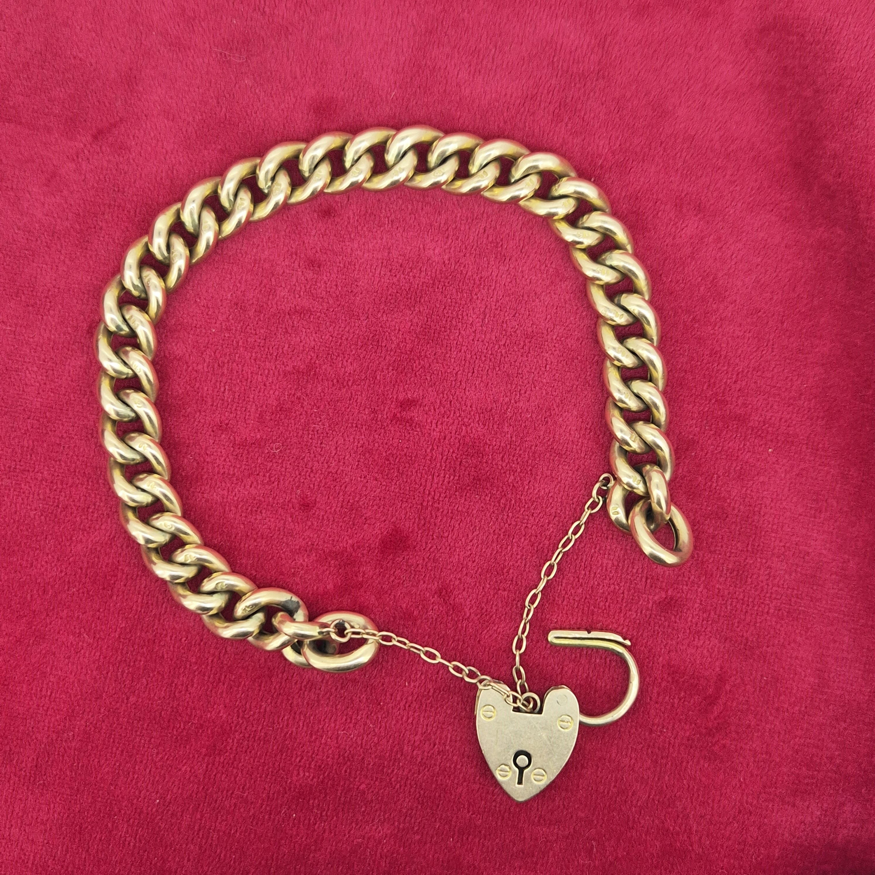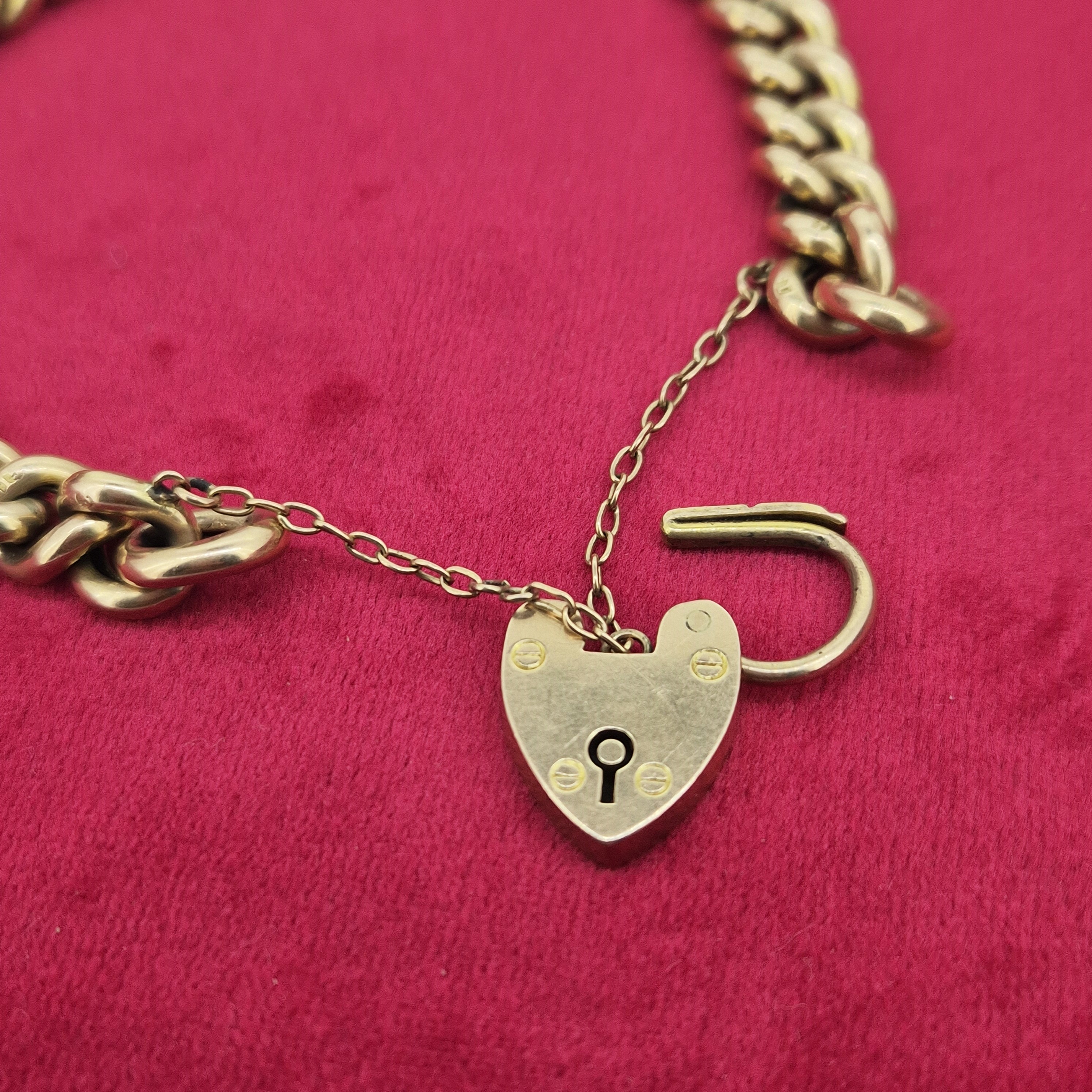 The bracelet features Traditional Curb links that are all individually stamped and measure 8.5mm in width. It is fitted with a plain heart padlock and safety chain for security.