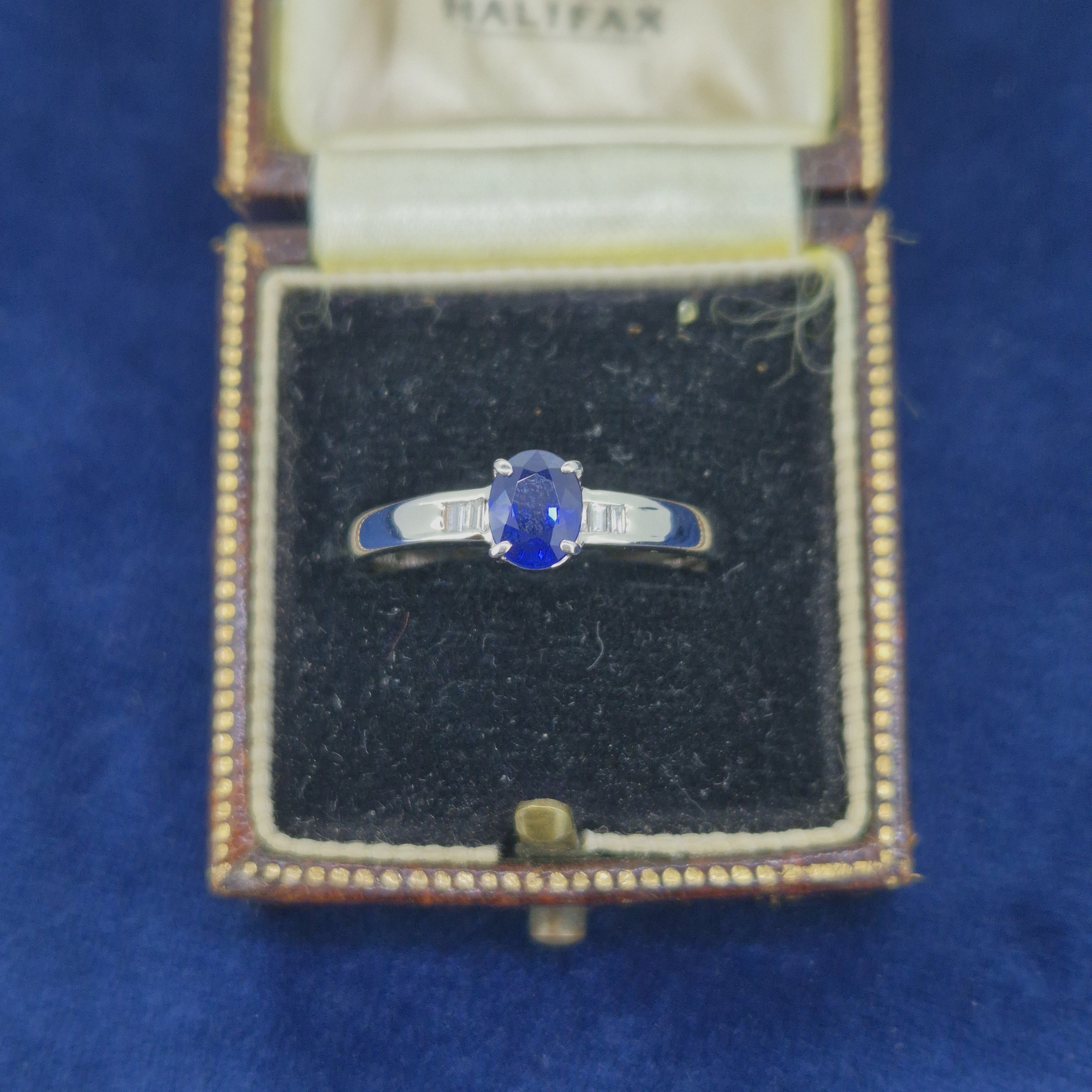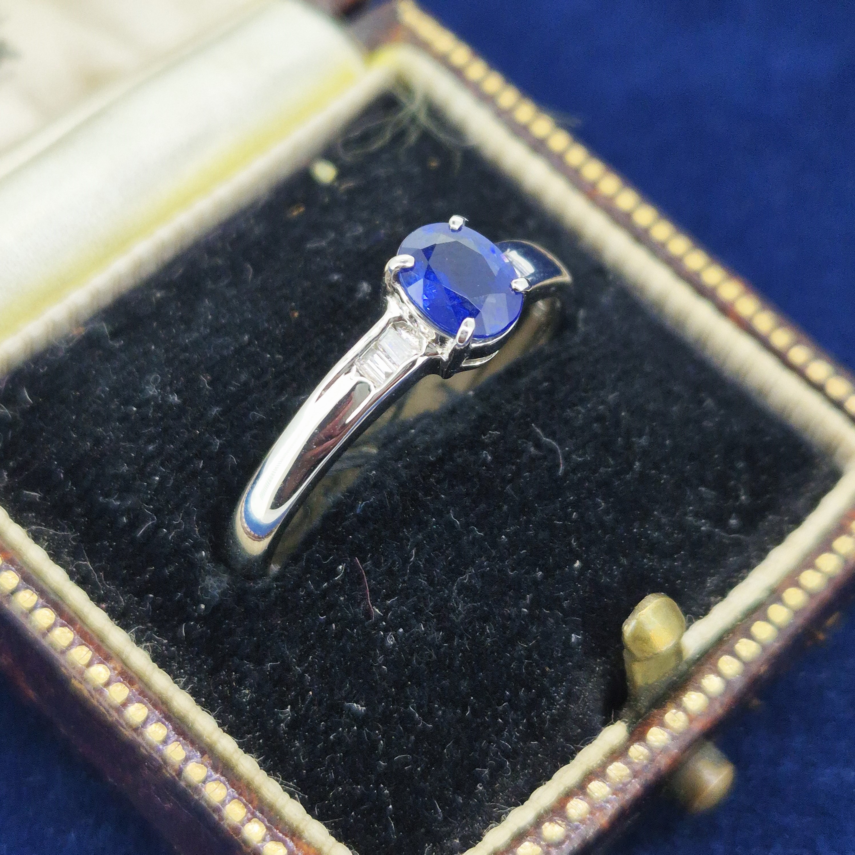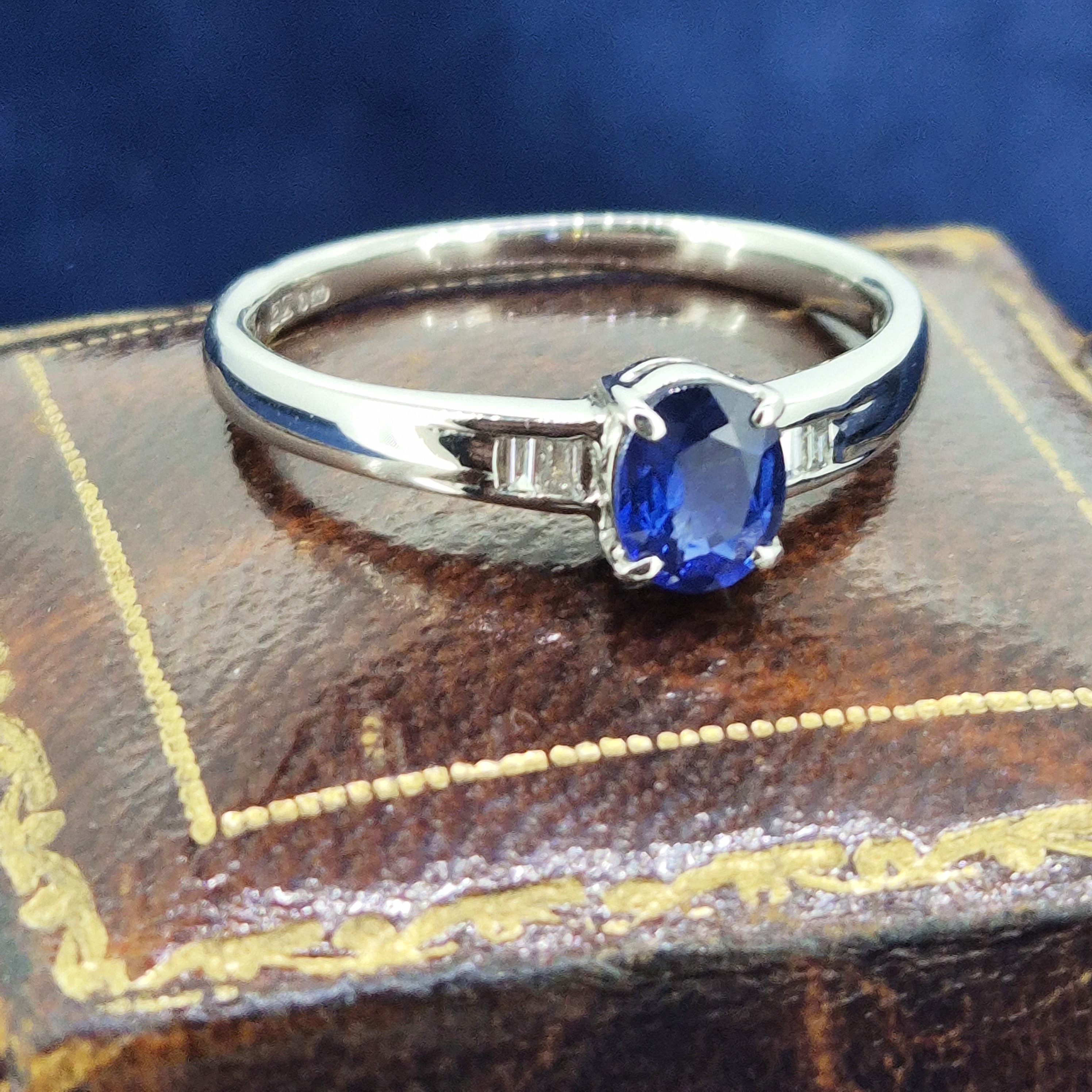 The ring features a central Oval Sapphire that is a lovely deep blue and weighs 0.70cts. The Sapphire is set an an open four claw setting and is further details by two Baguette Cut Diamonds either side that are channel set and weigh 0.05cts in total.