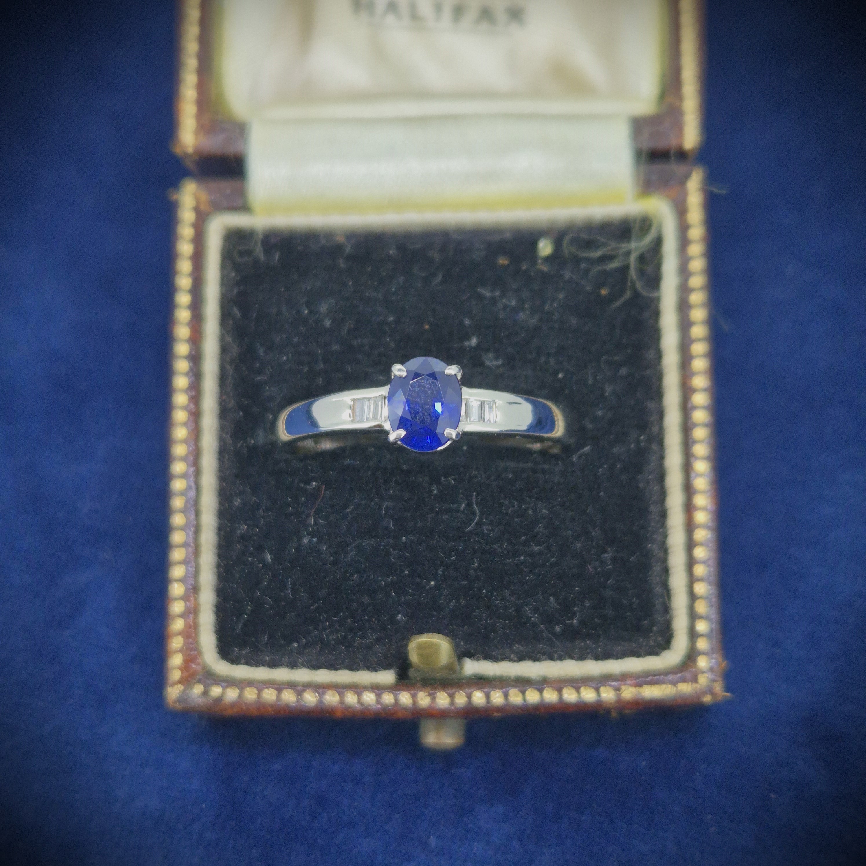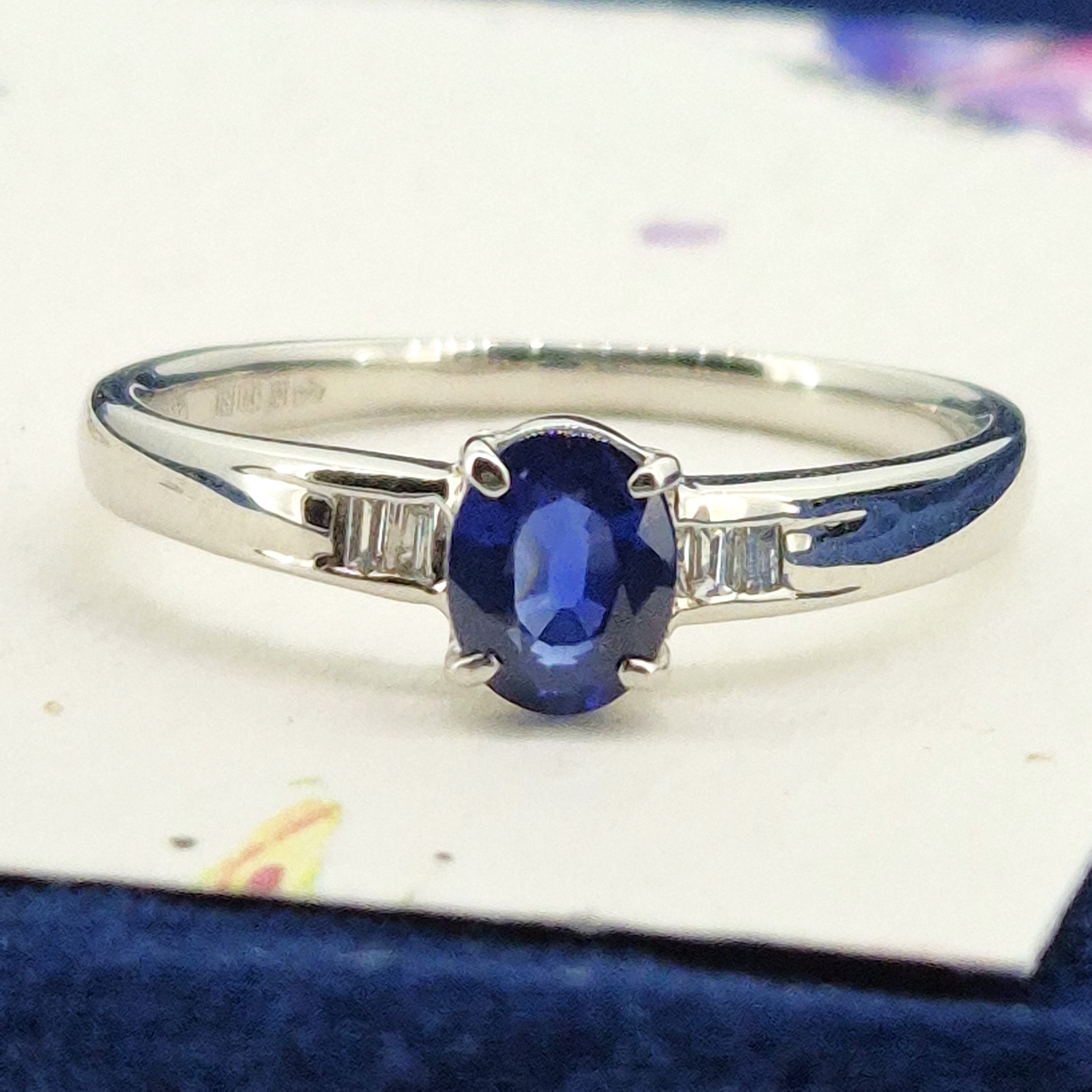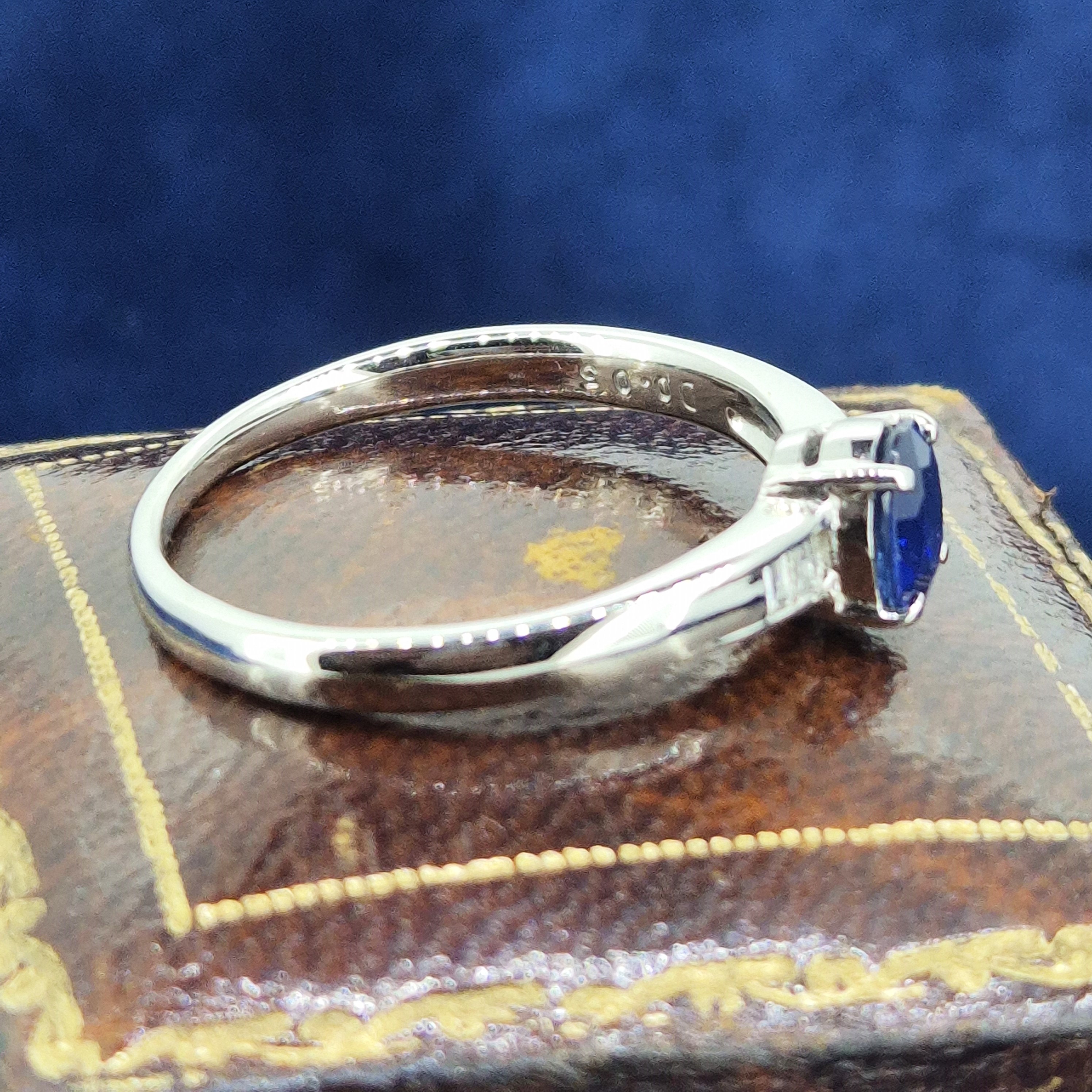 The ring features a central Oval Sapphire that is a lovely deep blue and weighs 0.70cts. The Sapphire is set an an open four claw setting and is further details by two Baguette Cut Diamonds either side that are channel set and weigh 0.05cts in total.