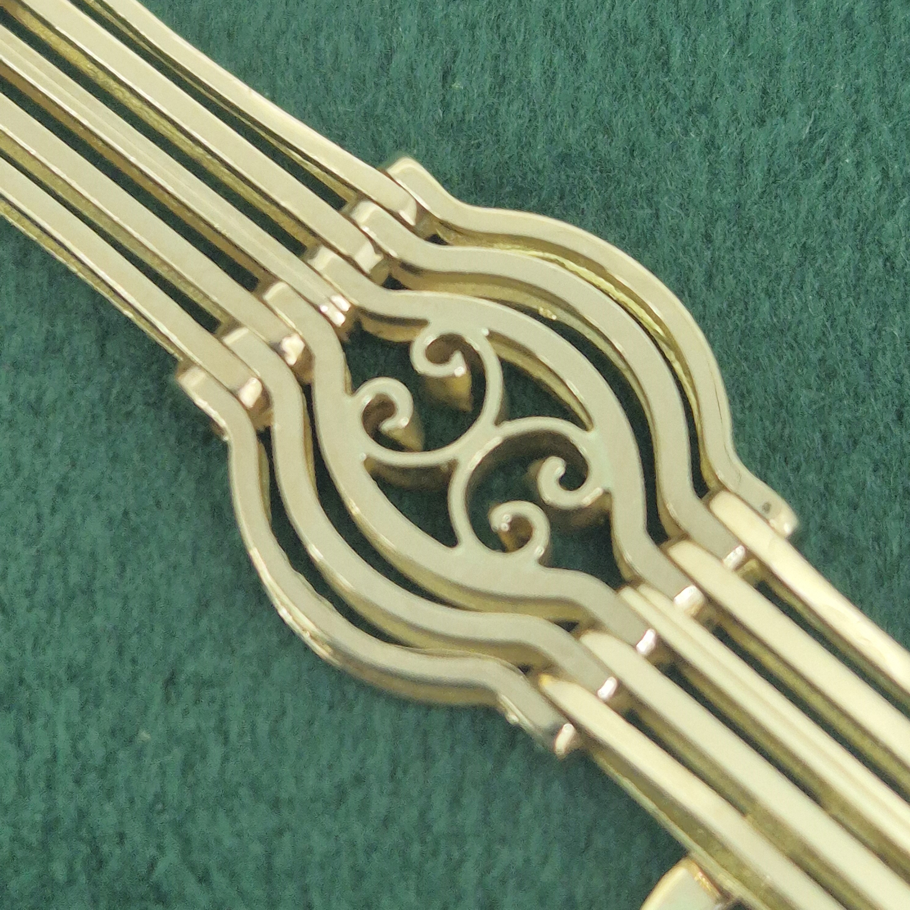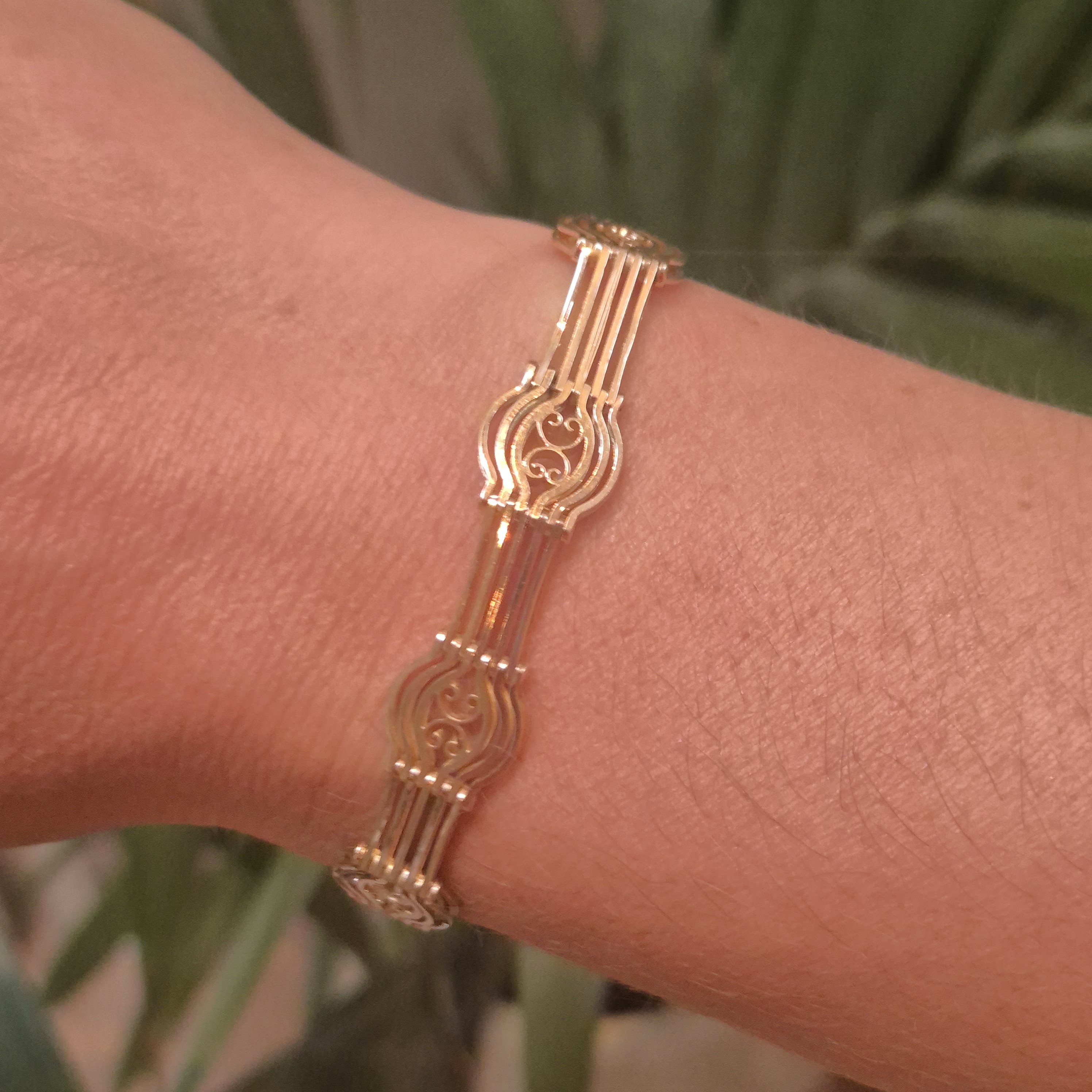 The bracelet is wonderfully detailed with scroll work surrounded by oval links that are then separated by bars links in-between.