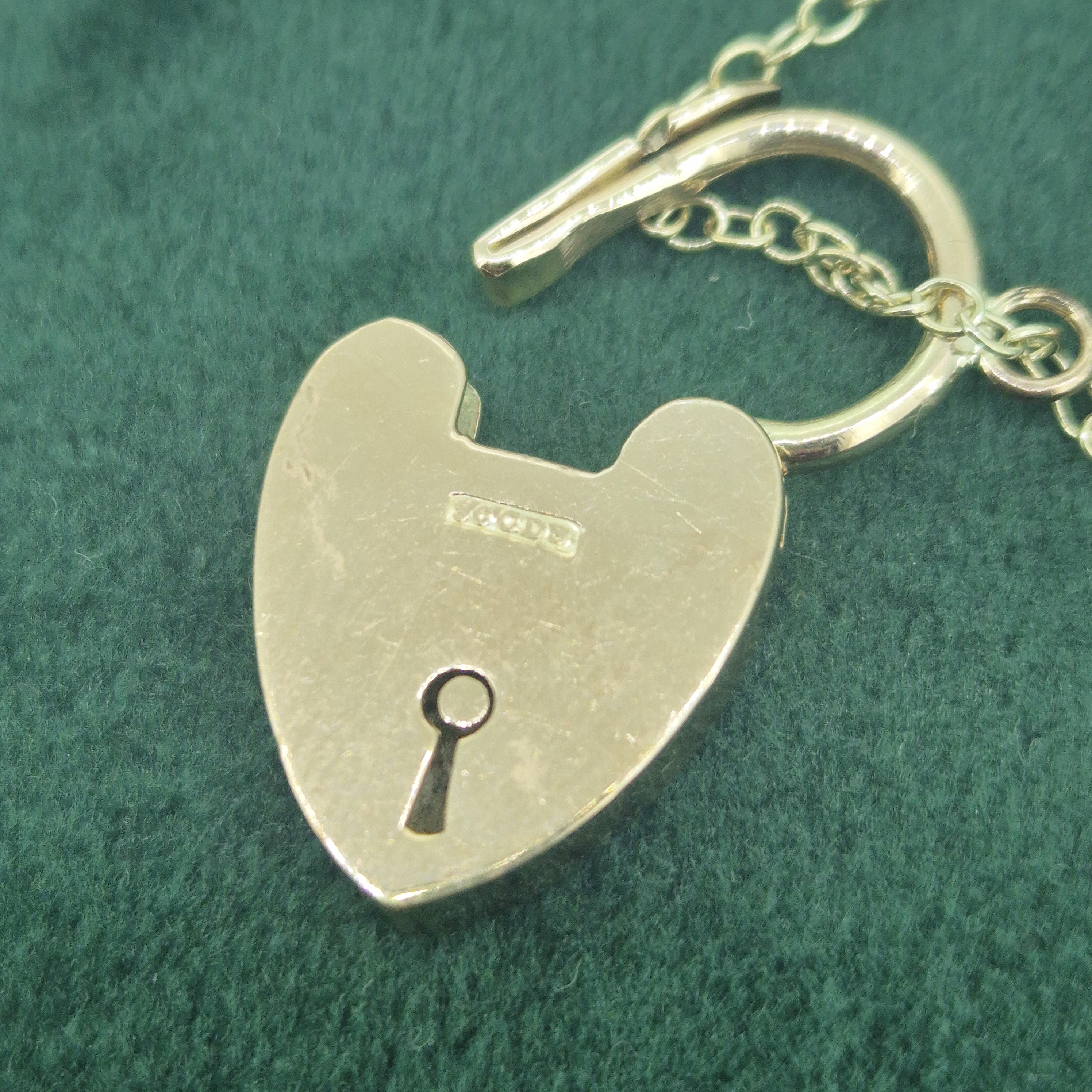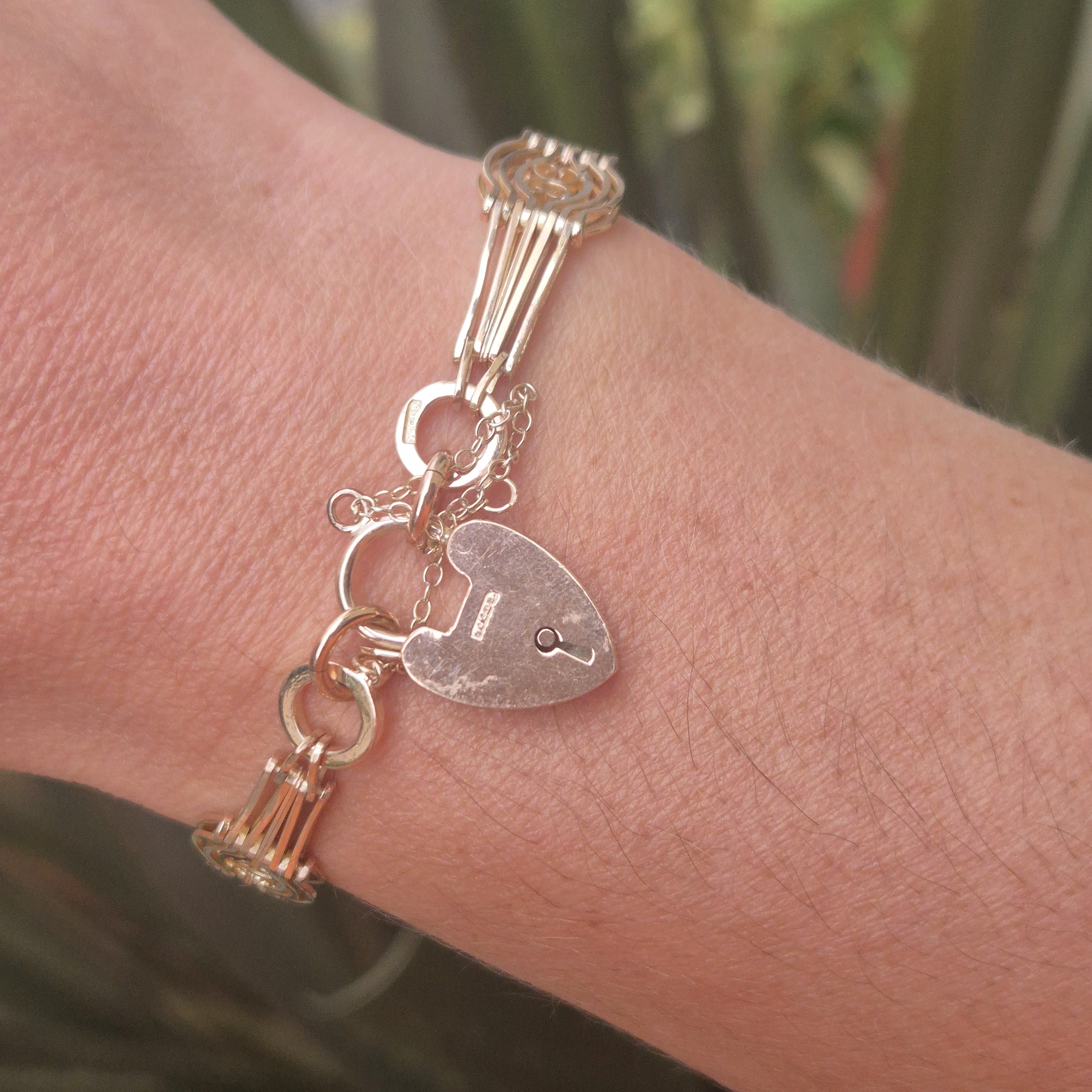 This bracelet measures 11mm in width at it's widest point and weighs 14.2 grams. It will fit an 18cm wrist and is secured using a heart padlock and safety chain.