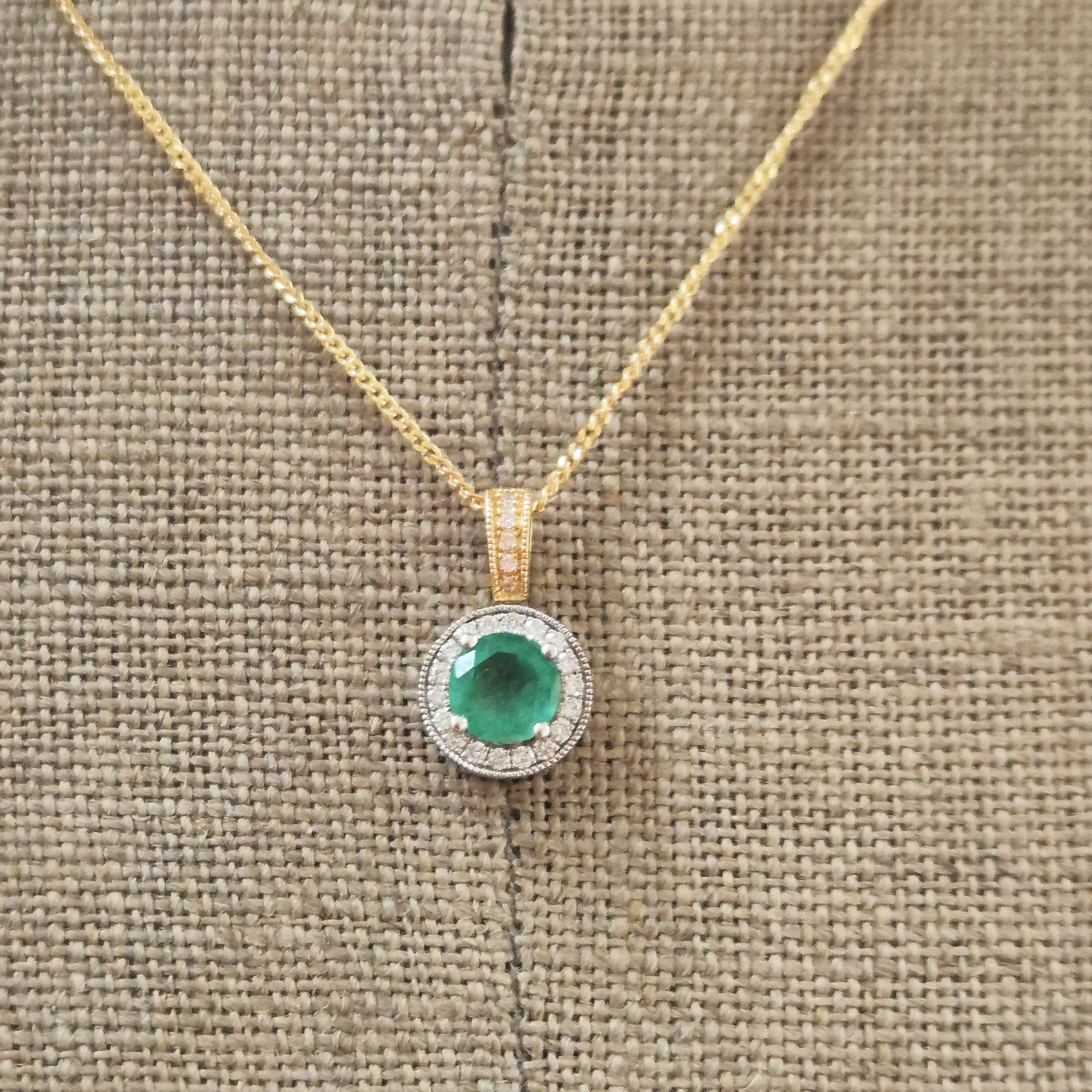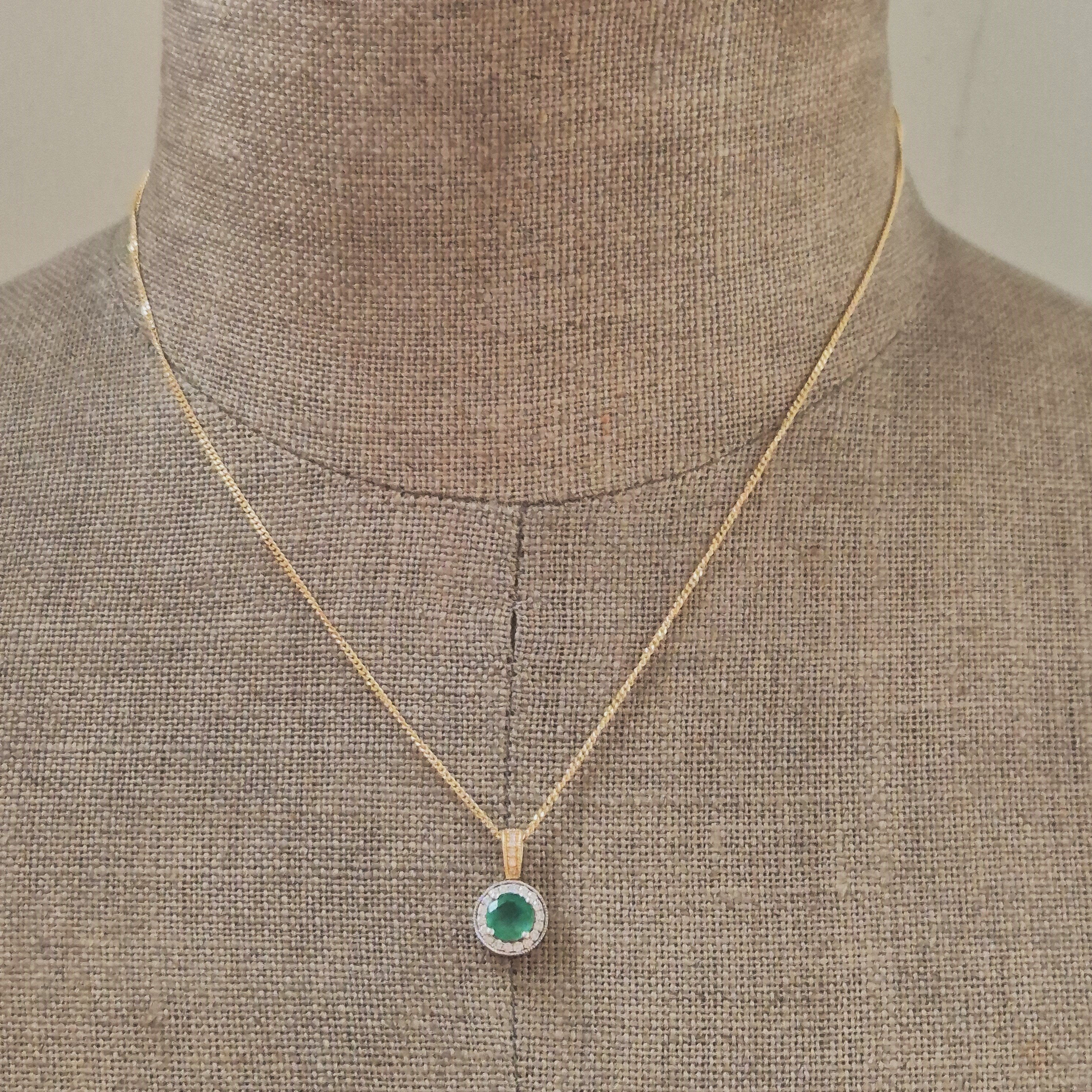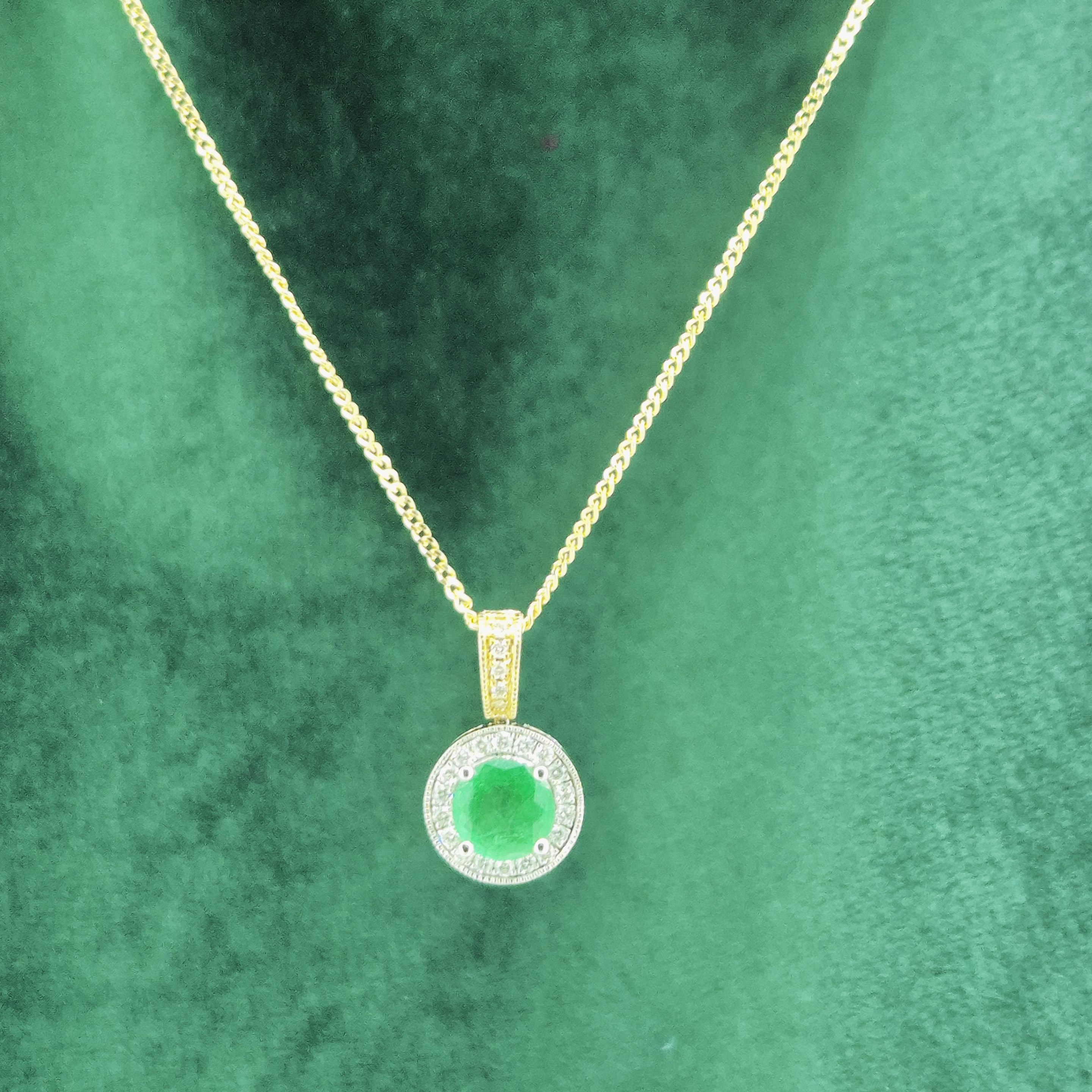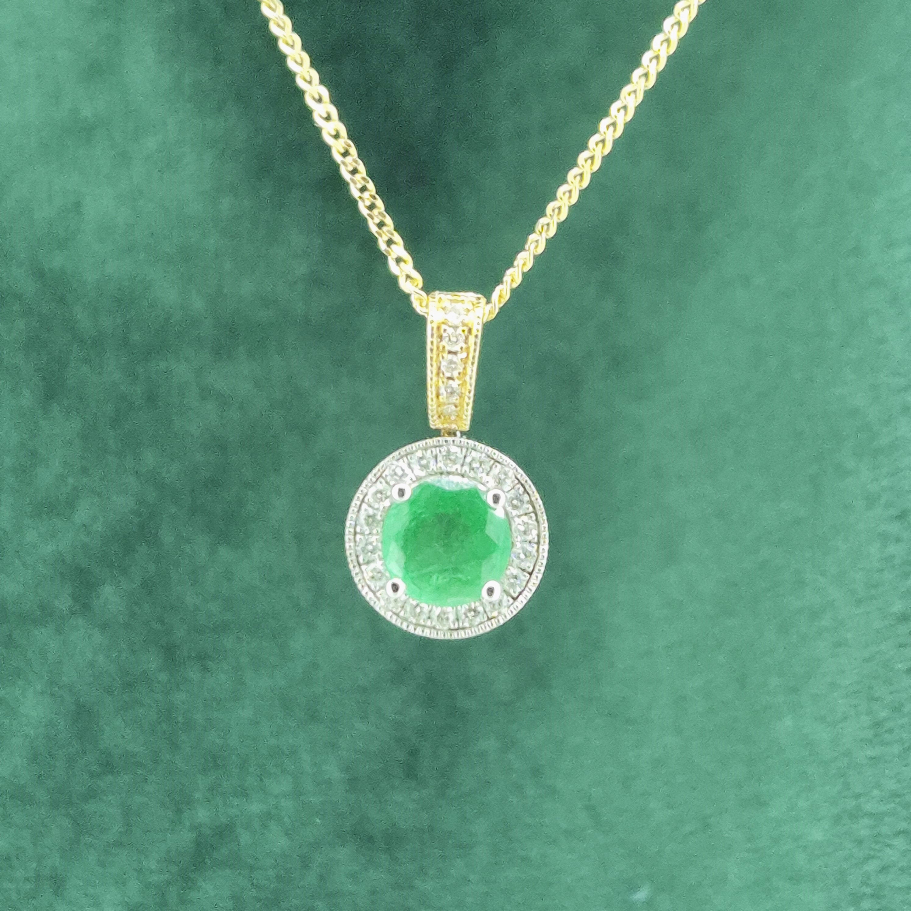 The pendant is set with a Central Round Emerald that weighs 0.80cts. The Emerald is surrounded by sparkly Round Brilliant Diamonds that weigh 0.18cts in total.
