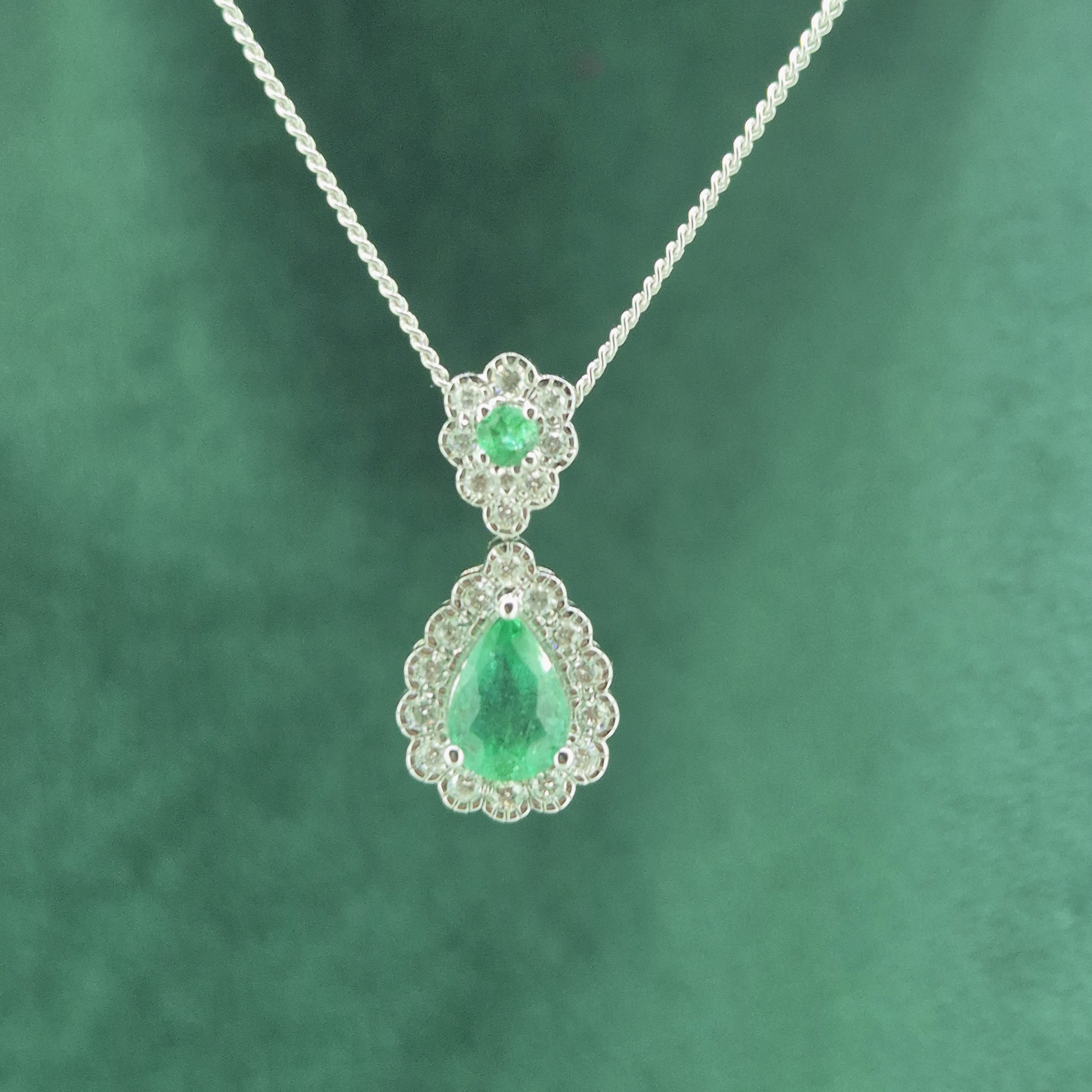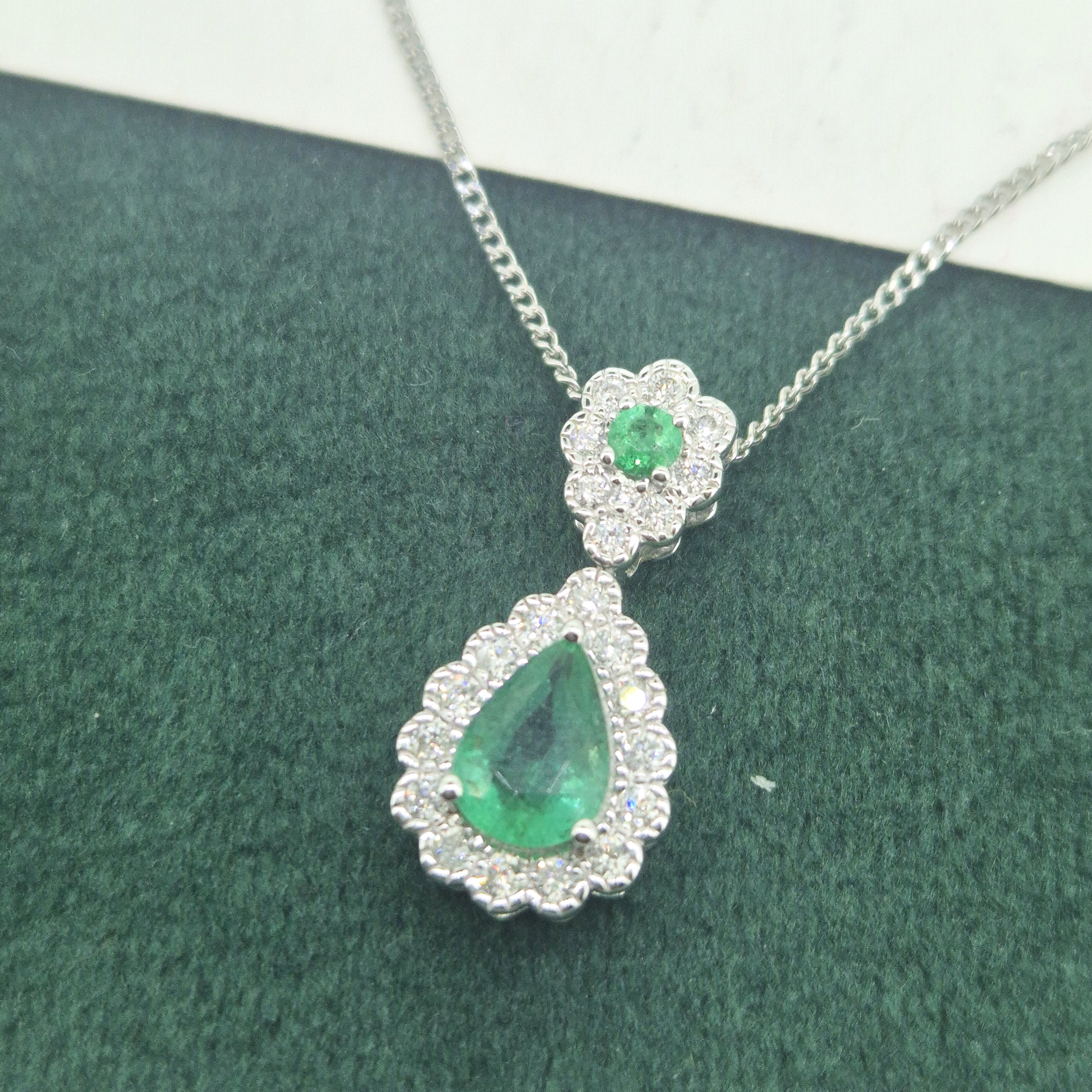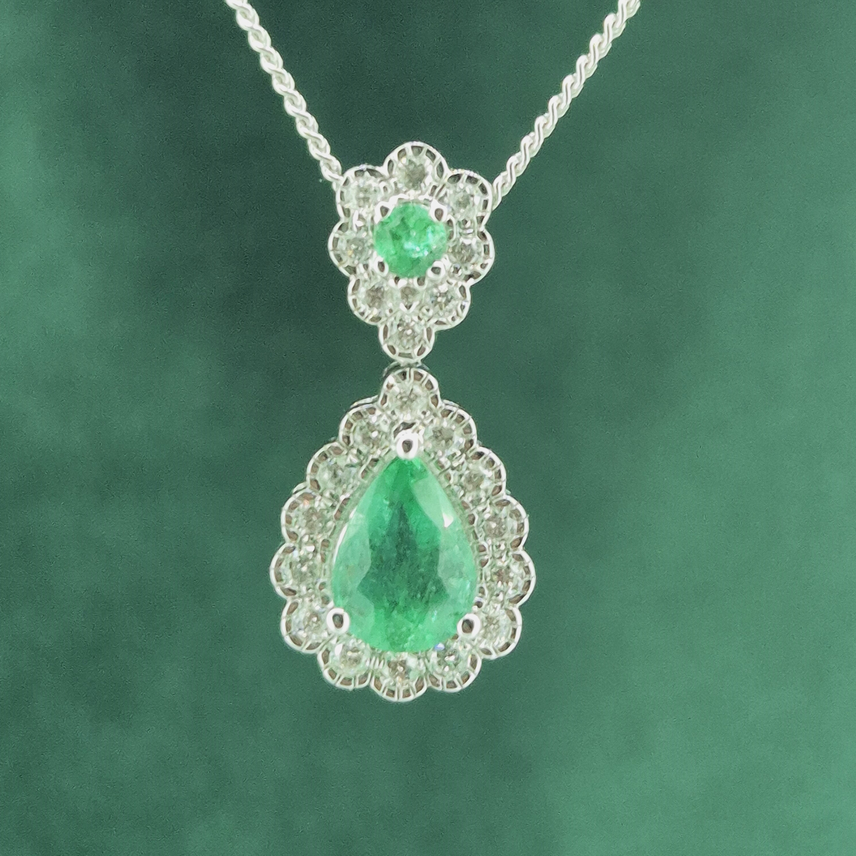 The pendant features a Pear Shape Emerald that measures 7mm by 5mm, that weighs 0.60cts. This Emerald is surrounded by Round Brilliant Diamonds that are further detailed by a milgrain edge. This drops from a a smaller Emerald ad Diamond Cluster that features a Round Emerald that is surrounded by Diamonds. The Diamond weight is 0.25cts.